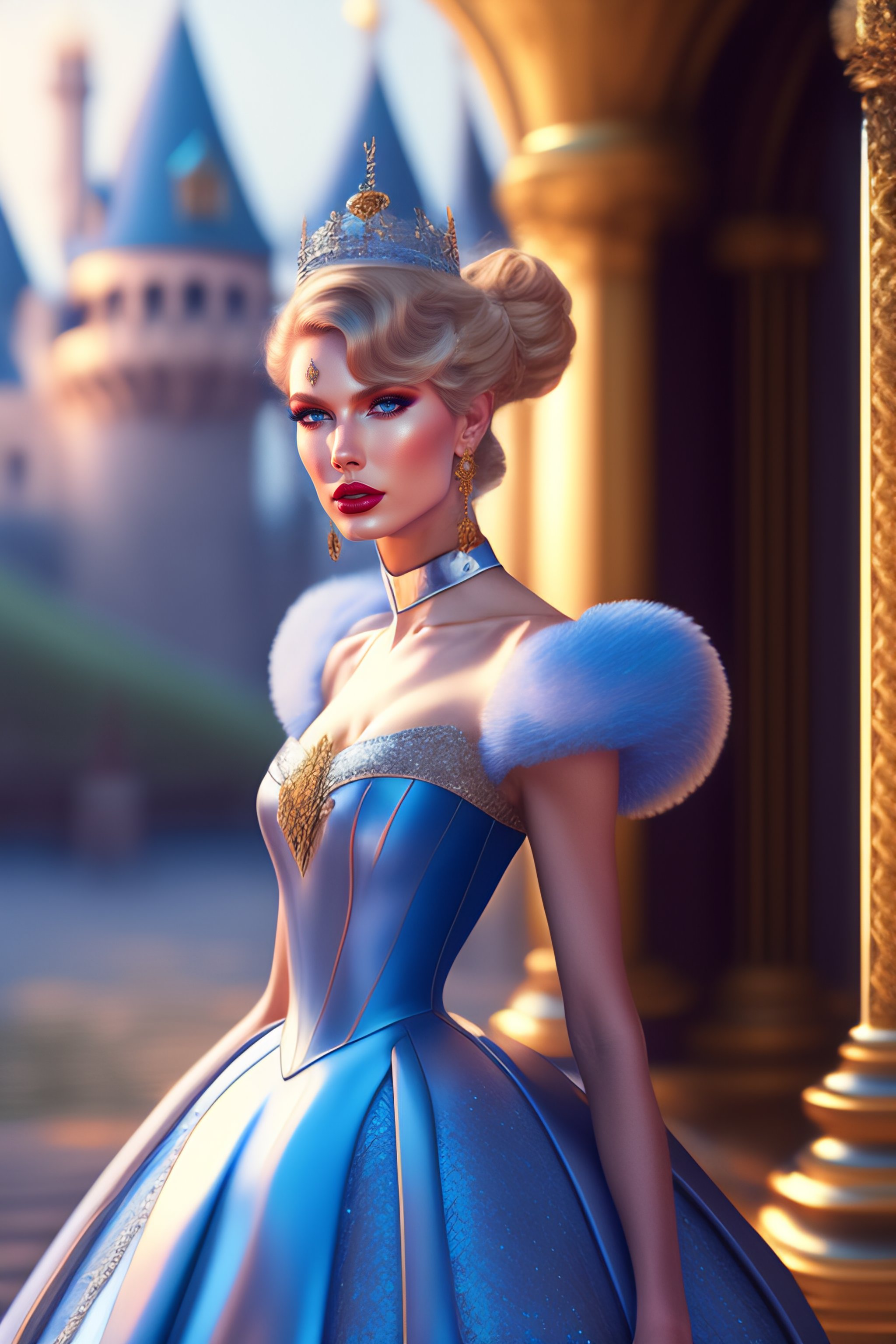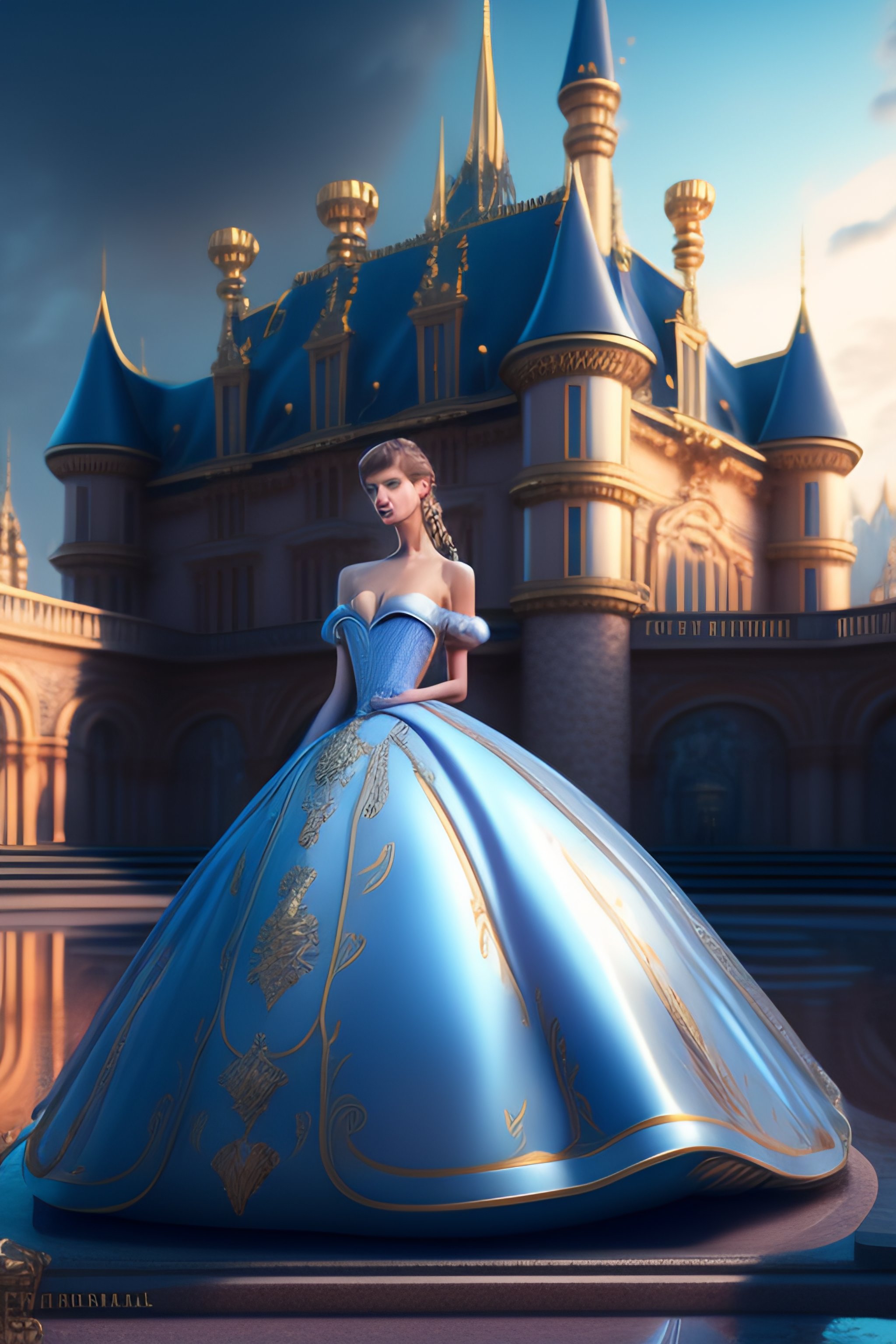 A highly detailed epic cinematic concept art cg render digital painting artwork: skinny taylor swift wearing blue cinderella ball gown with shiny silver details, large mice on the floor, by greg rutkowski, ilya kuvshinov, wlop, stanley artgerm lau, ruan jia and fenghua zhong, trending on artstation, vibrant spring colors, made in maya, blender and photoshop, octane render, excellent composition, cinematic atmosphere, fashion photography, precise correct anatomy, aesthetic, very inspirational, arthouse, detailed french castle in the background