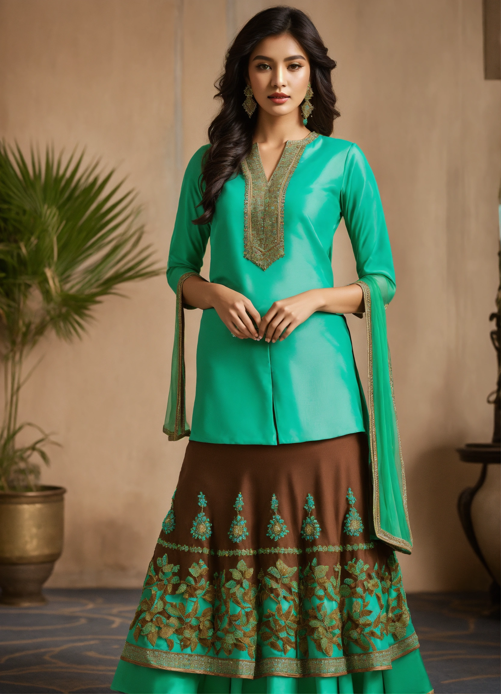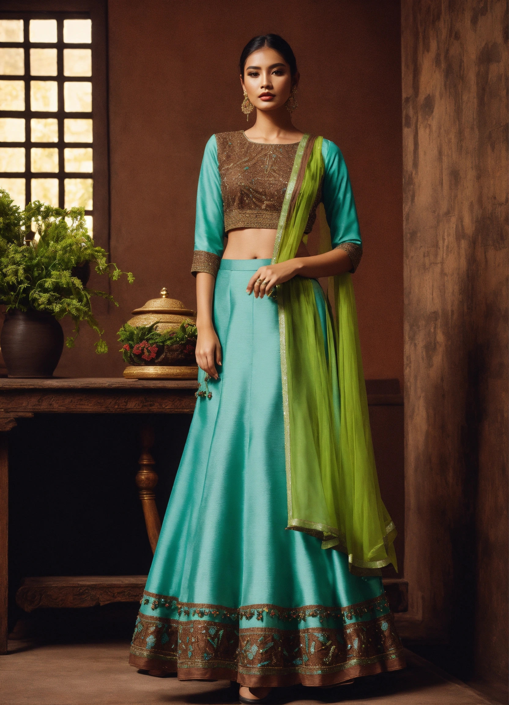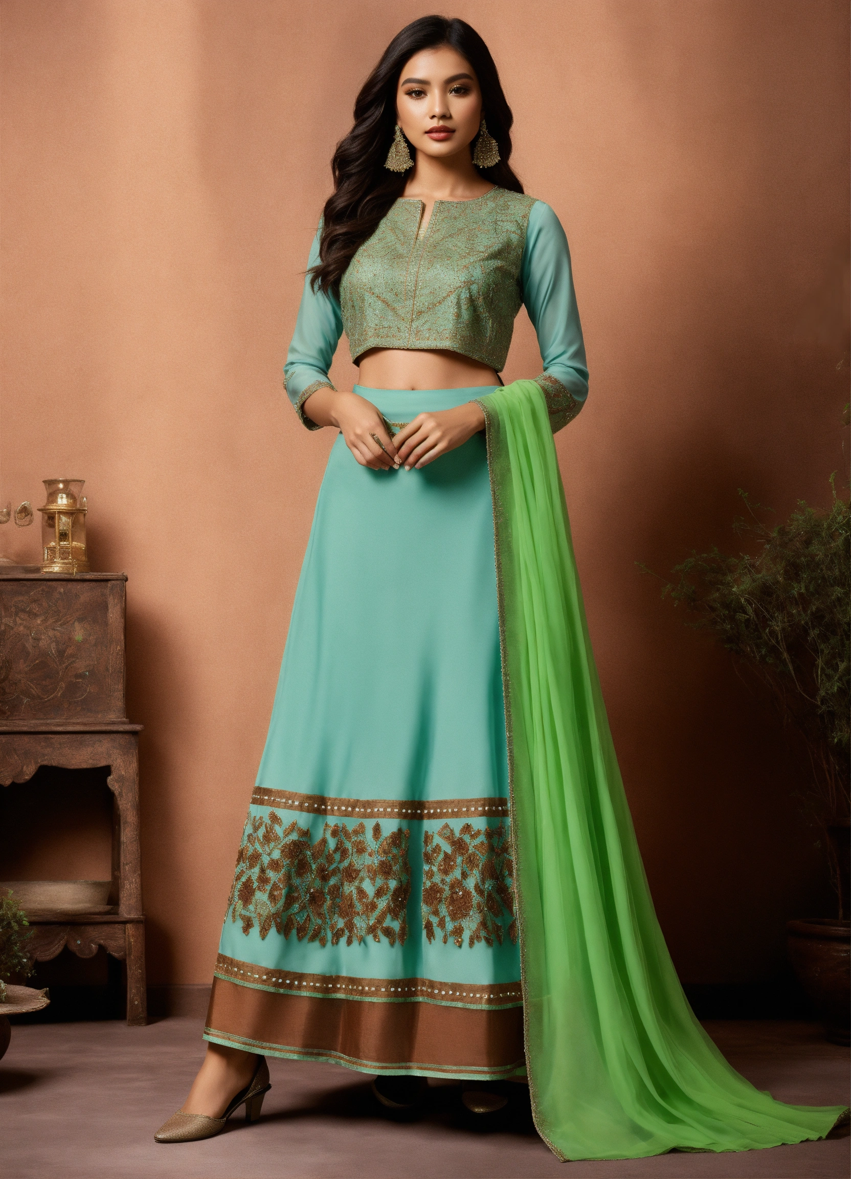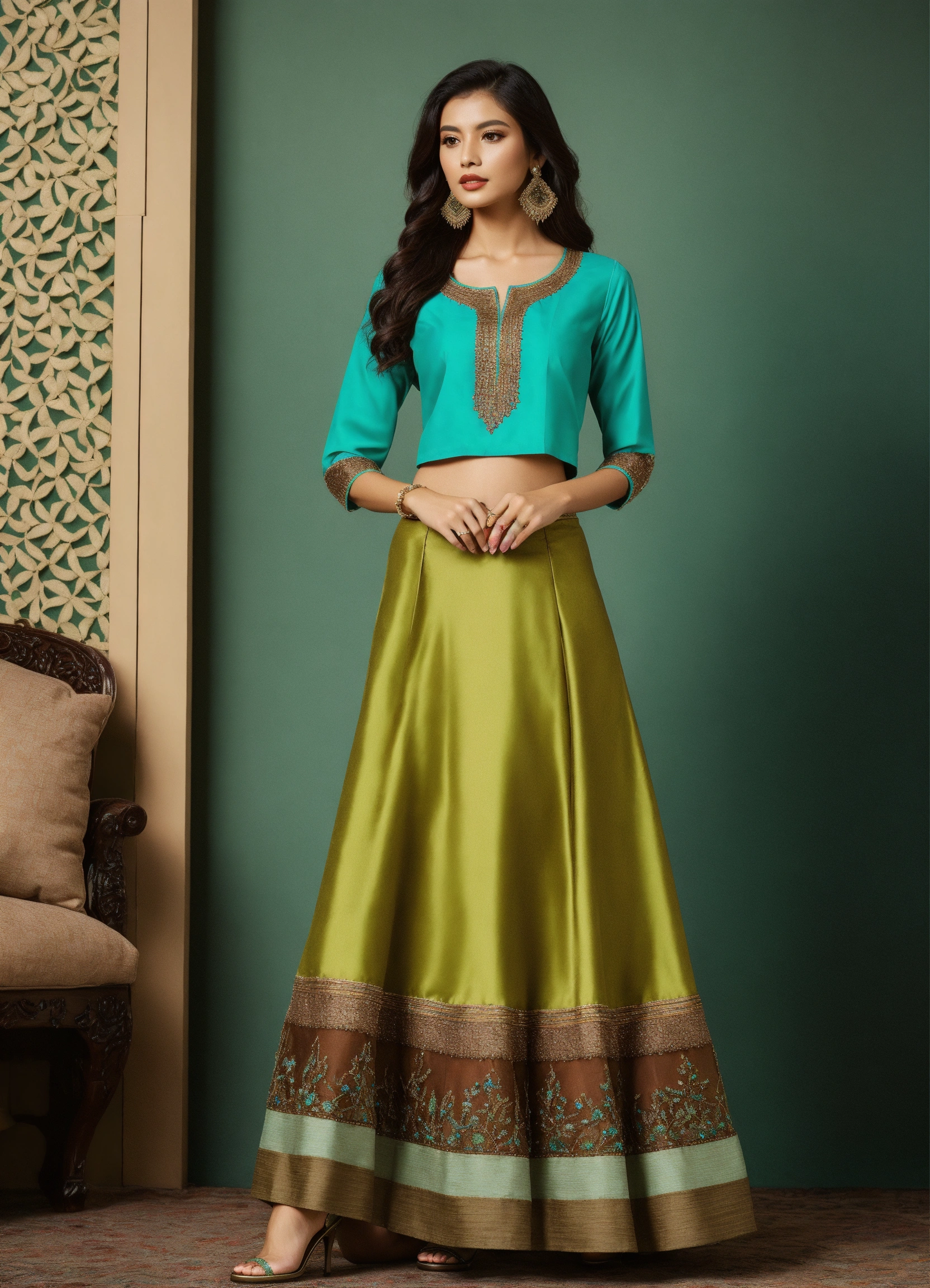 A light blue skirt set with an a-line ankle-length skirt showcasing intricate brown beadwork details, paired with a bright green blouse with beadwork, fancy