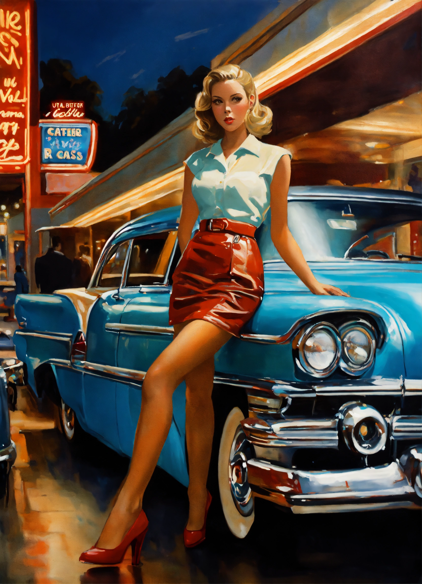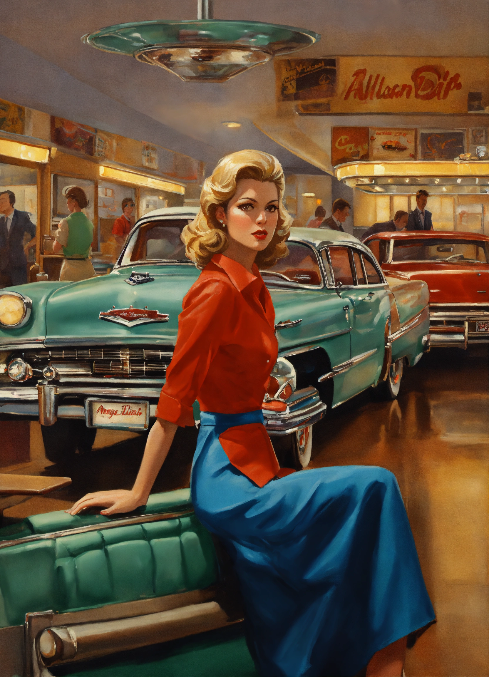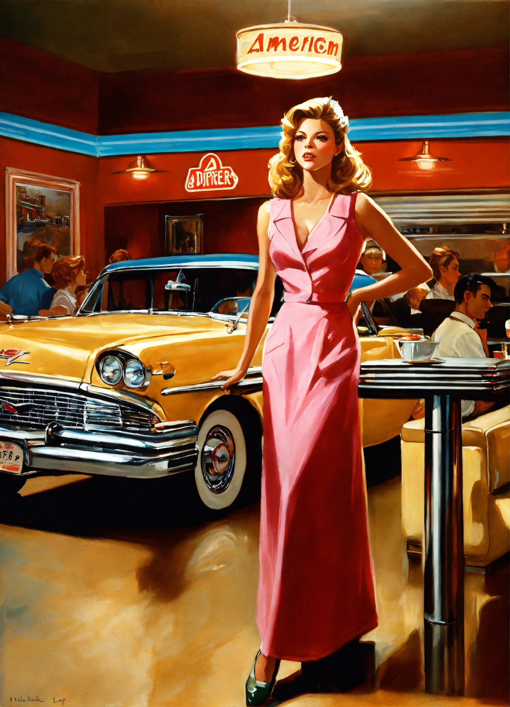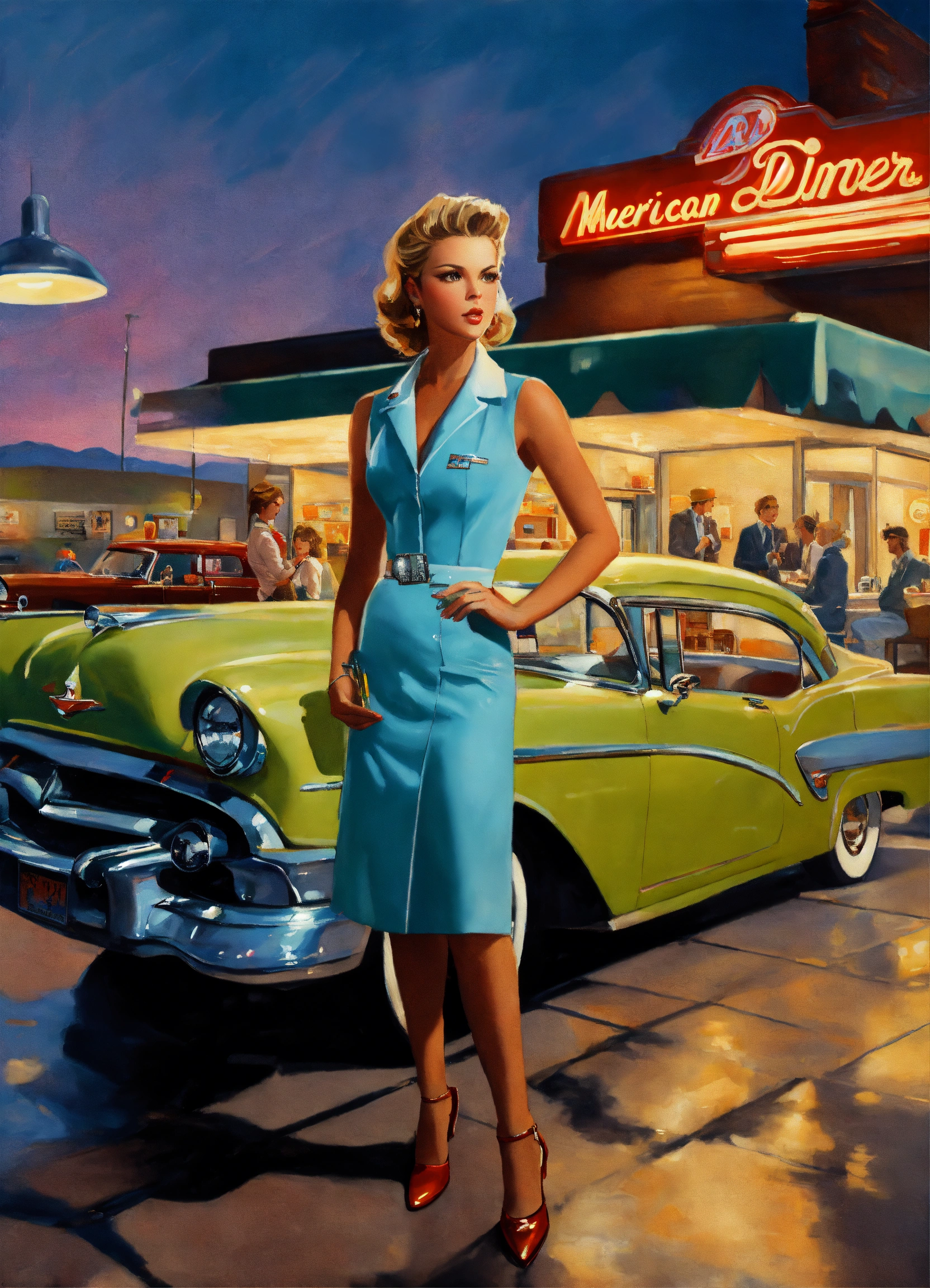 Ultra realistic full body photo of american diner, with waitress, elizabeth montgomery, vintage fashion and classic cars, painting by malcom lipke
