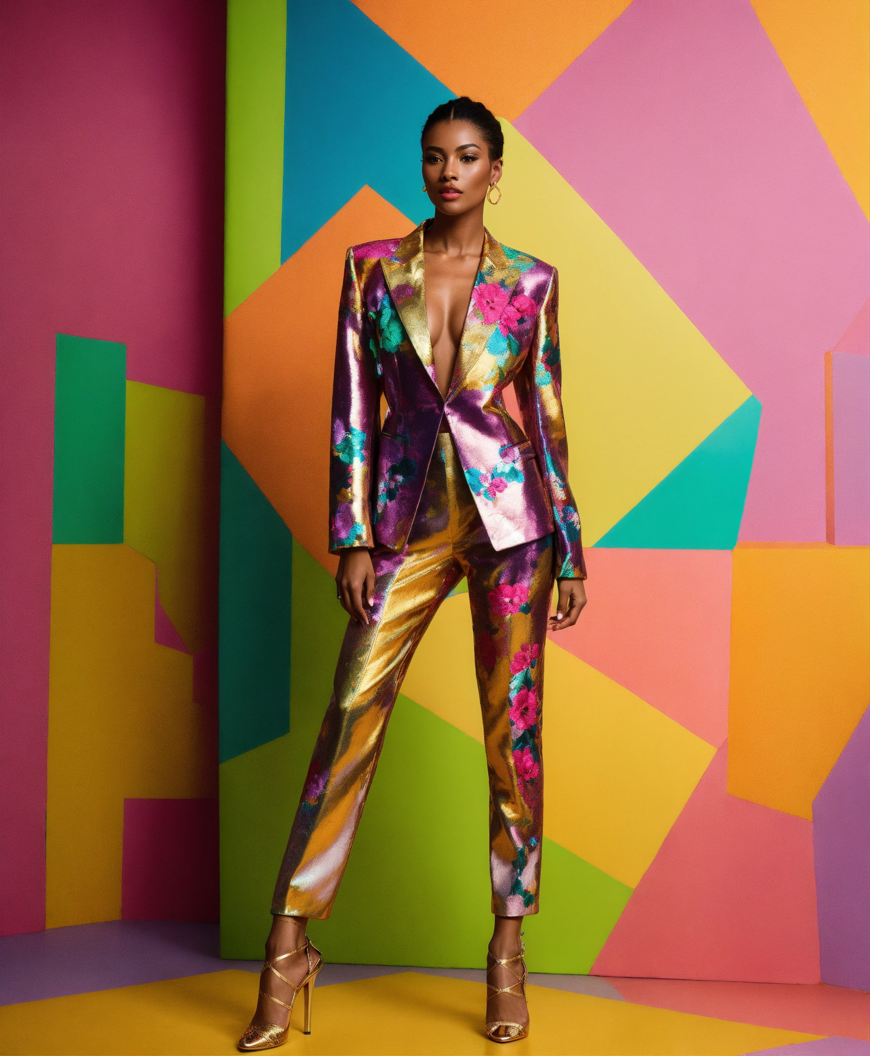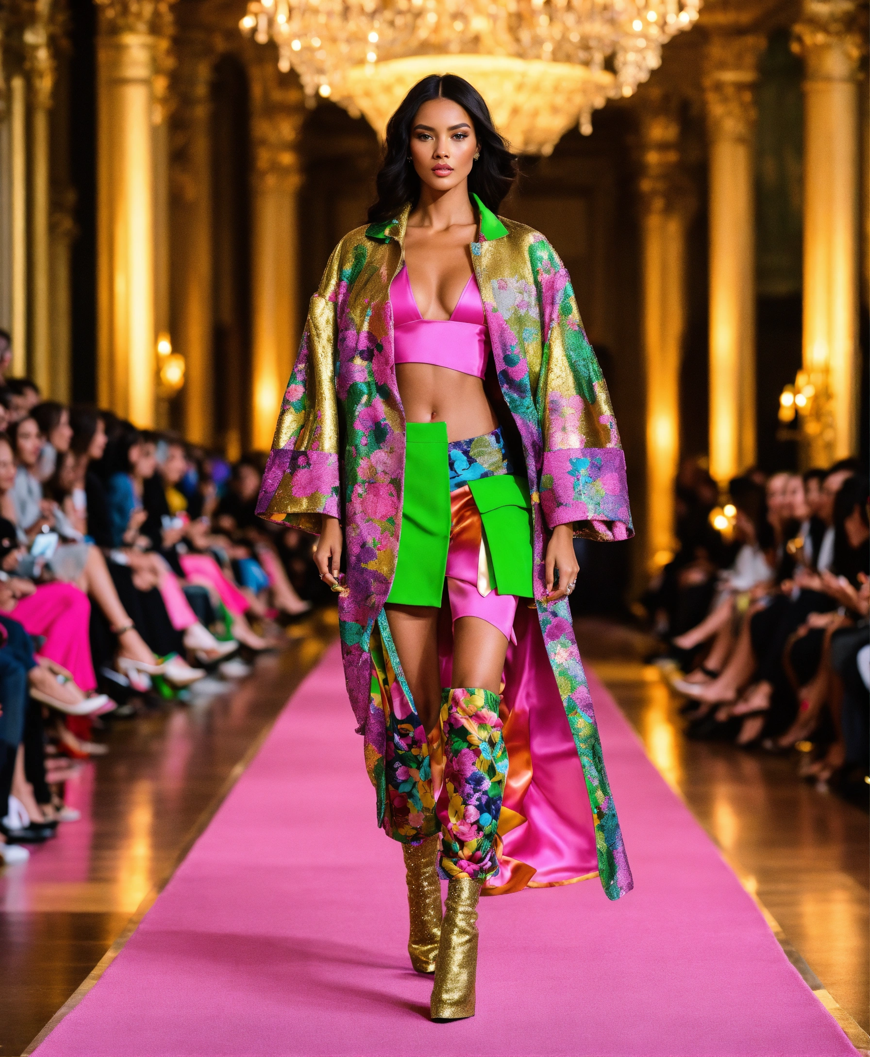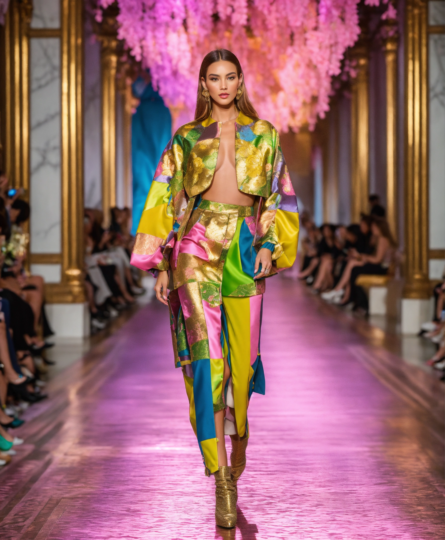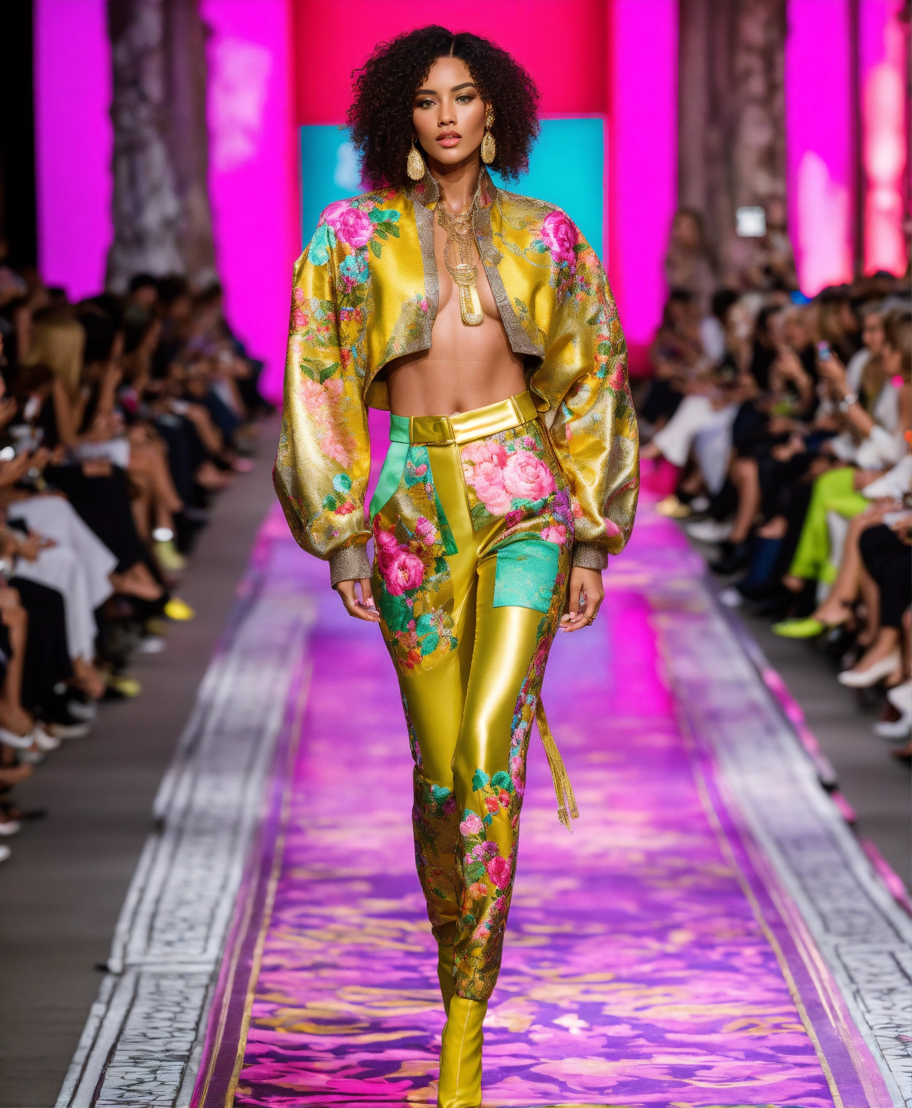 Ultra realistic full body photo of a trendy american model walking the runway modeling summer designer novelty interesting complex unusual street sporty classy modern dolman sleeve outfit brave, paris versailles details cutouts and and gold geometric pattern floral structured tailored jacket pink gold green lilac peridot silver magenta lime fuchsia yellow blue black gray copper mauve bronze haute couture ultimate elegance beautiful luxurious awesome wealthy resplendent magnificent sublime 12k