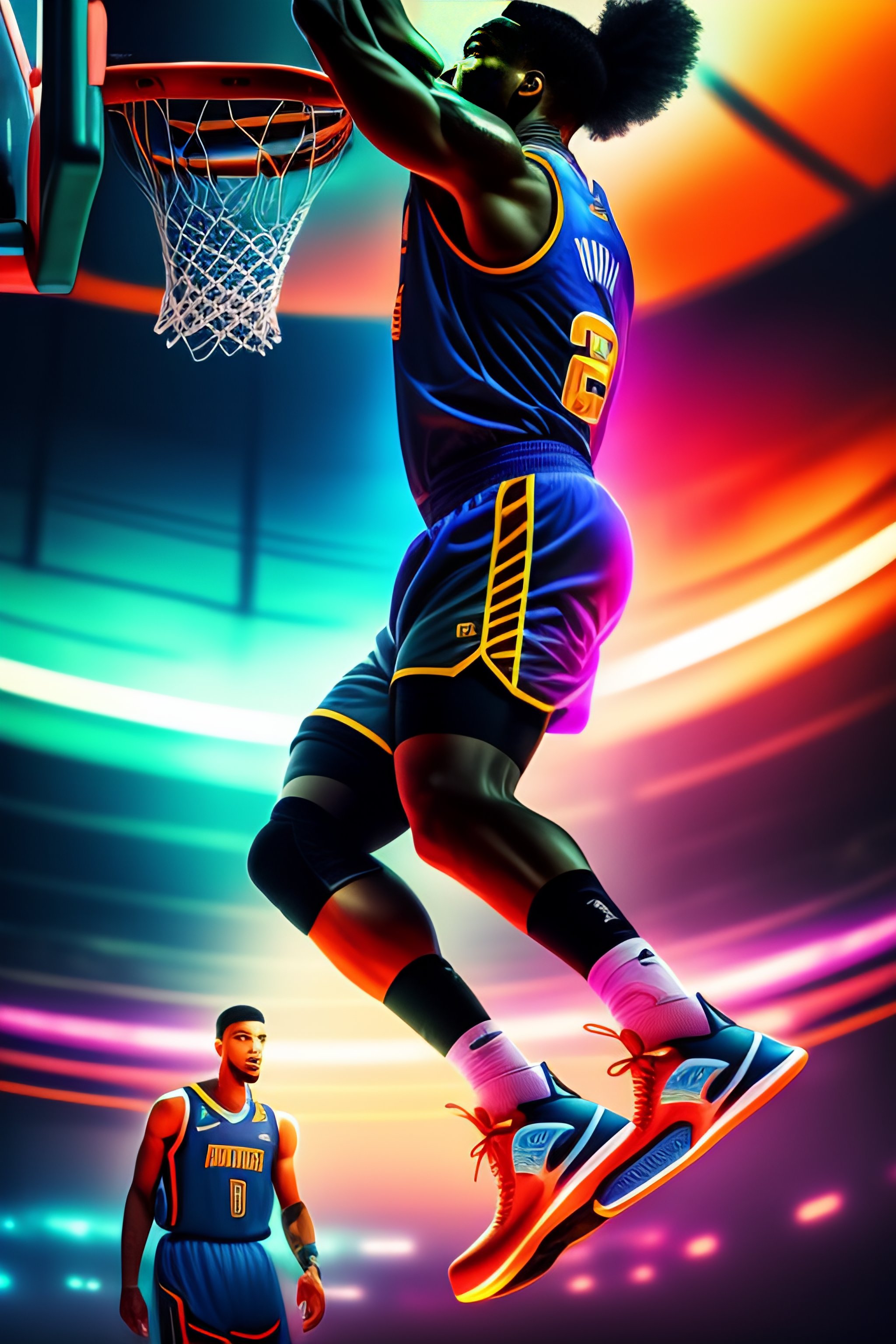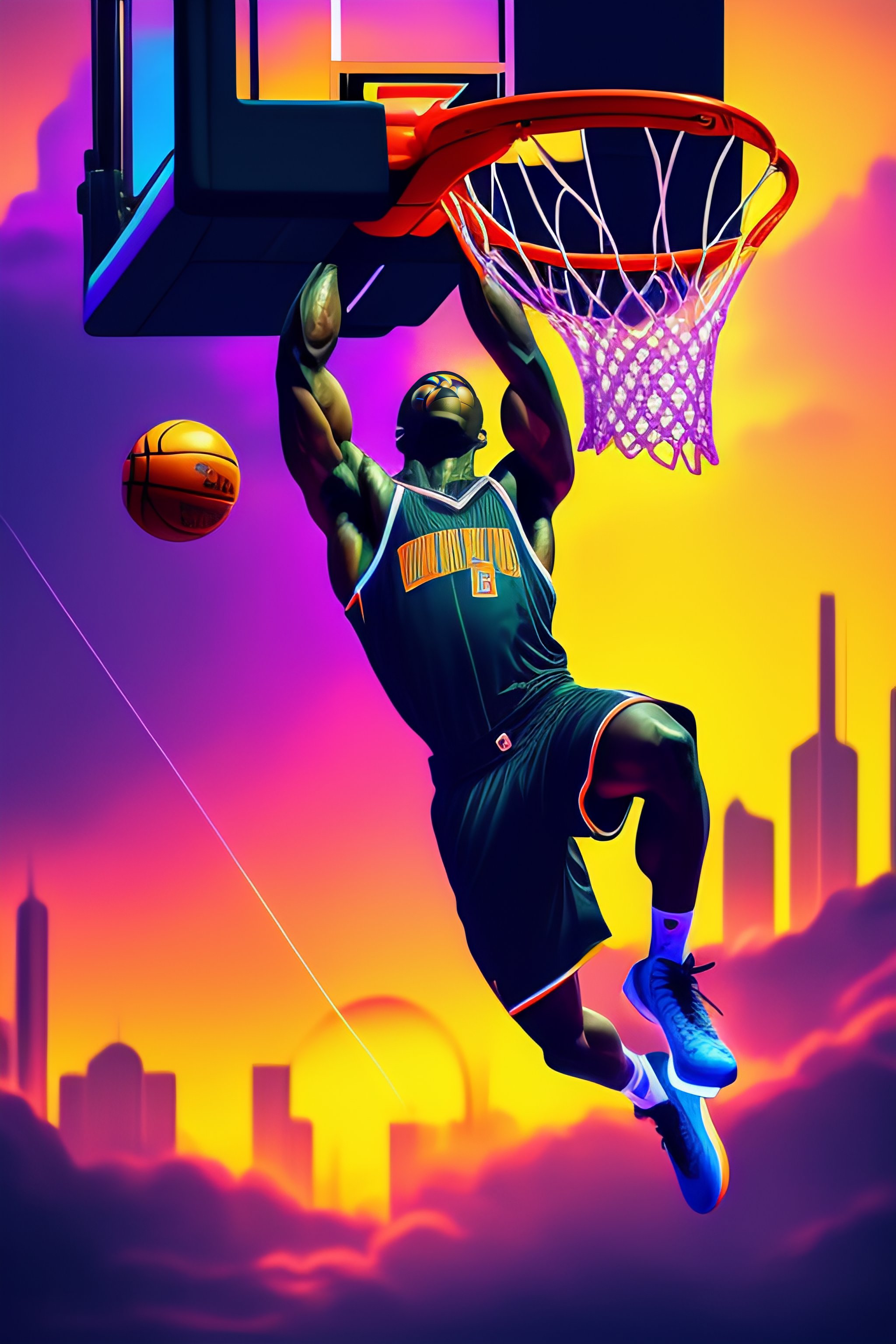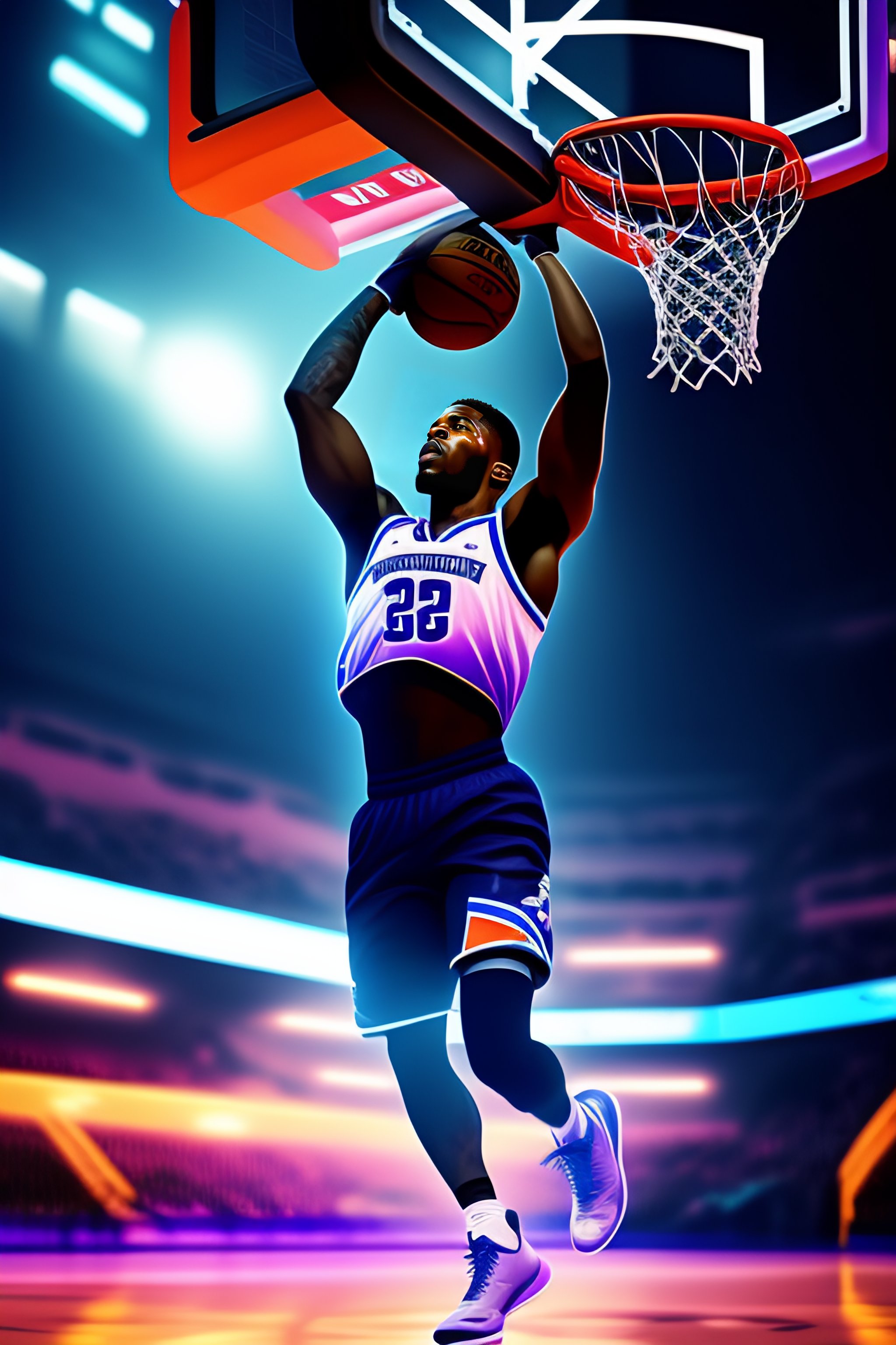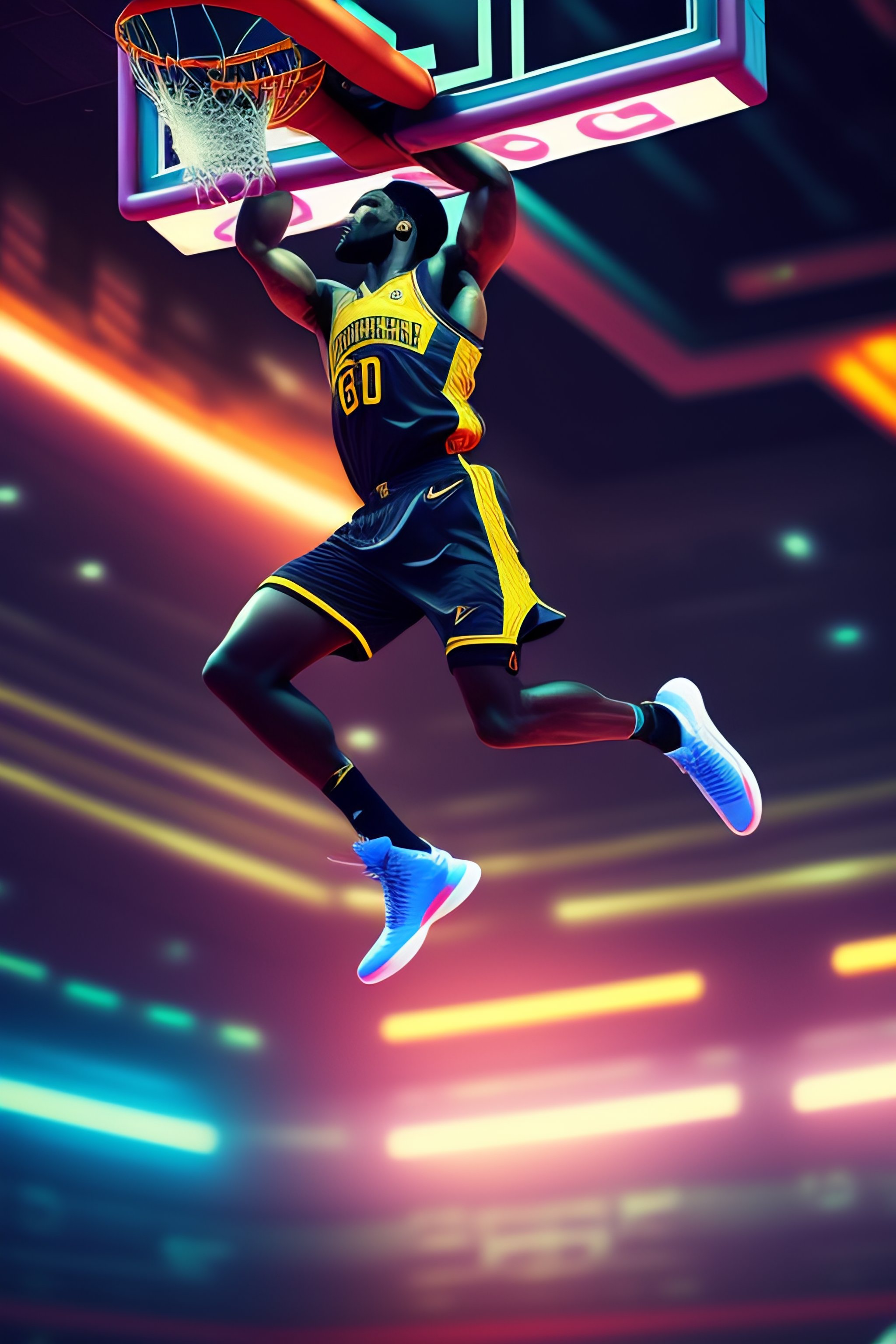 Cyborg future basketball player elevating for a dunk, basketball extended above head near the basketball rim, neon cyberpunk future basketball court, future sports