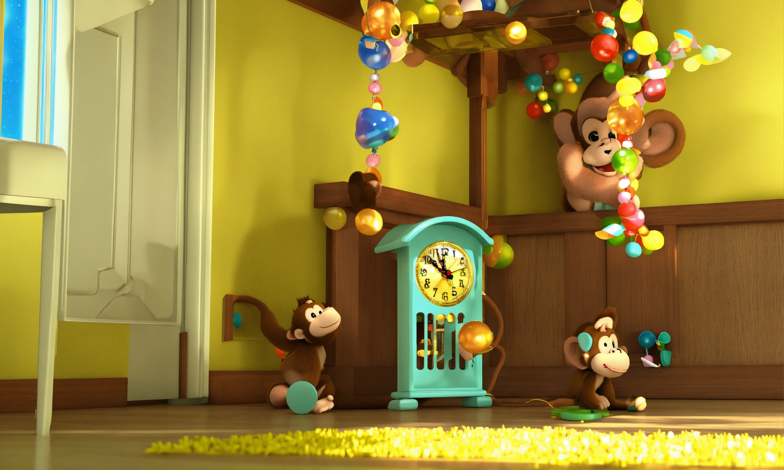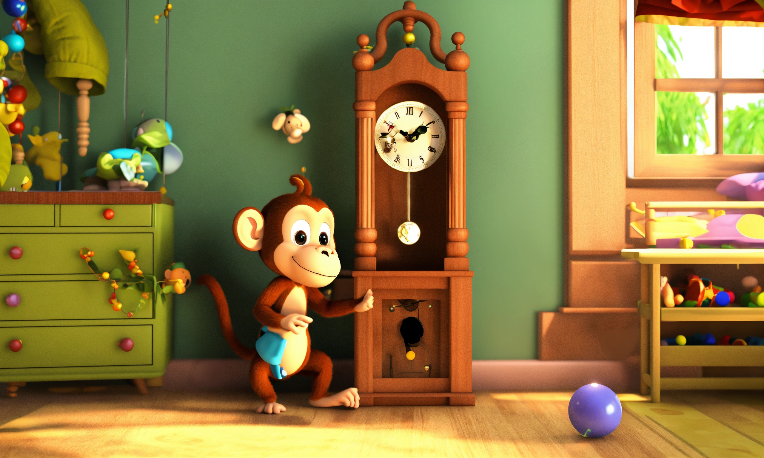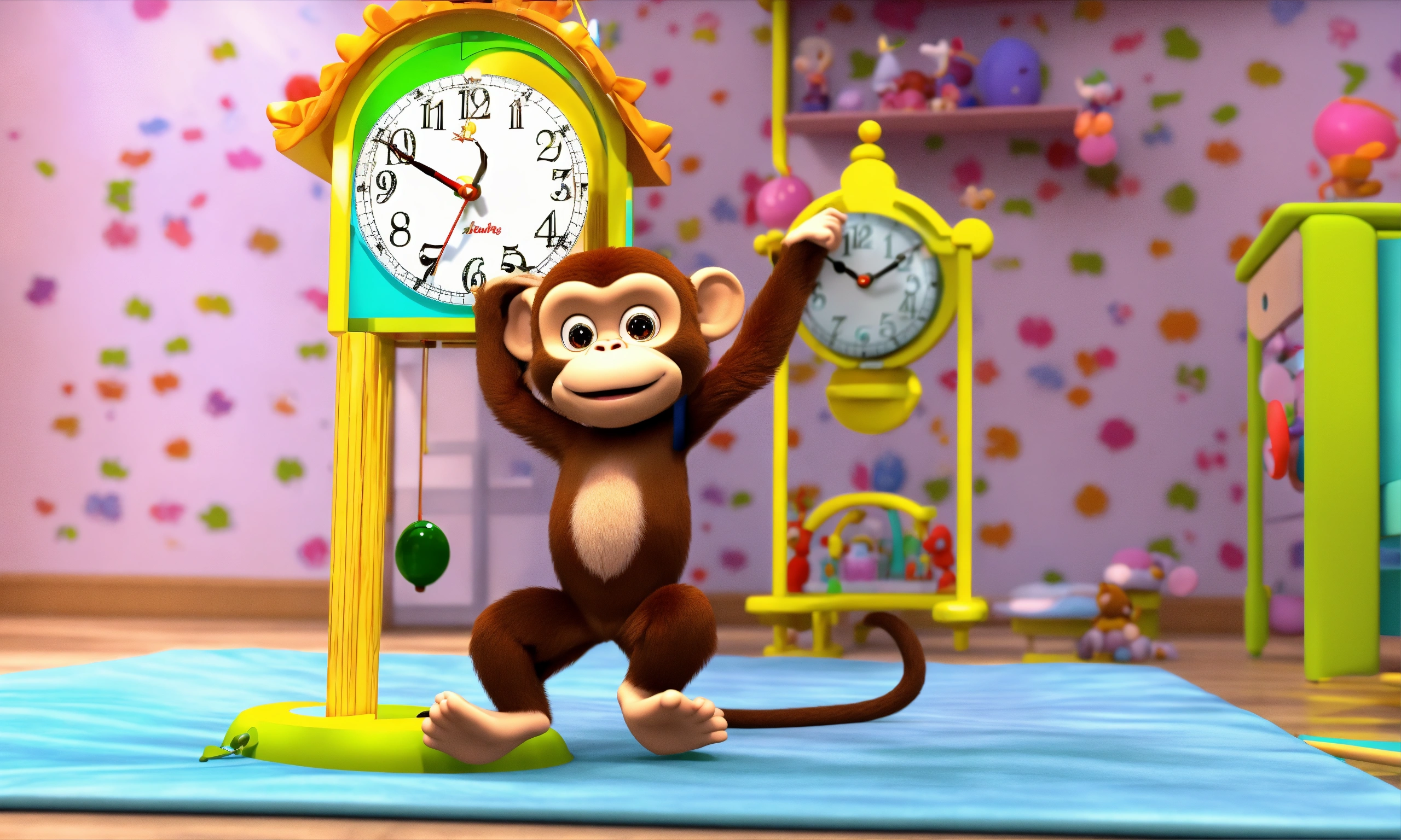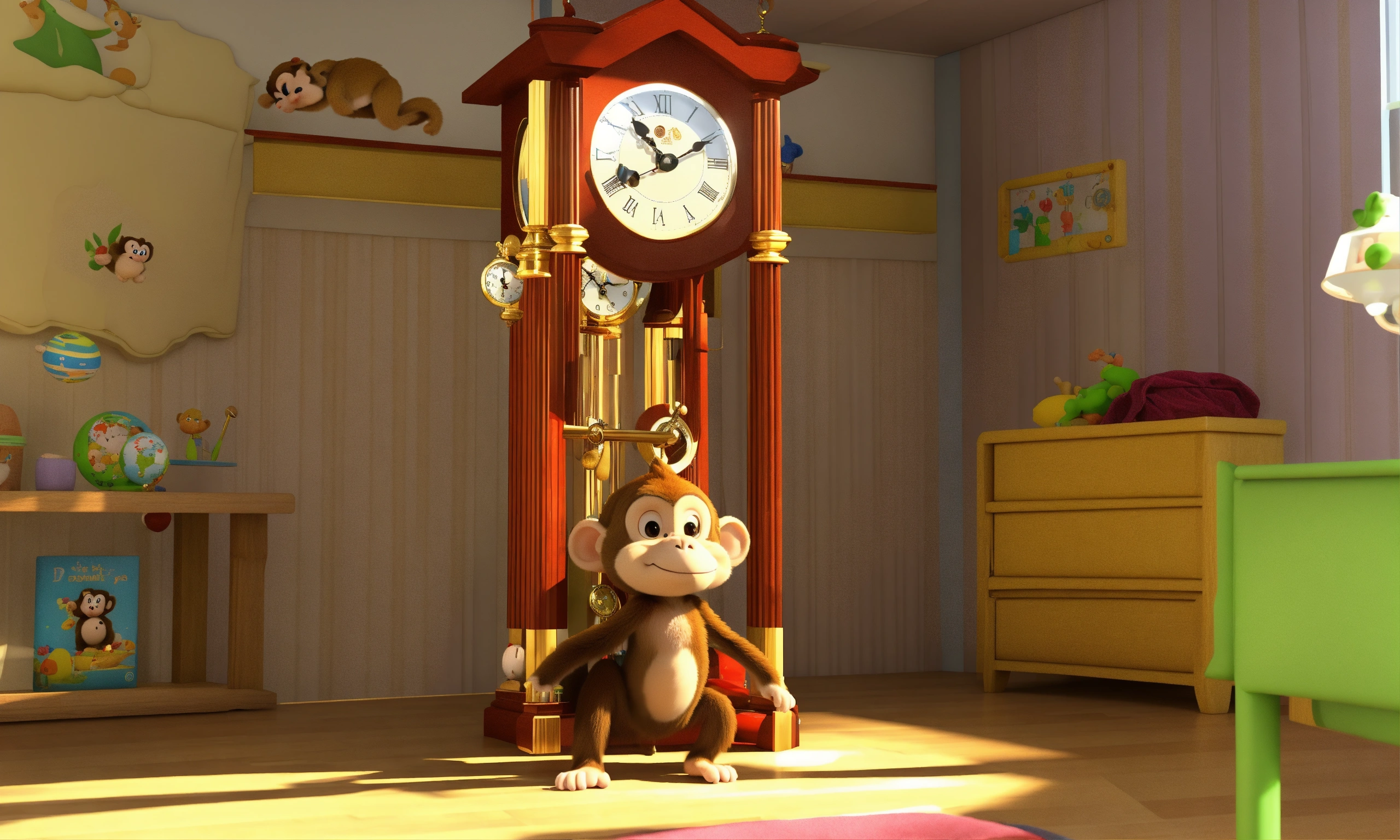 A cute monkey went up the pendulum clock in the babies room
