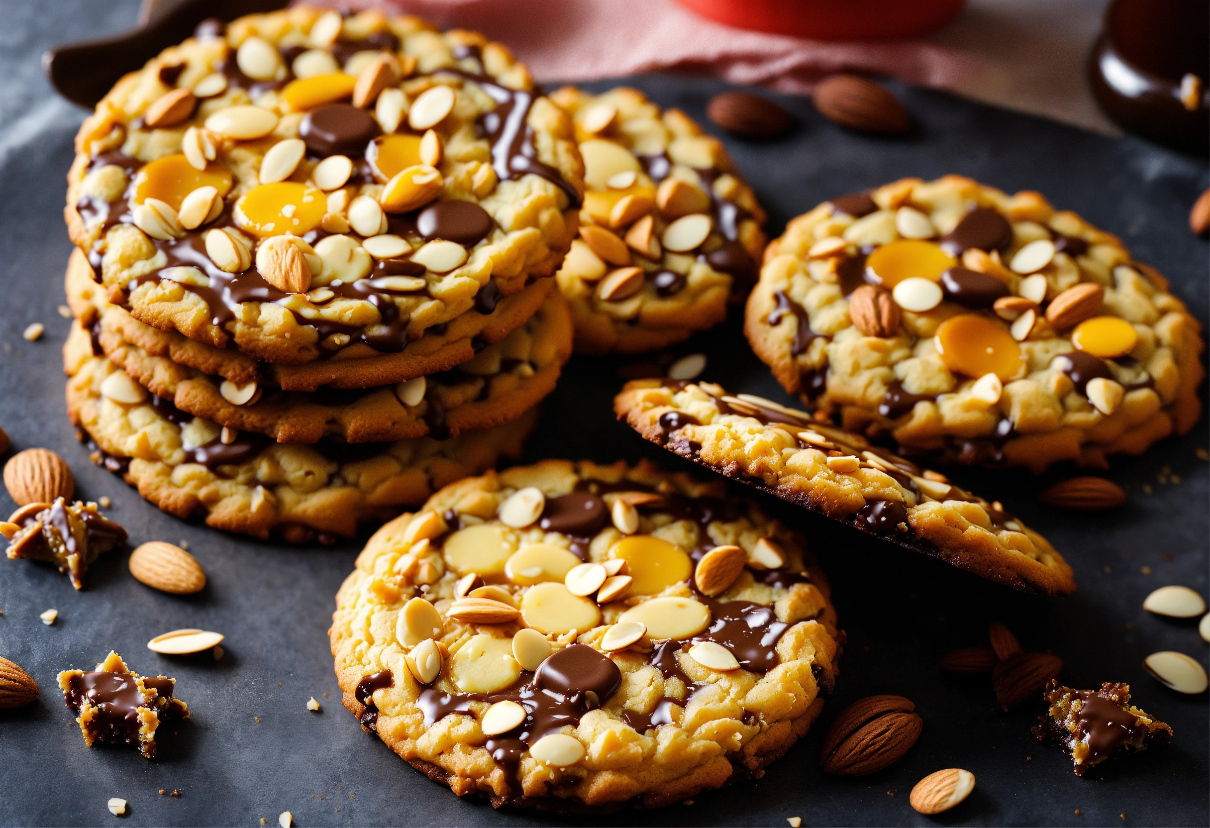 Capture the essence of a delectable florentine cookie in a single image for our recipe website. show off its golden, lacy texture and the perfect balance of almonds, caramel, and chocolate bottom. make our readers crave a bite just by looking at your photo. we want to see the florentine cookie in all its mouthwatering glory, ready to inspire bakers and delight sweet tooths alike. get creative with your composition, lighting, and styling to make this florentine cookie a true star