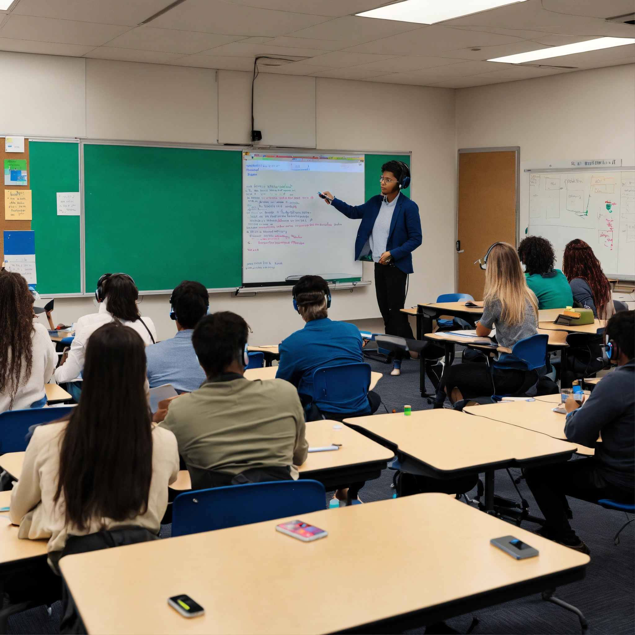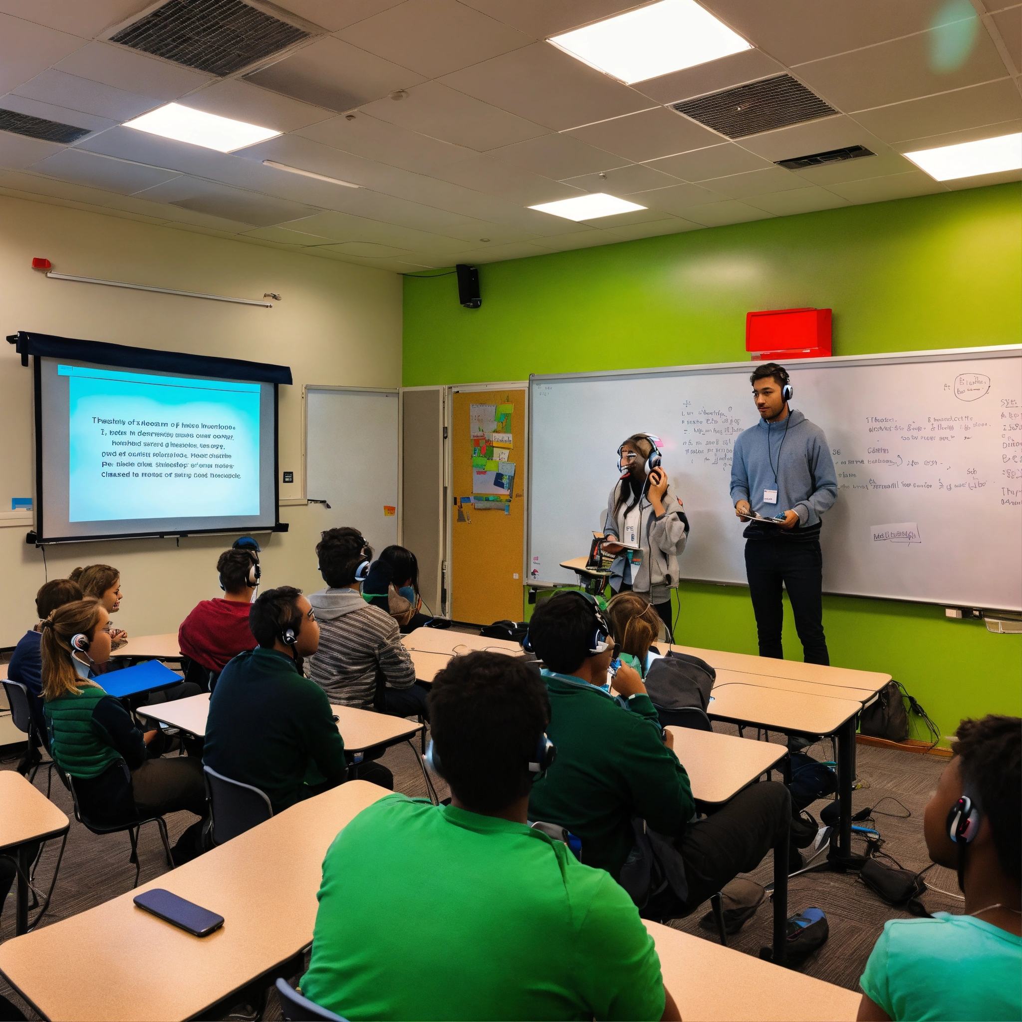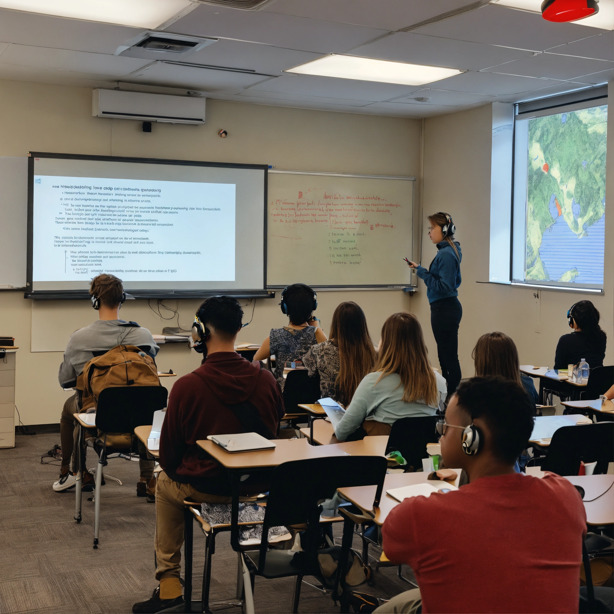 A photo of a group of people in a classroom, they are all wearing headphones and are listening to a lecture, the instructor is standing in front of a whiteboard and is using a projector to display a slide, the students are taking notes