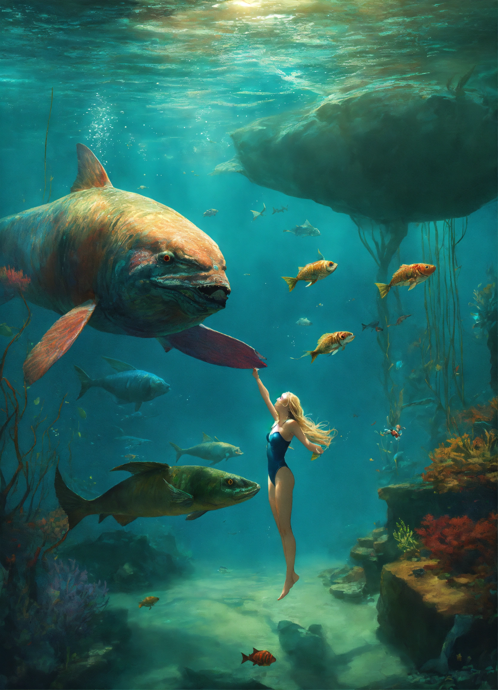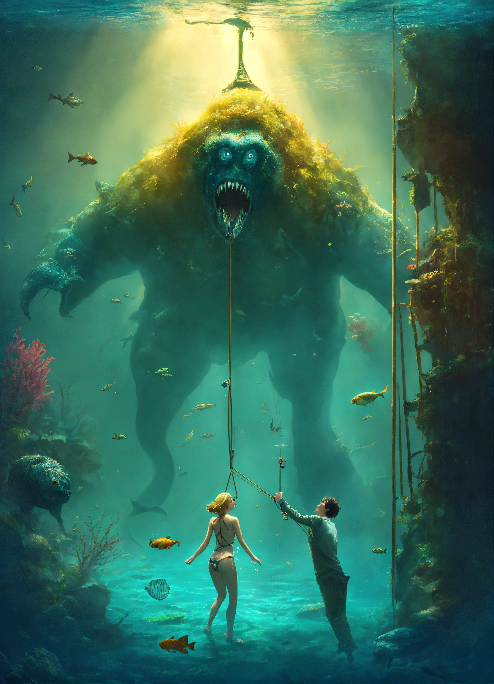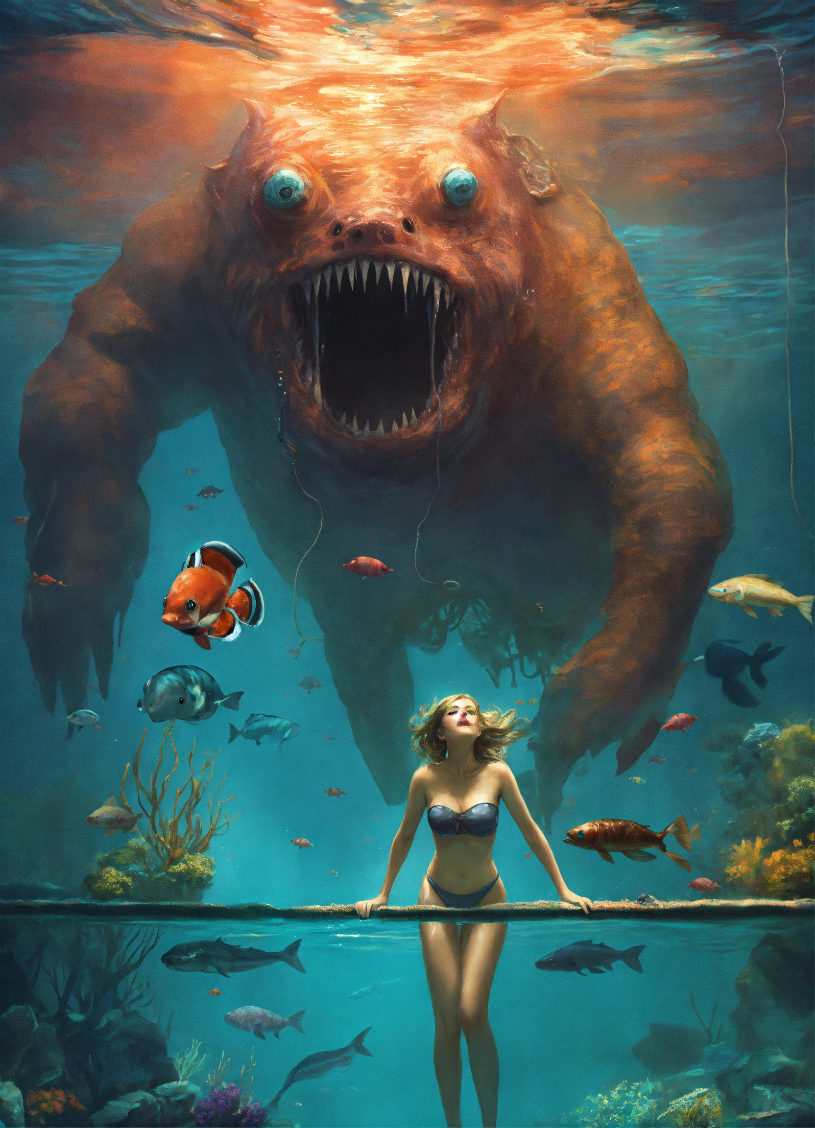 A horrible monster hides itself underwater, using a pretty woman swimming as a marionette to draw in unsuspecting prey.