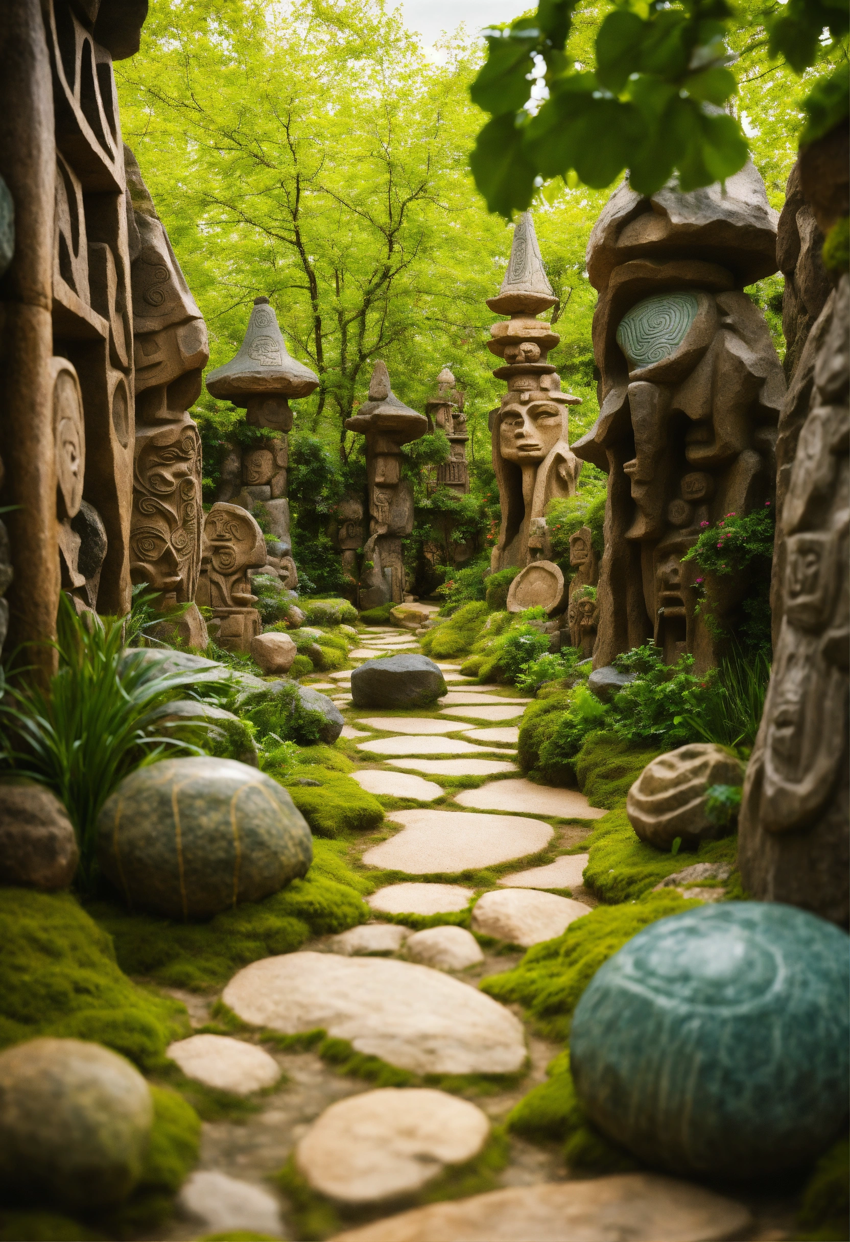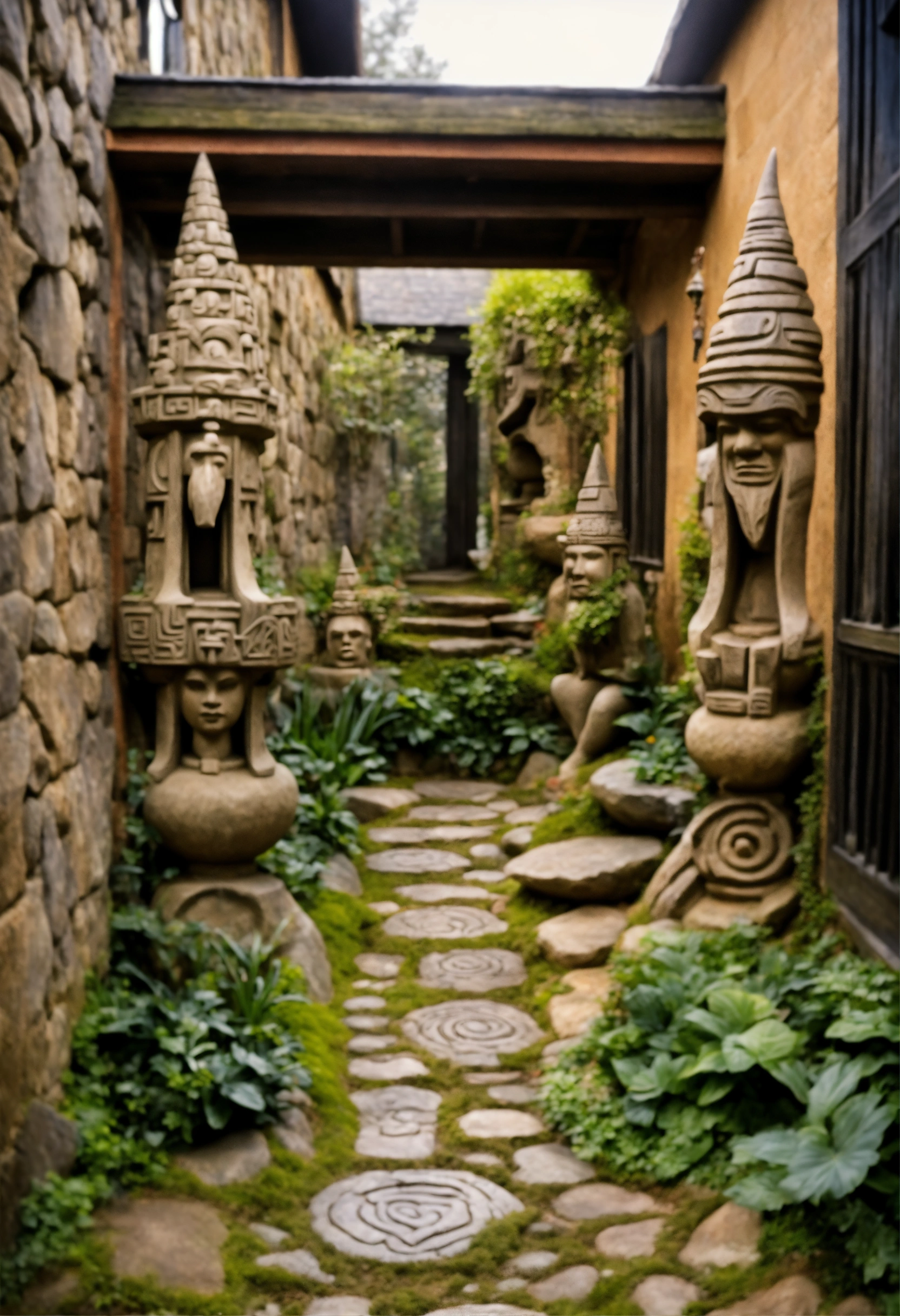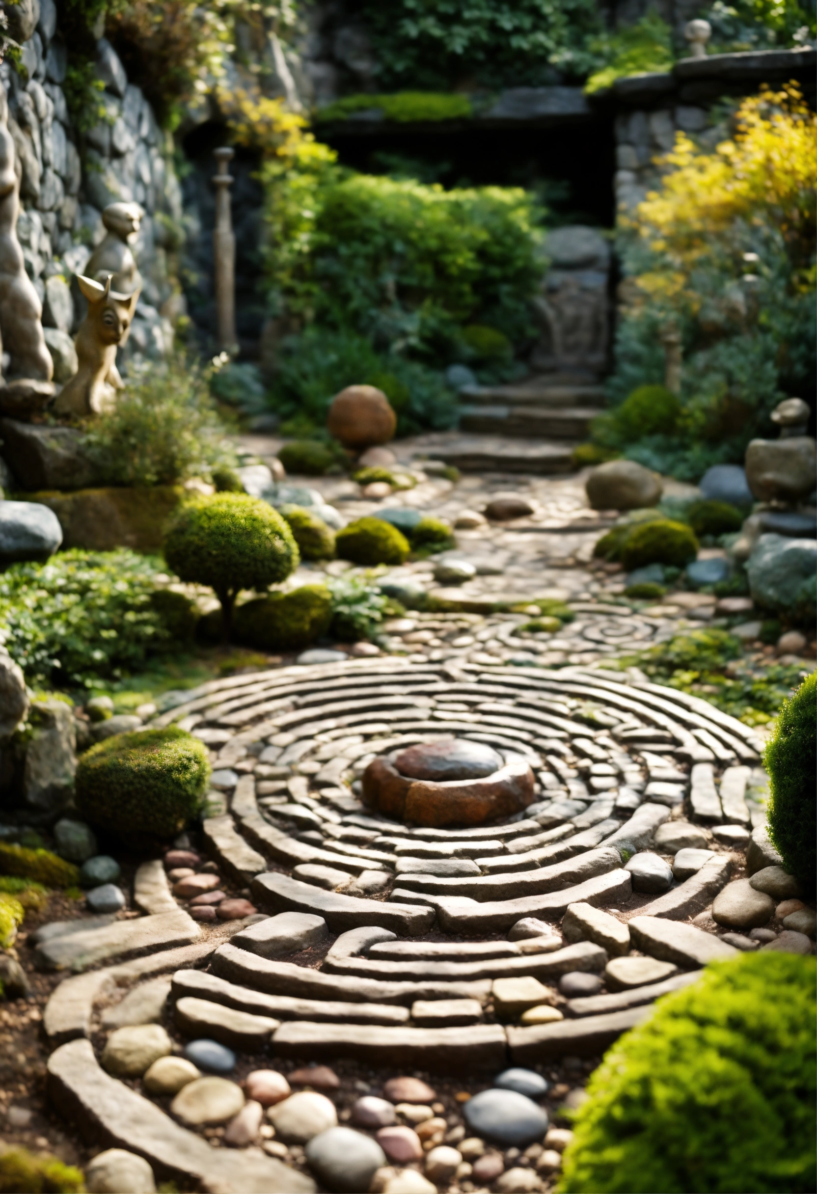 An ancient spiritual gnome inspired stone pathway rock garden.sculptured . style of alex grey/brian froud/giger.lots of totem sculptures. patterned stone winding pathway, labyrinth.courtyard.meditative.