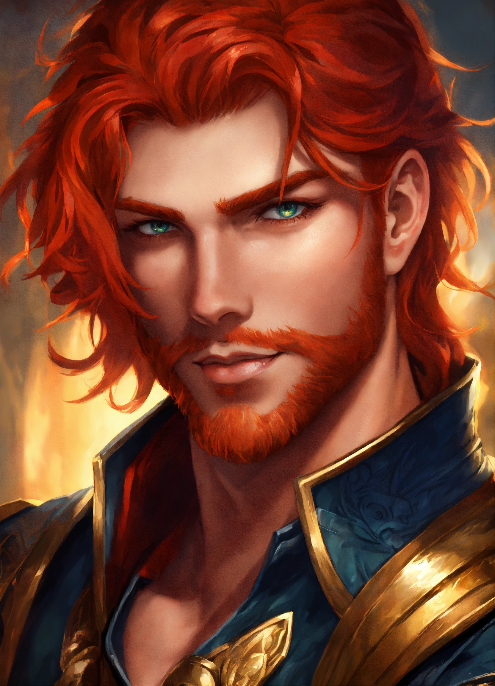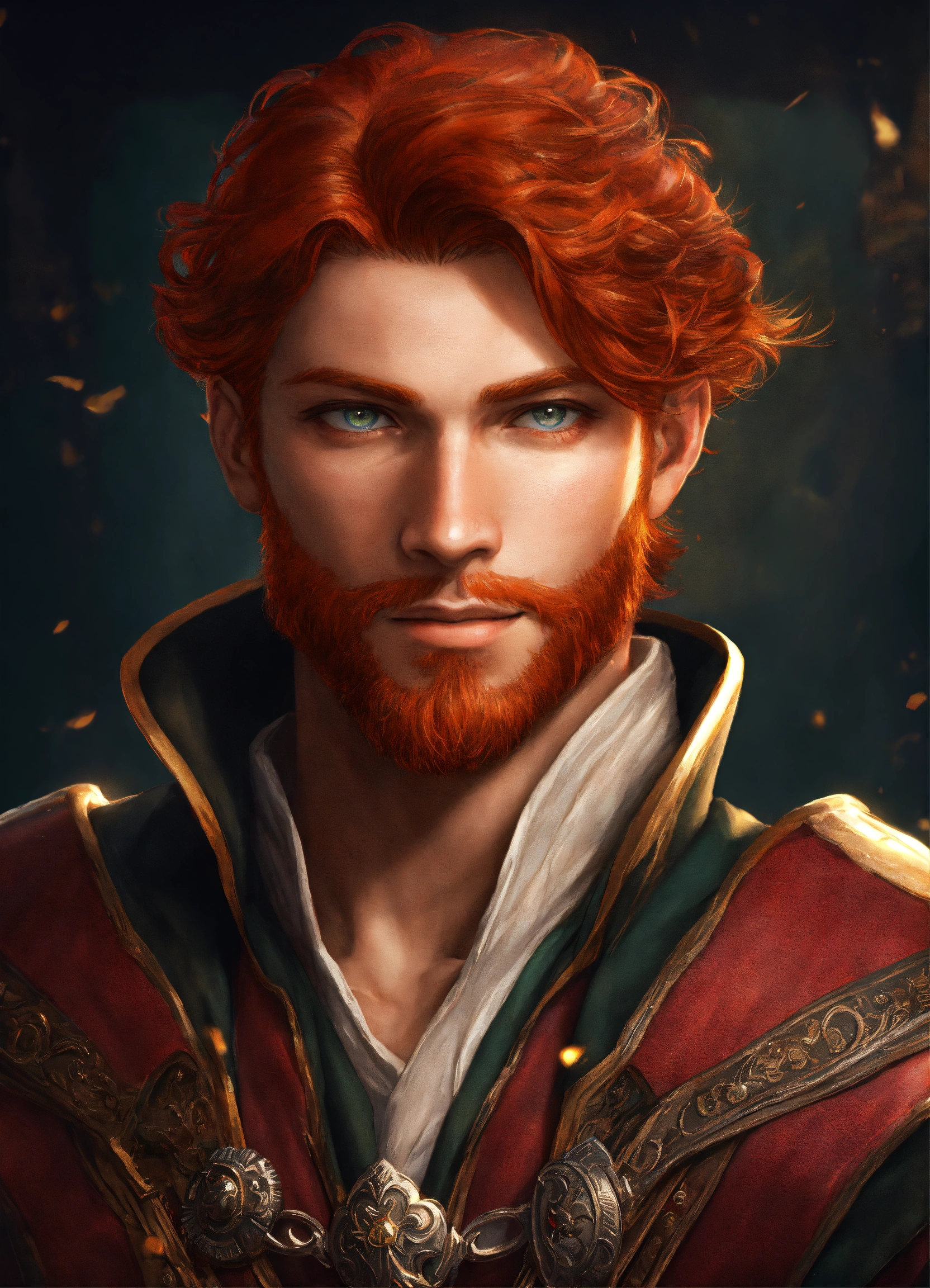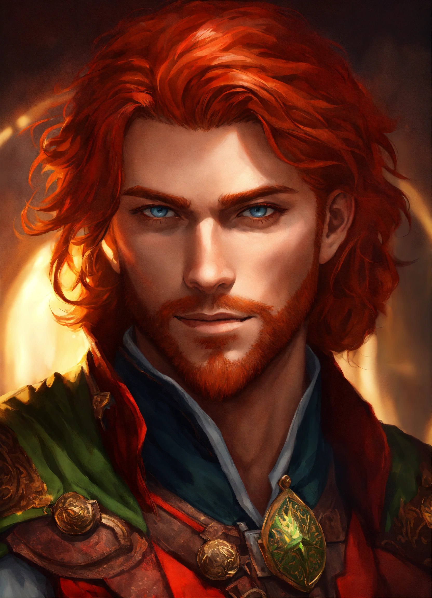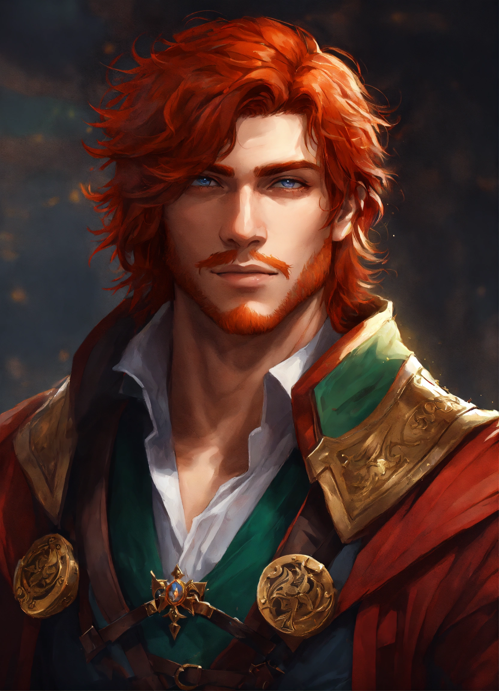Confident male duelist, red hair, adventurer, smirk, head and shoulders portrait, intricately detailed eyes, fantasy art