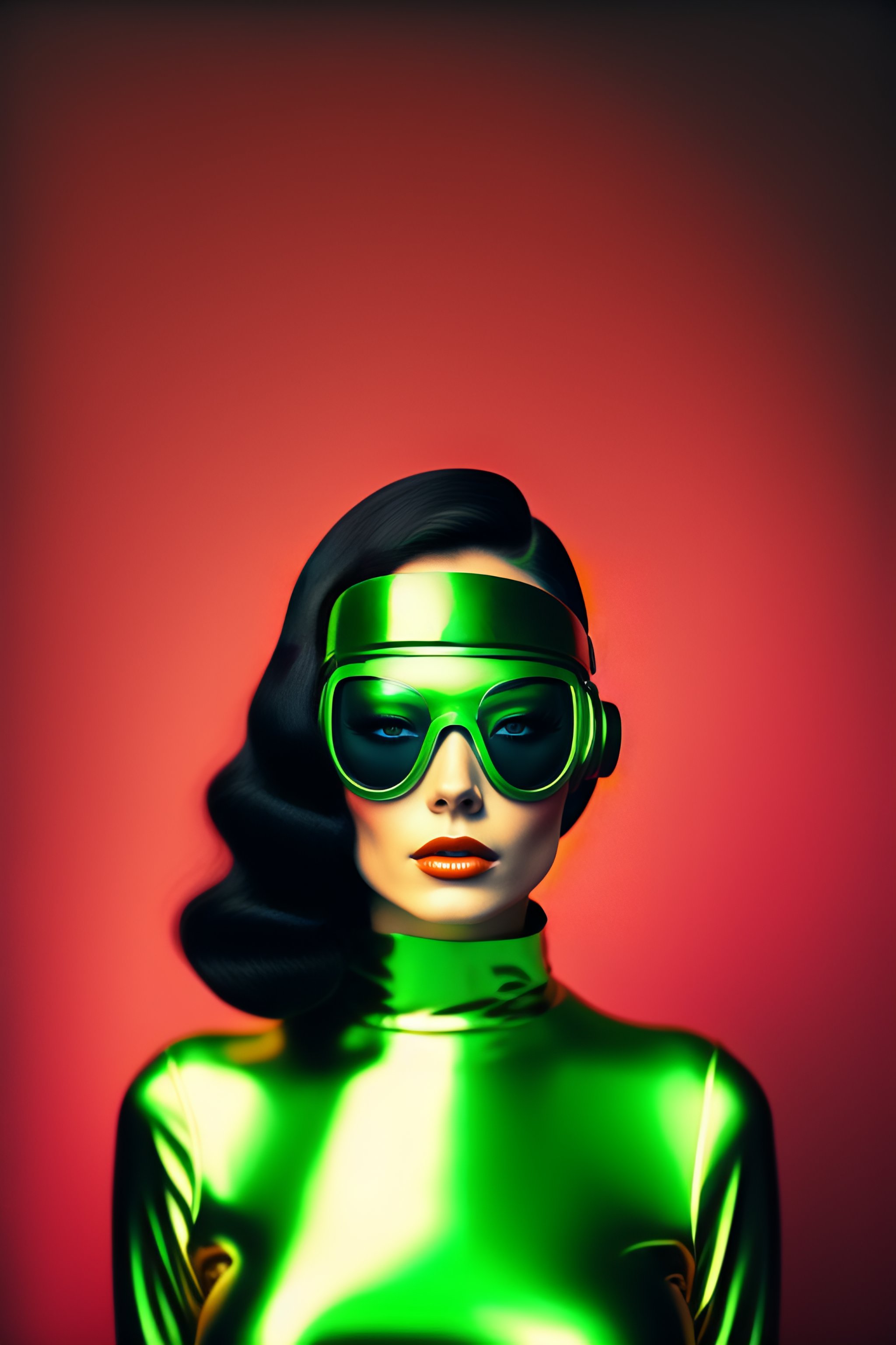 Young woman in wearing a tight green spacesuit, retrofuturistic, retro sci fi art, cyberpunk, alien mask, polaroid