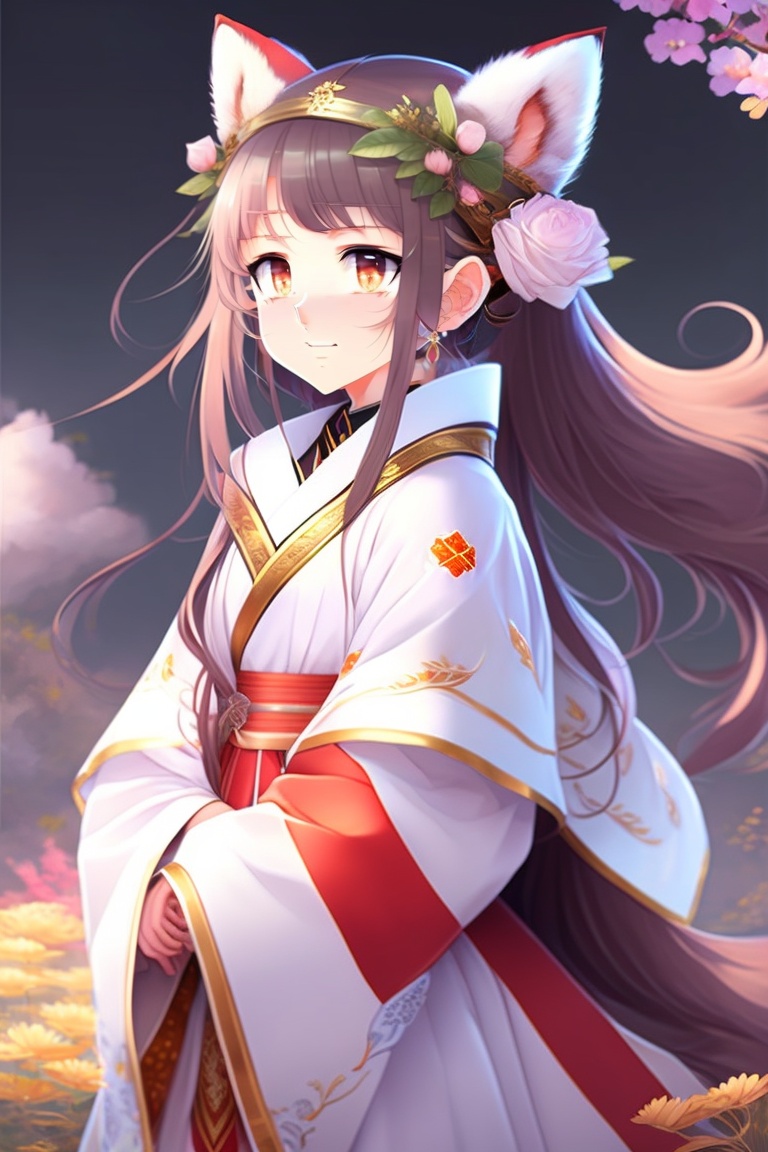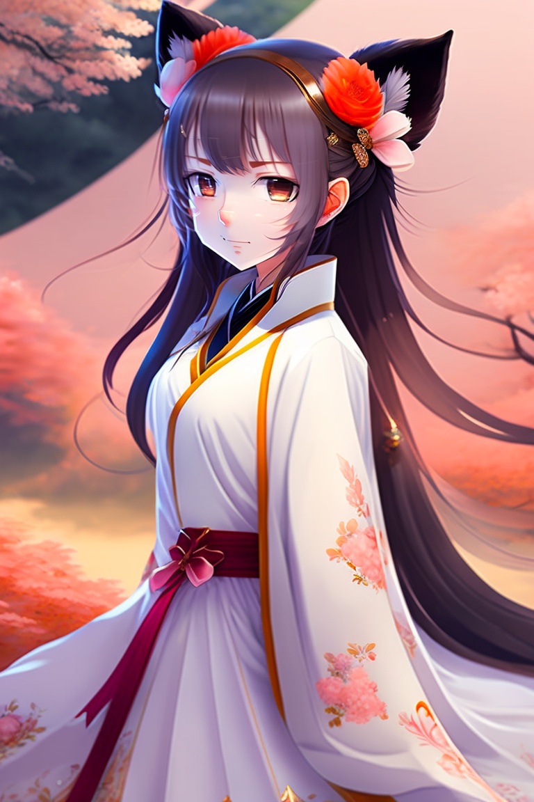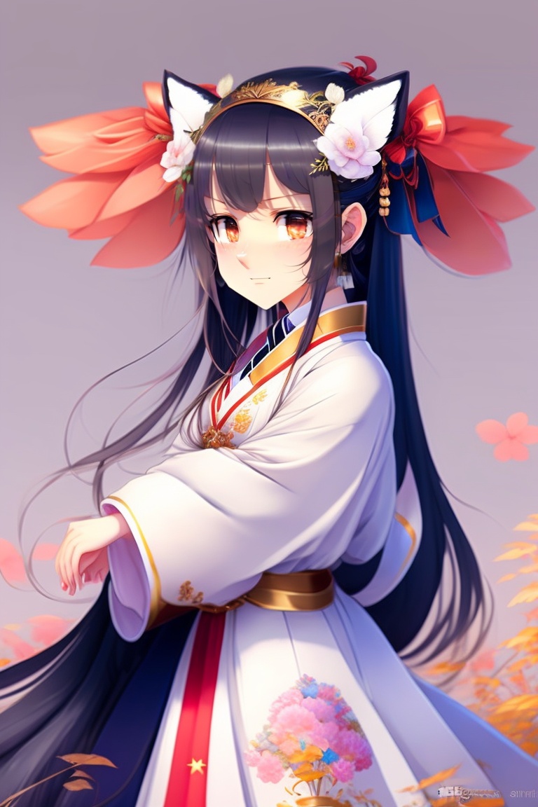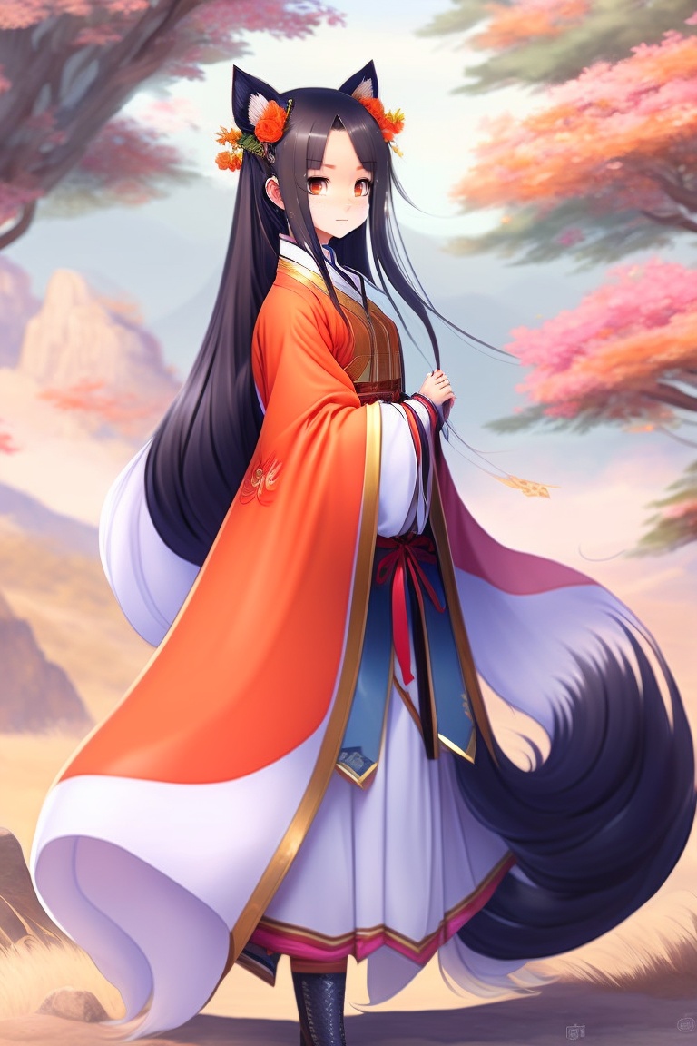 Anime fox girl, pretty, alert, long black hair, the little girl is wearing a chinese hanfu costume, made of silk, and has many colors, white tail.
