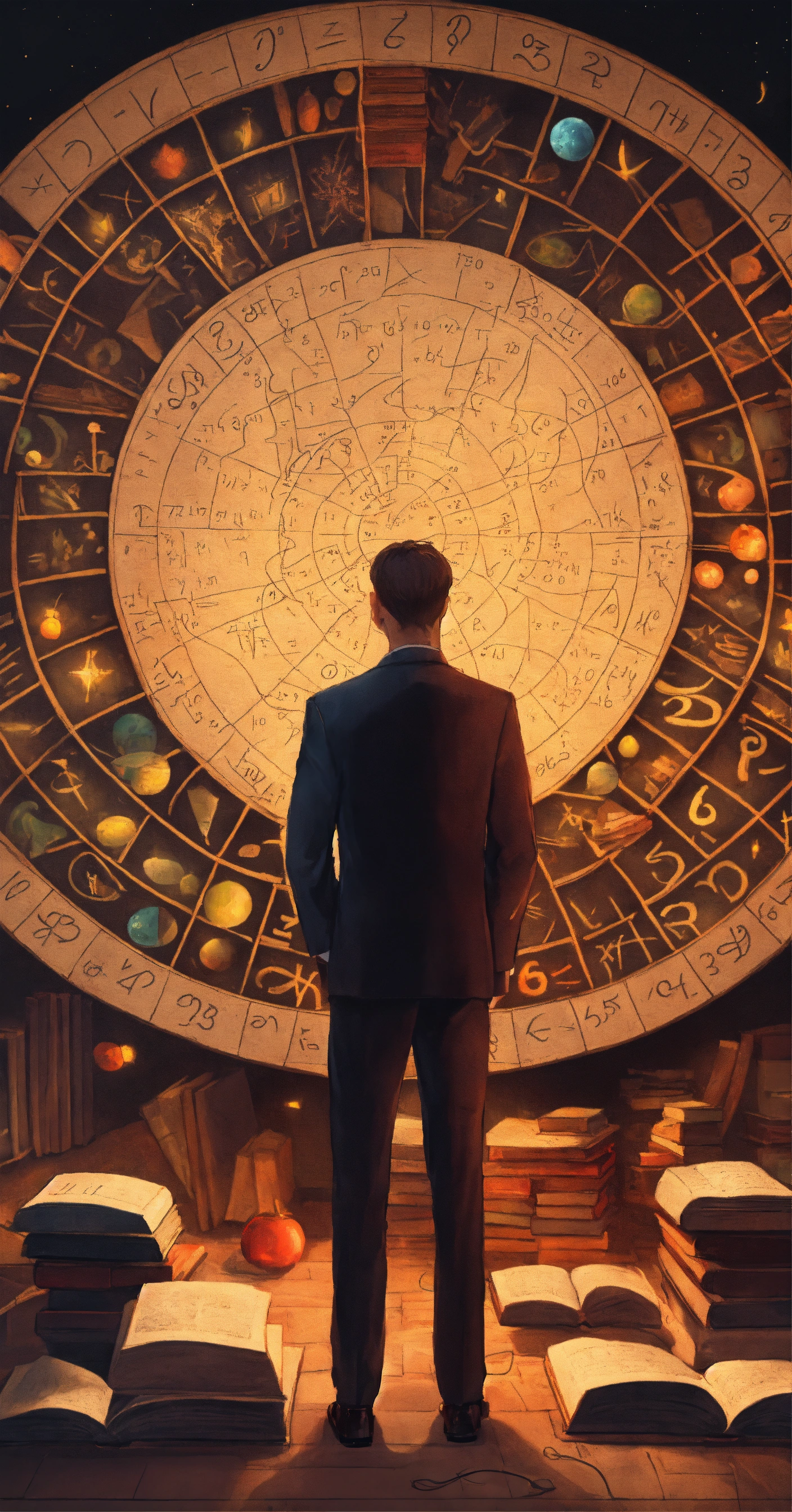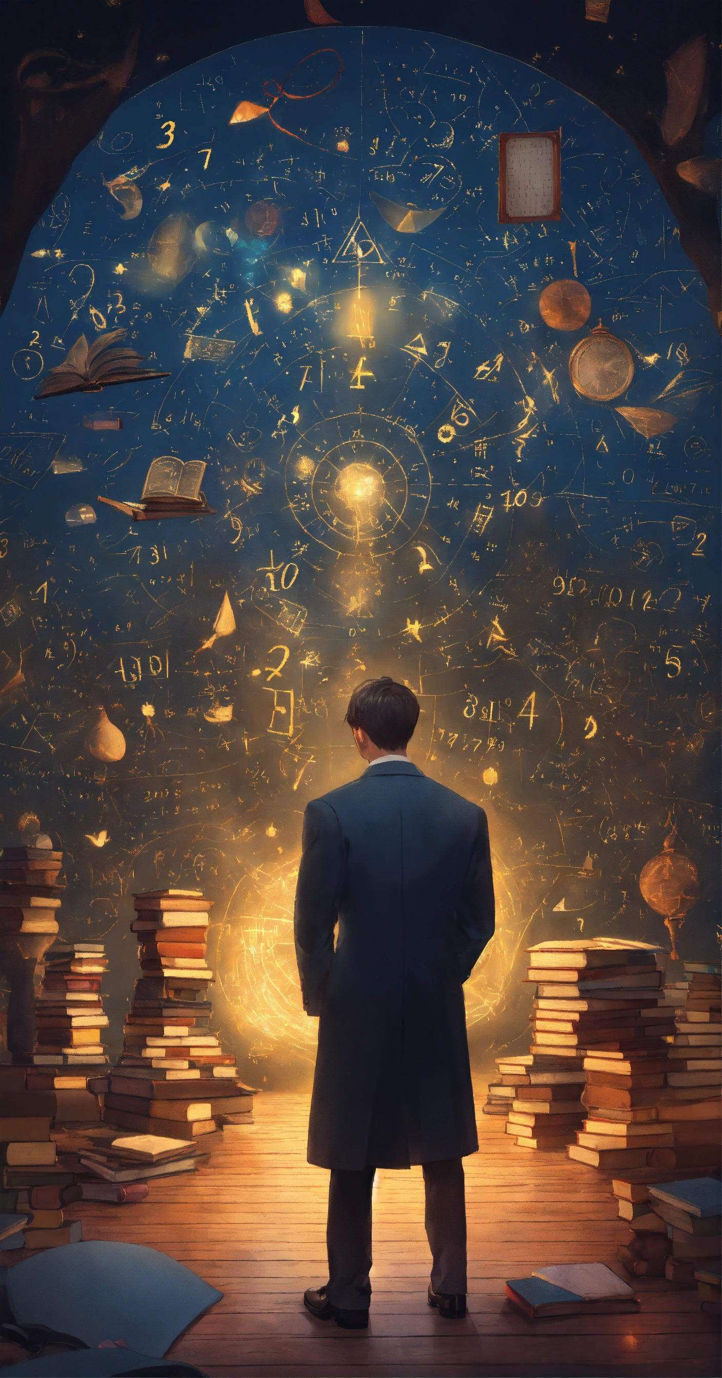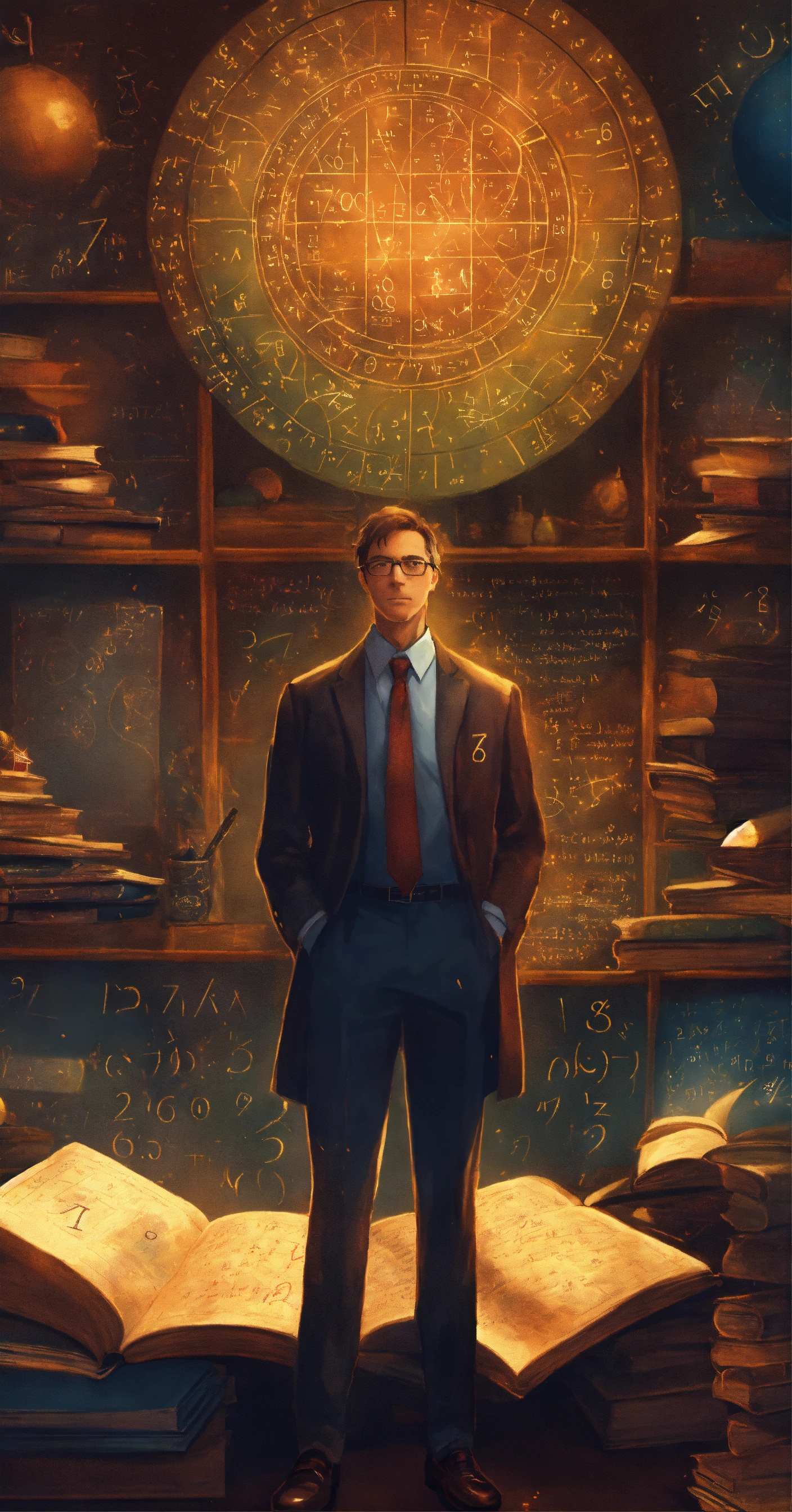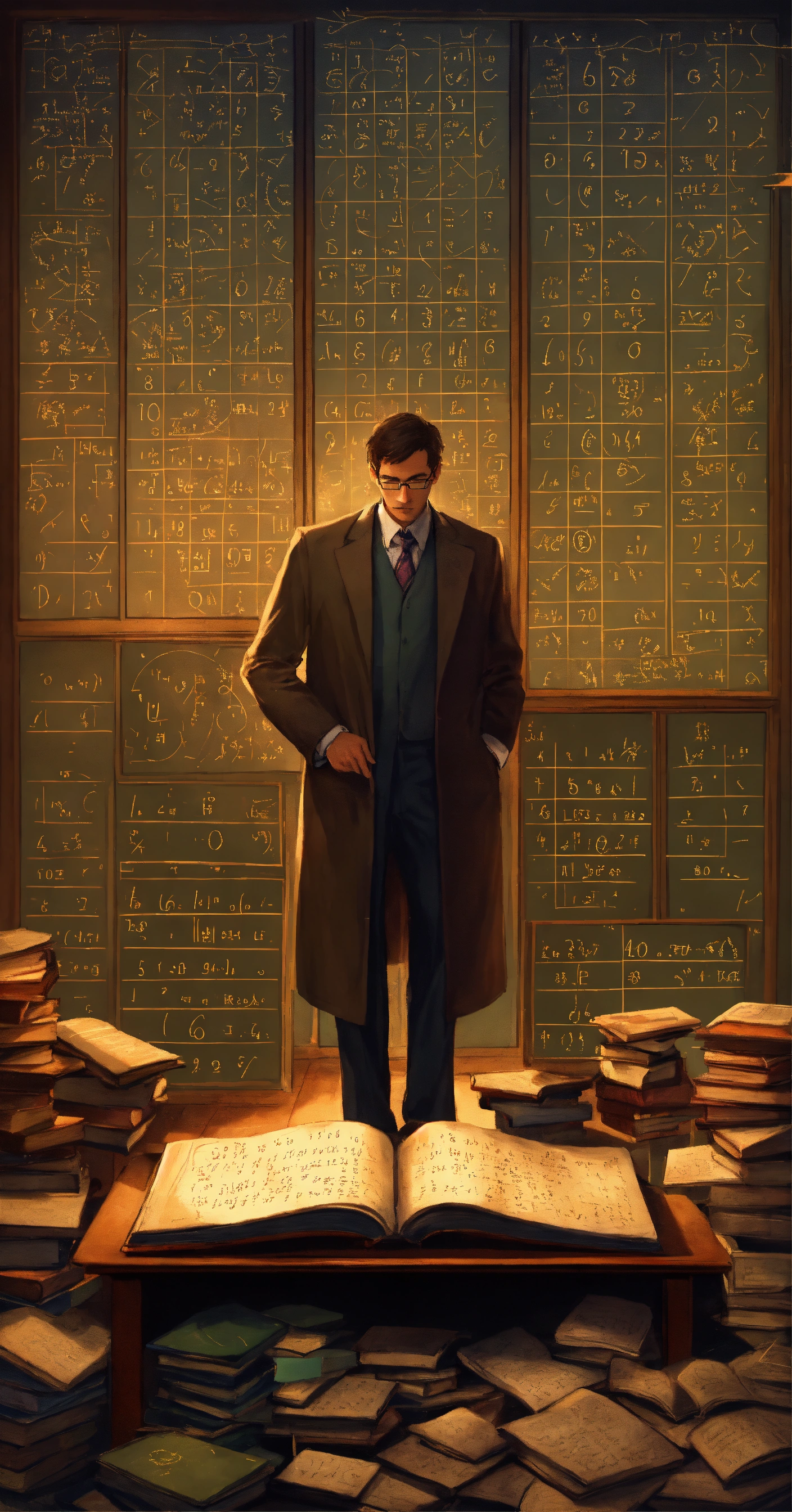 Full of numbers, mathematic symbols, groomy, dark, male serious teacher standing at the start, mystic, fantasy, maths books lie around