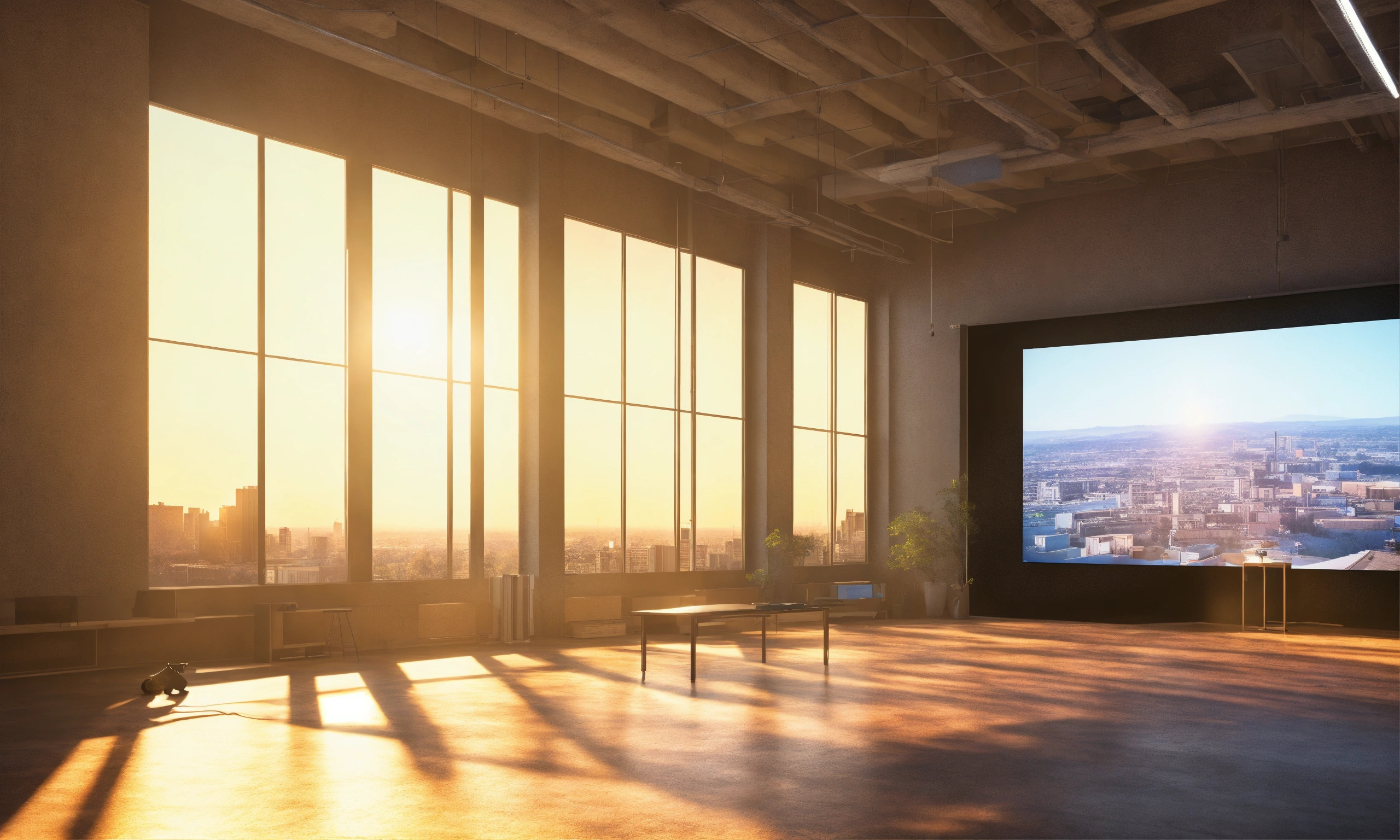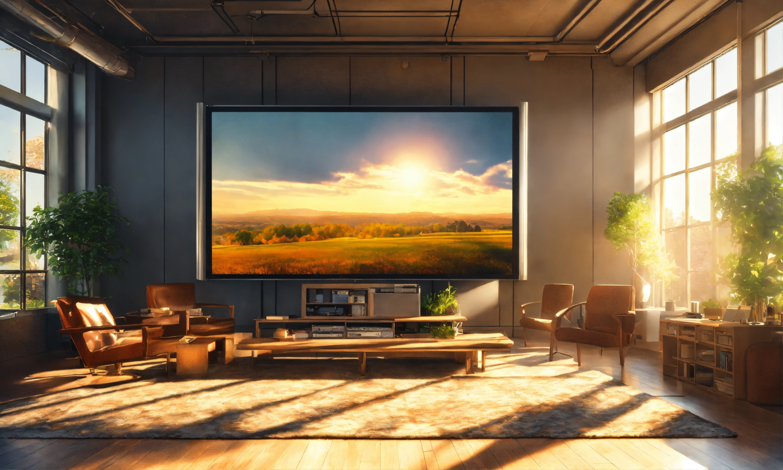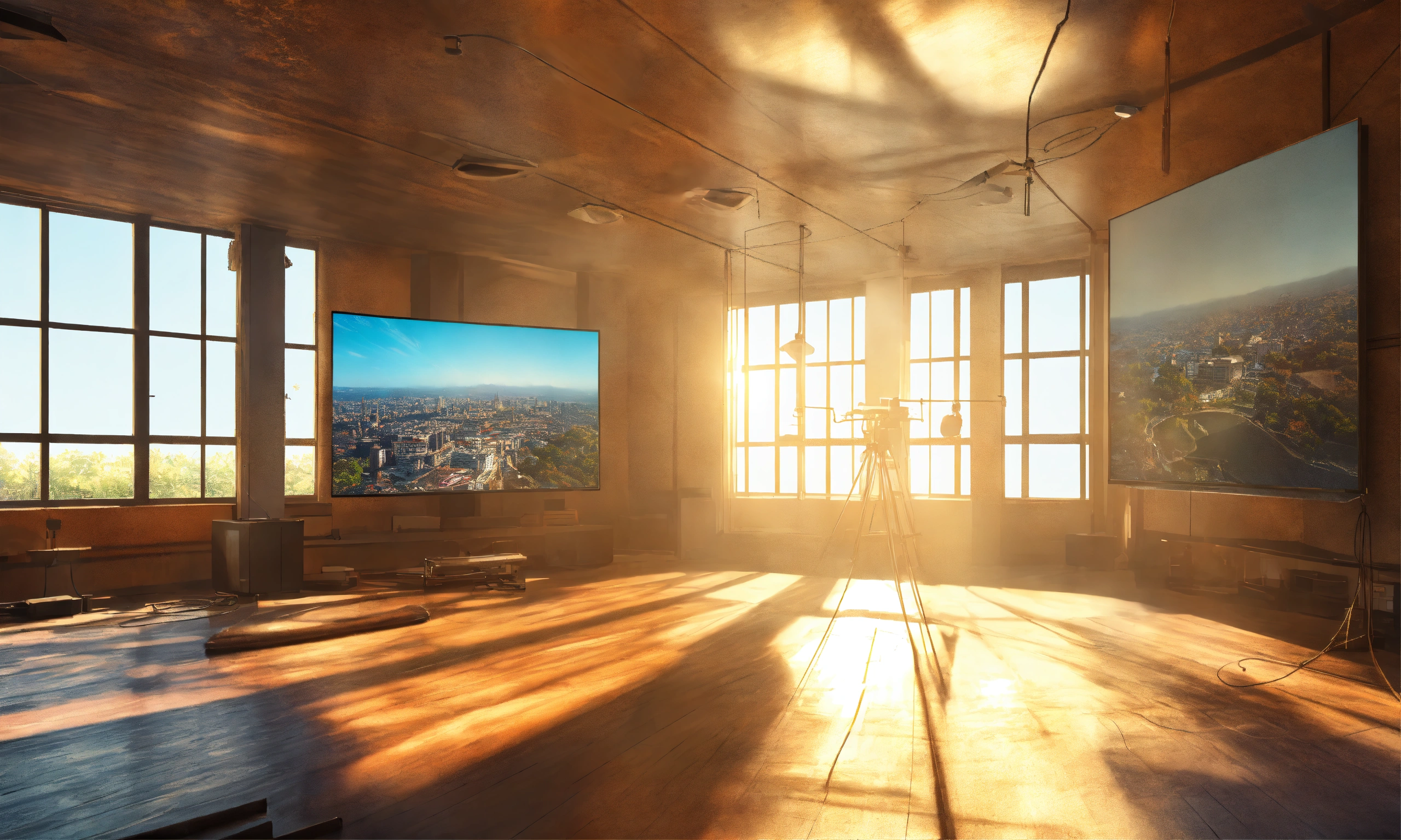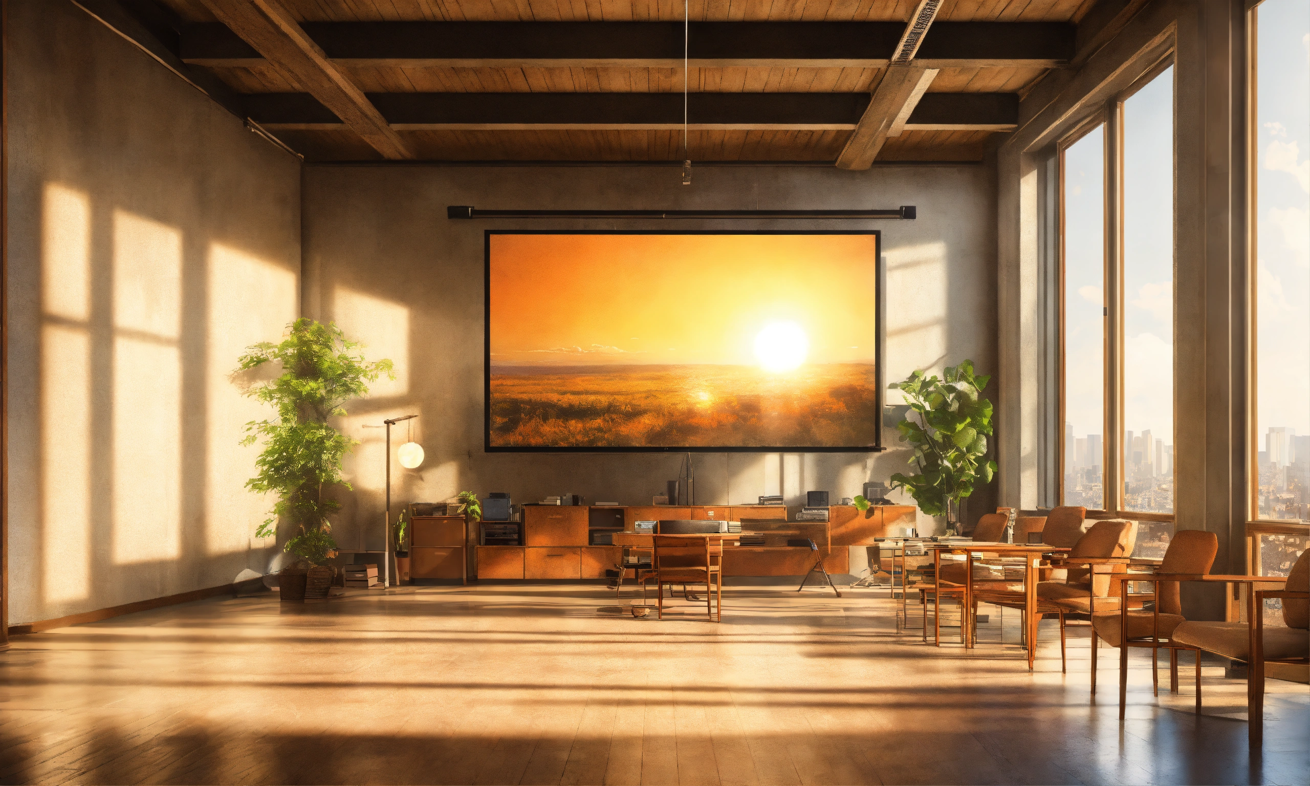 Bright afternoon sun, vintage meets modern university mixed medium architecture interior media modern computers massive projection screen full hd, hyperrealism
