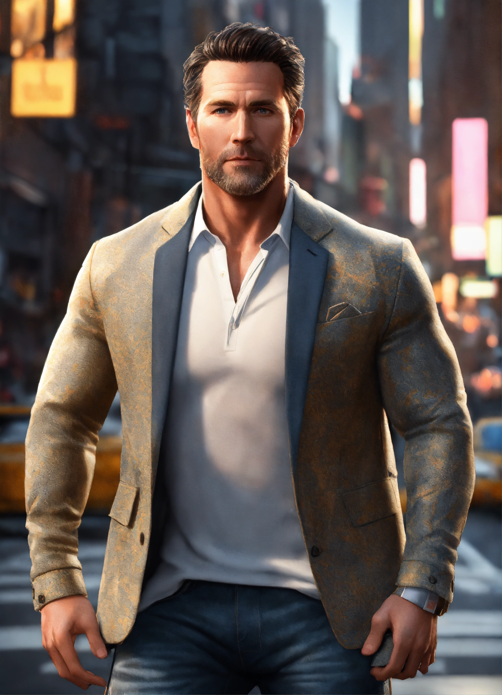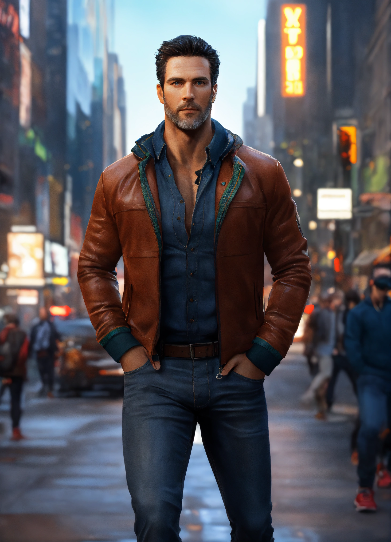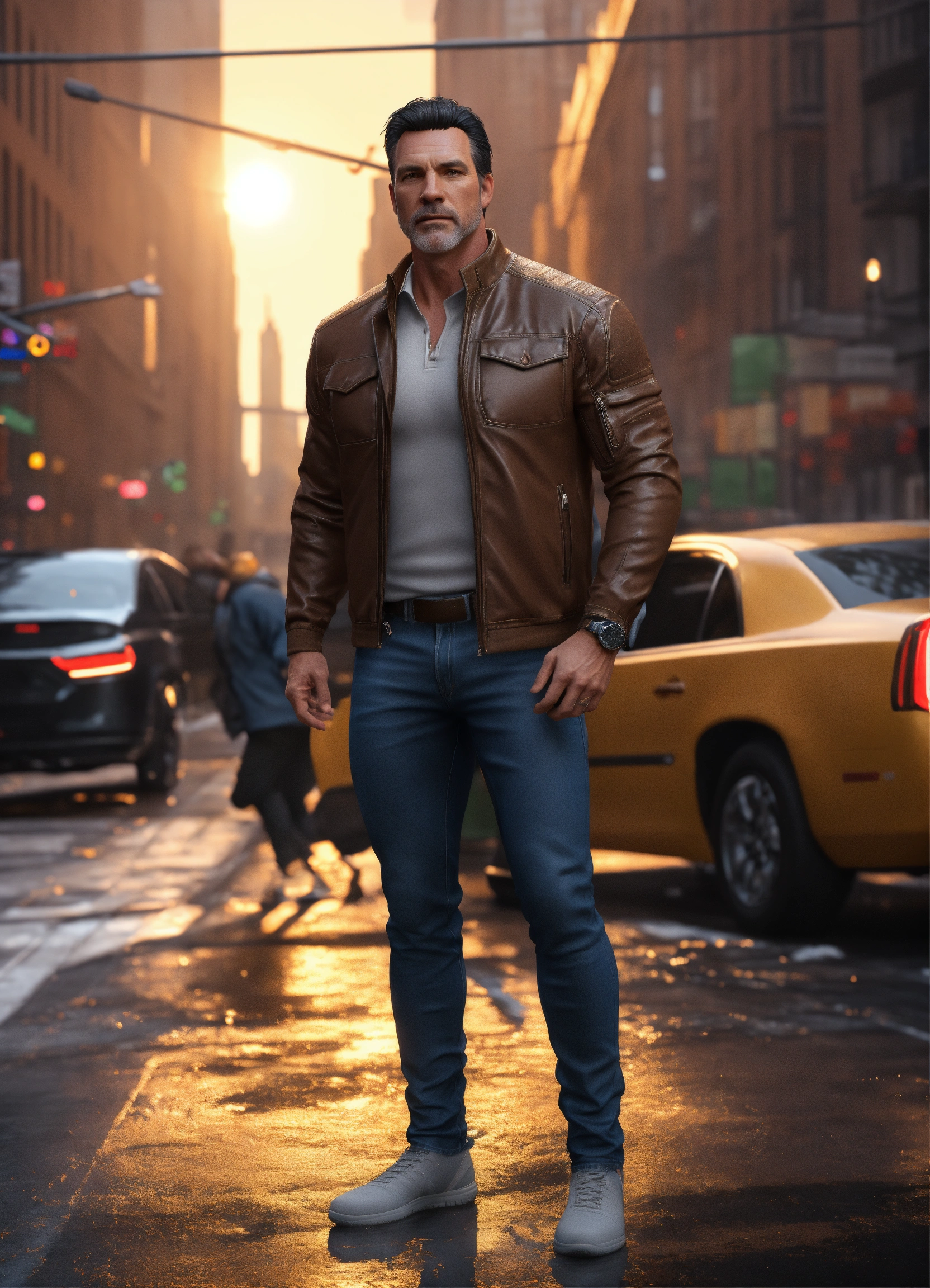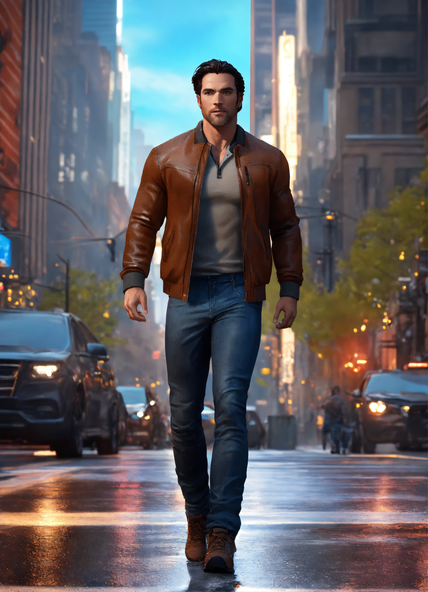 Full body of a middle aged handsome strong athletic white man with shoulder length dark hair, a handsome athletic man, wearing a sports jacket and jeans, in a new york city full body, 8k resolution concept art portrait dynamic lighting hyperdetailed intricately detailed splash art trending on artstation unreal engine 5 volumetric lighting