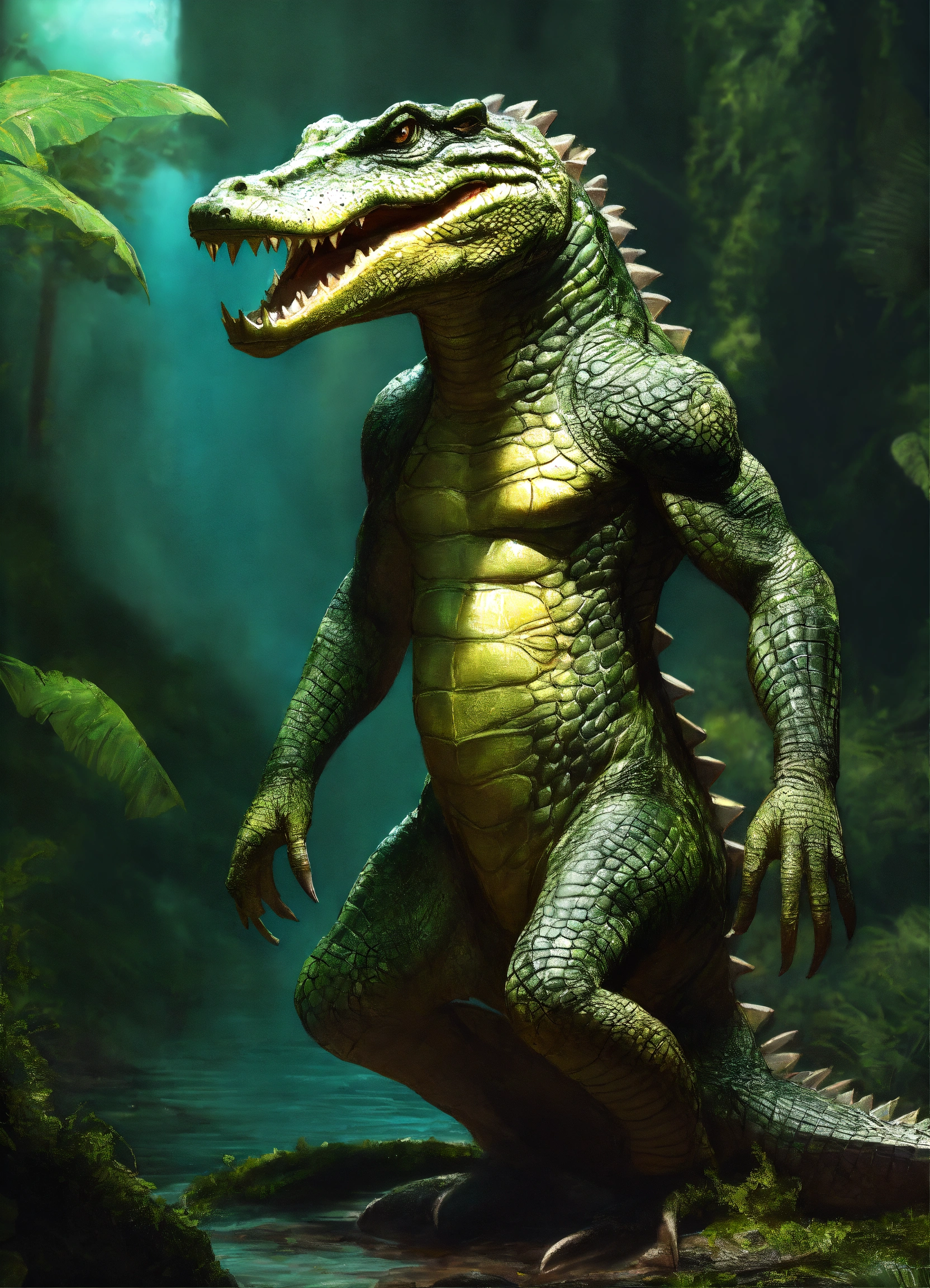 Realistic drawing a full body portrait of a humanoid crocodile alien,