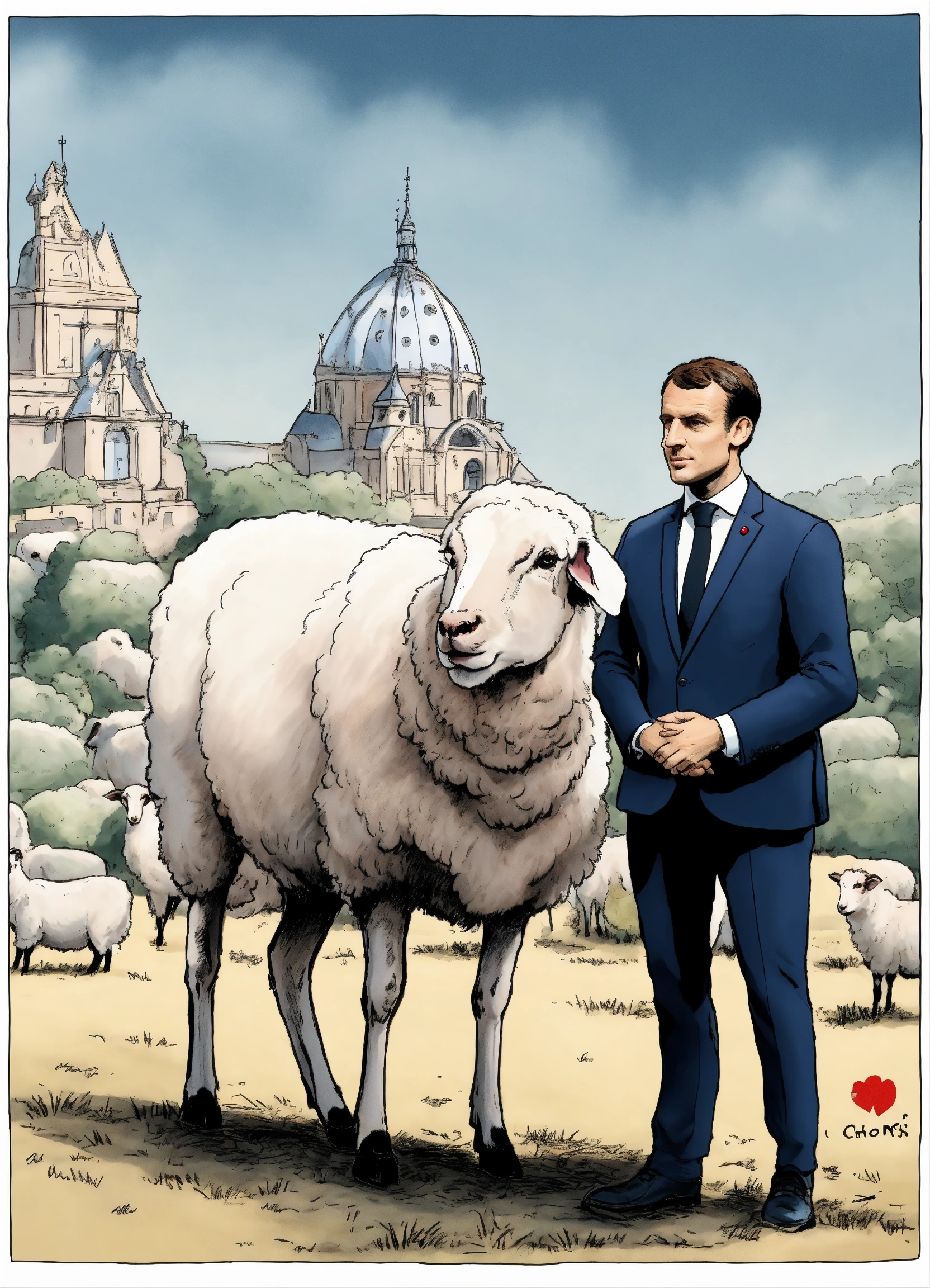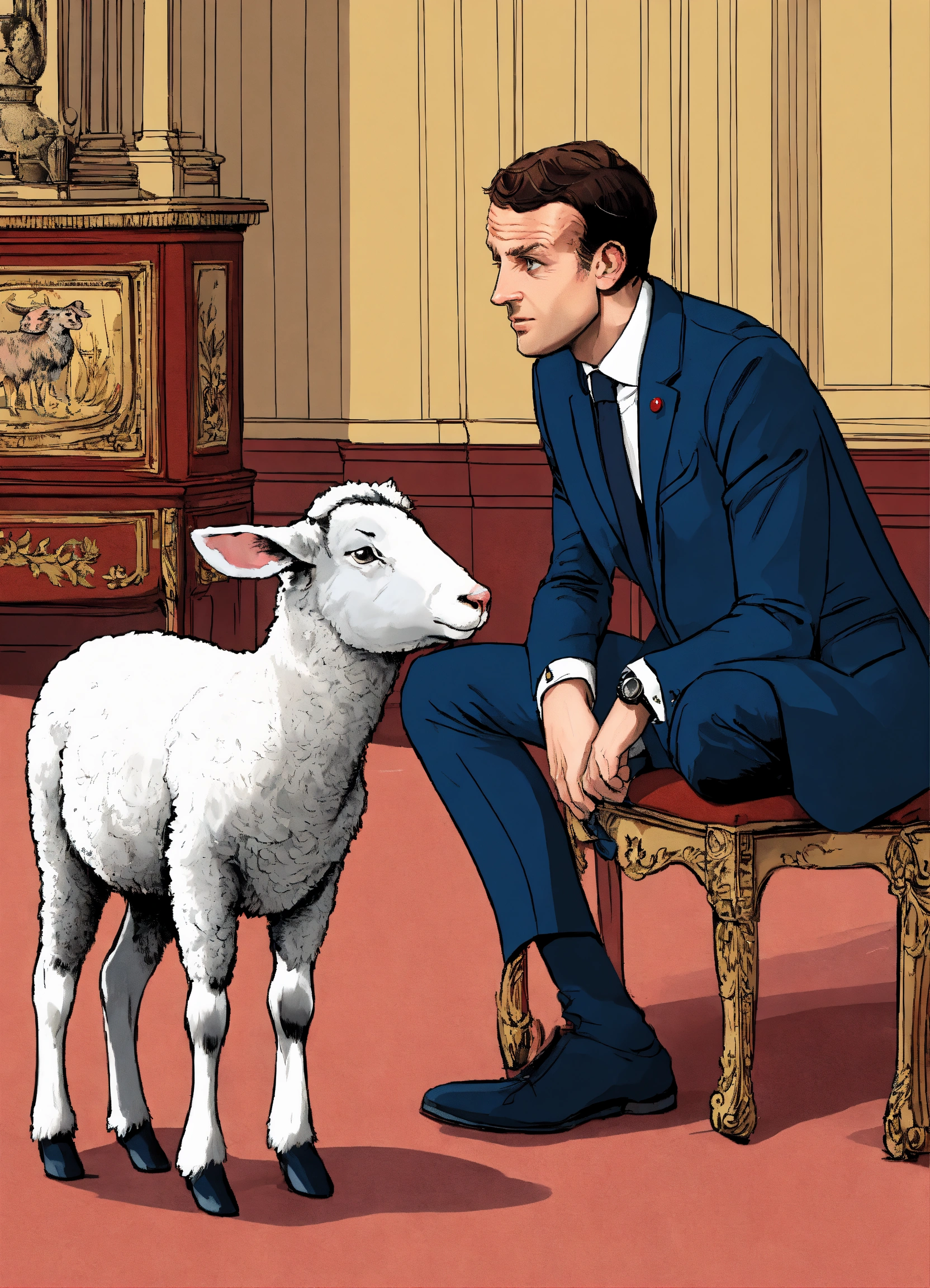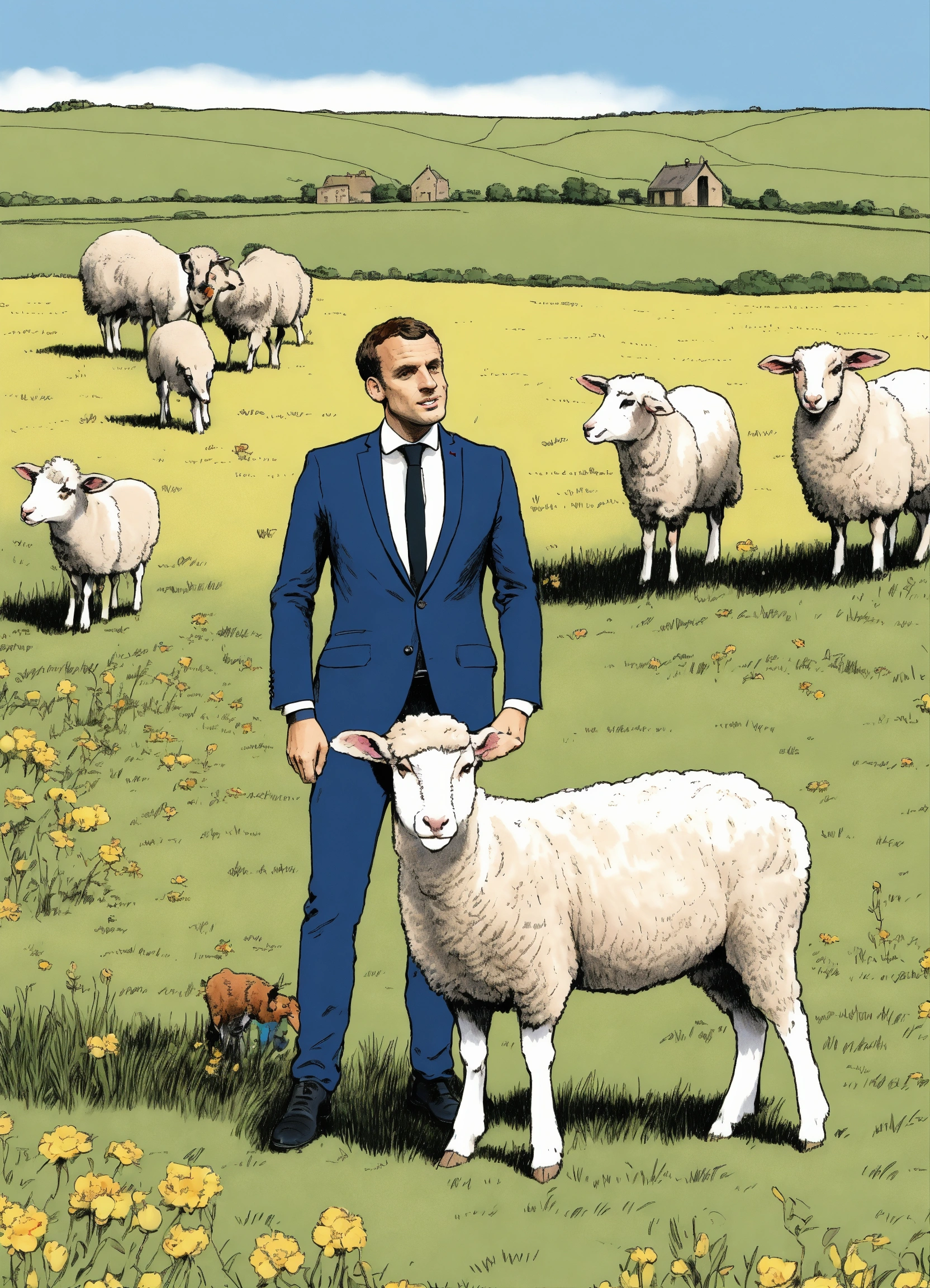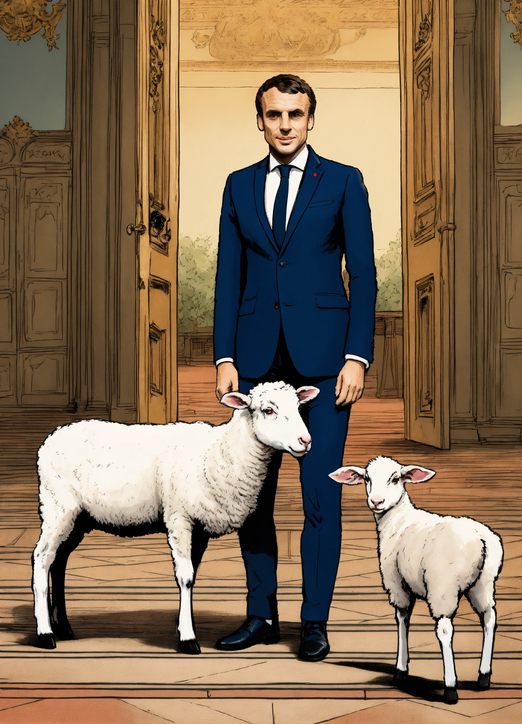 Emmanuel macron avec c ministre en bane dessiné disant que les français sont des moutons