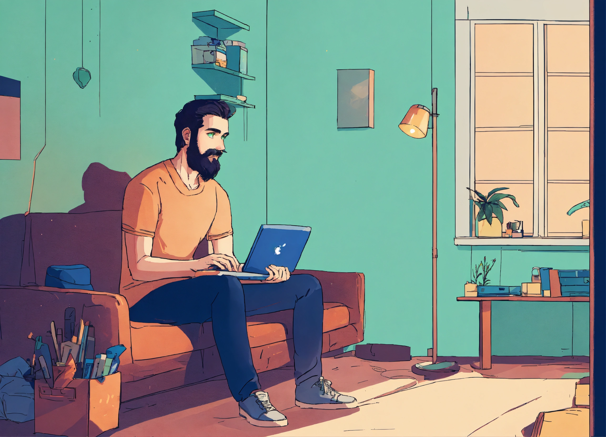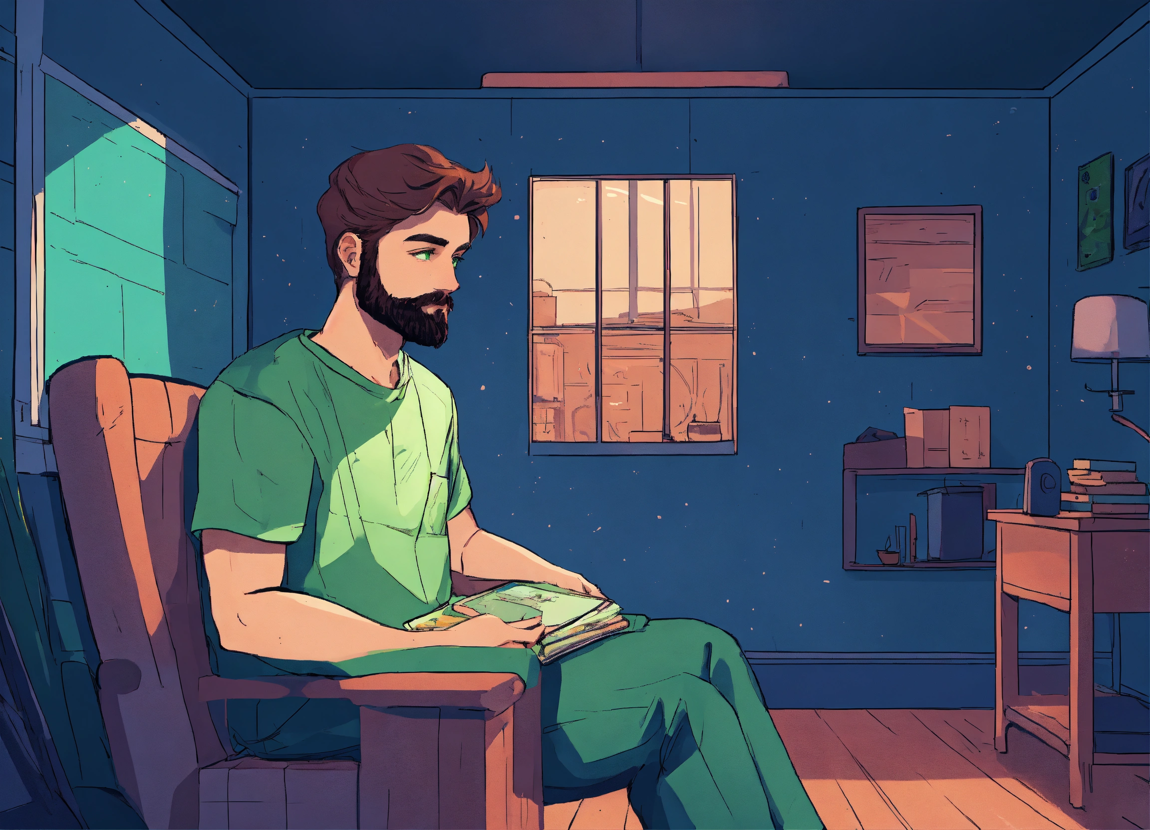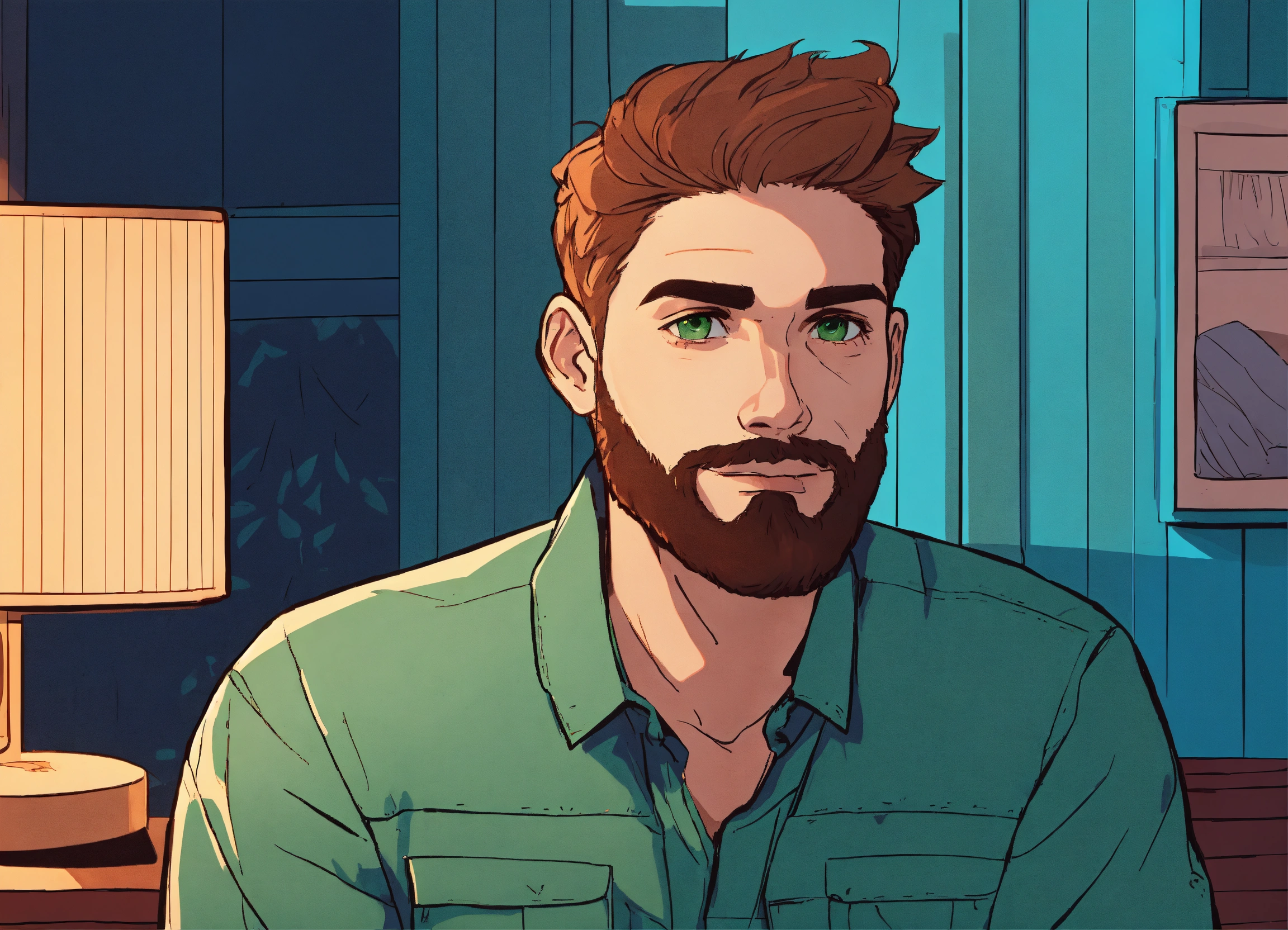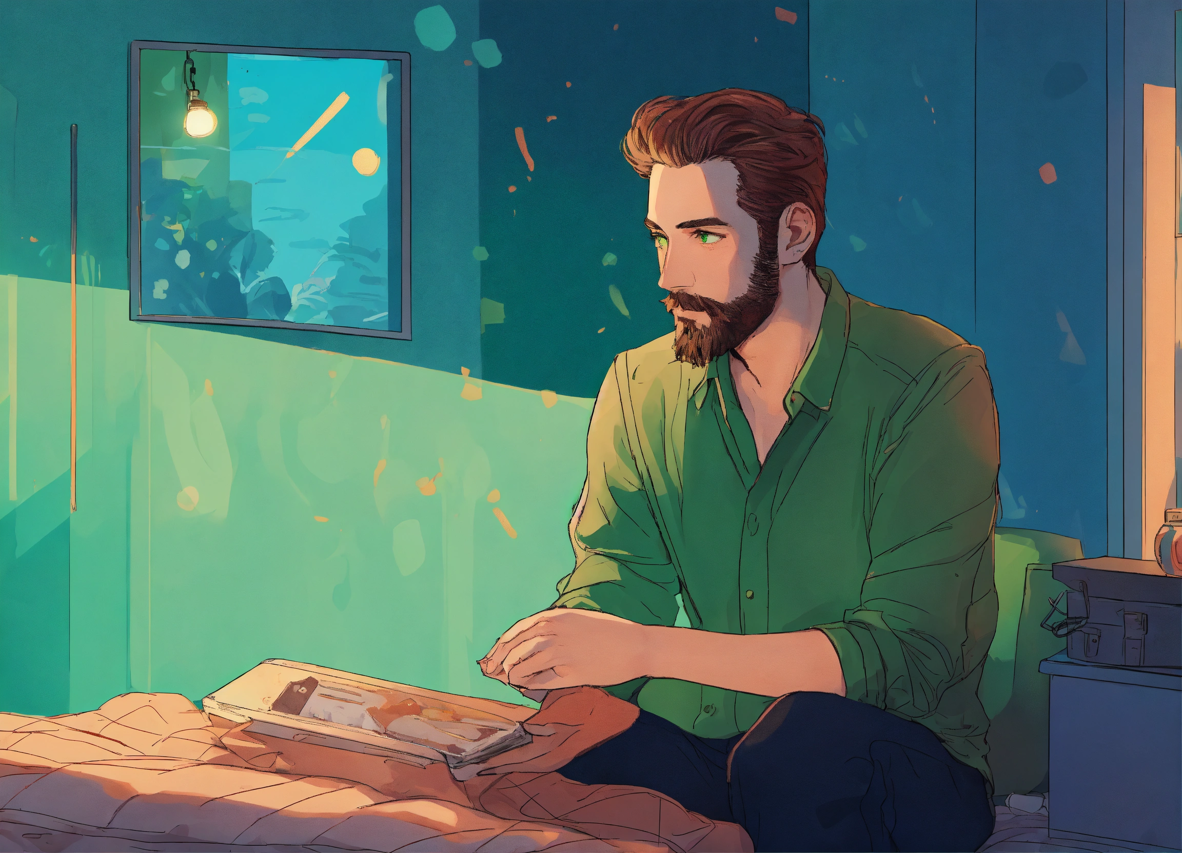 An illustration style where man with green eyes and sparse light thin facial hair is hiding box in a hand, show him sitting in his room with blue walls