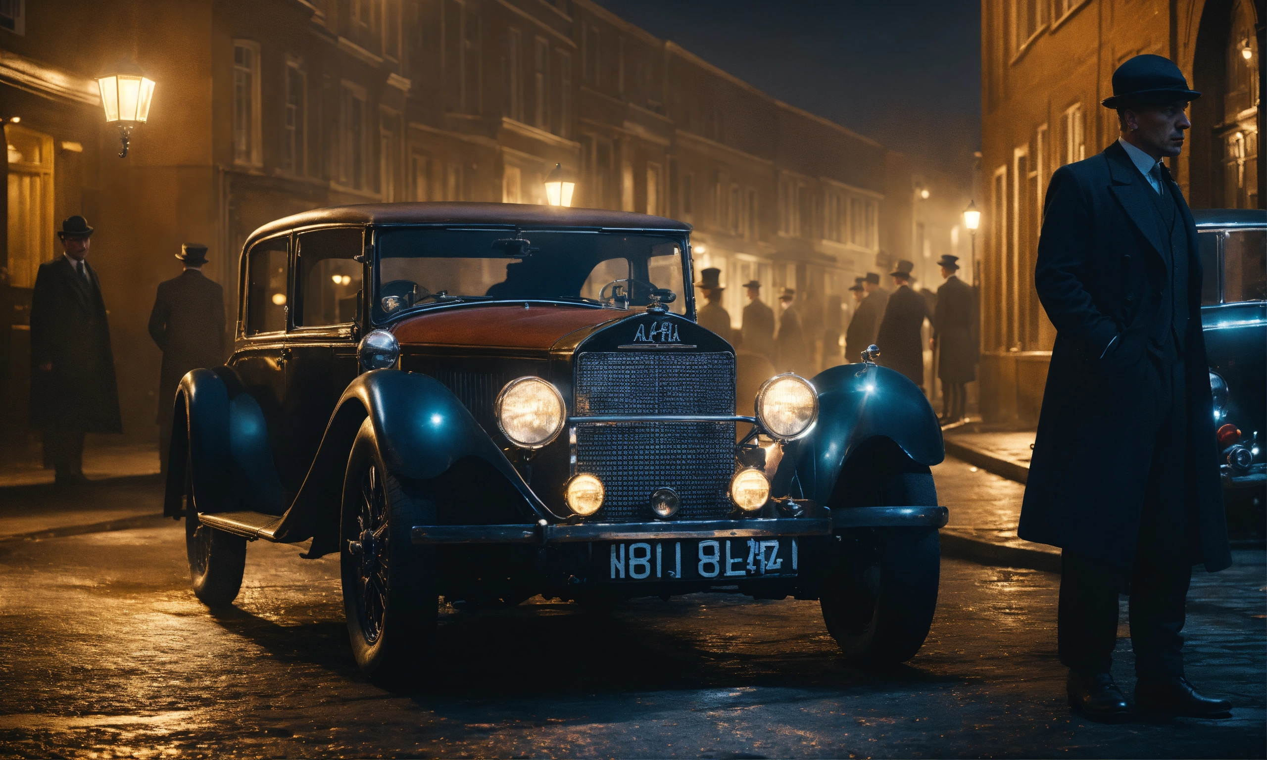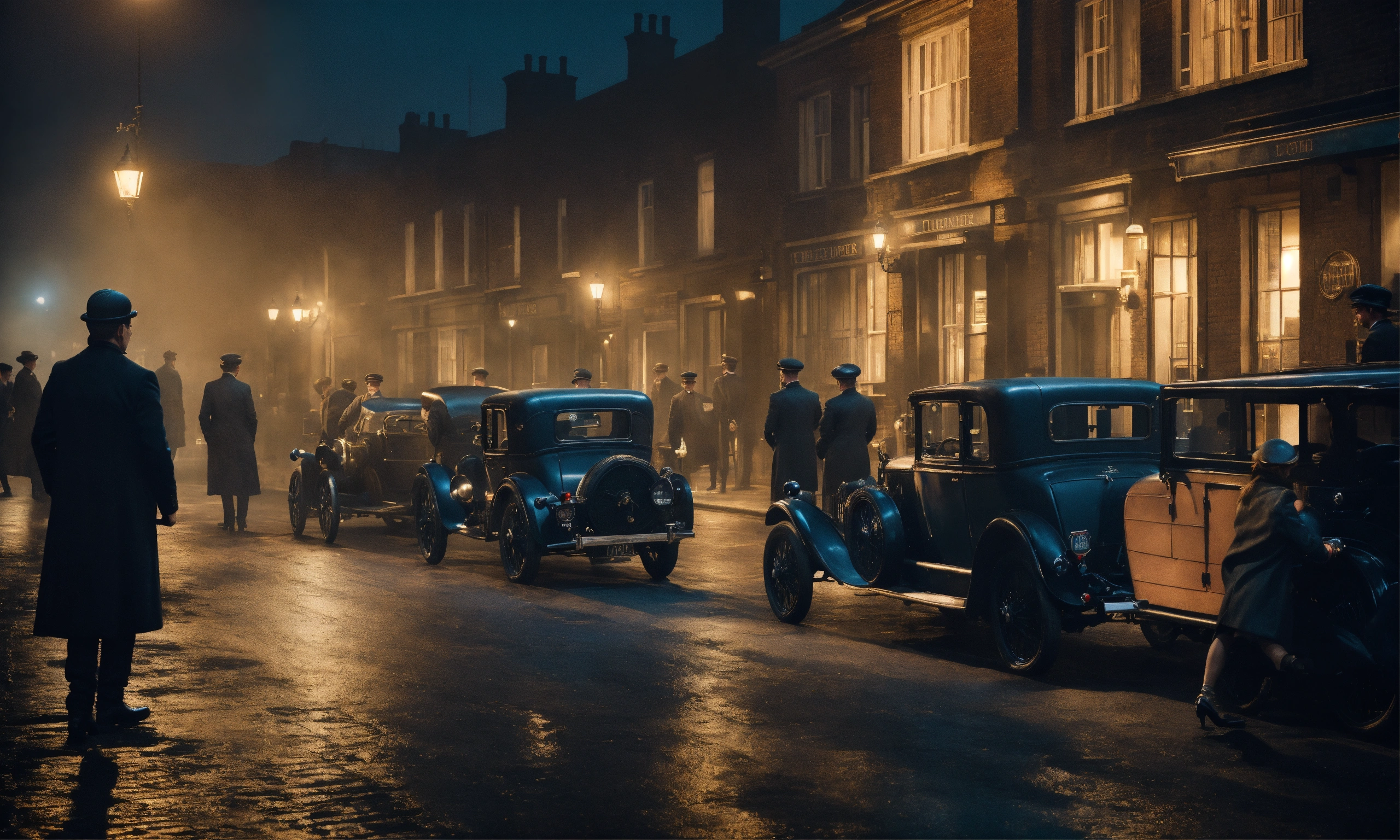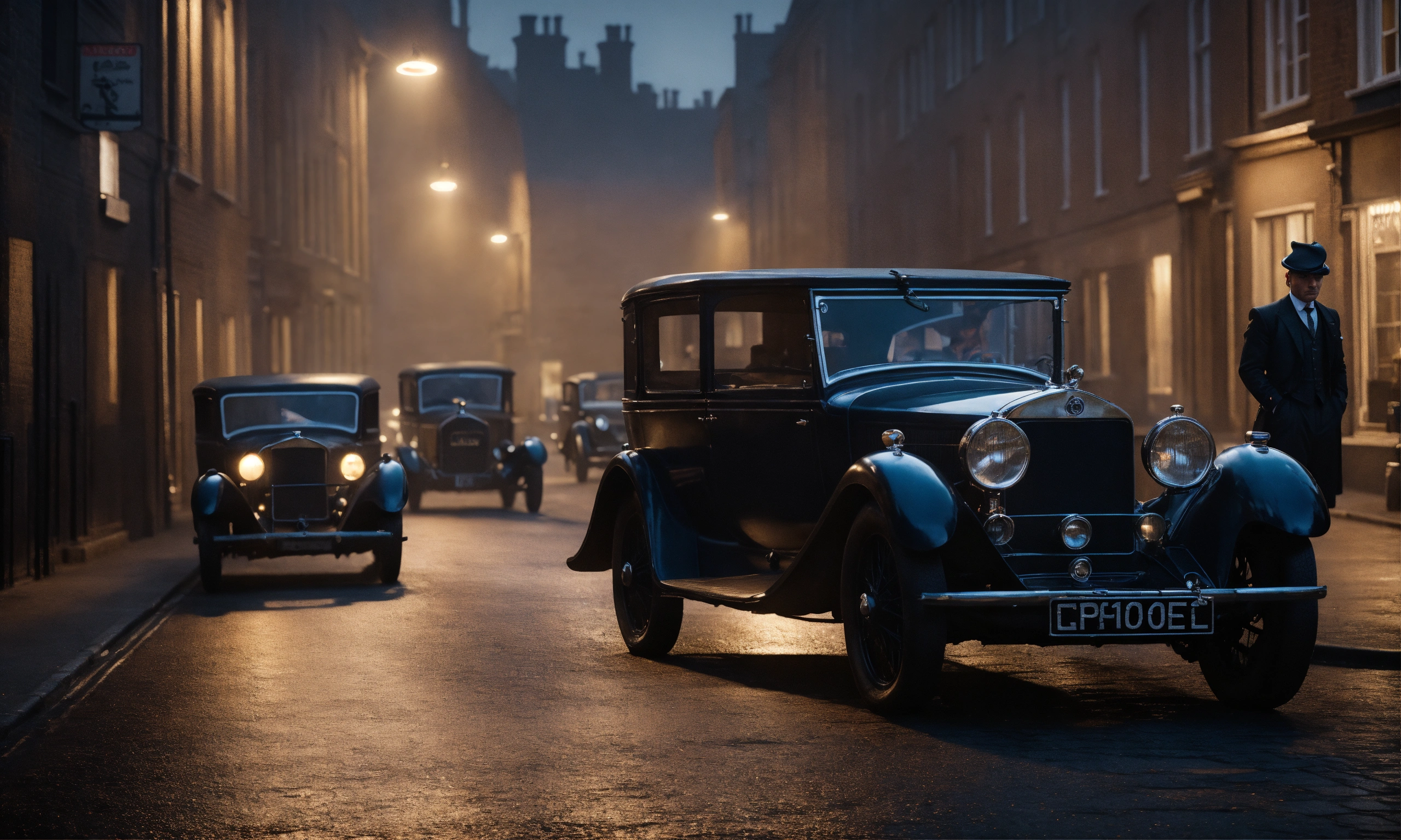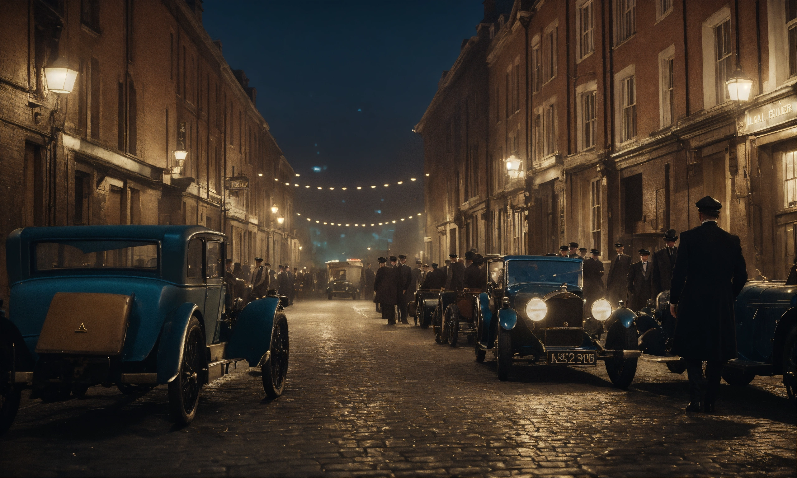 Group of peaky blinders mafia with cars in a street, mood lighting, wide front shot, night time, 8k, luxcorerender, earthly colour, cinematic photography, real humans, real images, matte finish, shot on arri anamorphic, extreme wide shot, smooth, sharp focus, ornate, highly dynamic, particulate, hyperreal, wide shot