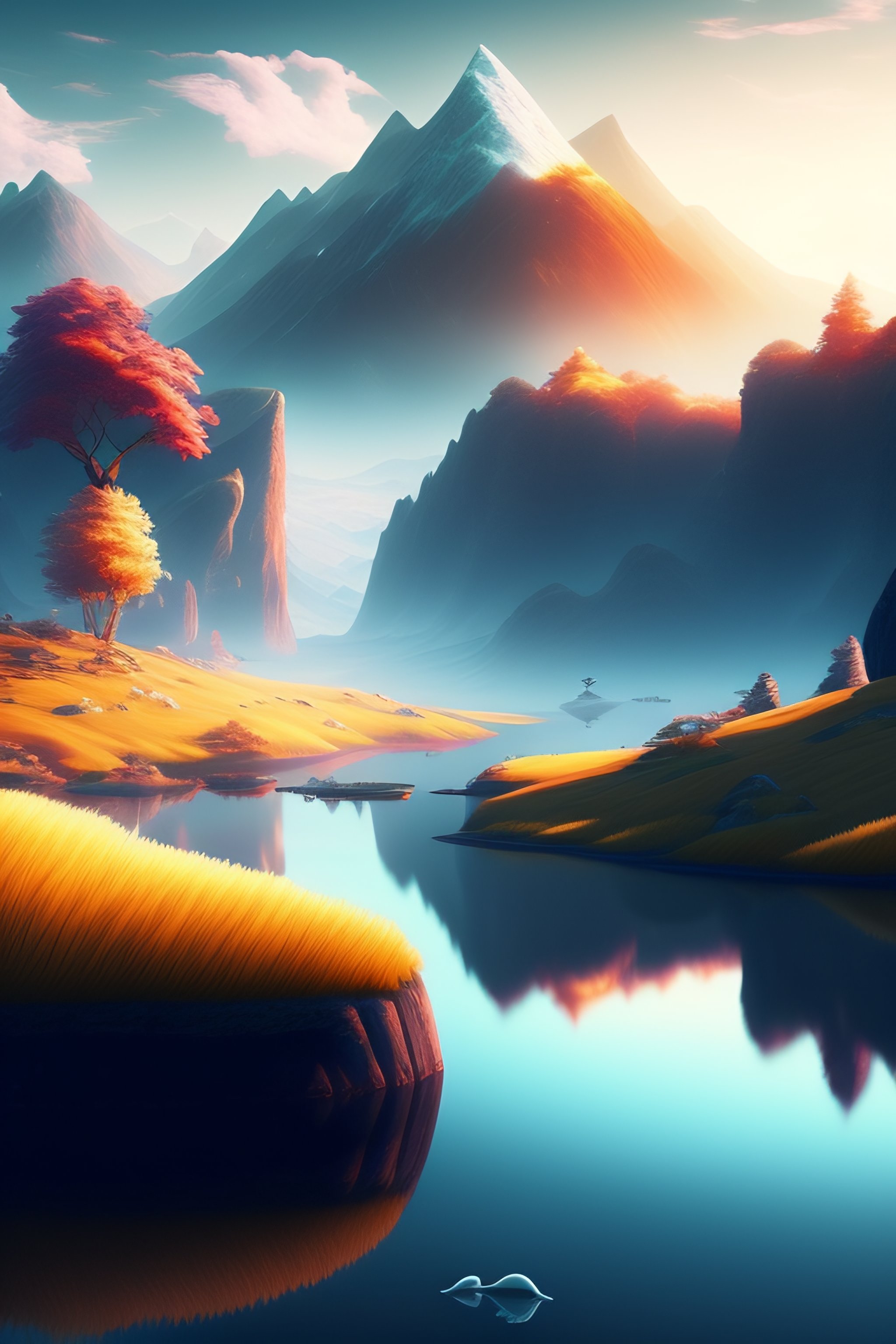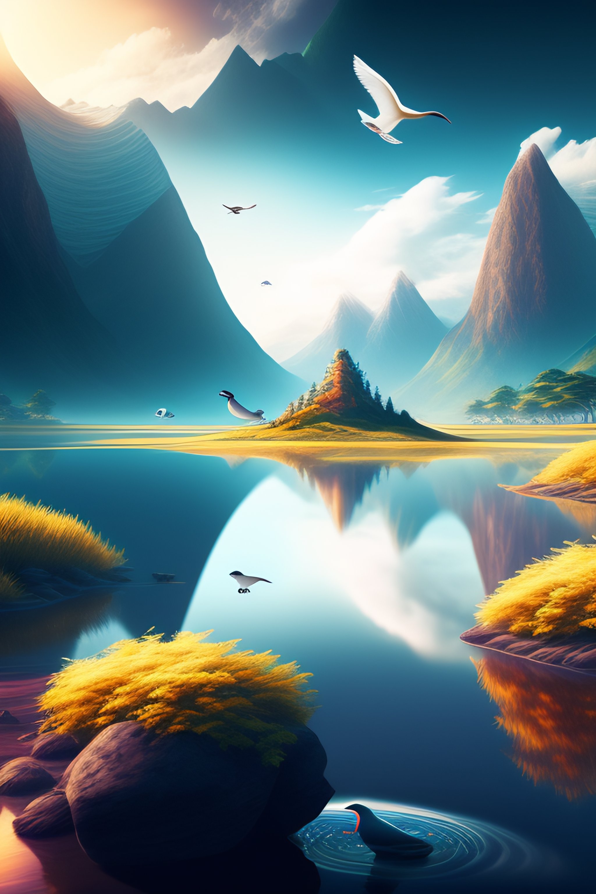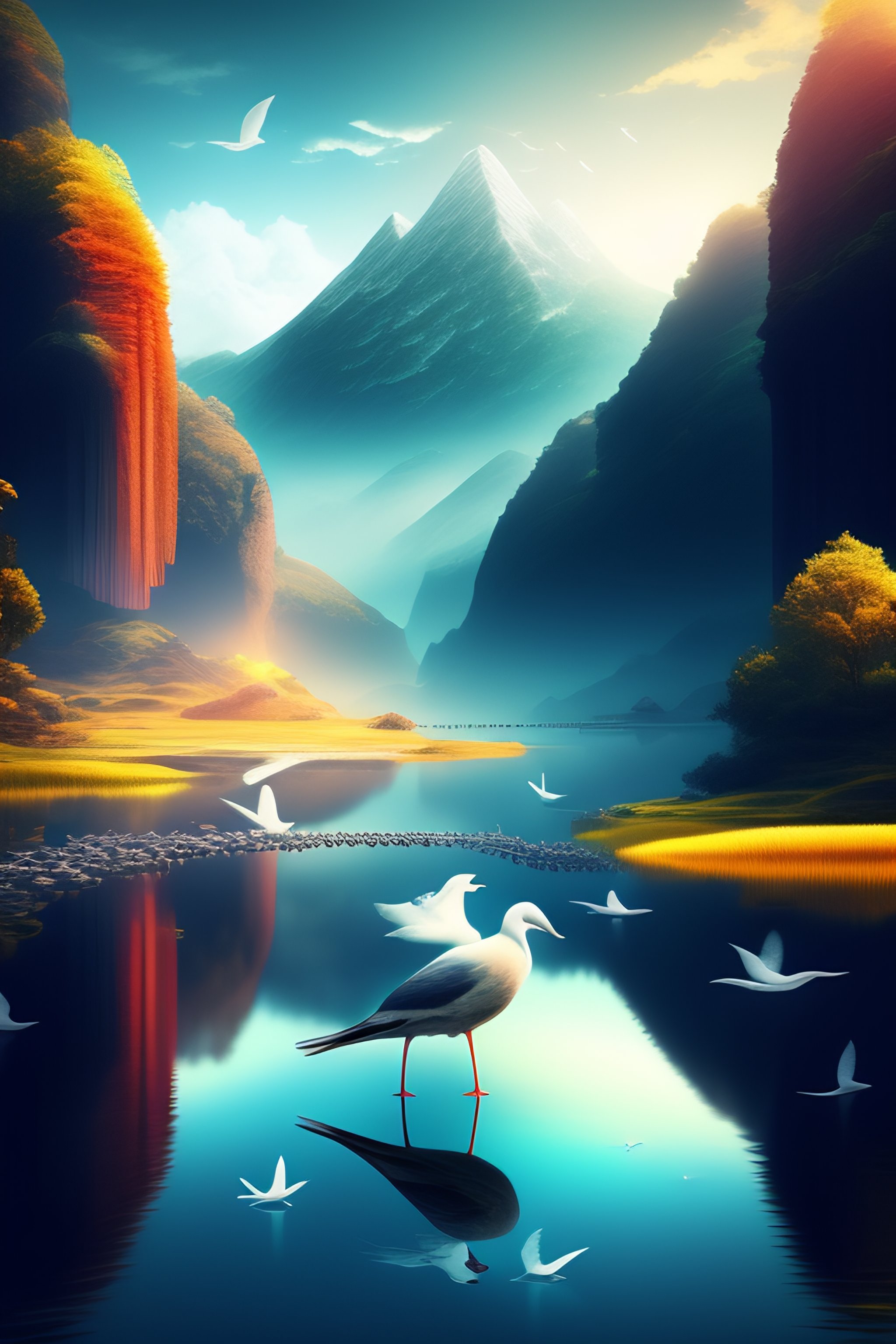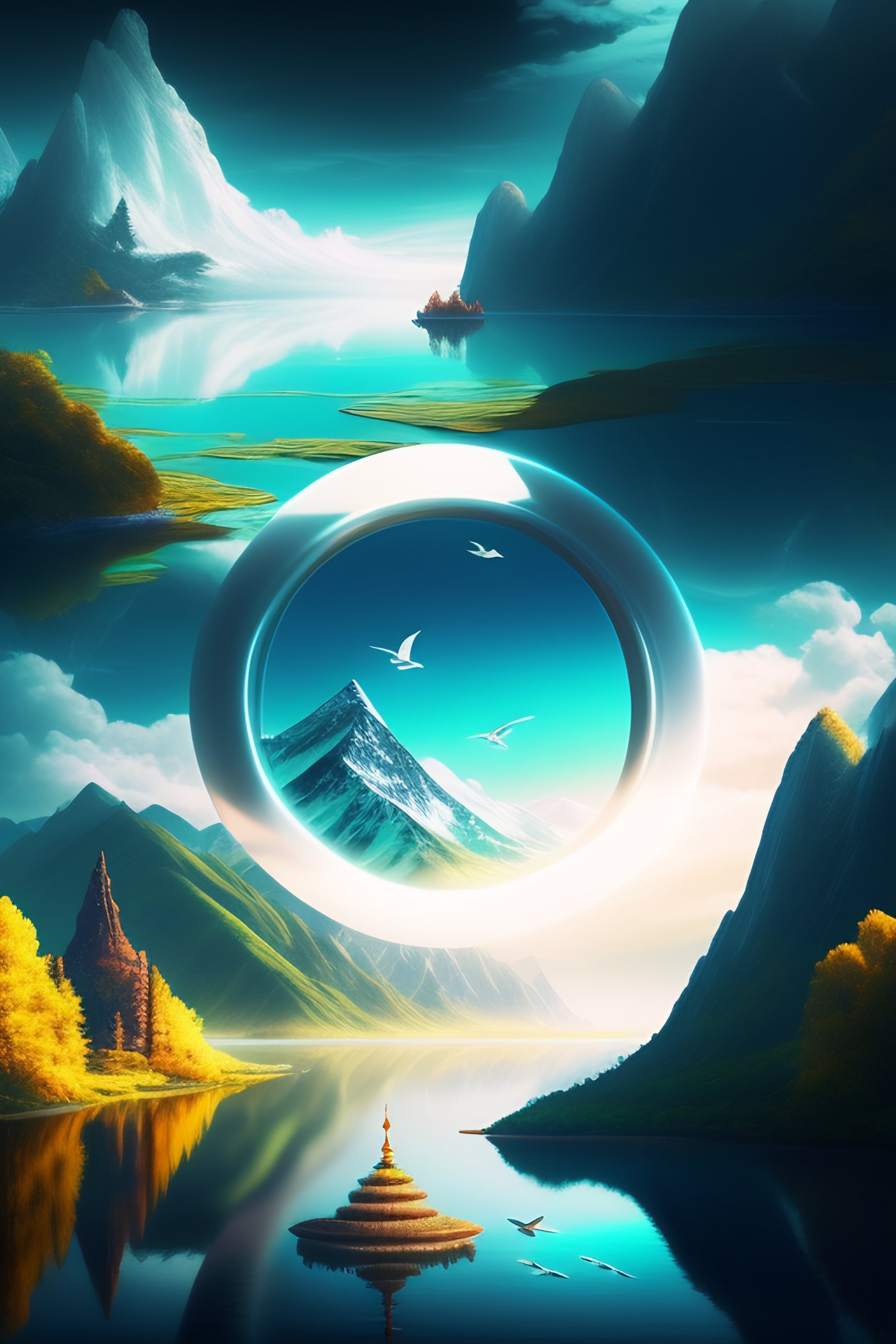 Energy ring, asia, fantasy, landscape, waterscape, white birds, sun, mountain, trees, river, stunning, clouds, highly detailed, hyper realistic, cinematic atmosphere, 4k