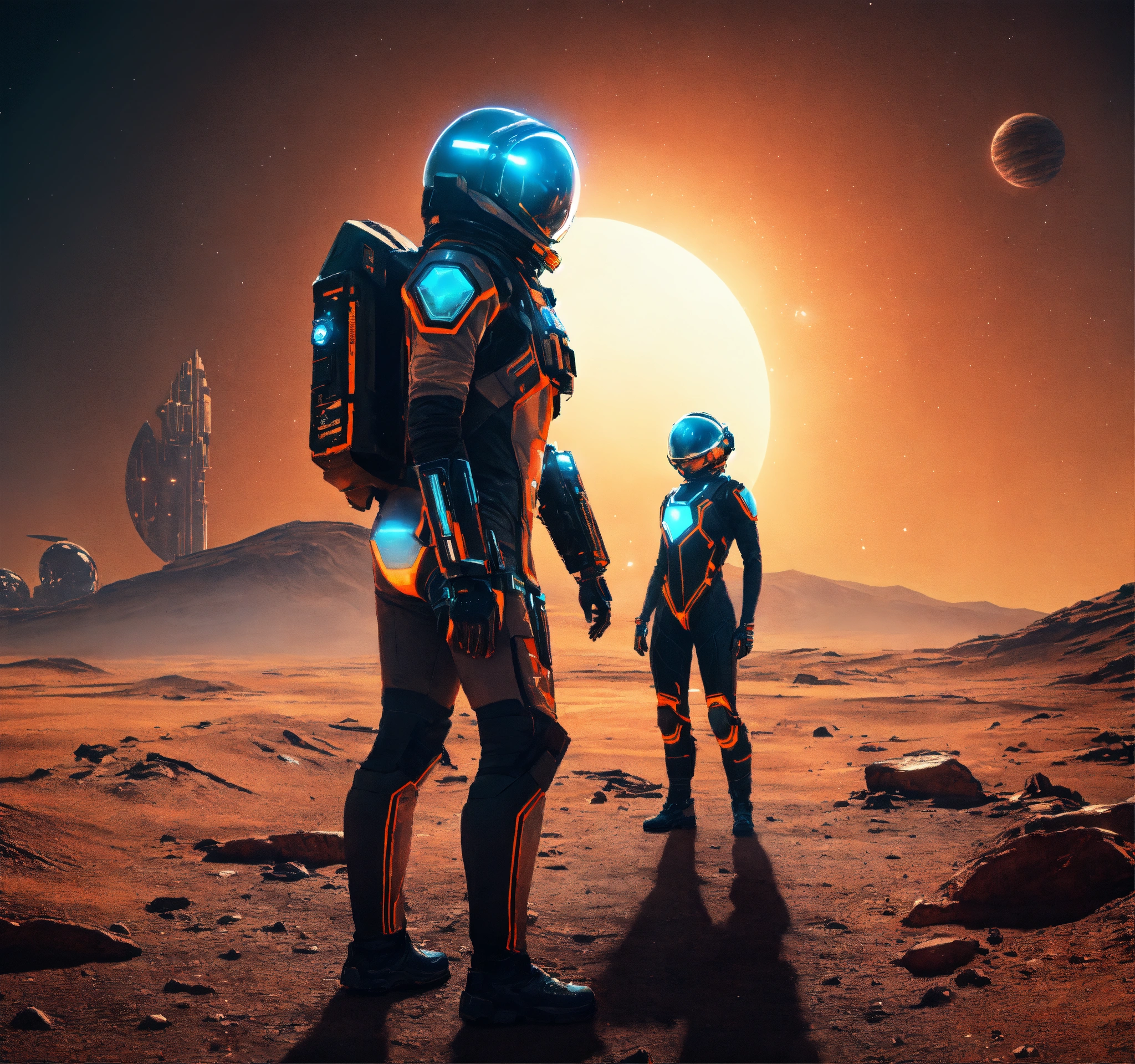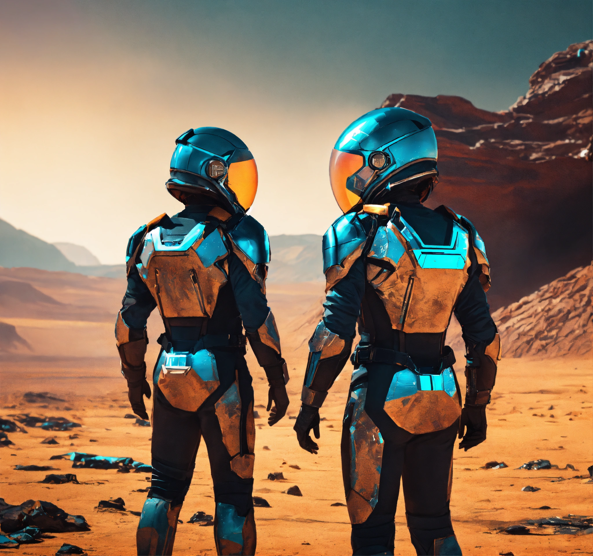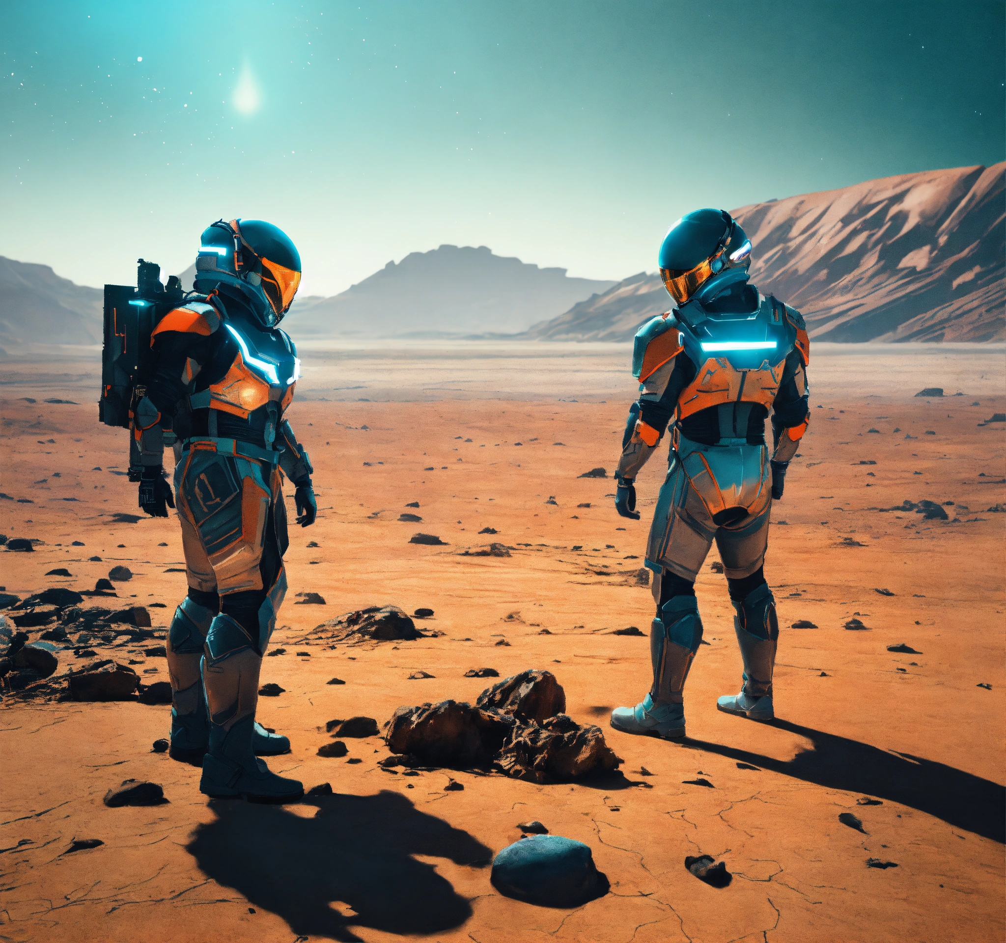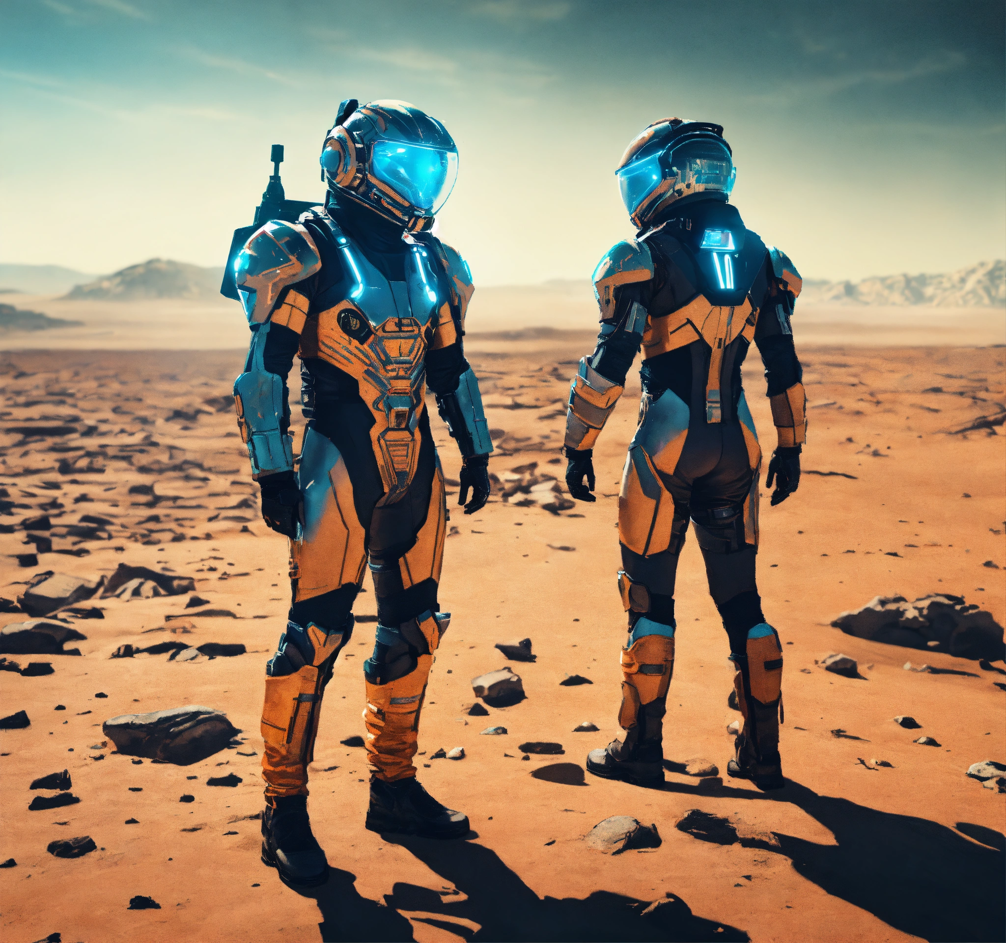 2 fighters are wearing a futuristic space suit on a desolate planet with cracked surface 8k