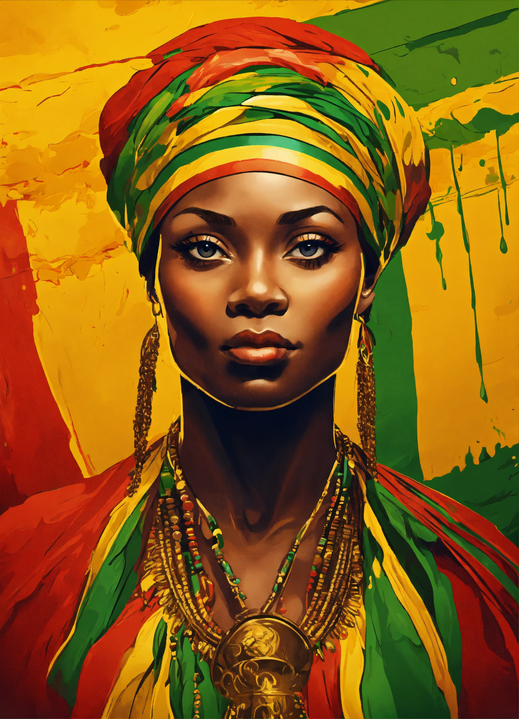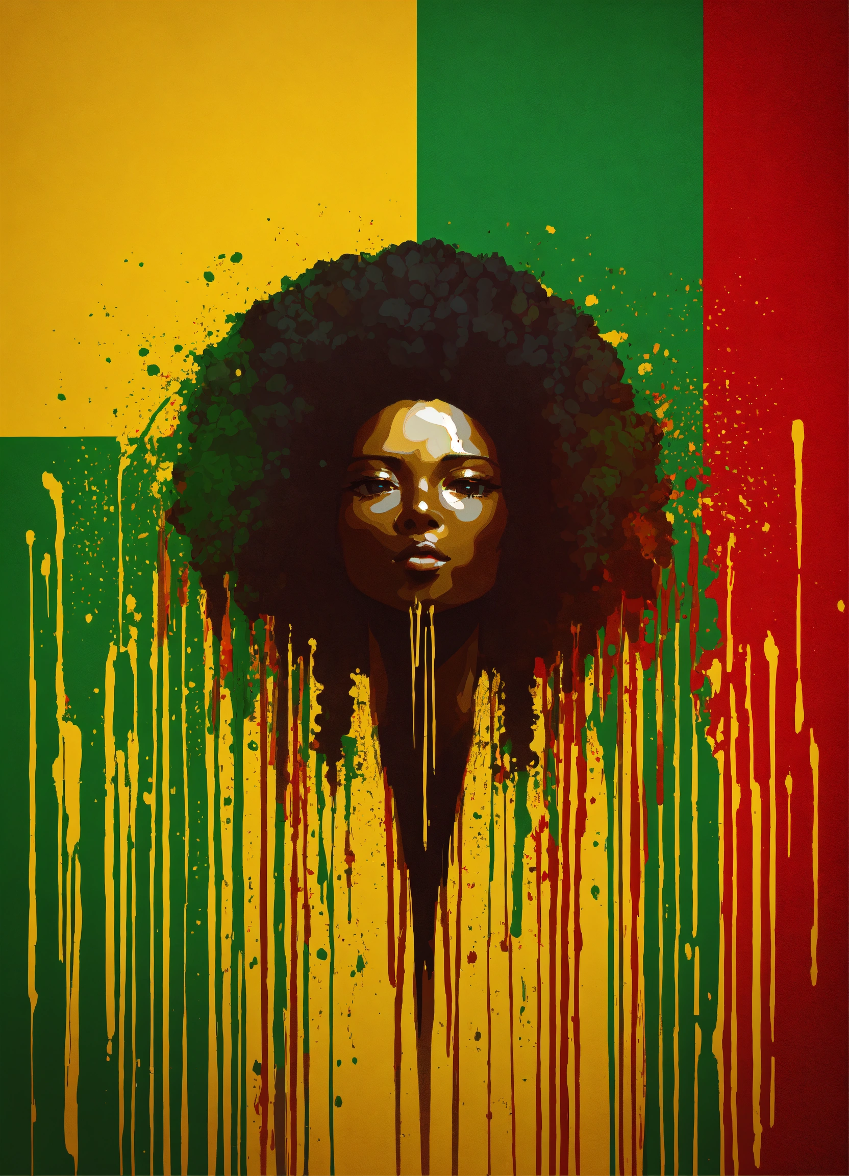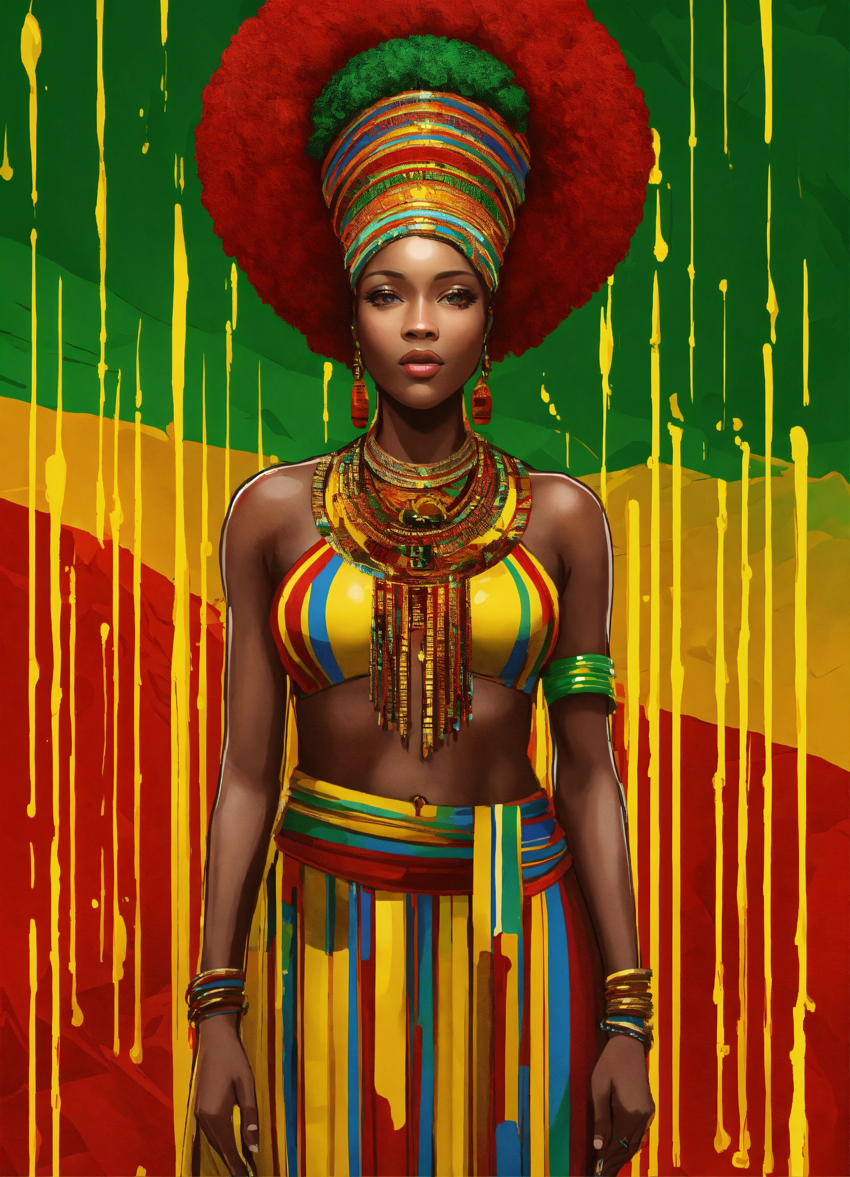 Leonardo da vinci style background african flag colors dripping with african queen, hyper detailed, ultra-sharp, 8 k, illustration, highly detailed, smooth and clean vector, no jagged lines, vector art, smooth