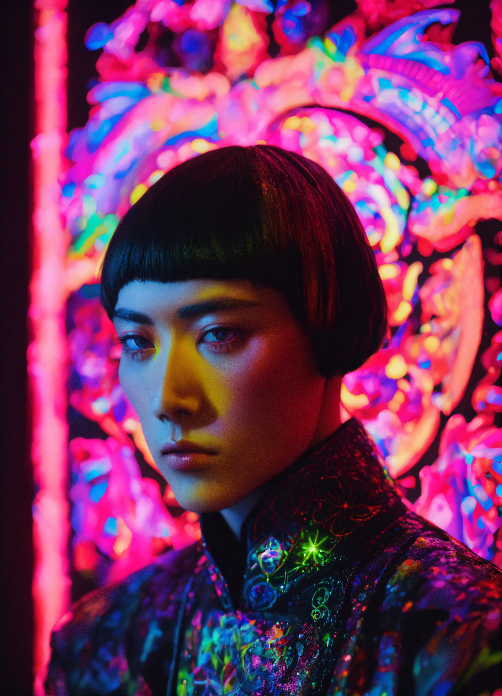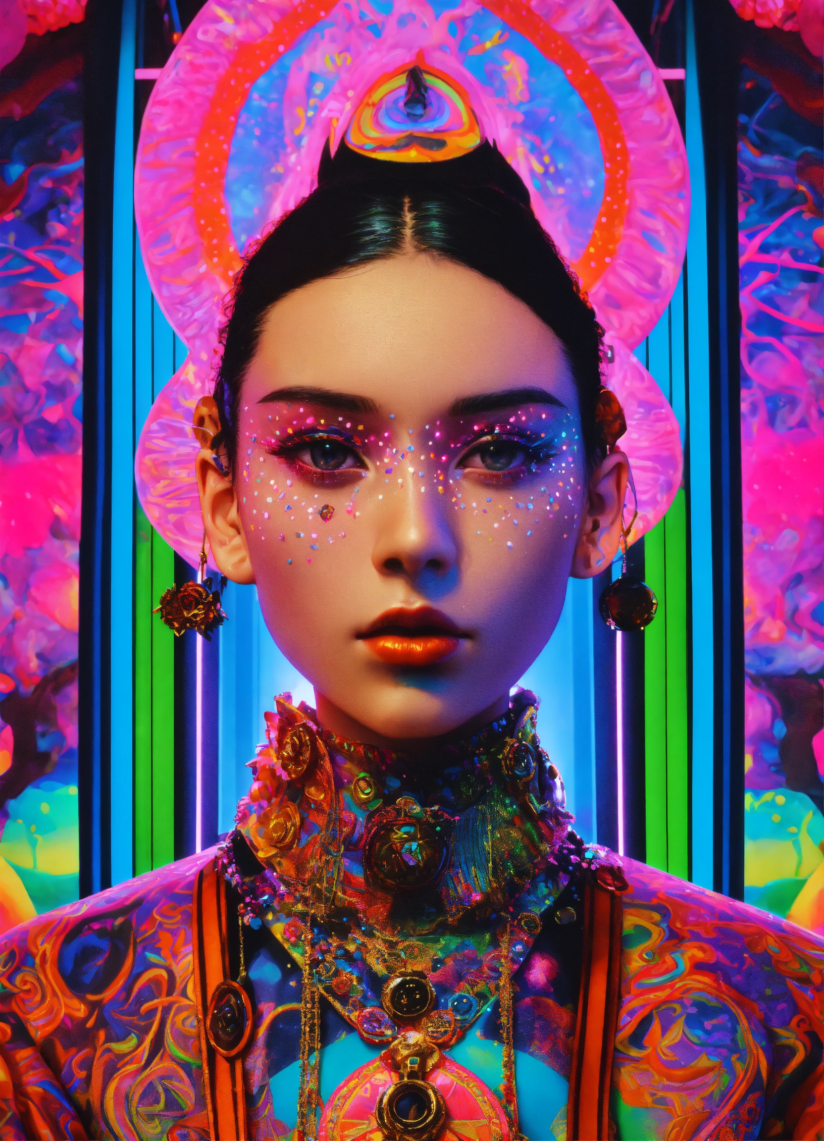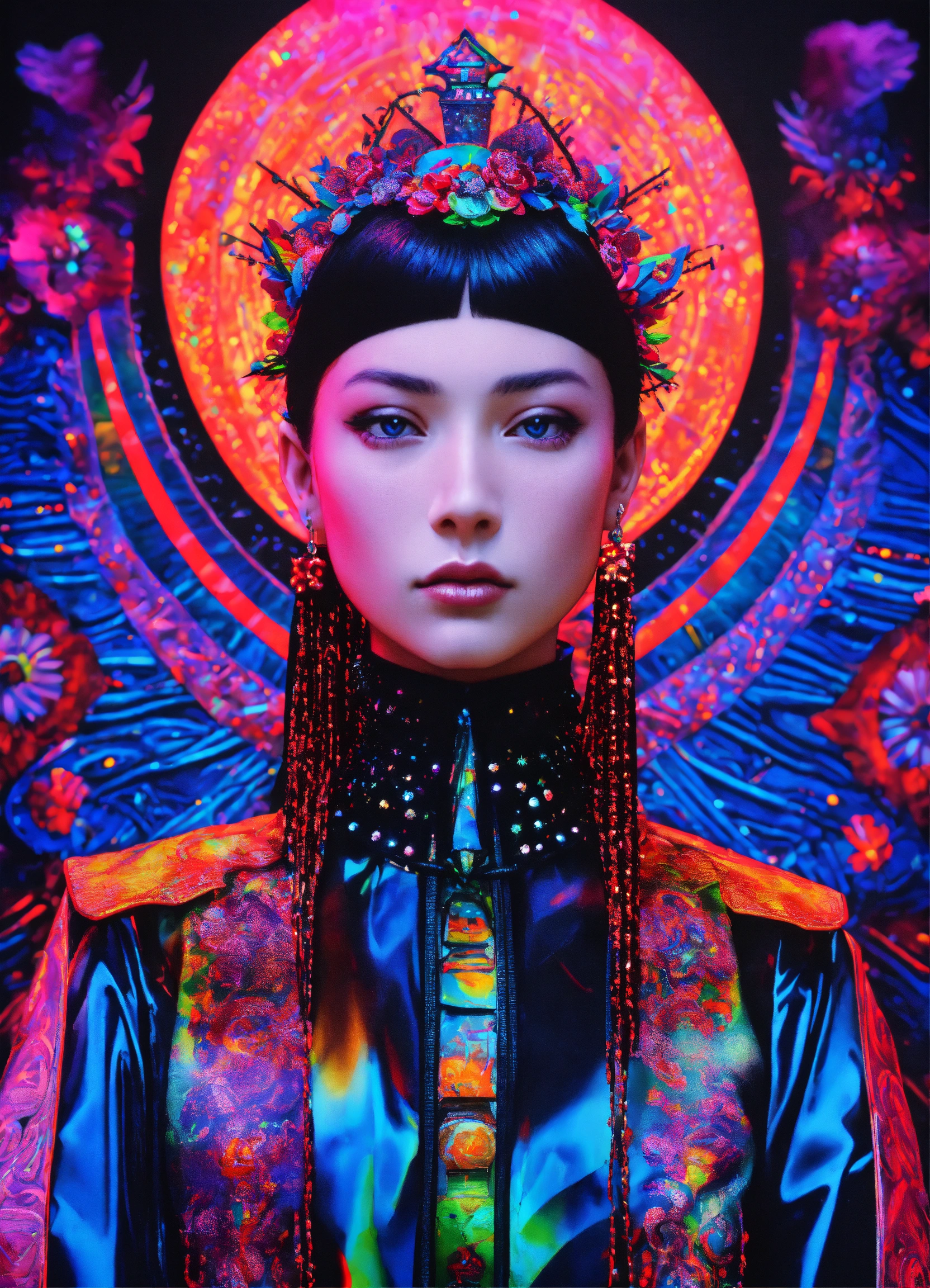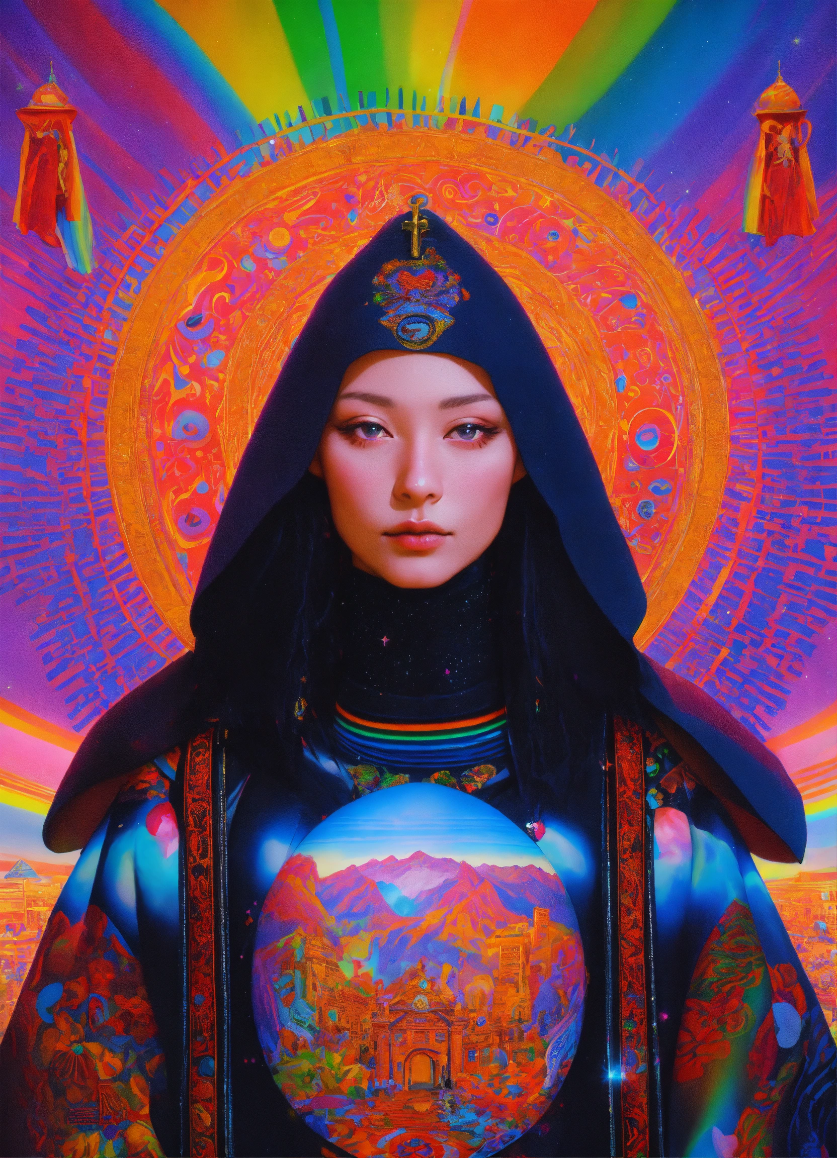 Photorealistic 3d portrait of gorgeous goth emo priest samurai family kawaii punk rock anime folk haute couture costume, of cosmic alex grey painting in a dmt black light glitter neon black rainbow glitter holographic paris fashion night 70mm film, art by salvador dali and holy mountain the movie.
