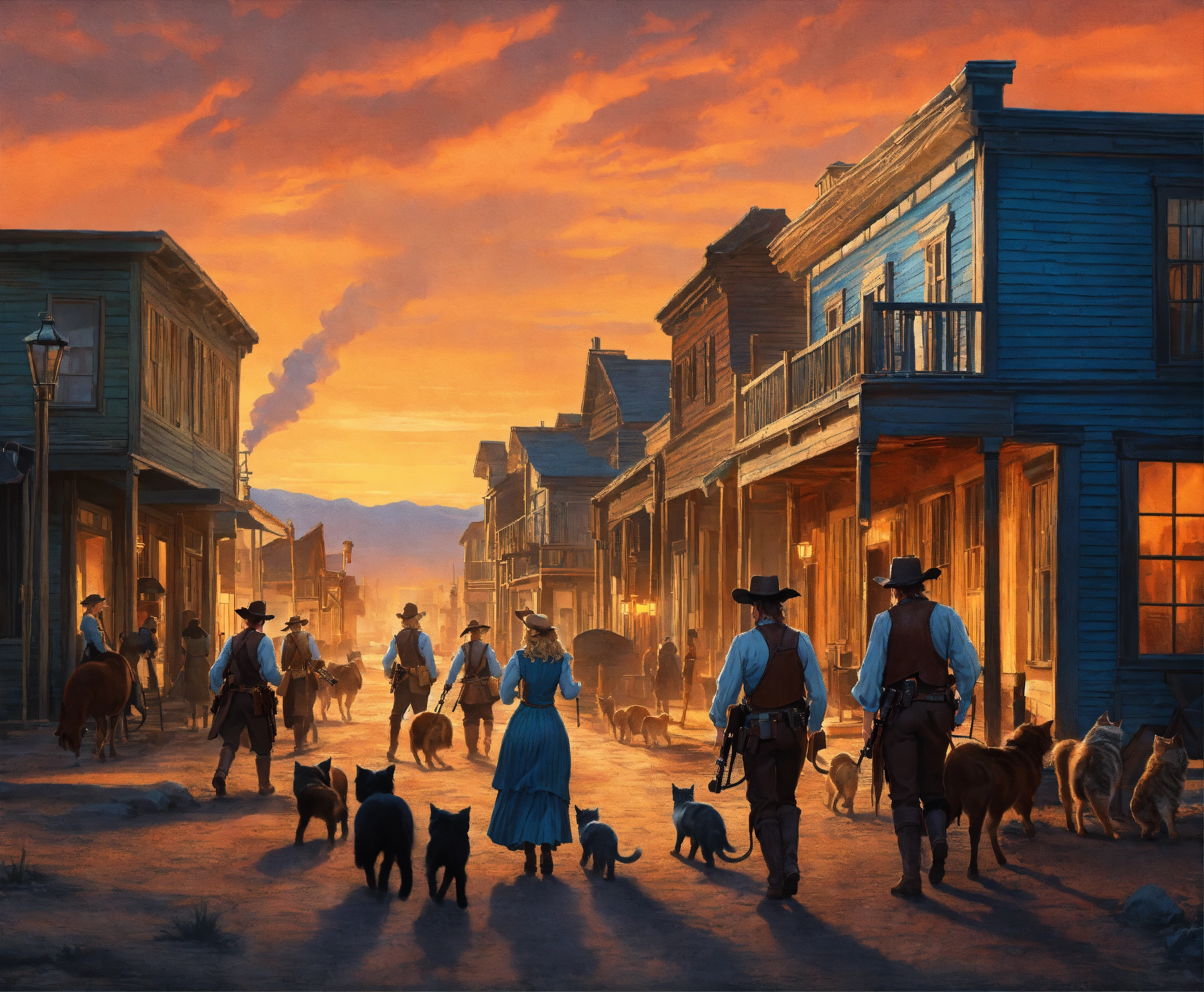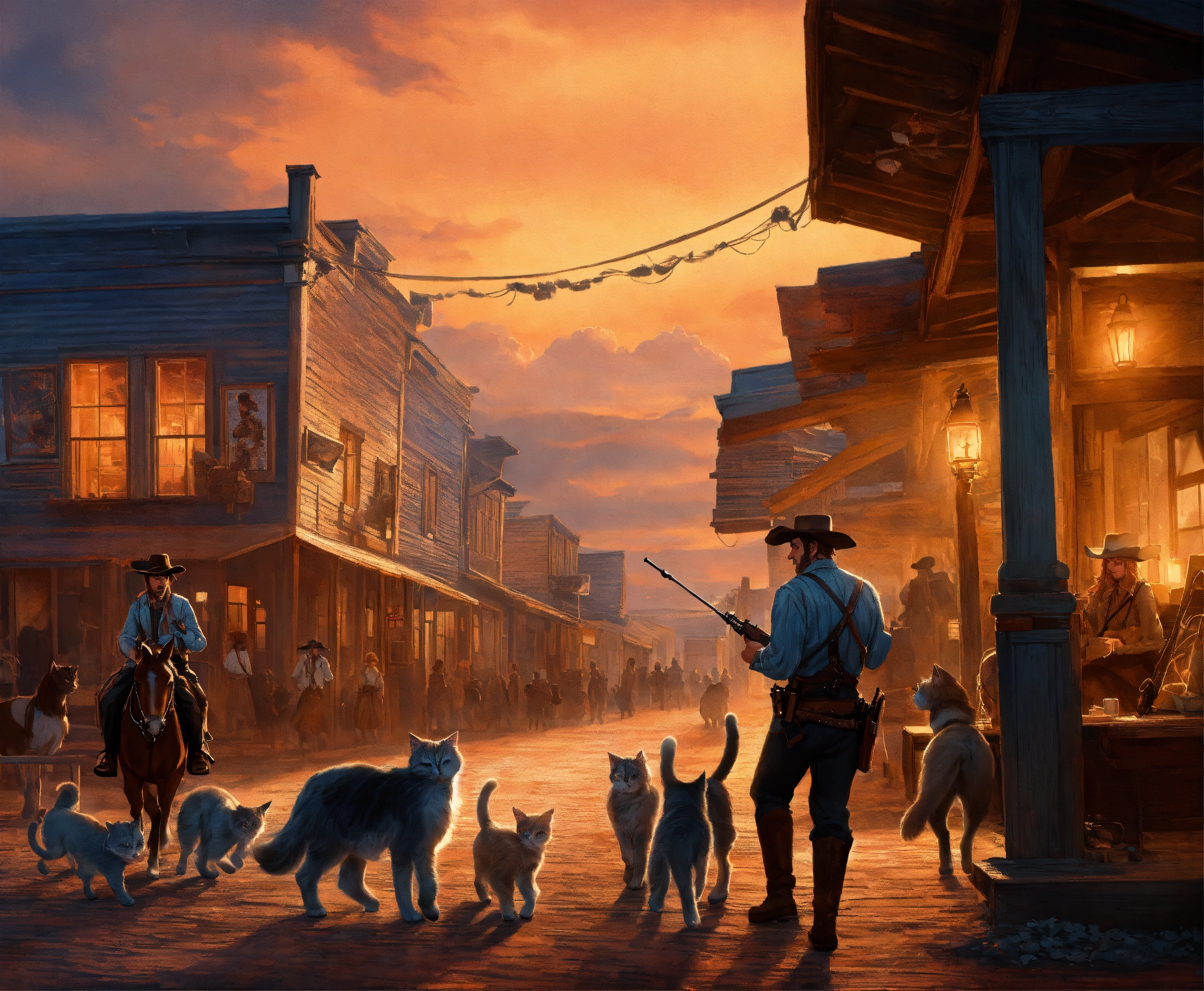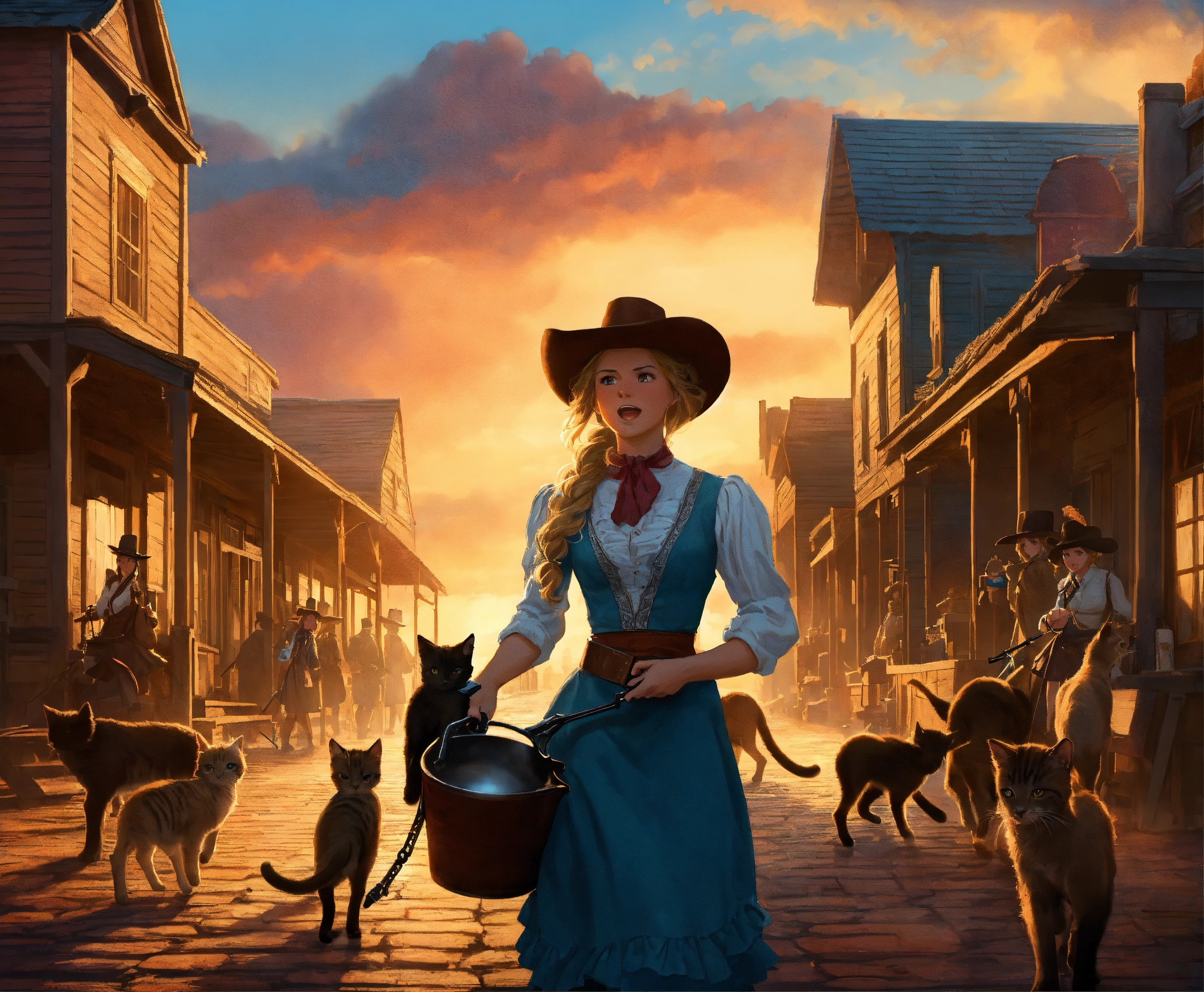 At sunset, a herd of tiny stray kittens scamper around in the middle of a wide main street that's lined on either side by 1800's styled, single-story wooden buildings while a pretty pioneer woman with long blonde hair wearing a light blue dress holds the handle of a cast iron skillet while she glares angrily at a group of laughing gunslingers on the good, the bad, the ugly movie poster, no text, sharp details, colorful old west showdown scene, dark clouds in sky, sharp focus, comical, elegant, intricately detailed, epic, pixar, digital art, digital illustration, style of jordan grimmer and greg rutkowski, style of ben crane