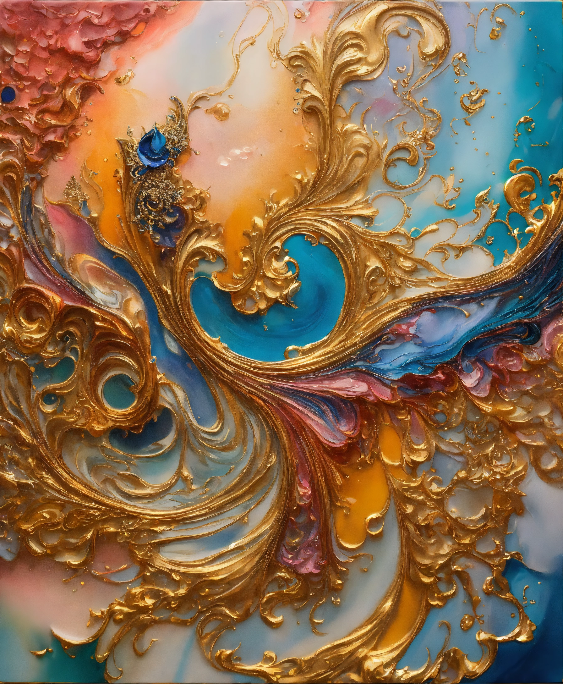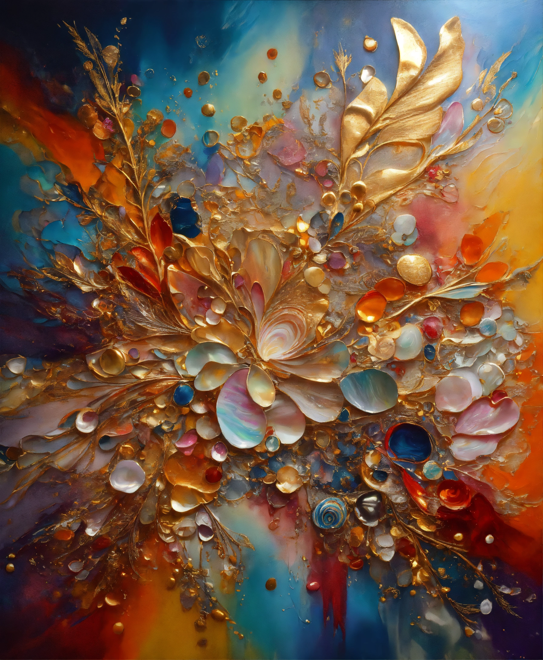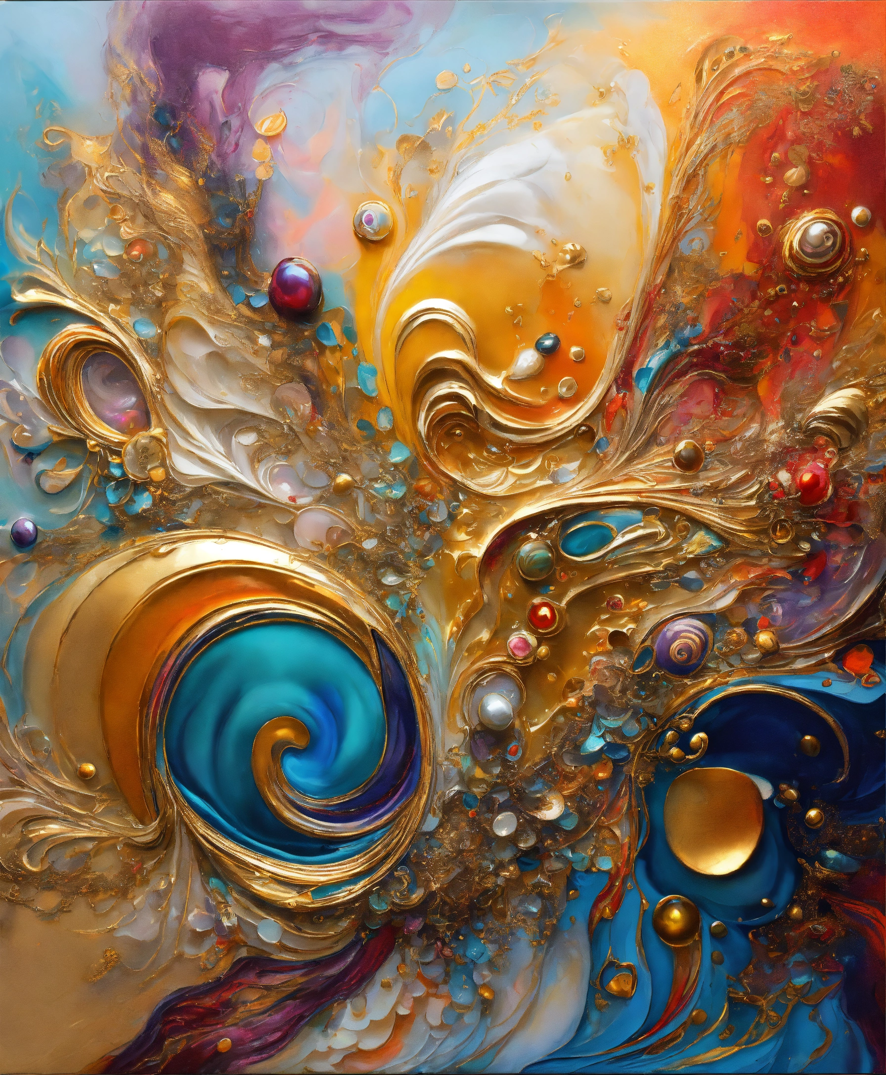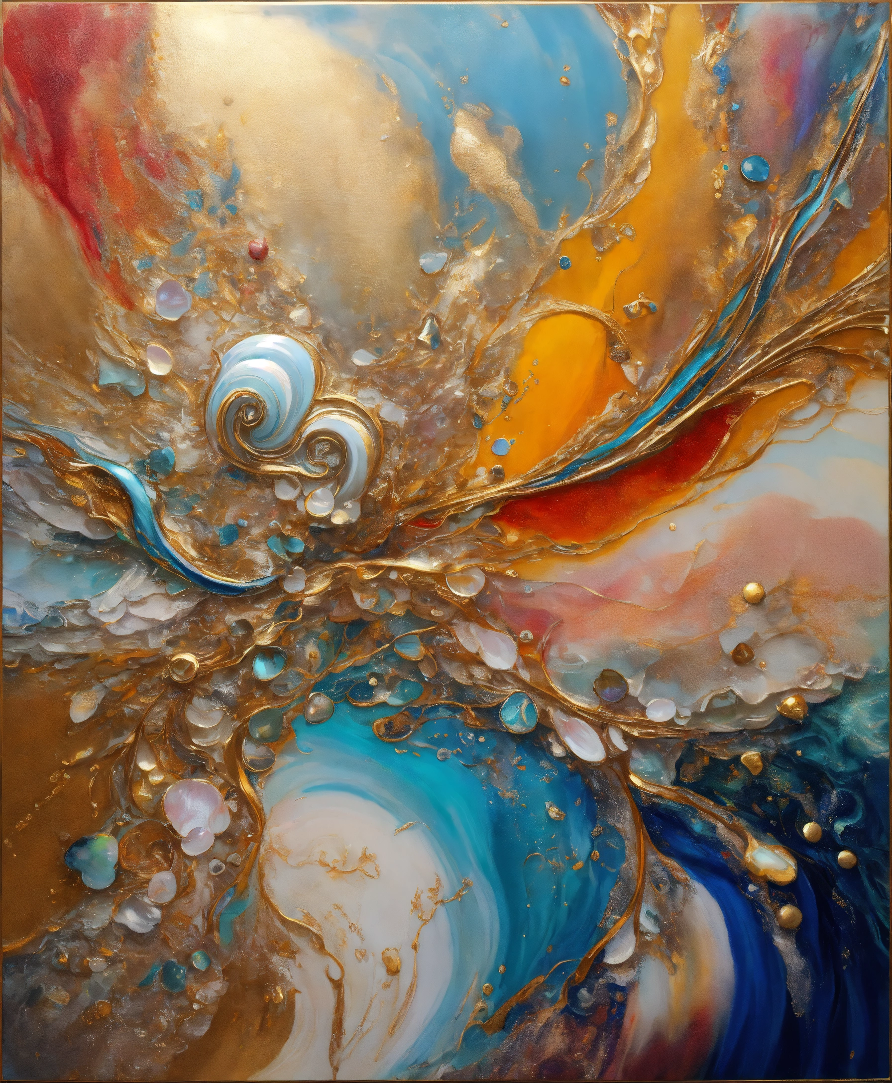 Colorful abstract painting oil and water complex complicated bright vivid colors beautiful opulent wealthy intricate all hues sublime delicate hyperdetailed masterpiece metallic sheen mother of pearl elaborate awesome 24k gold and silver trim 8k