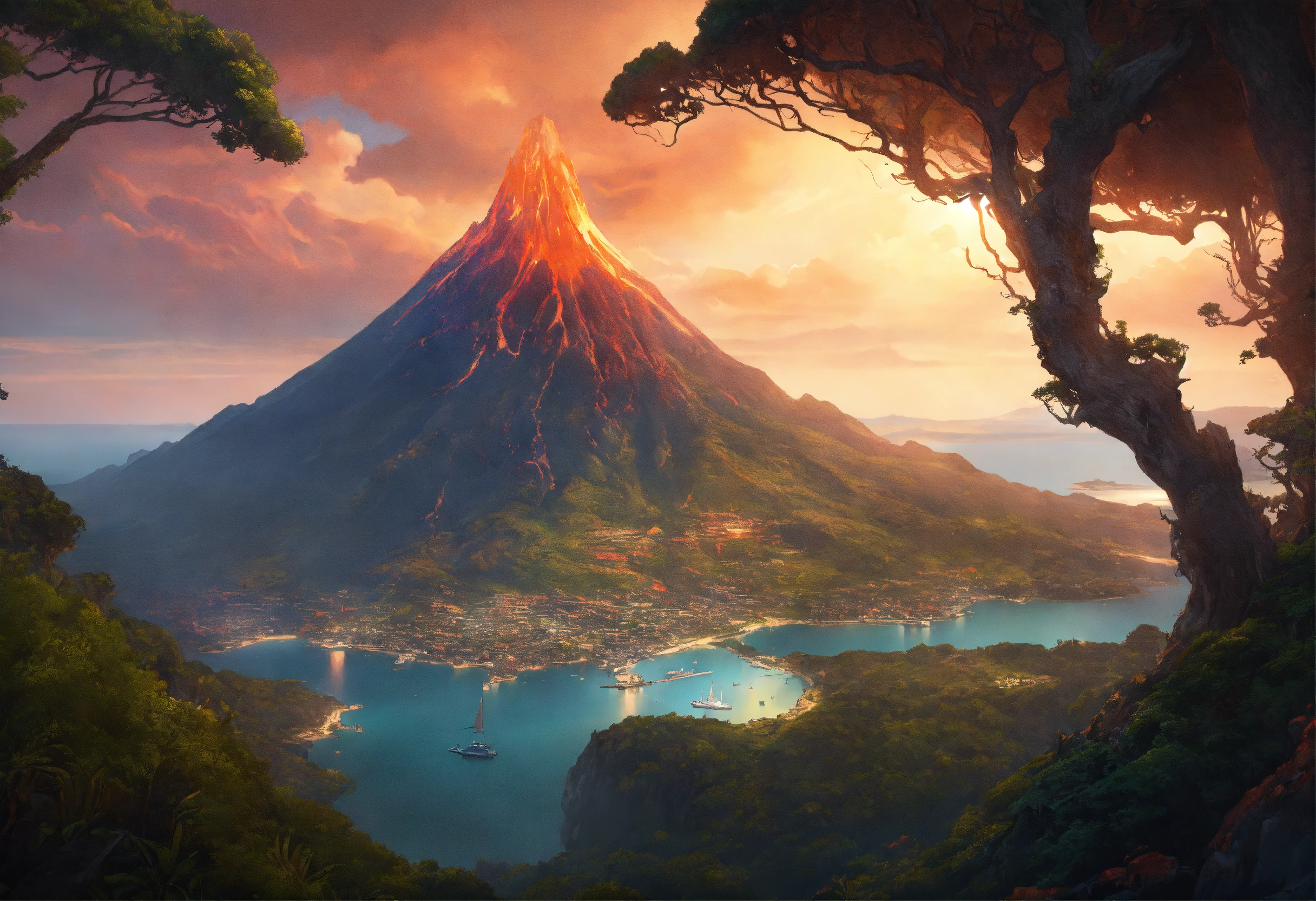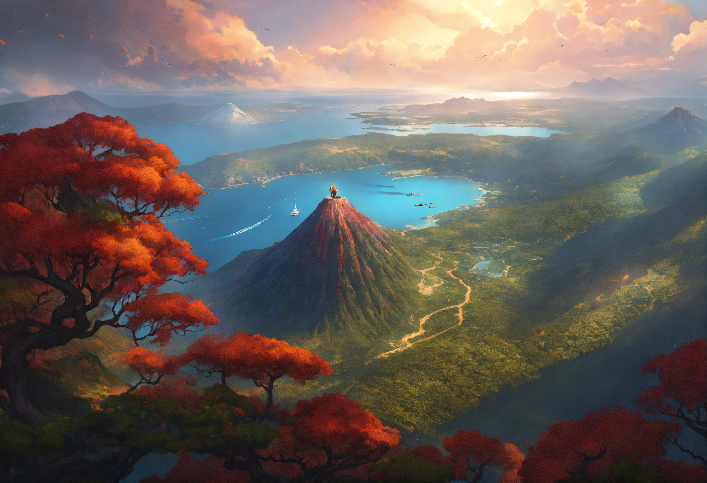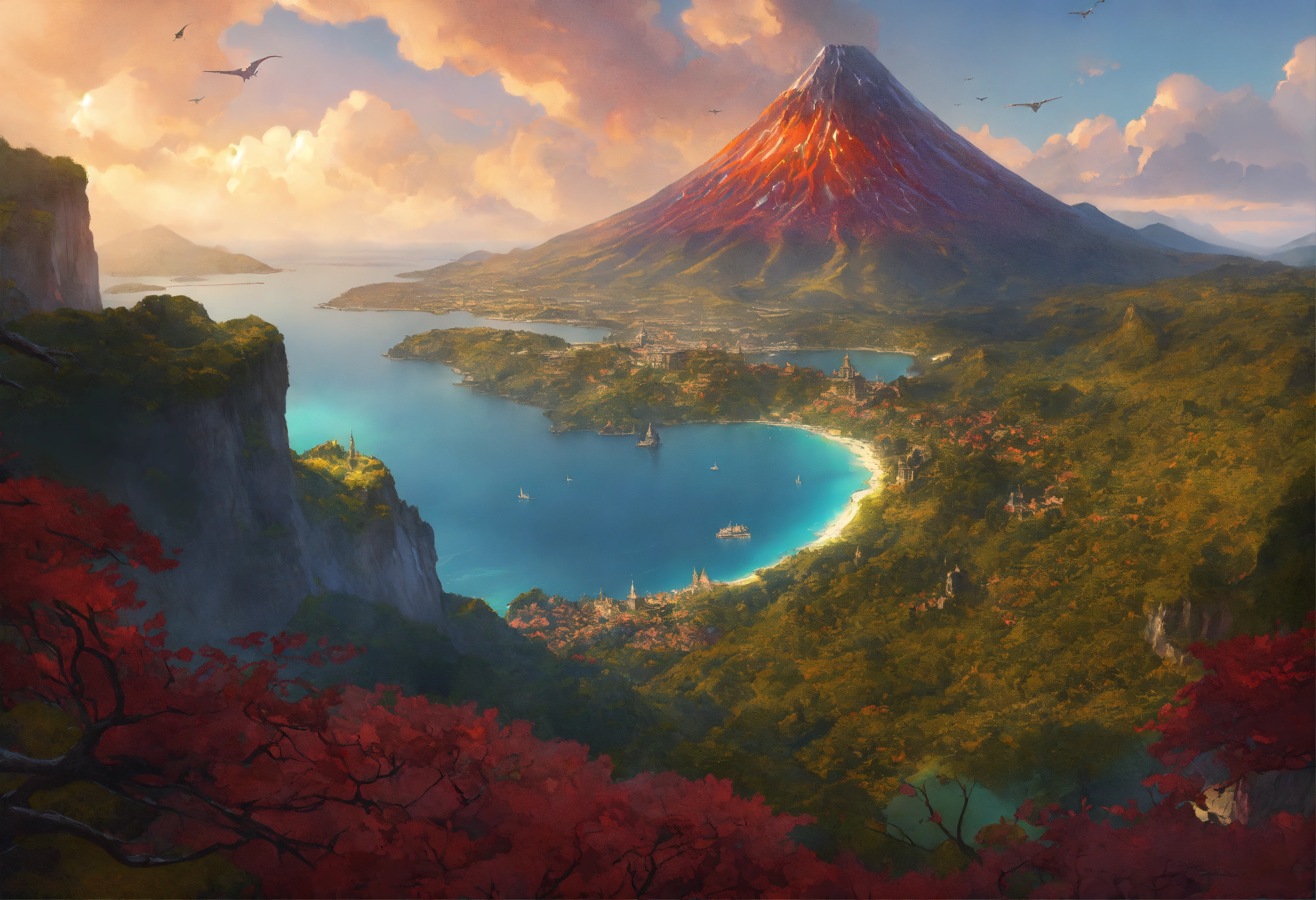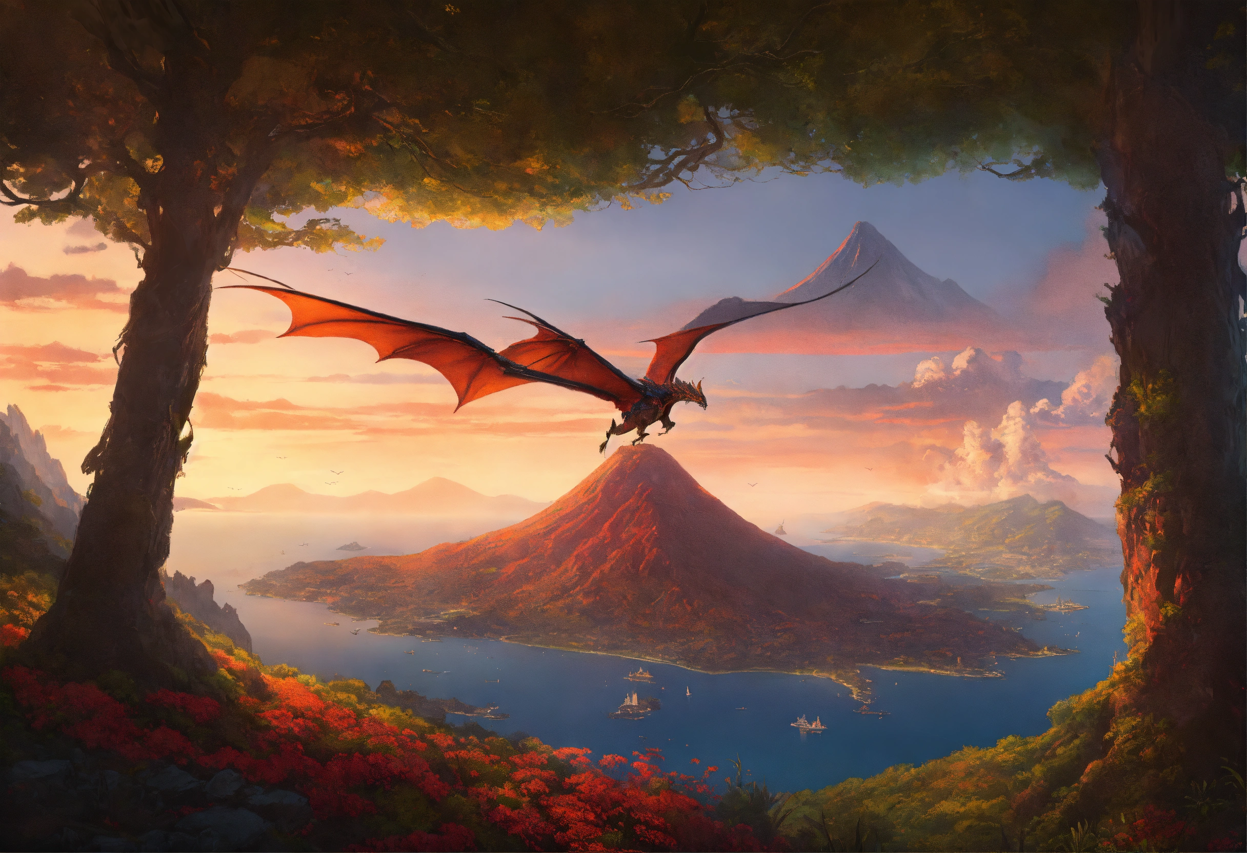 Distant wyvern flying over dormant vulcano and forested island and sea, highly detailed, digital painting, atmospheric lighting, artstation, concept art, smooth, sharp focus, illustration, art by artgerm and greg rutkowski and alphonse mucha, erte, 8 k