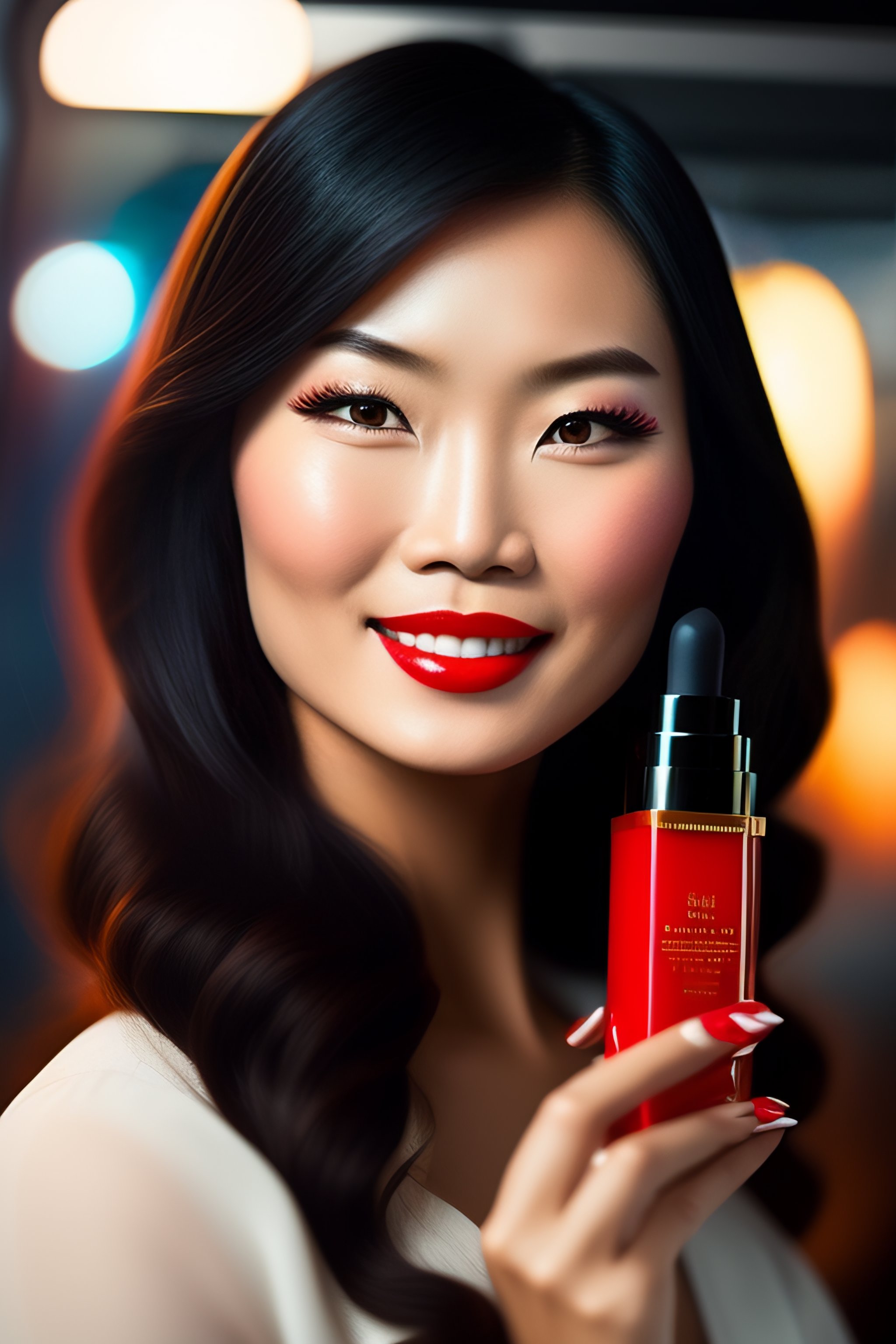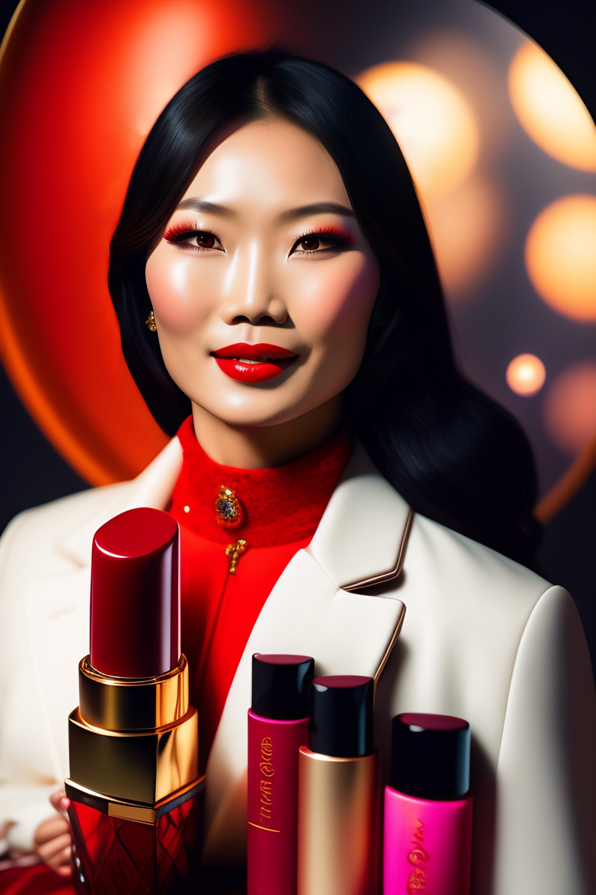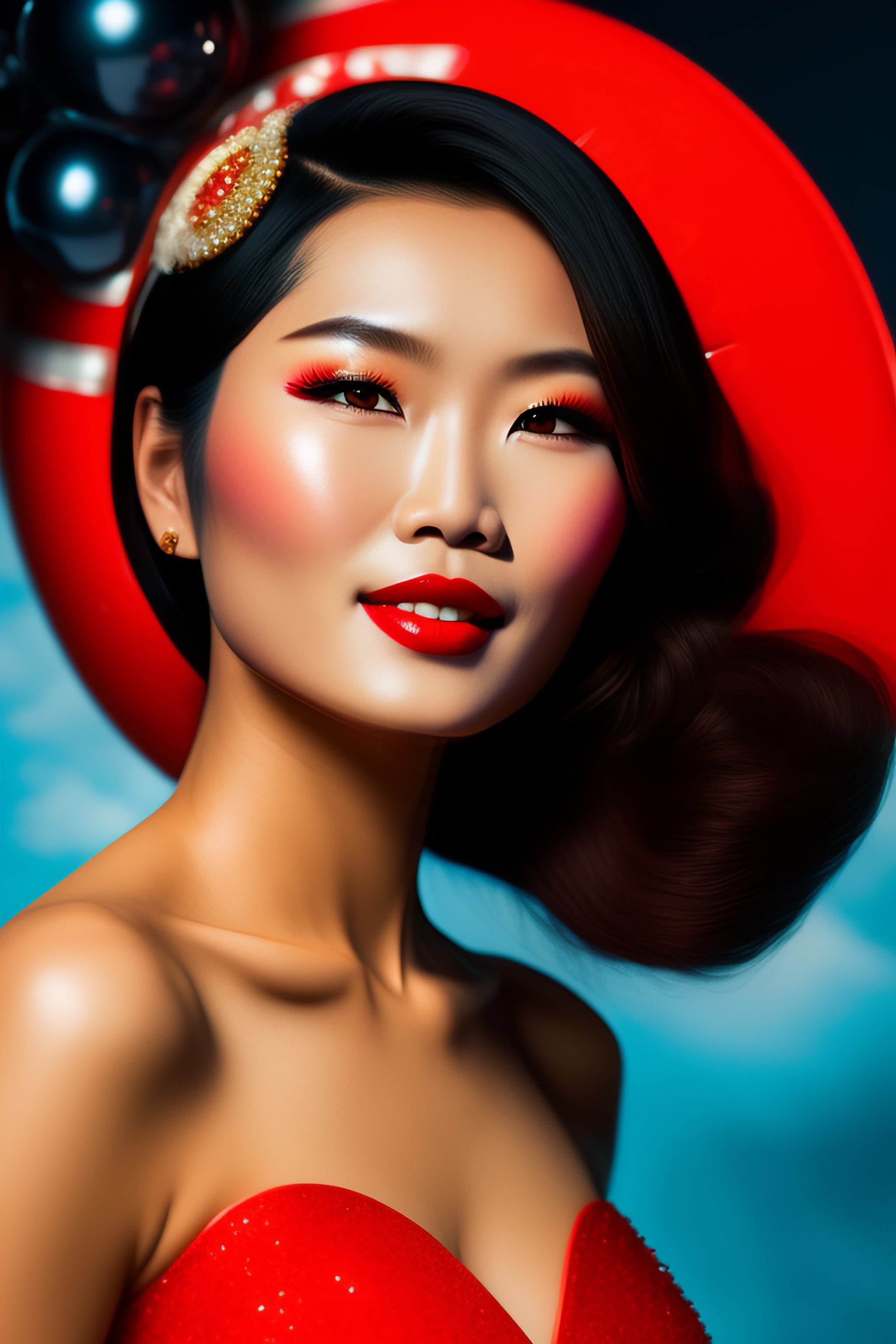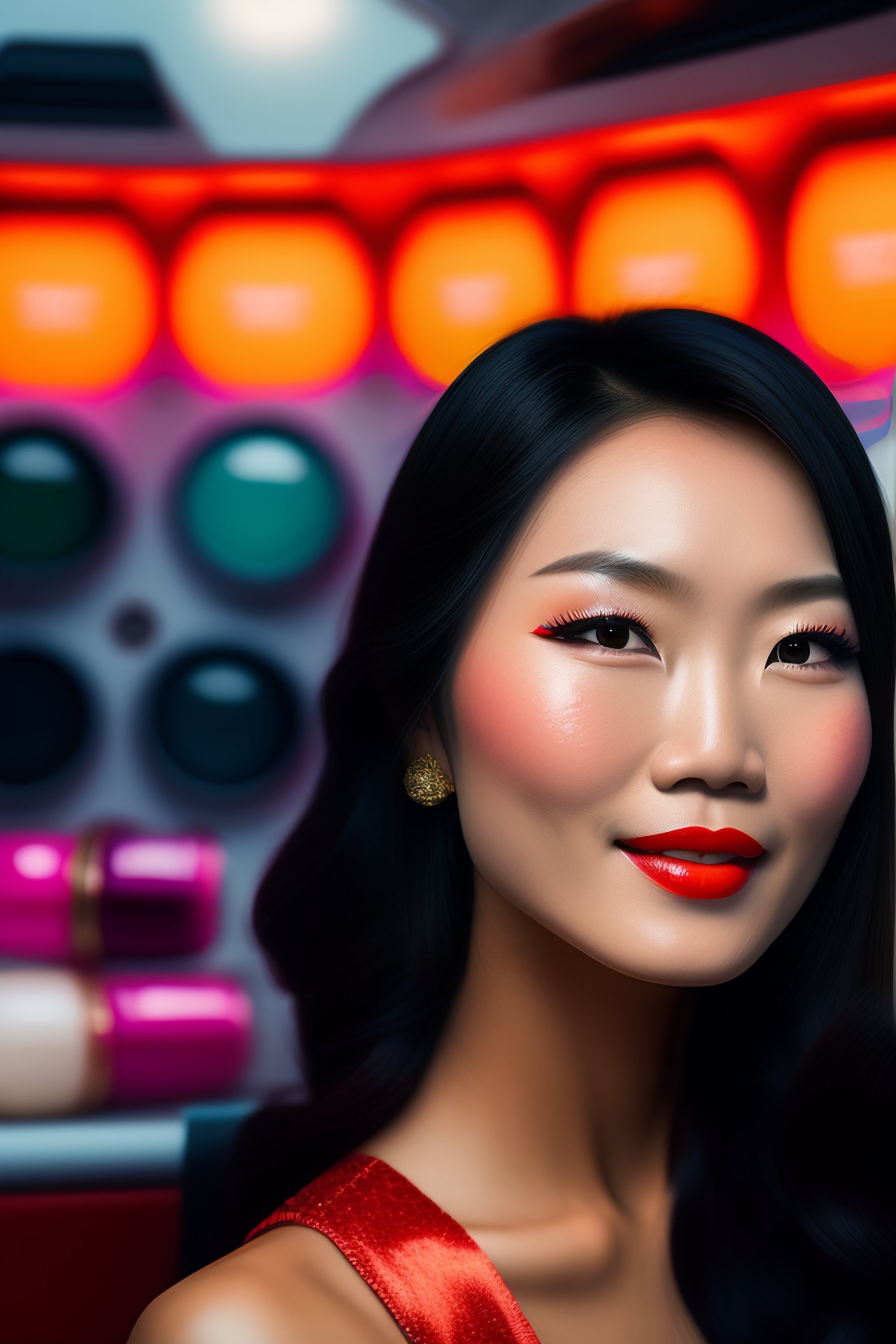 An asian beautiful woman in a space shuttle wearing red lipstick