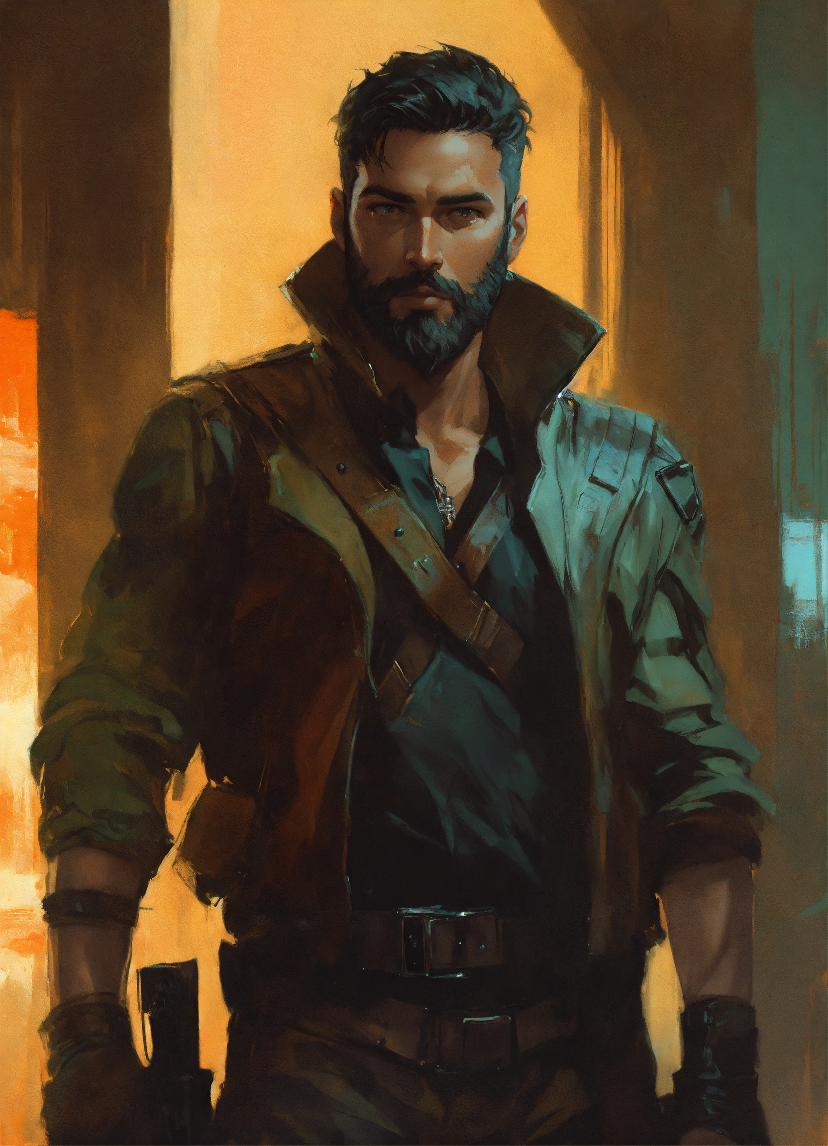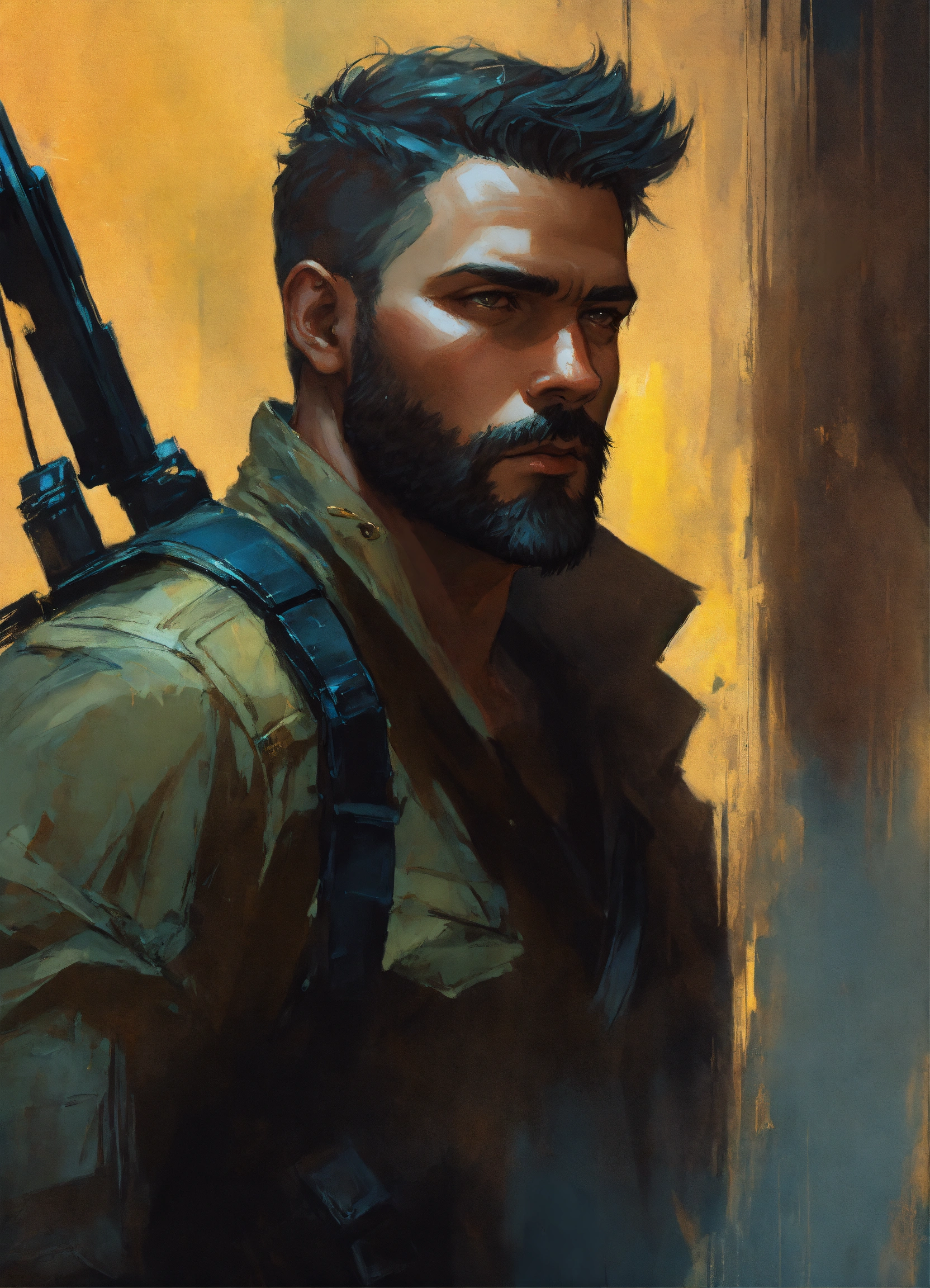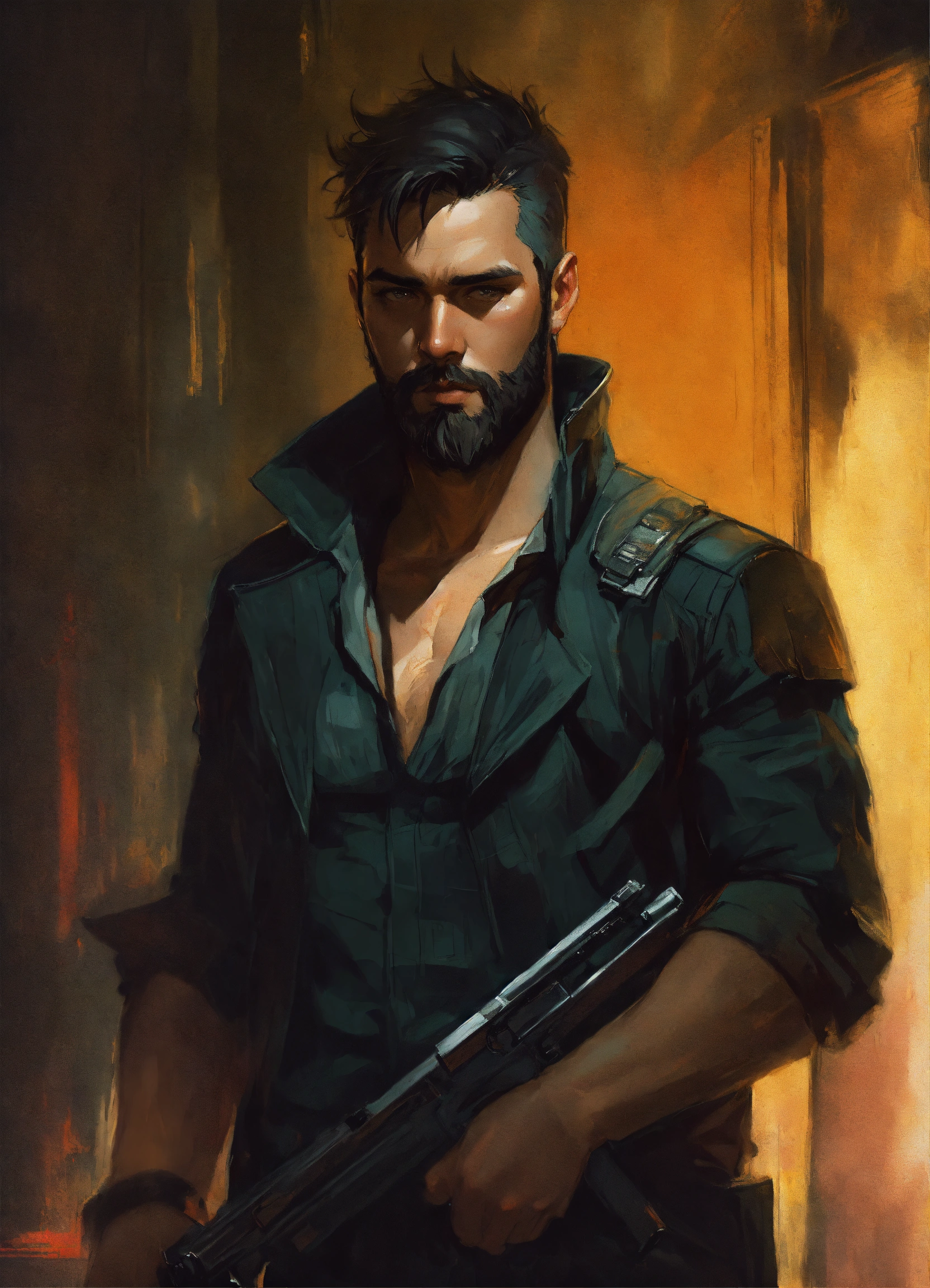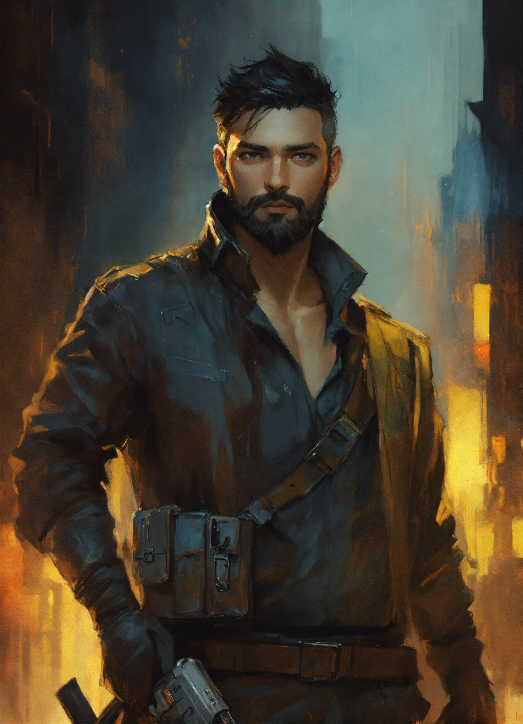 Vmpire bounty hunter with short dark hair and beard, dark background, by artgerm, guy denning, jakub rozalski, magali villeneuve and charlie bowater