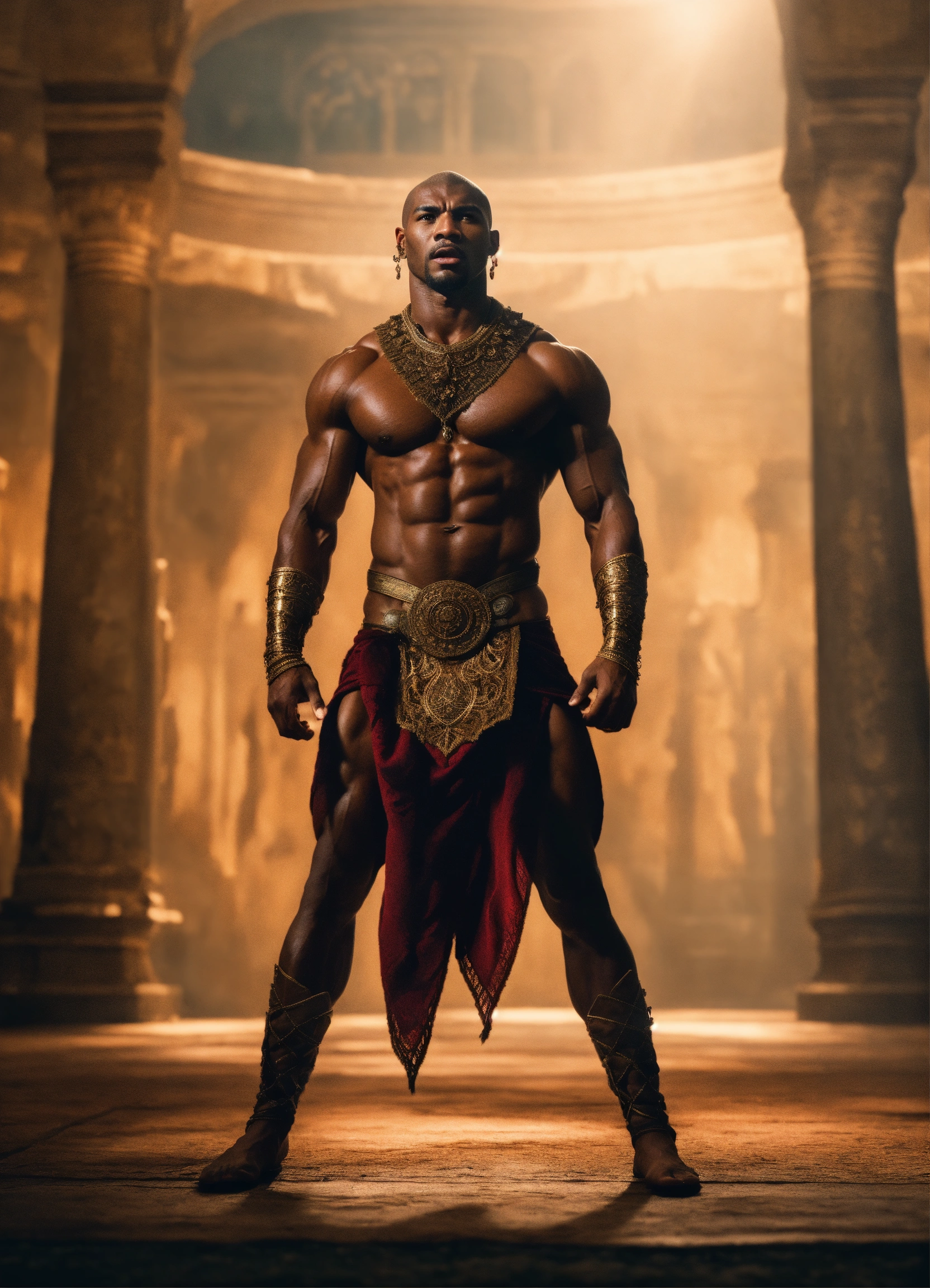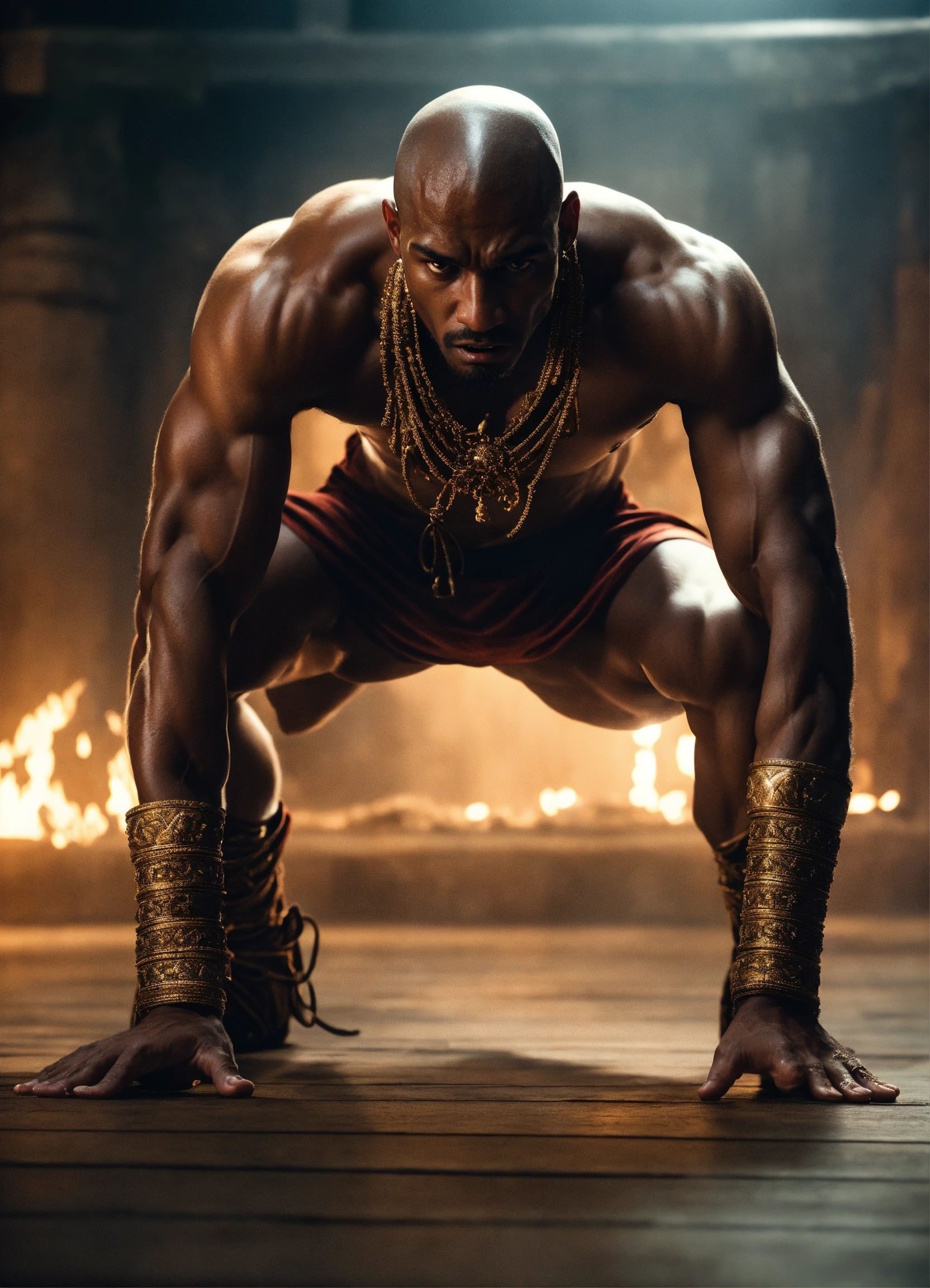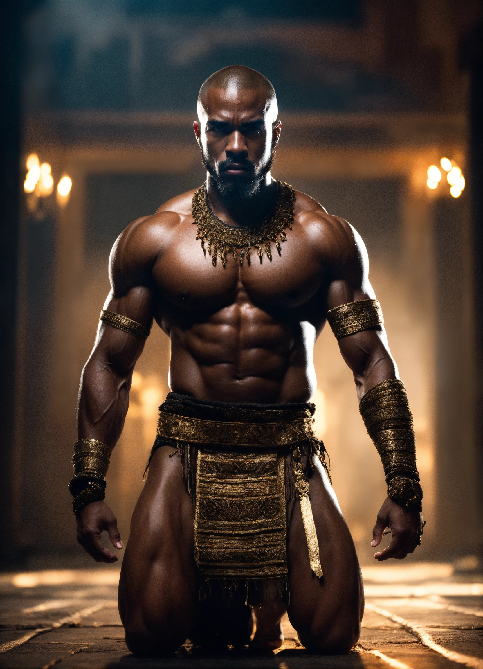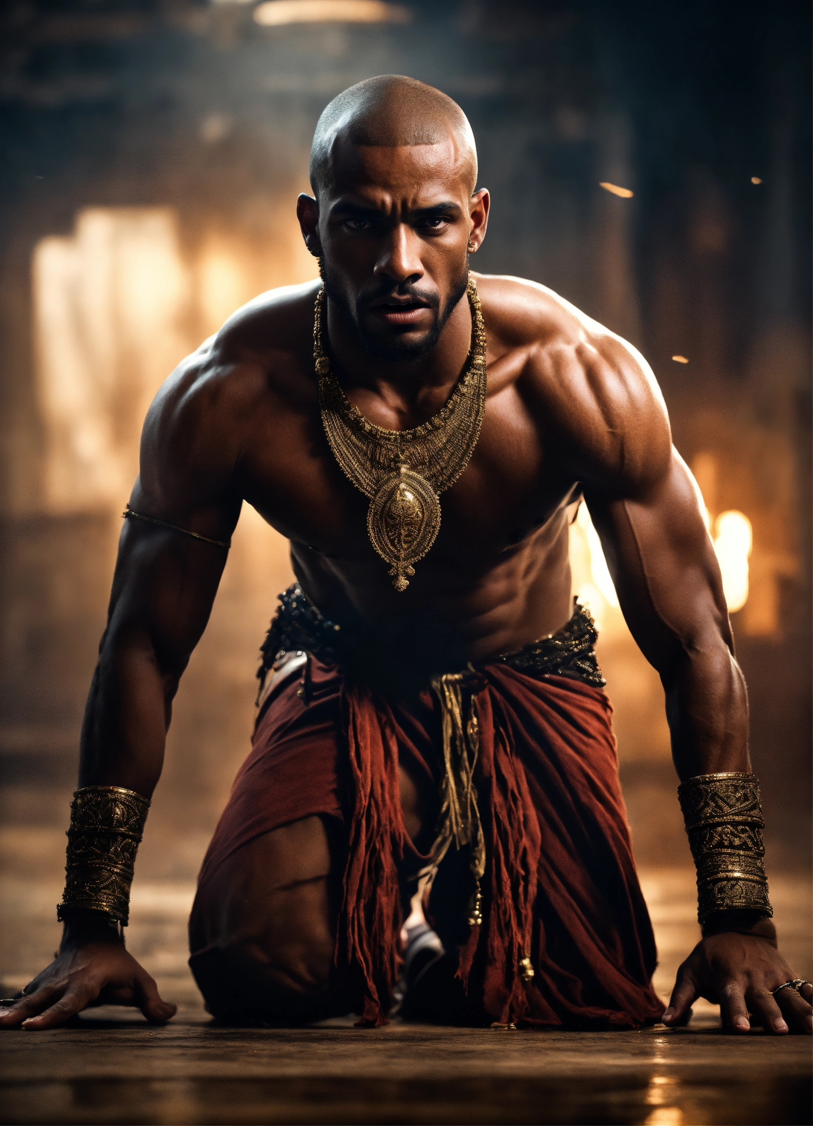 An epic fantasy scene featuring a muscular ancient nubian male with frighten look, fell on his knees on the floor, arms outstretched in fear, highly-detailed, full motion, high expression, shaved head, photo realistic, beautiful, moody lighting, best quality, realistic, close view from behind, intricate details, depth of field, rear close view, raw photo, 8k uhd, film grain