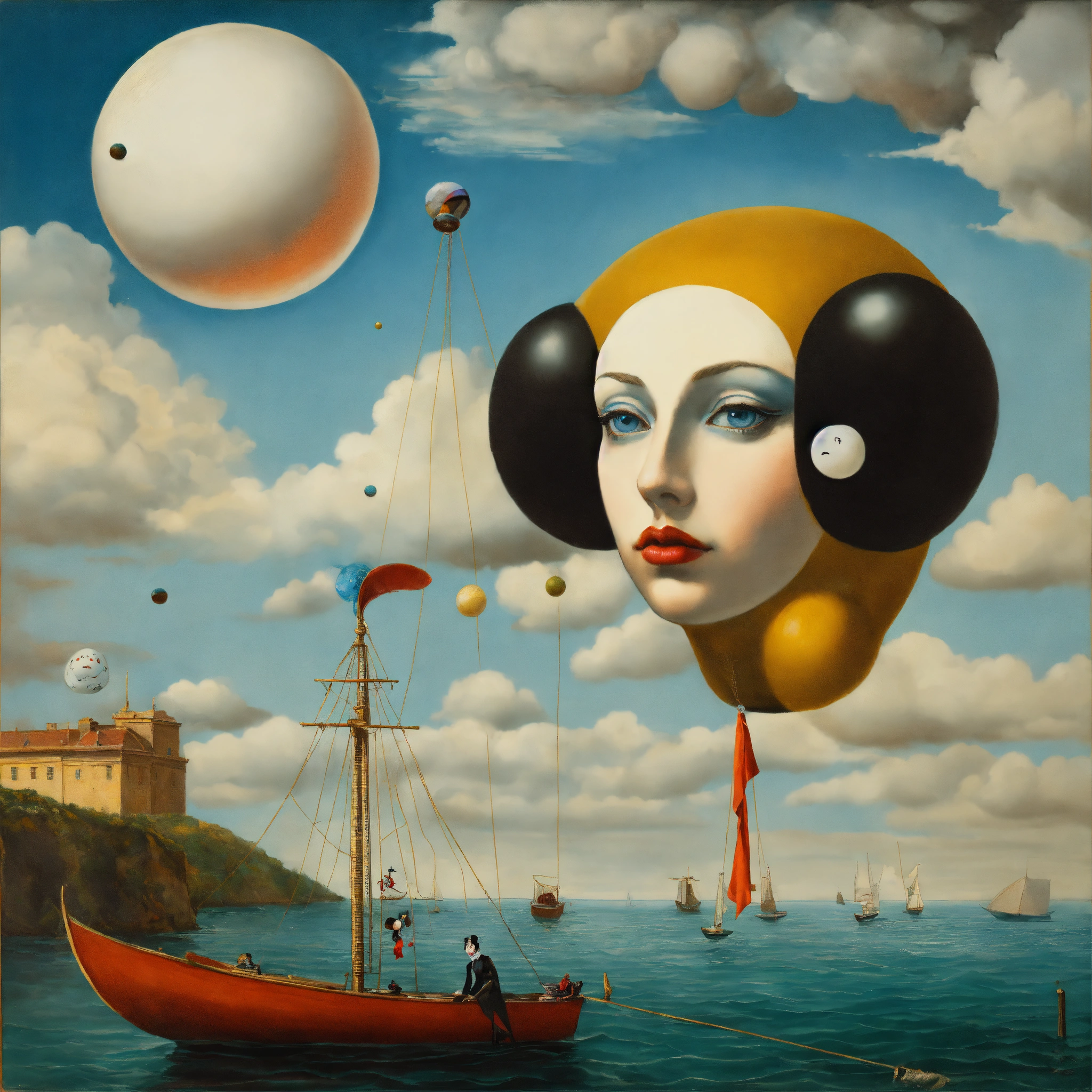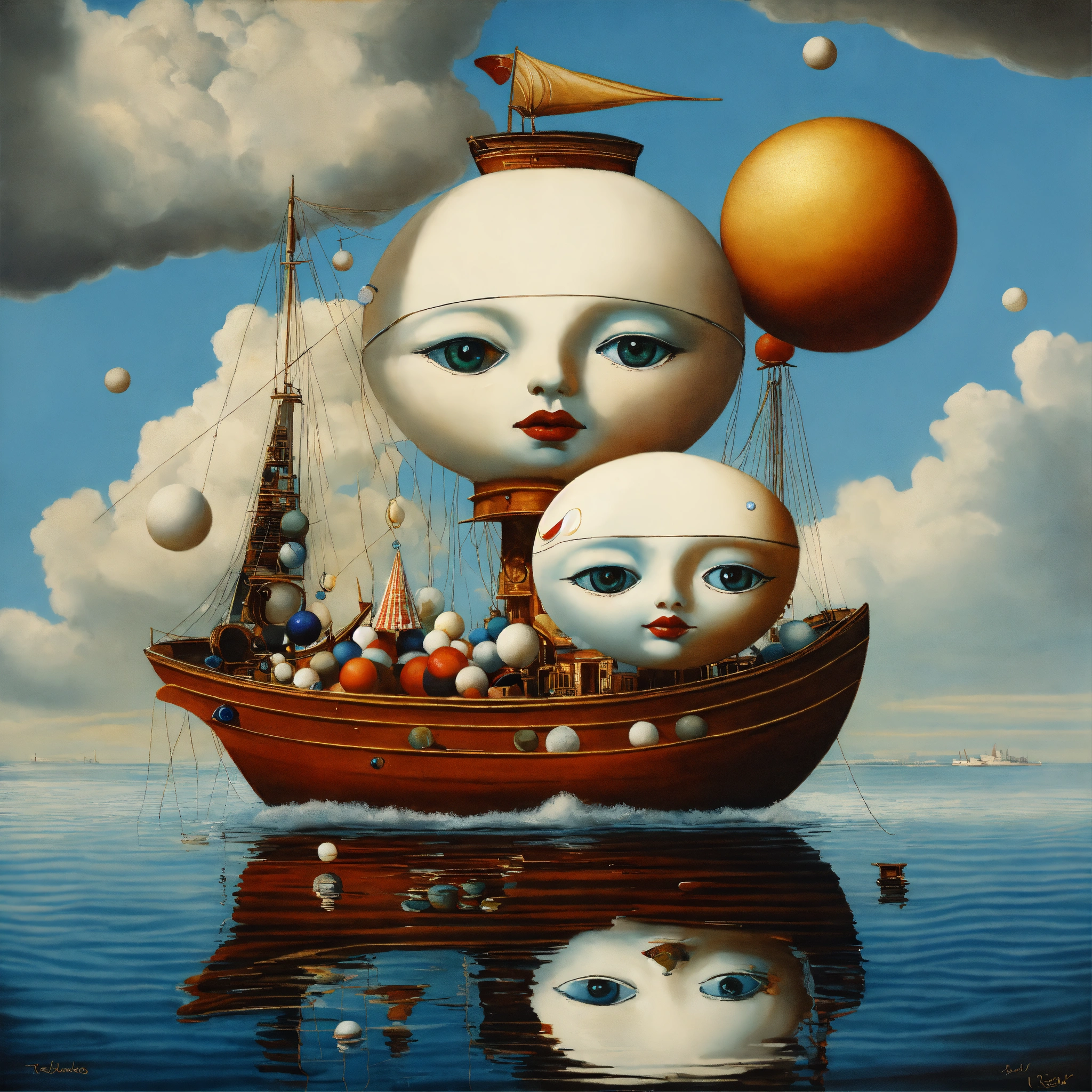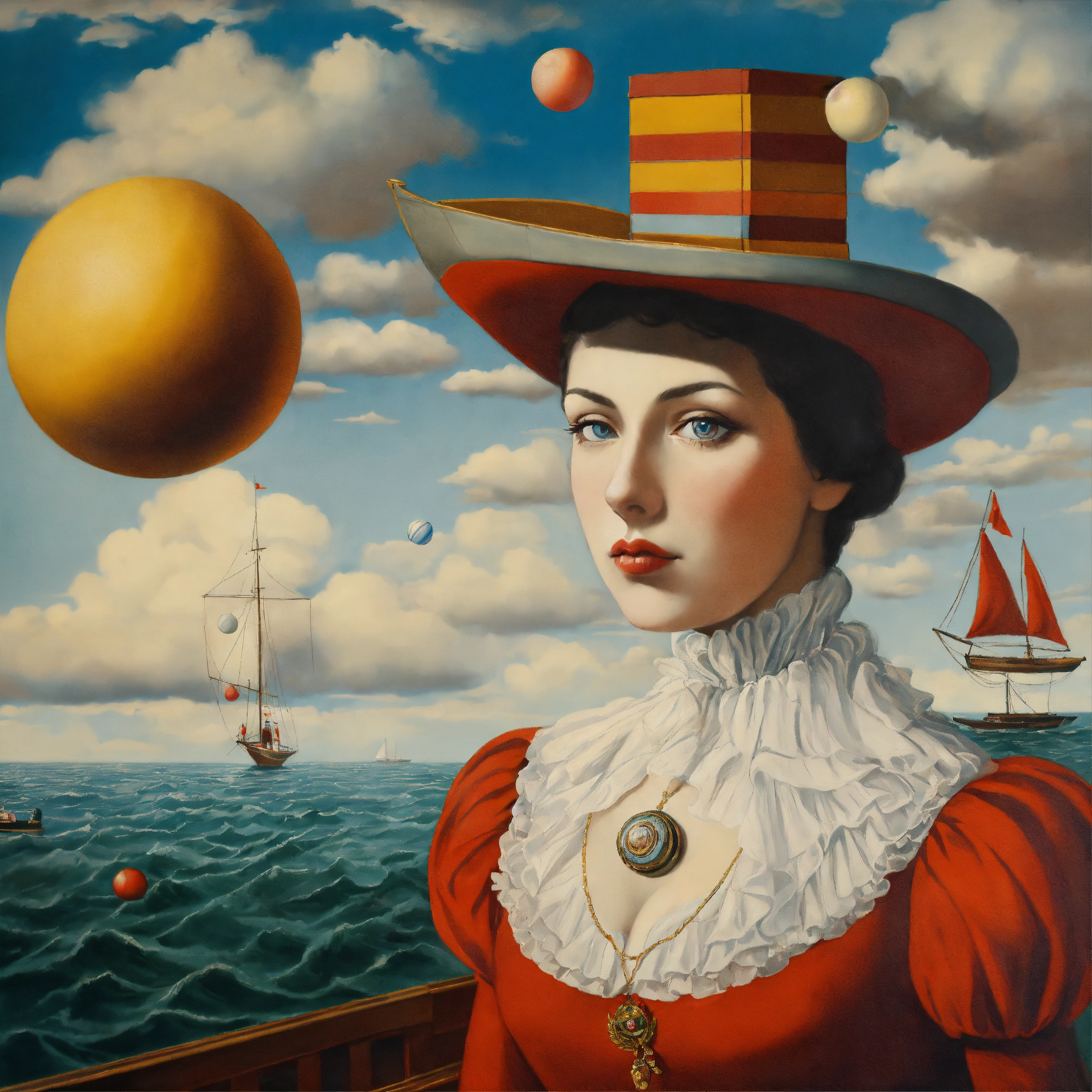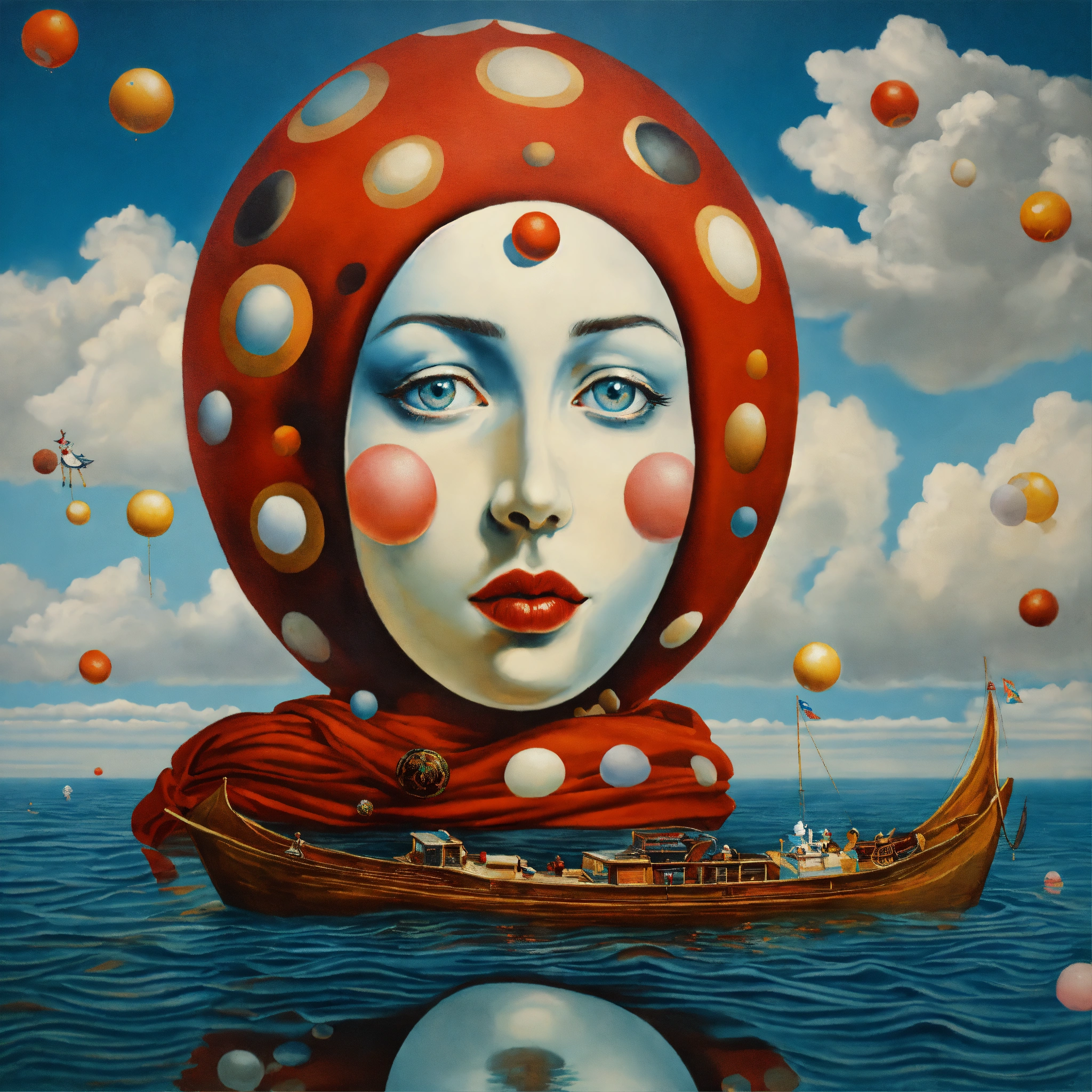 A close up portrait of elegant female humpty with pale white face with eyes looking straight at you. also a harlequin lady with juggling balls on a boat on choppy sea scape by rené magritte. more surrealism and madness. much more surrealism and crazy designs. with surreal clouds, salvador dali clouds coming out of her head. more surrealism and crazy ideas. like a circus theme.