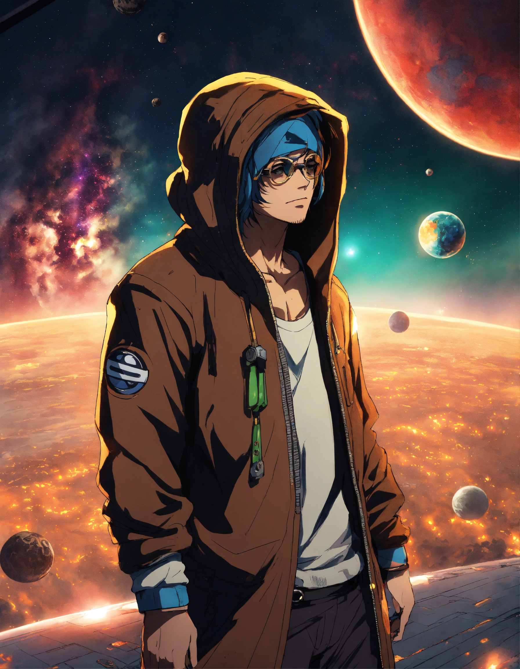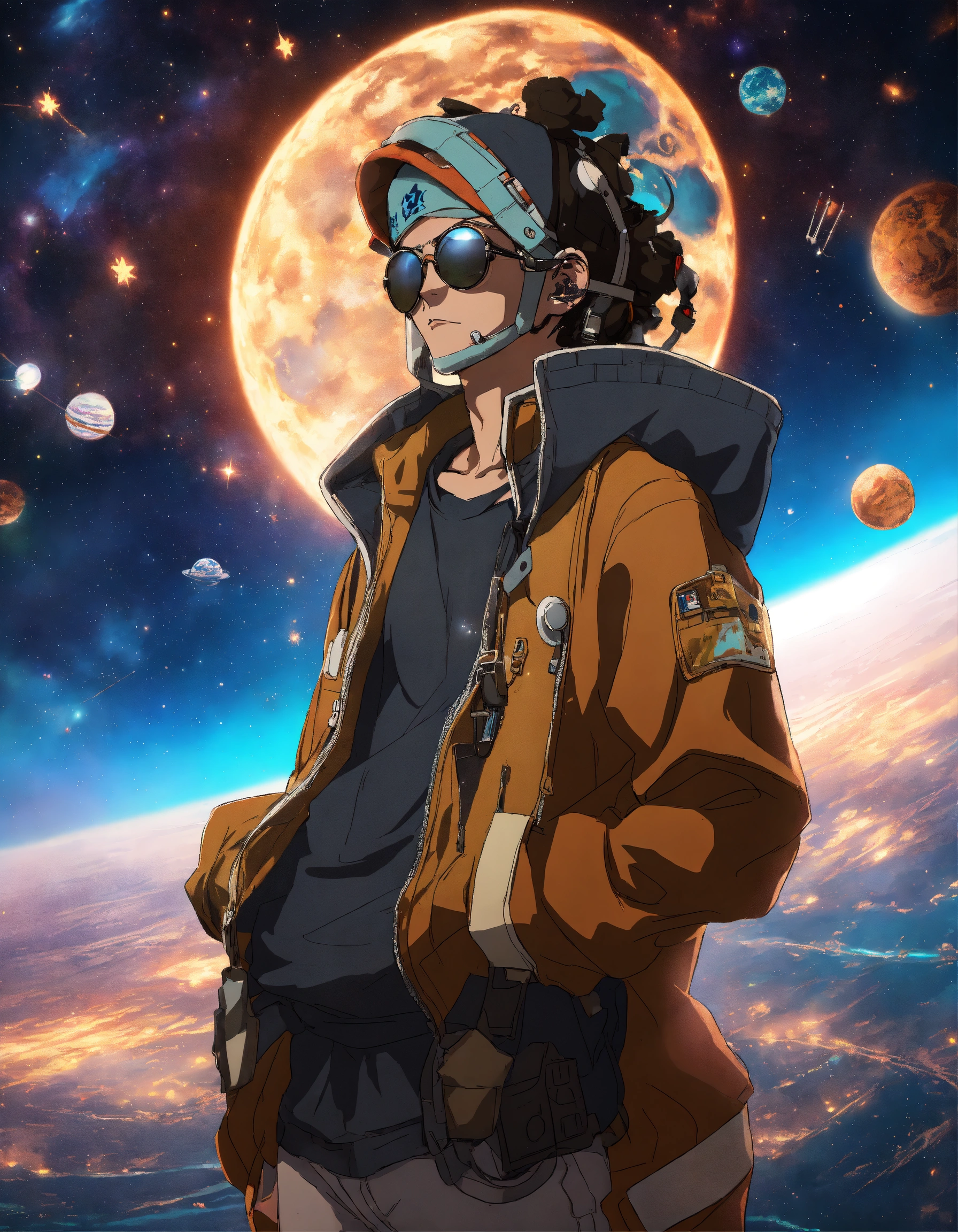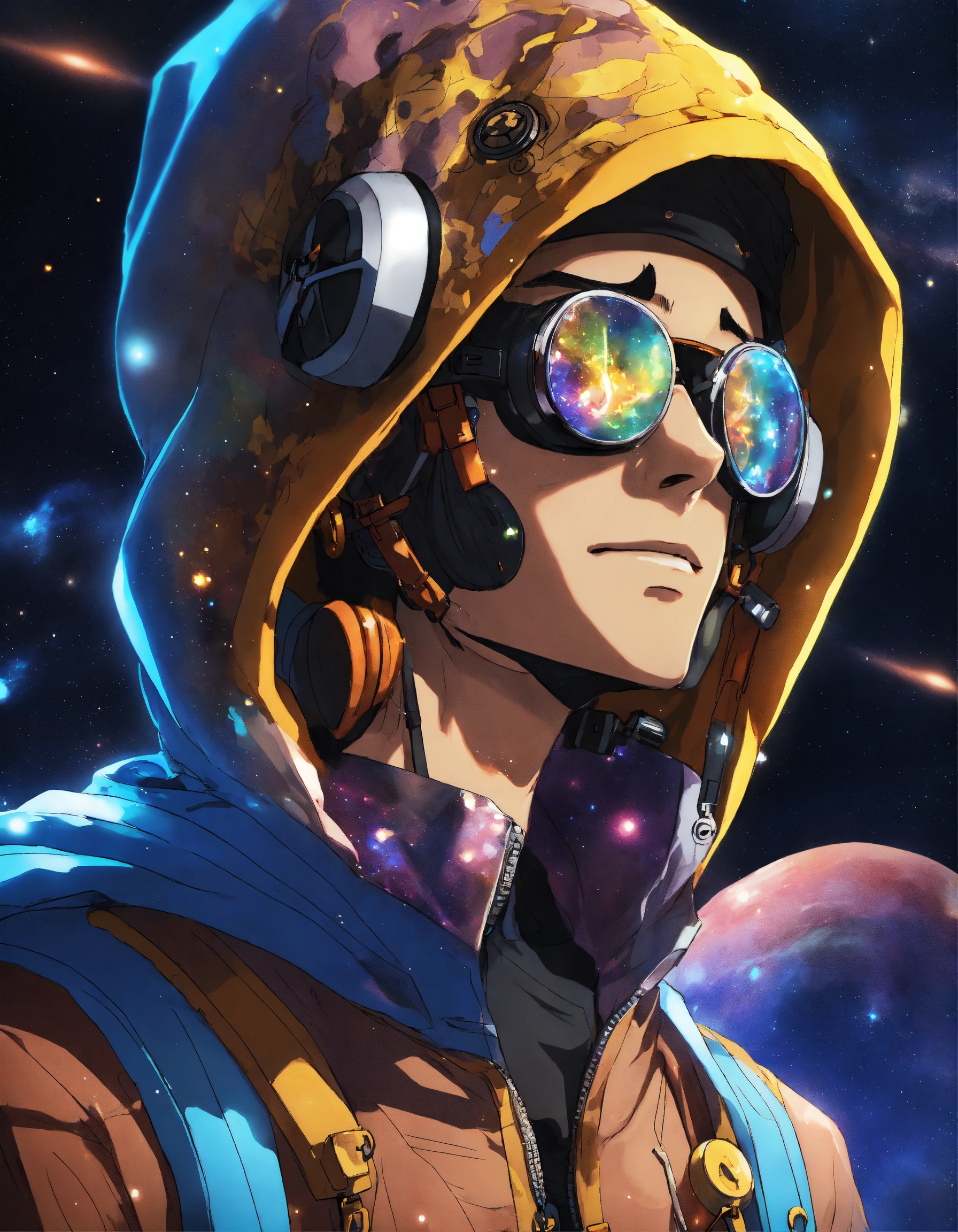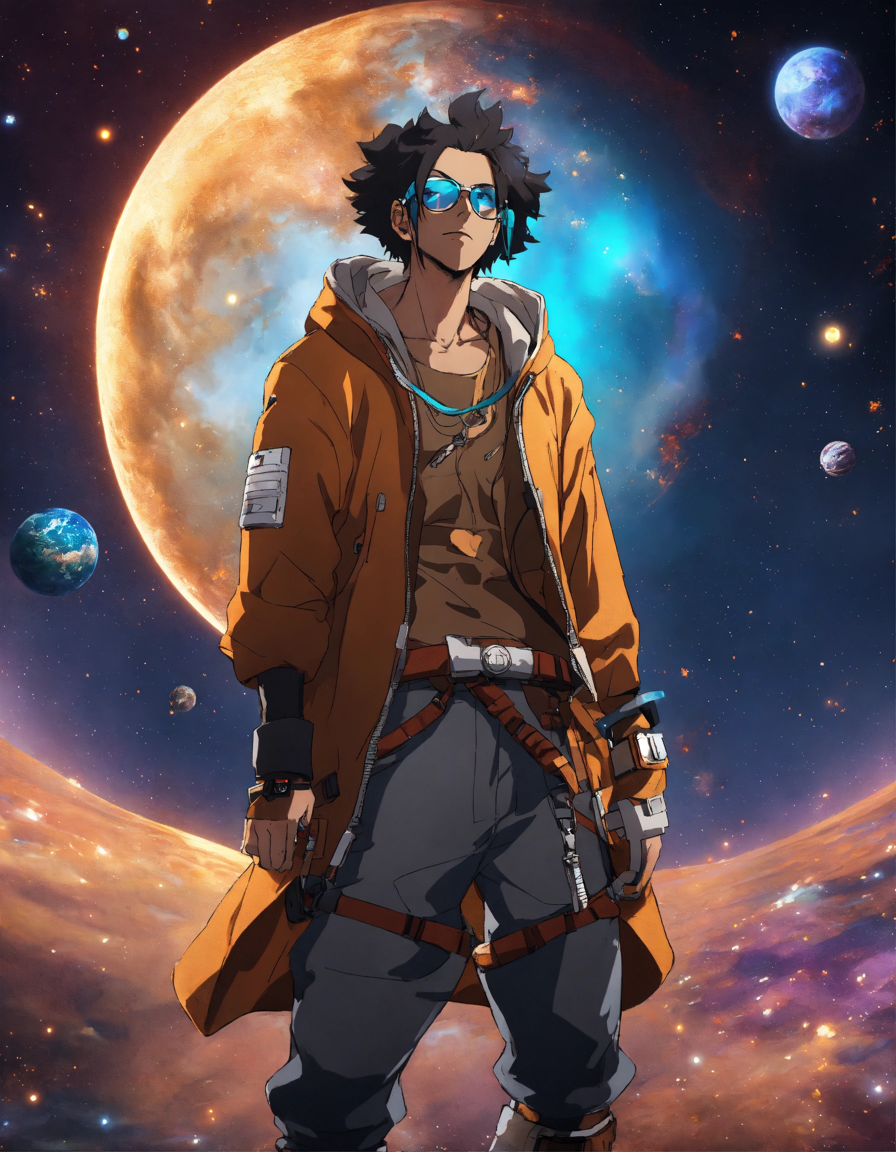 Profile image of a cyberpunk anime character wearing a hoodie retaining the colours from his outfit in the one piece anime, floating with his tools. background shows outer space and a brown cosmos in the style of anime, unreal 8d engine render. style the main character like usopp from the anime one piece, wearing his glasses