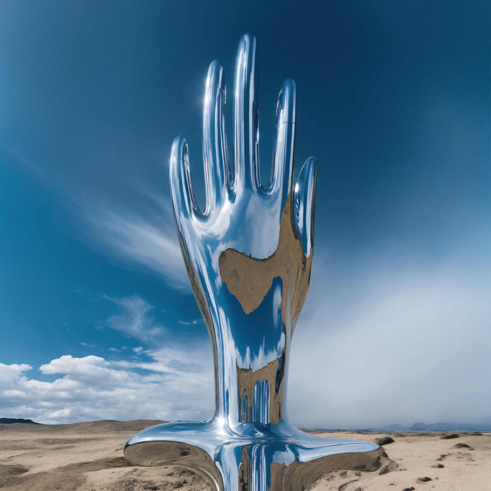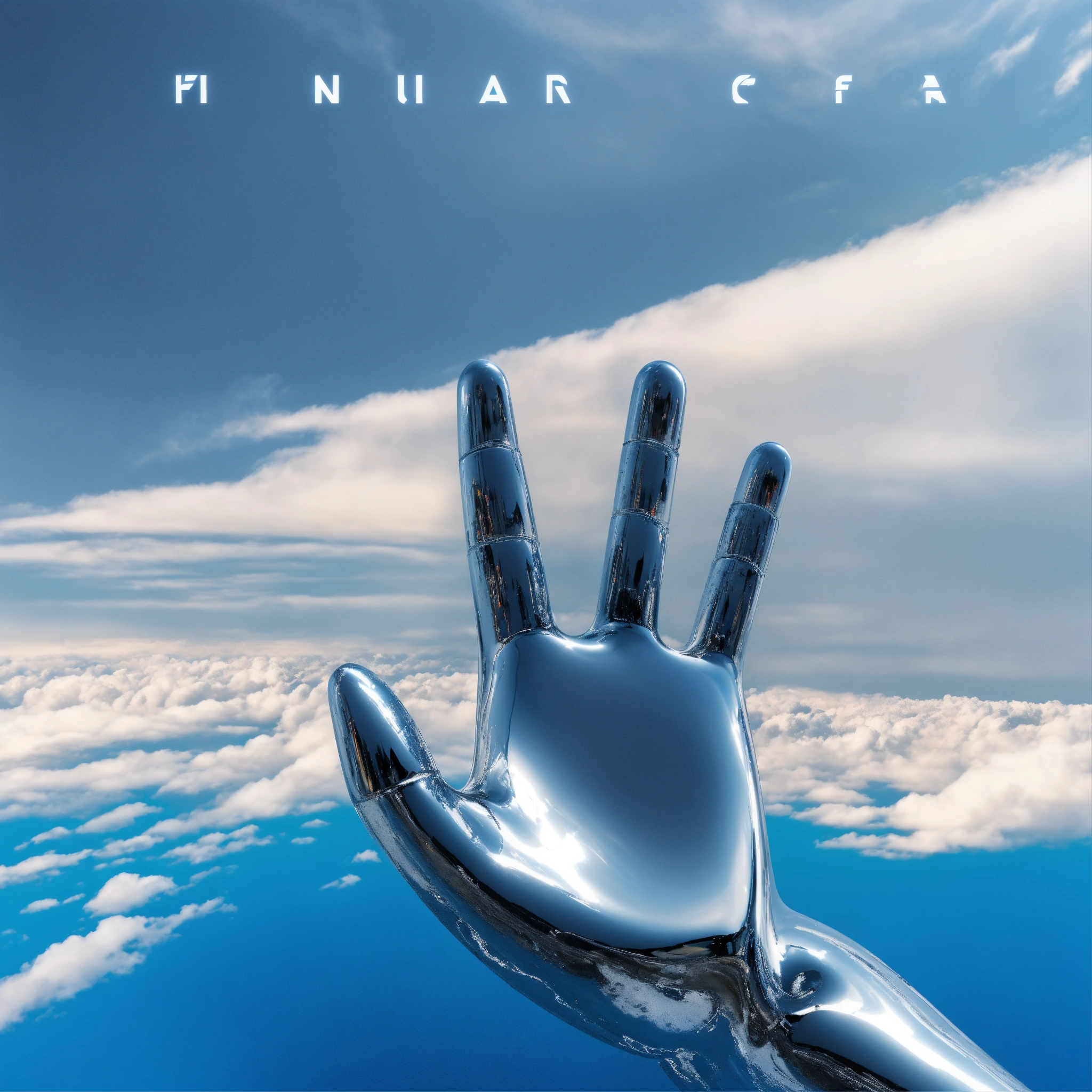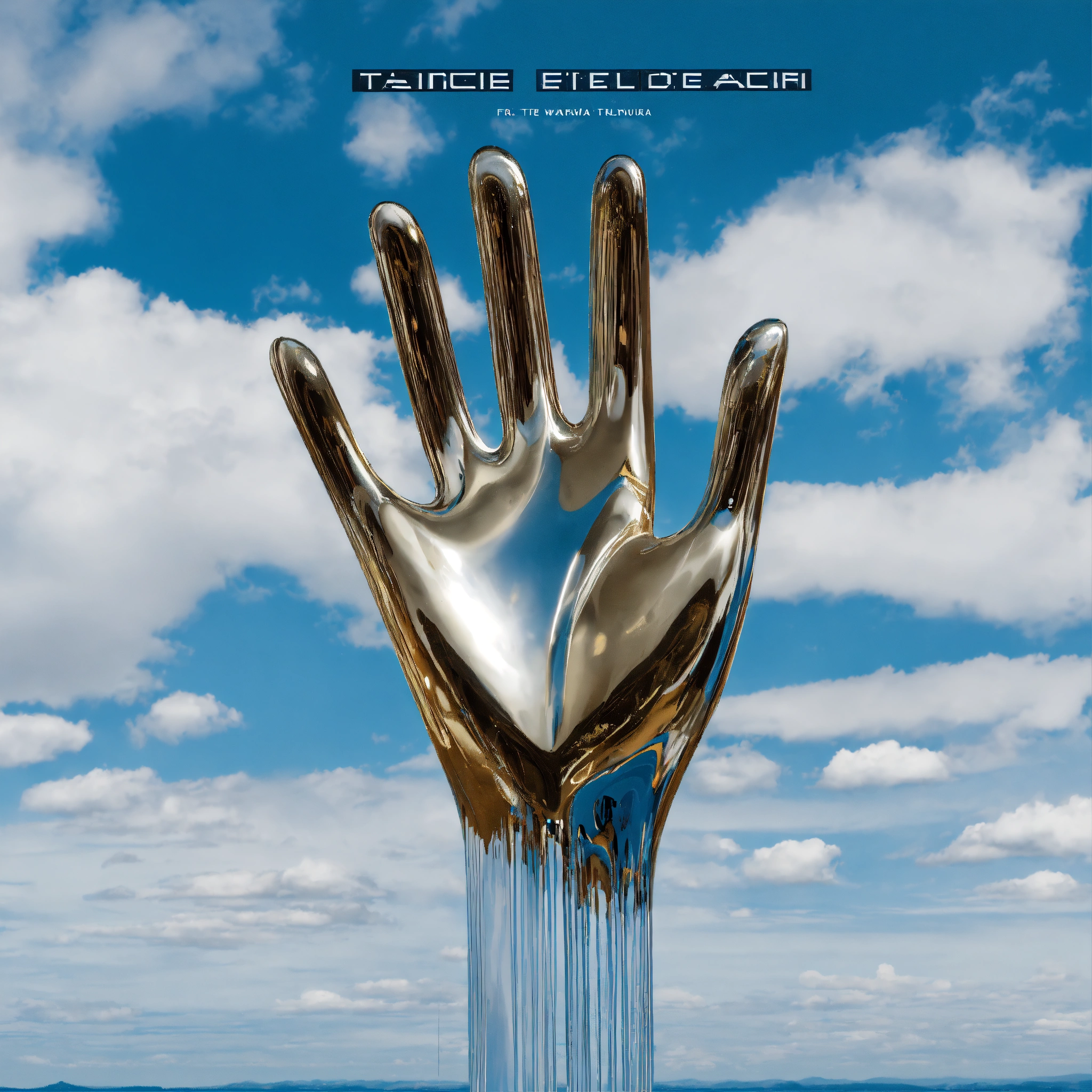 We want to make a cover for a techno album in the frutiger aero aesthetic. we thought about placing a very clear blue sky with a few white clouds as the background of the image, and in the center of the image a melting chrome hand.