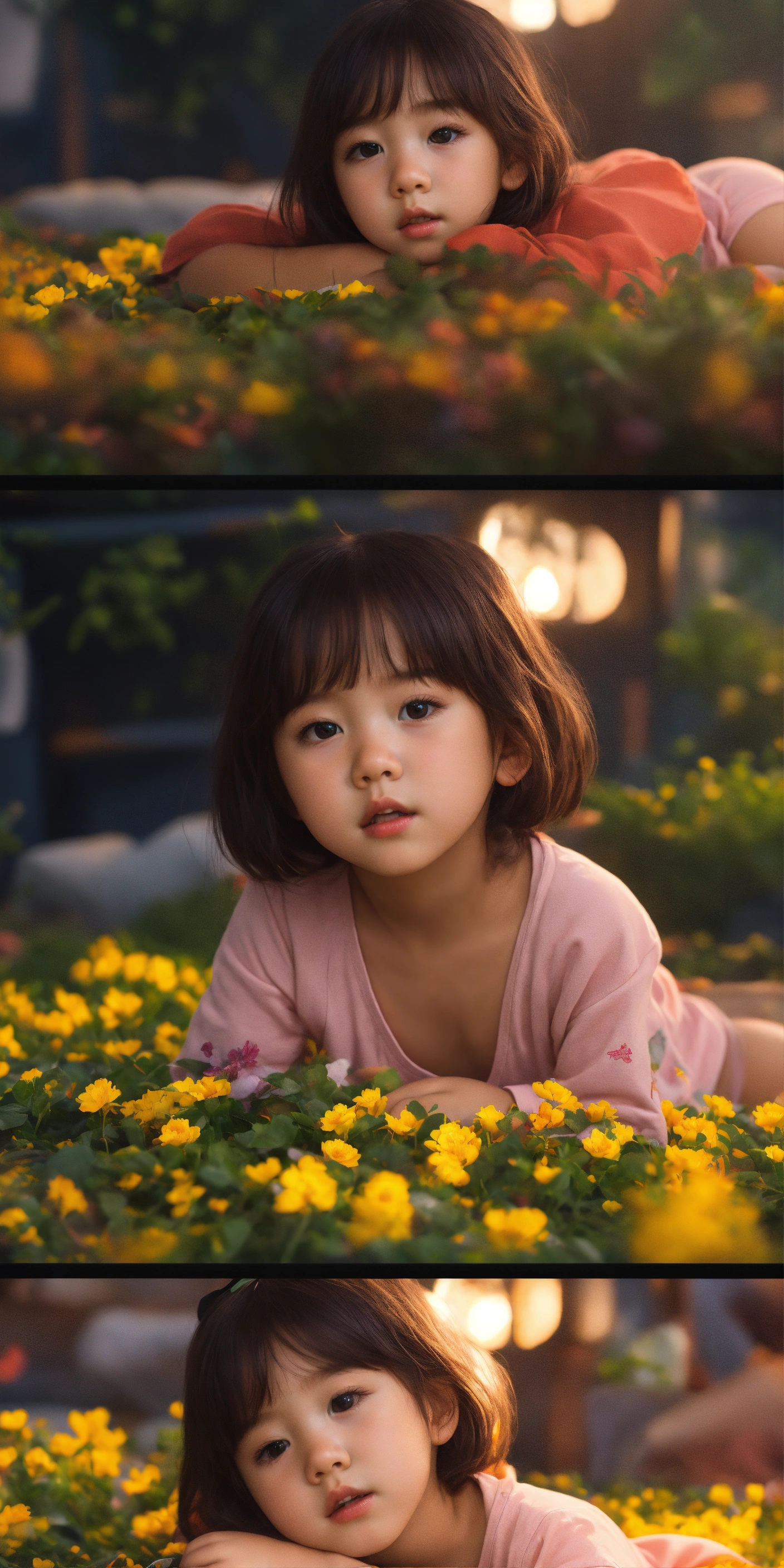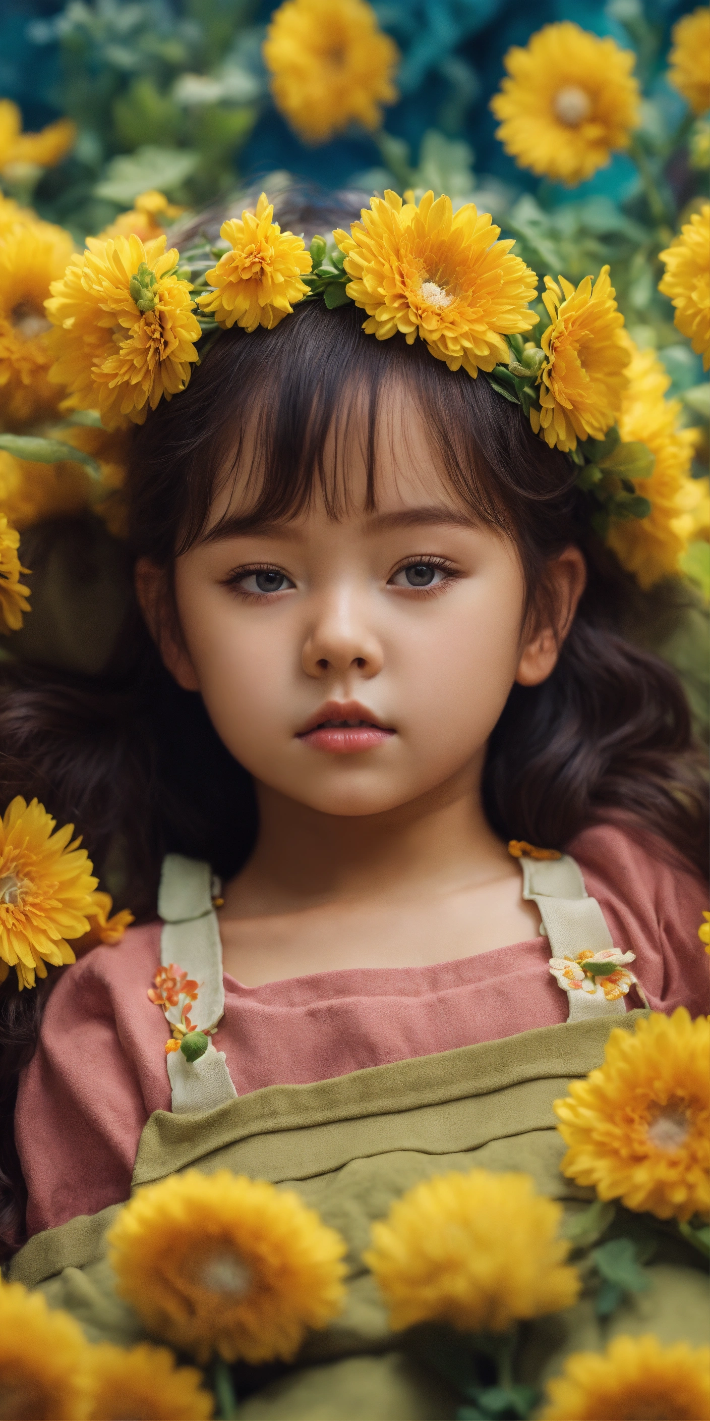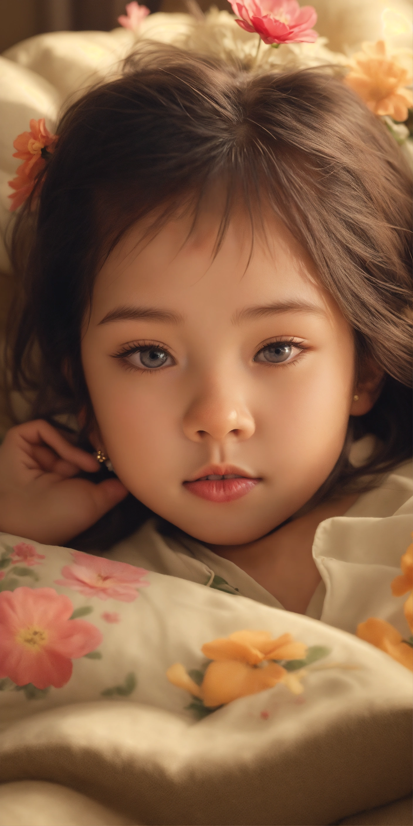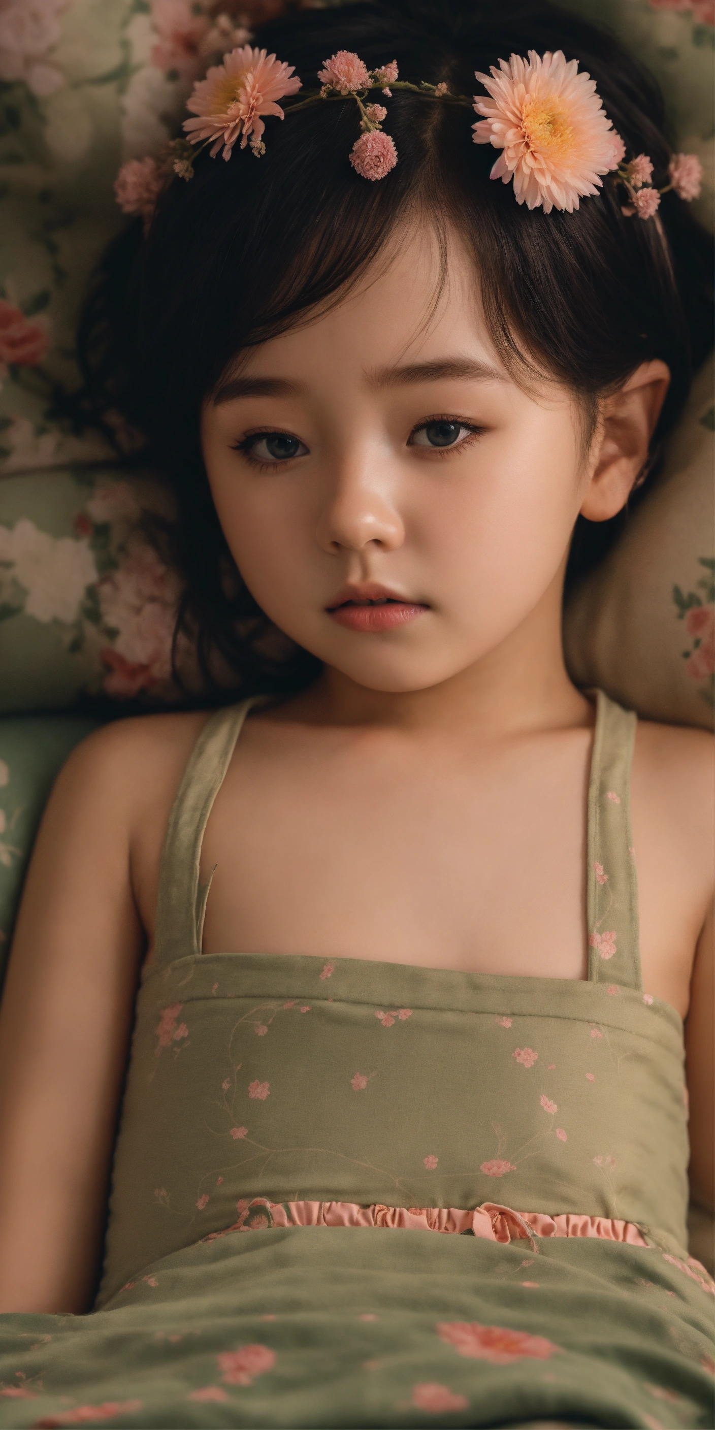 A little girl laying on a pillow with a flower in her hair, best algorithm, shorts, philosophical, bruh moment, screengrab, human babies, all things cease to exist, app, 9gag, ulzzang, realistically rendered clothing, sleepers, brad, very coherent image, title, movie poster with no text, insightful, very dramatic