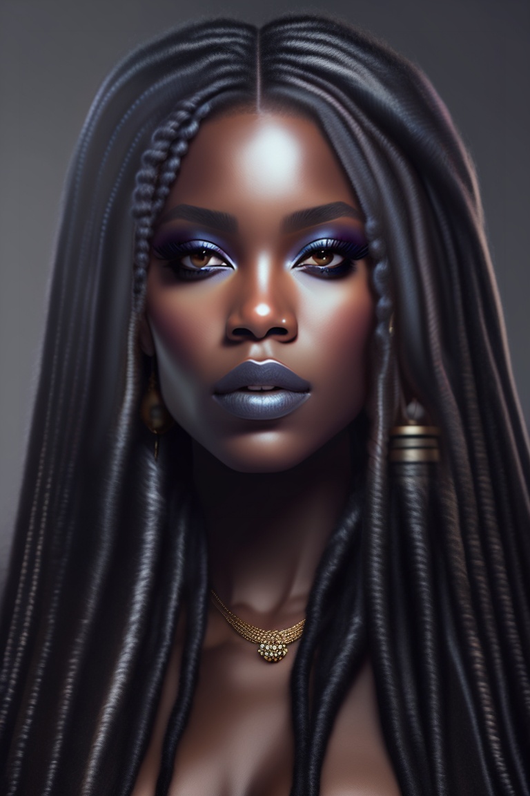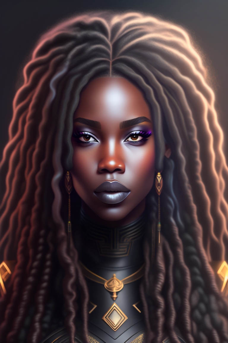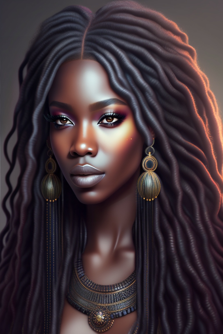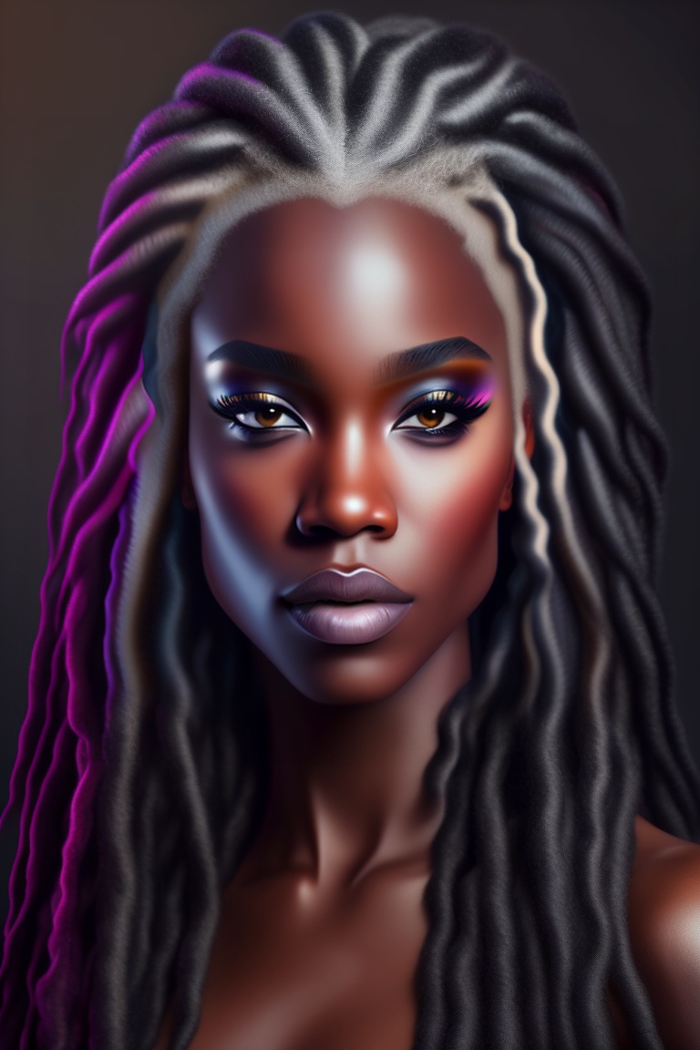Medusa black woman with long dreadlocks white hair, detailed dark pretty eyes & shiny black lipstick, large emotional eyes, ultra-detailed portrait