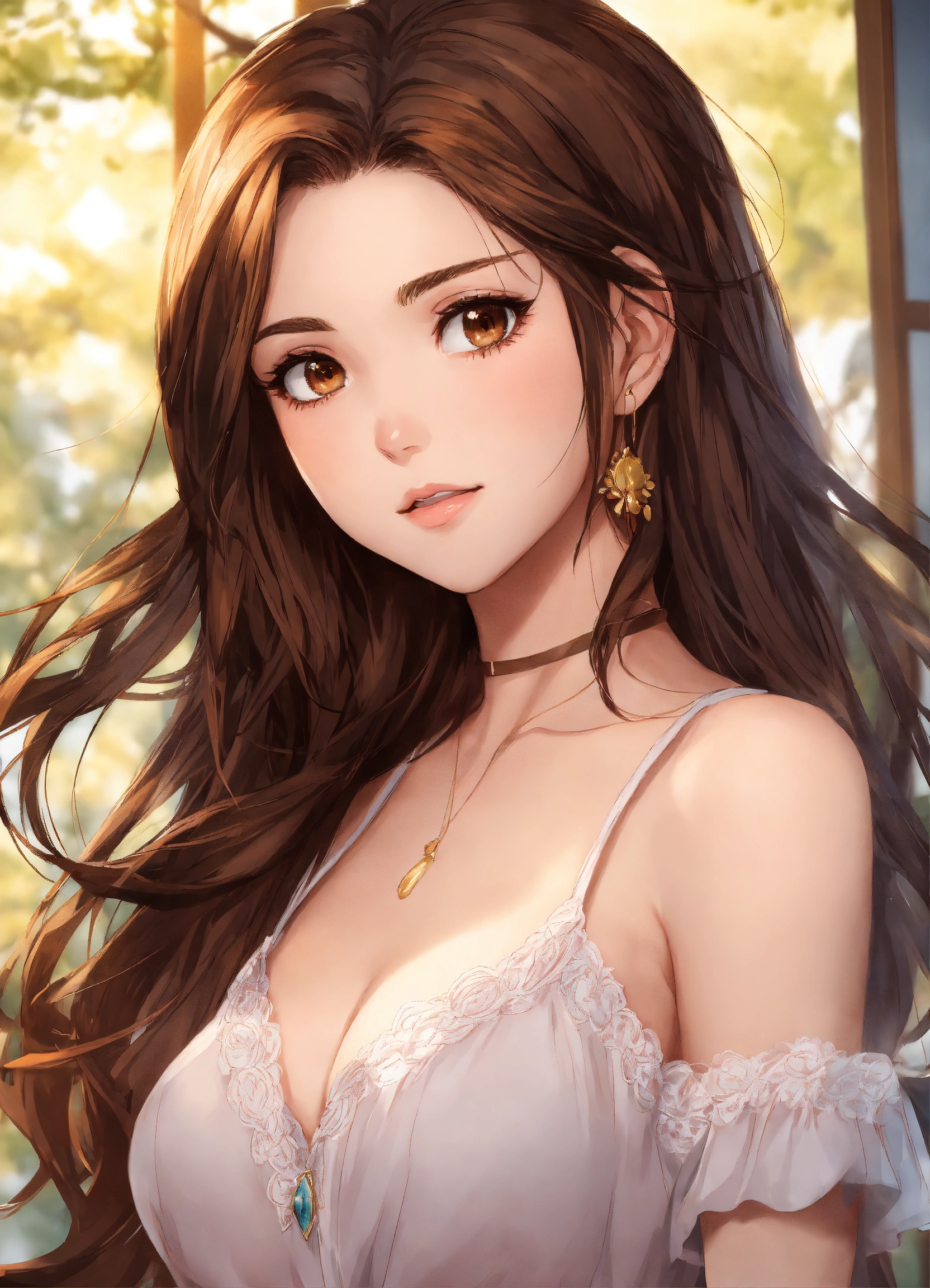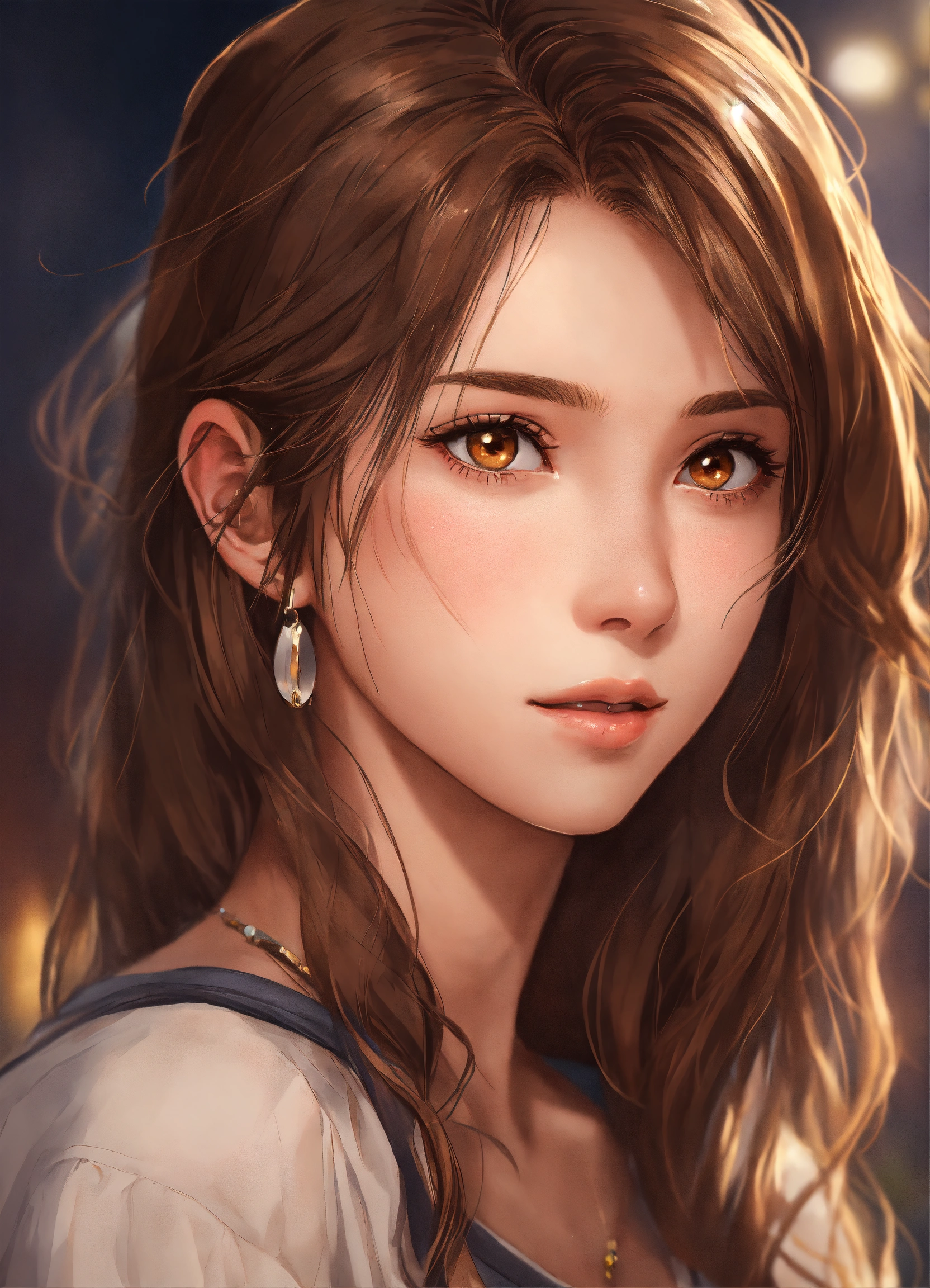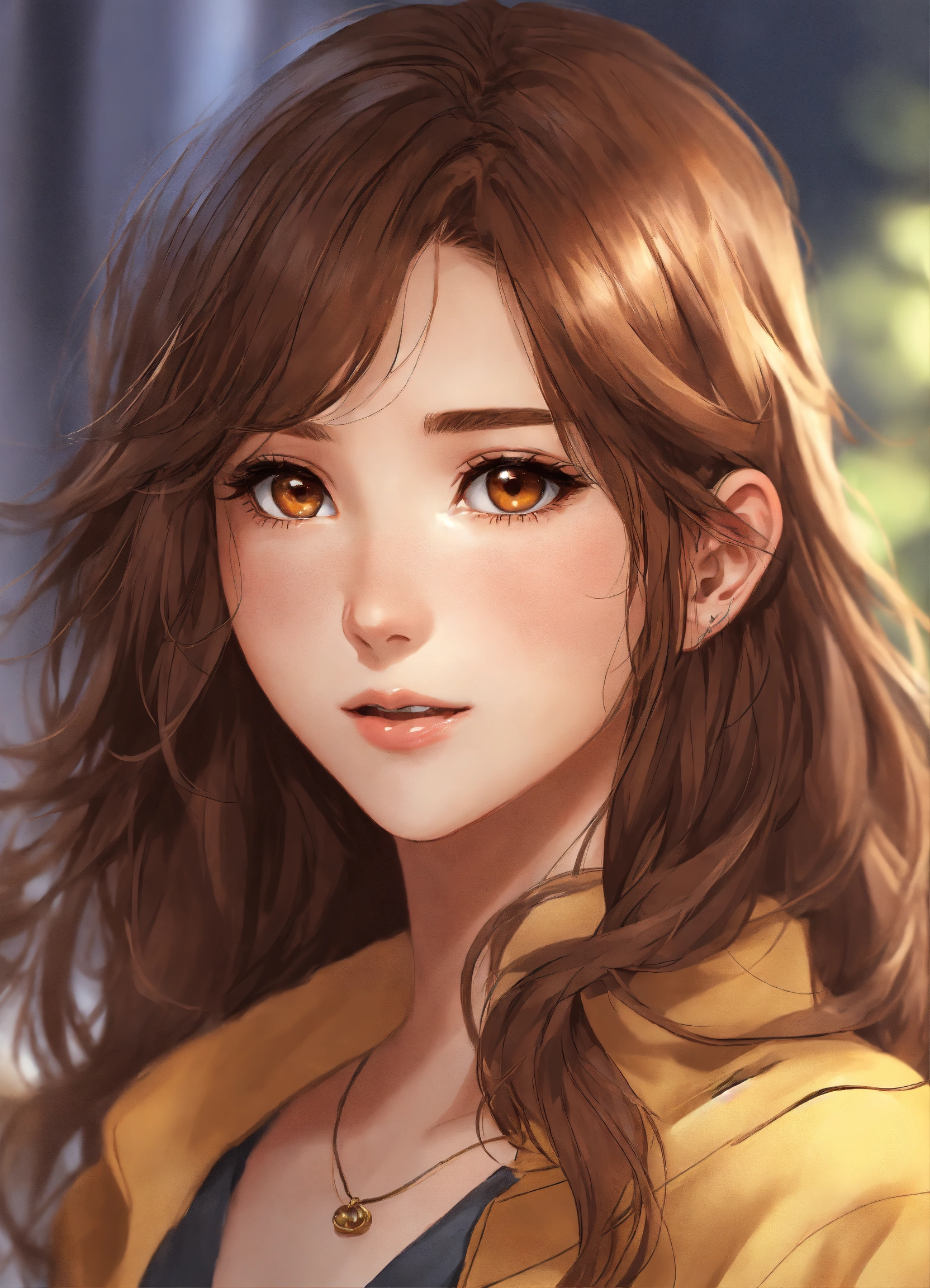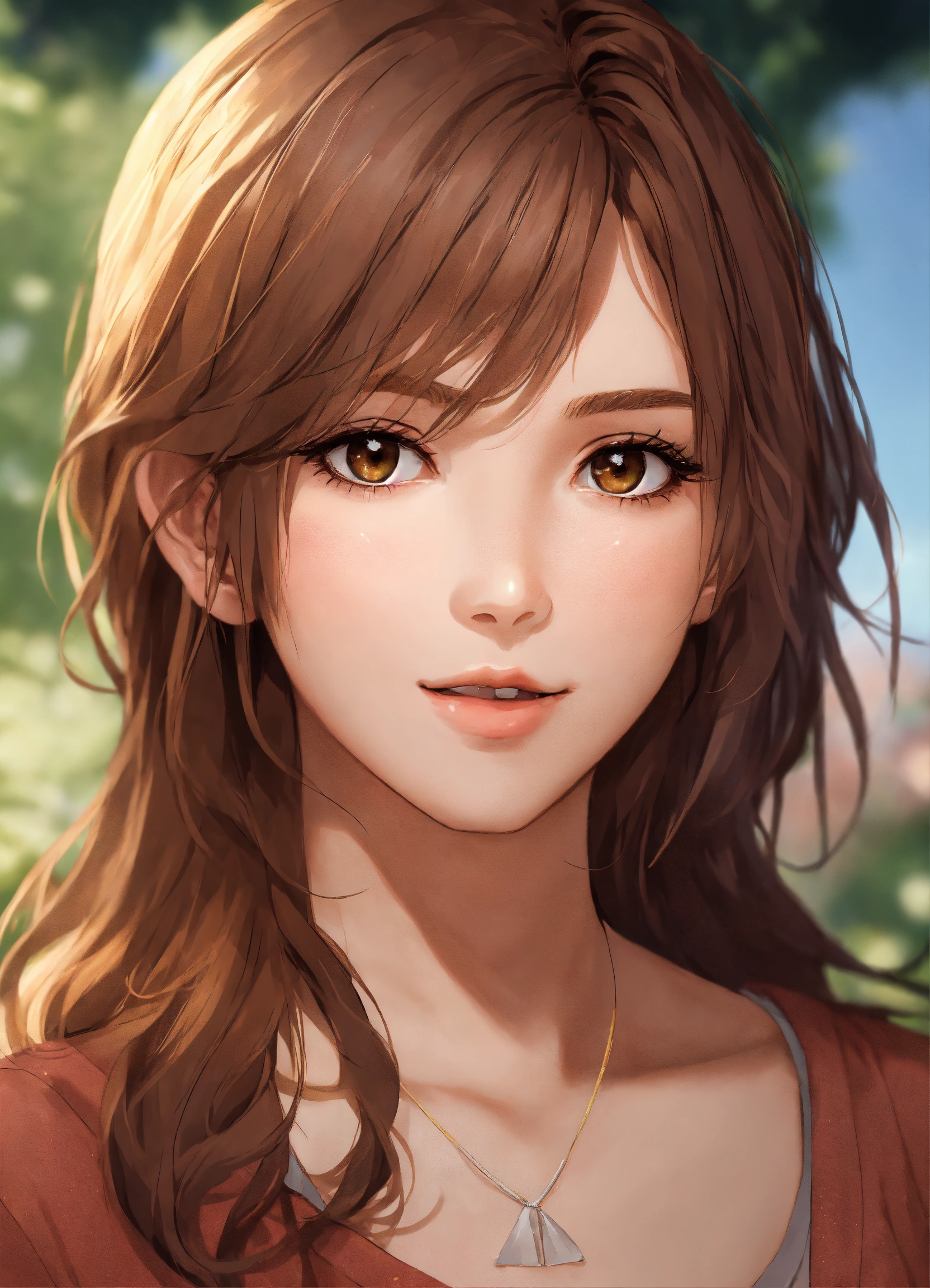 Woman 18 years old, shoulder length brown hair, beautiful face, soft facial features, height 175, feminine figure, brown eyes, anime reskin style