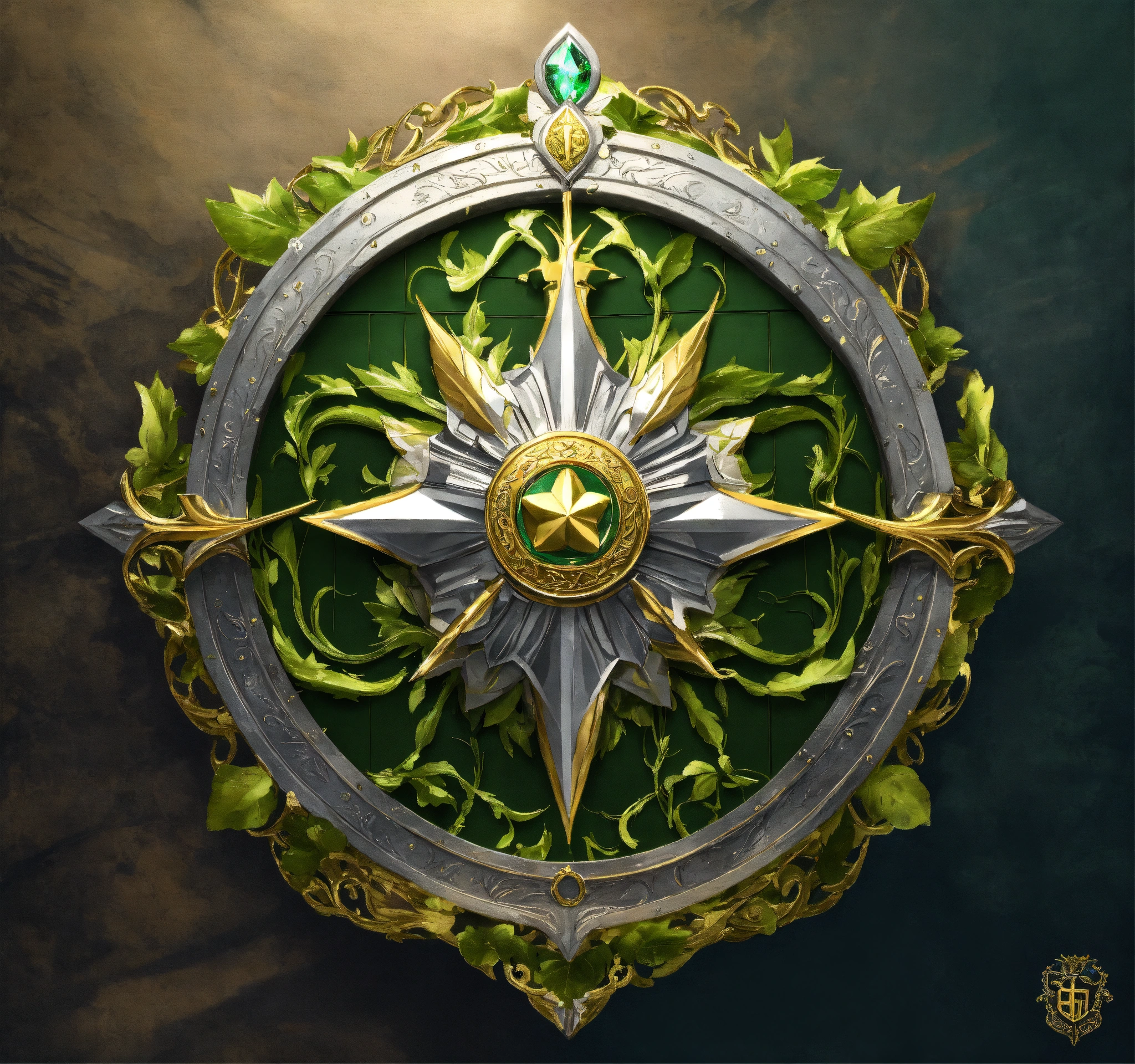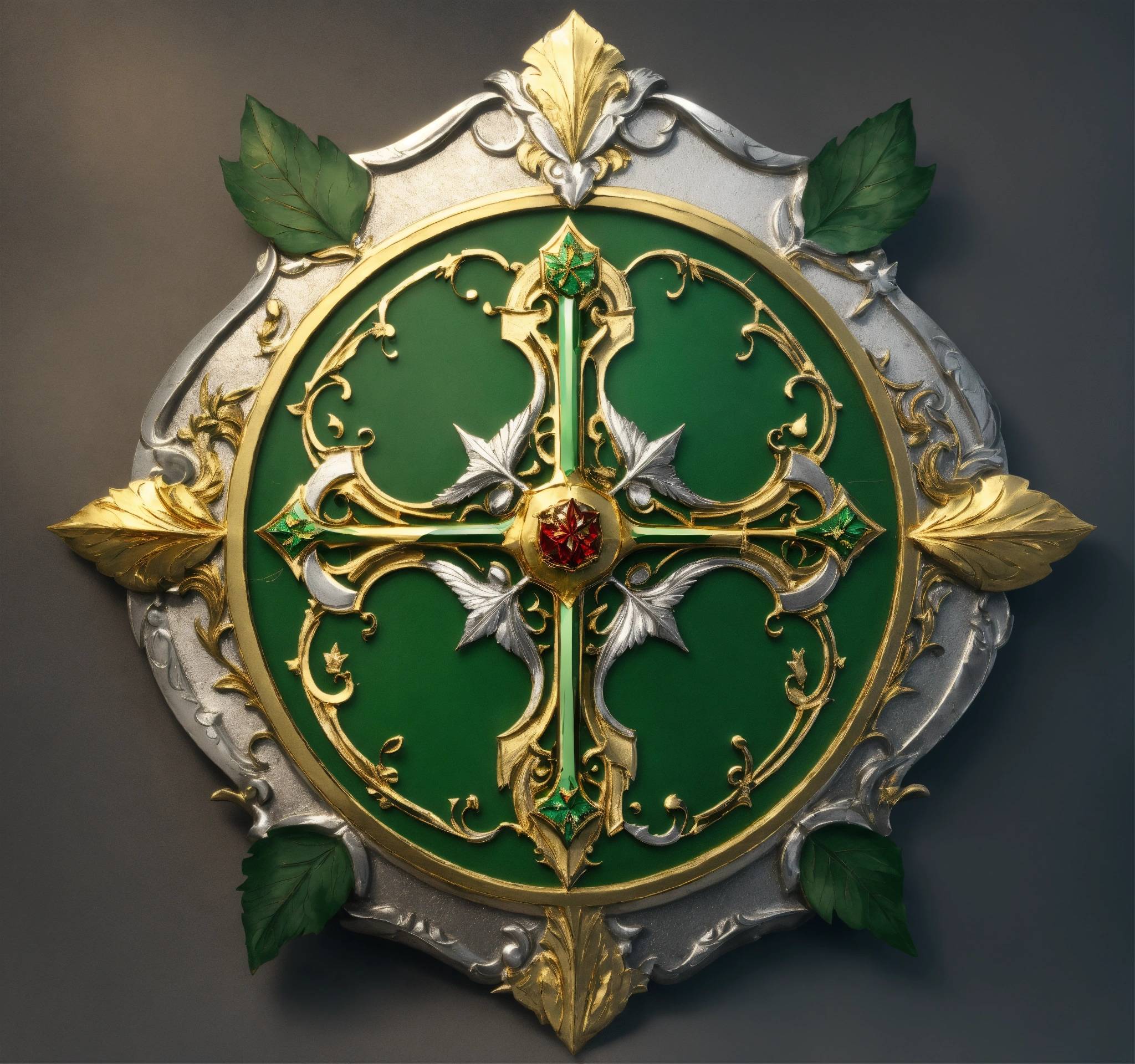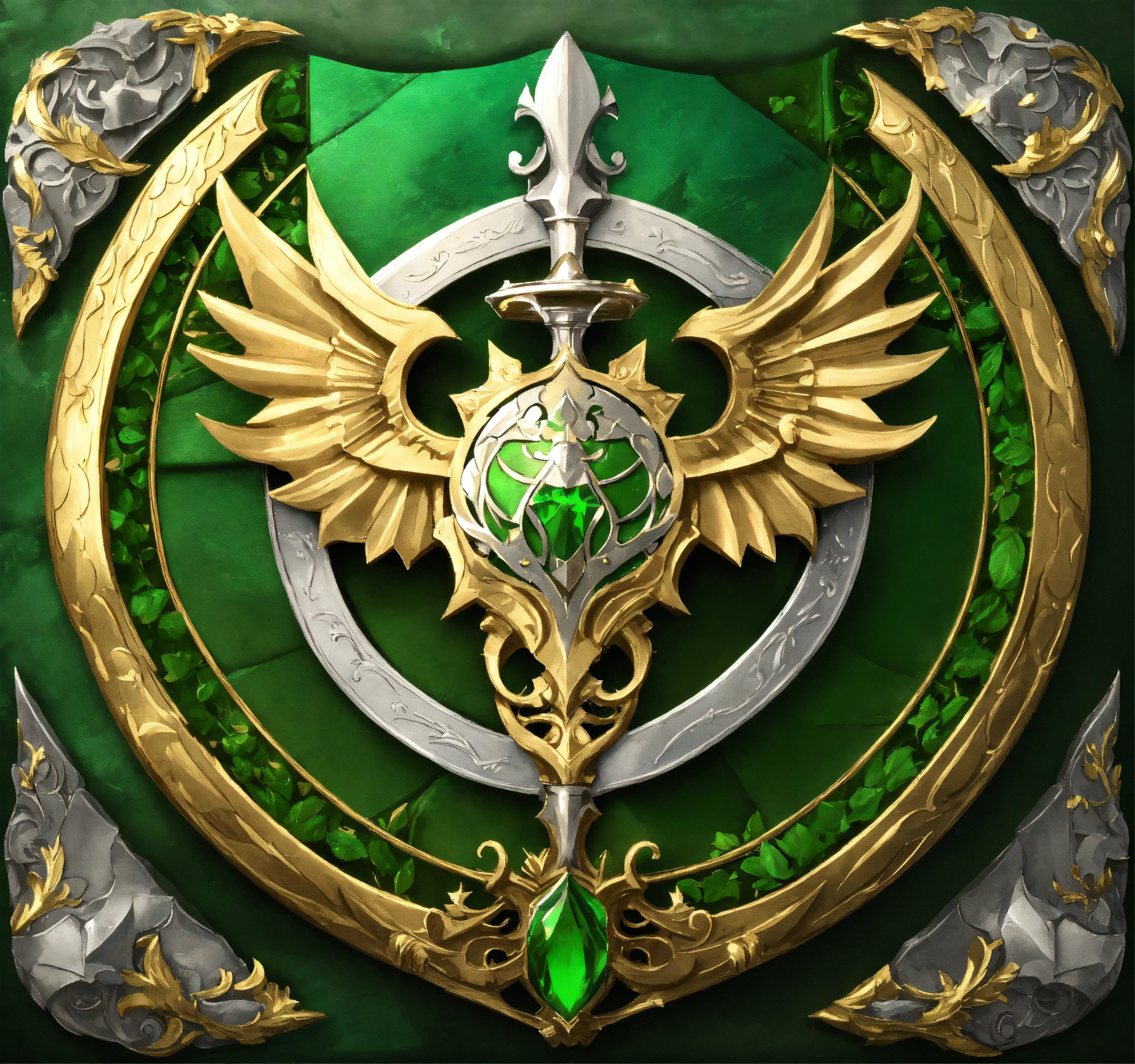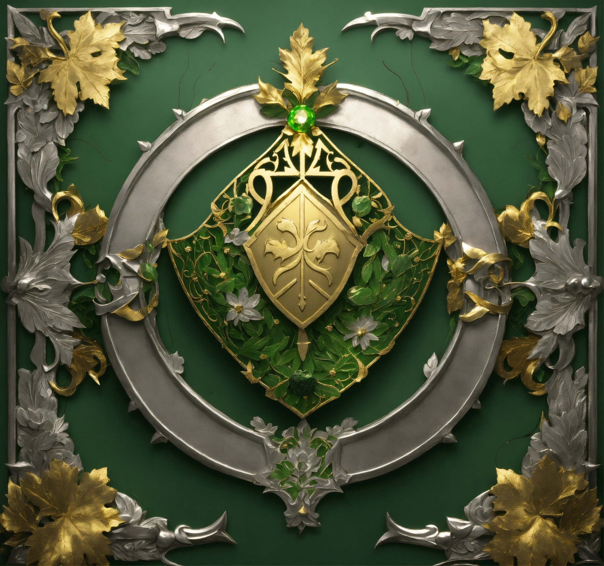 Fantasy setting, coat of arms for a militaristic elven kingdom, green, silver, gold, with a gold leaf as a center piece.