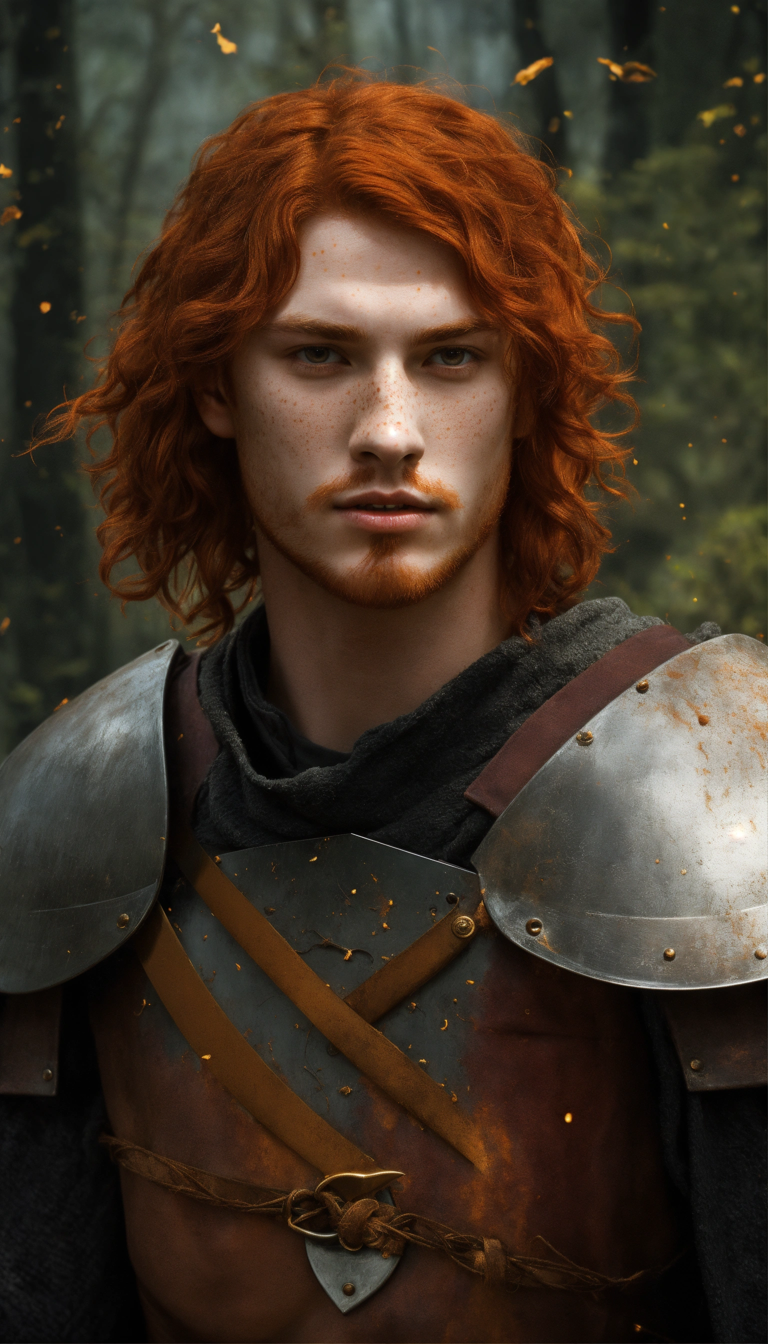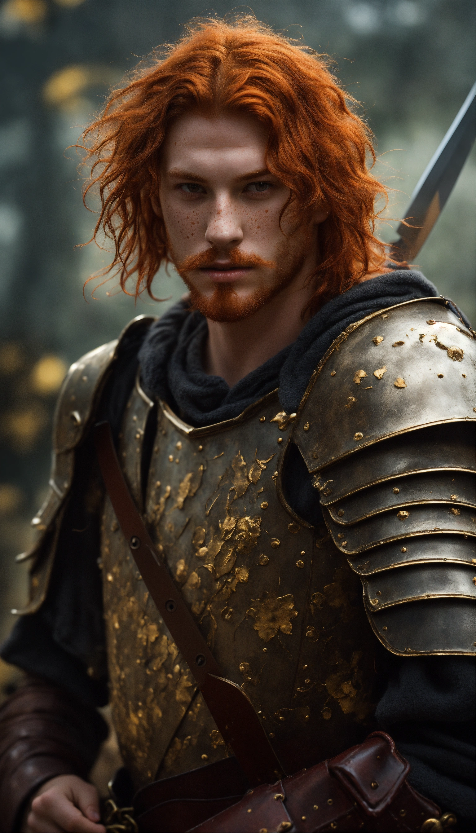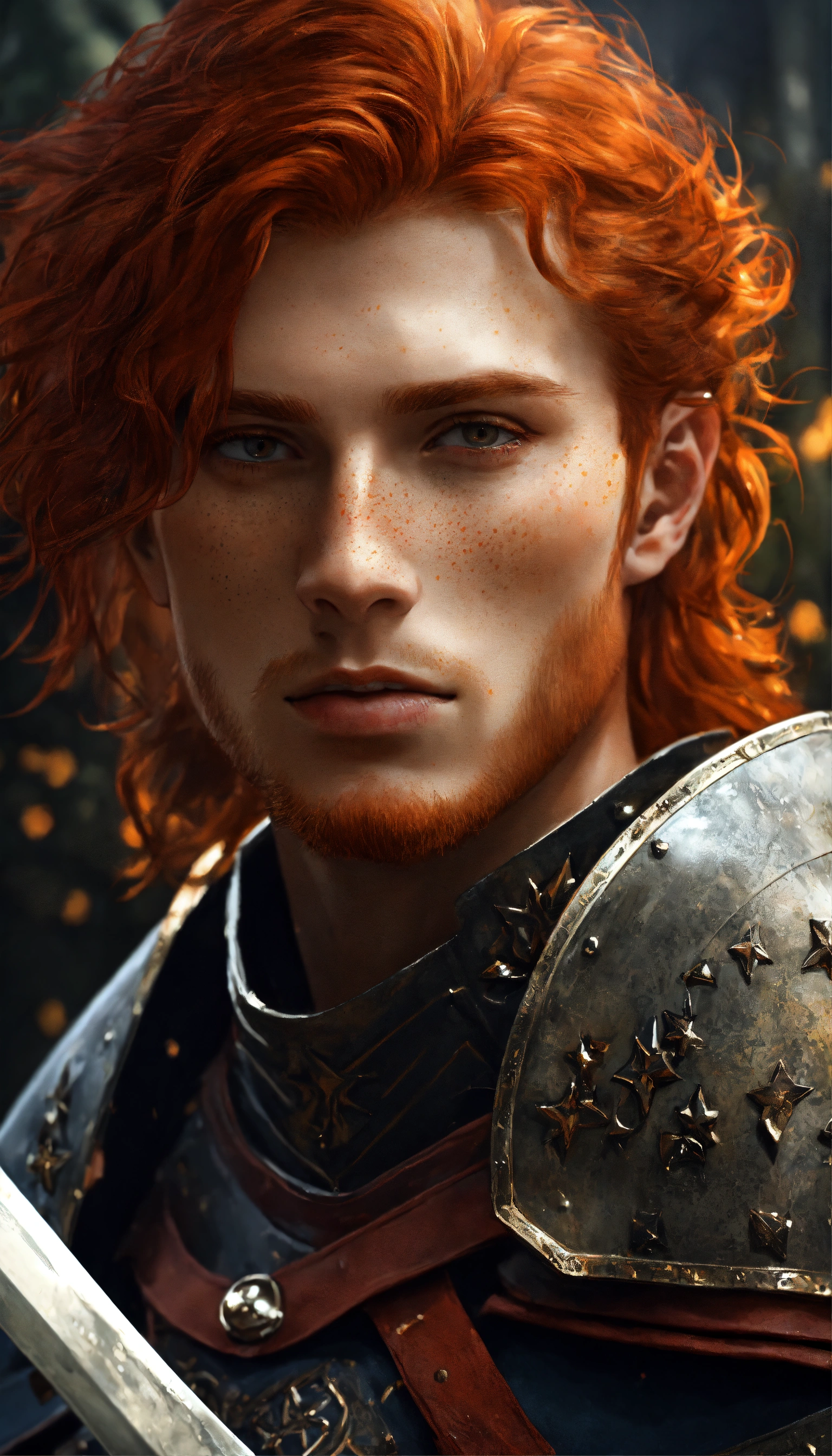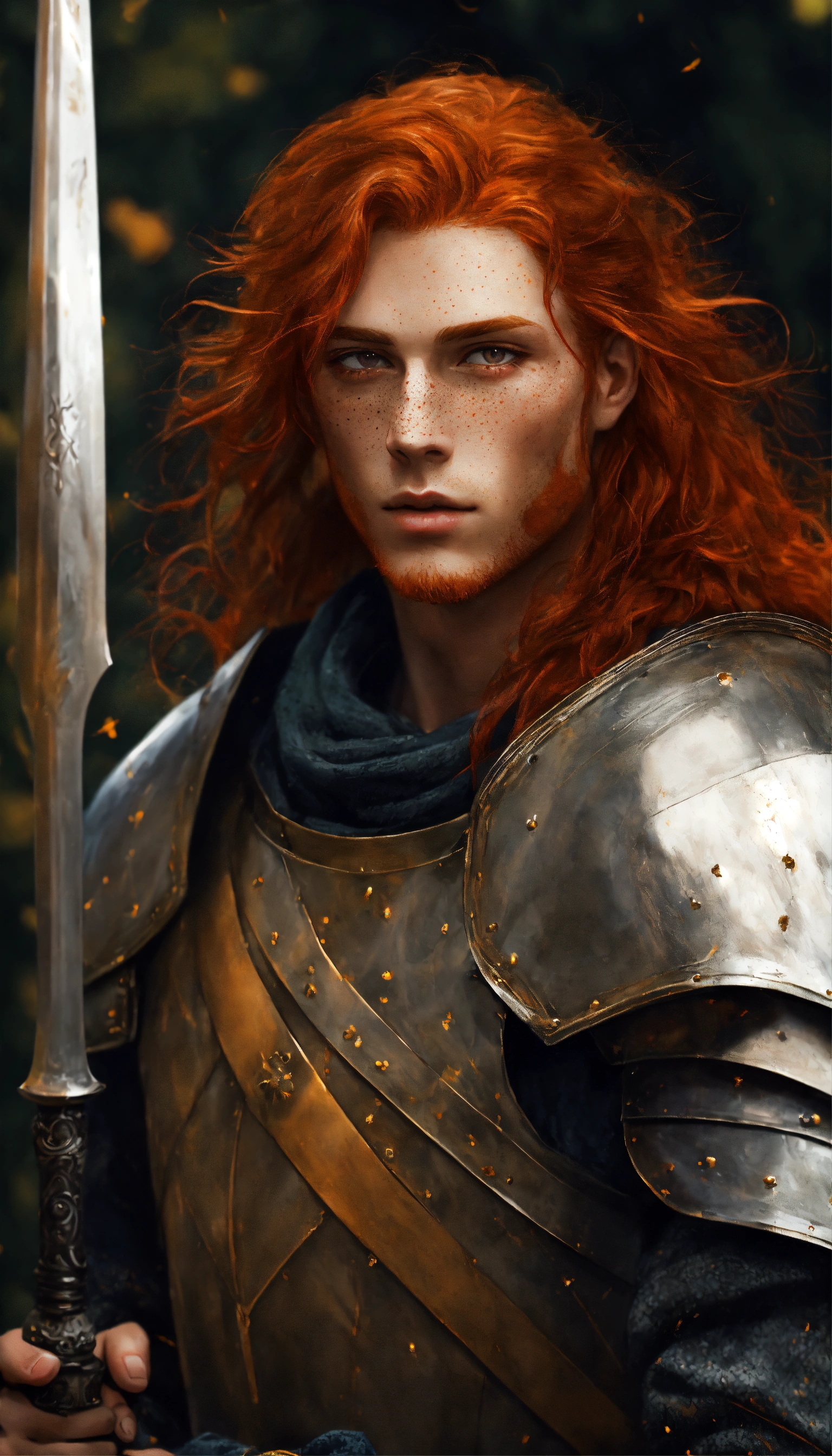 A knight with a blade redhair, really thin and have a really pale skin. he has messy hair and freckles on his nose.