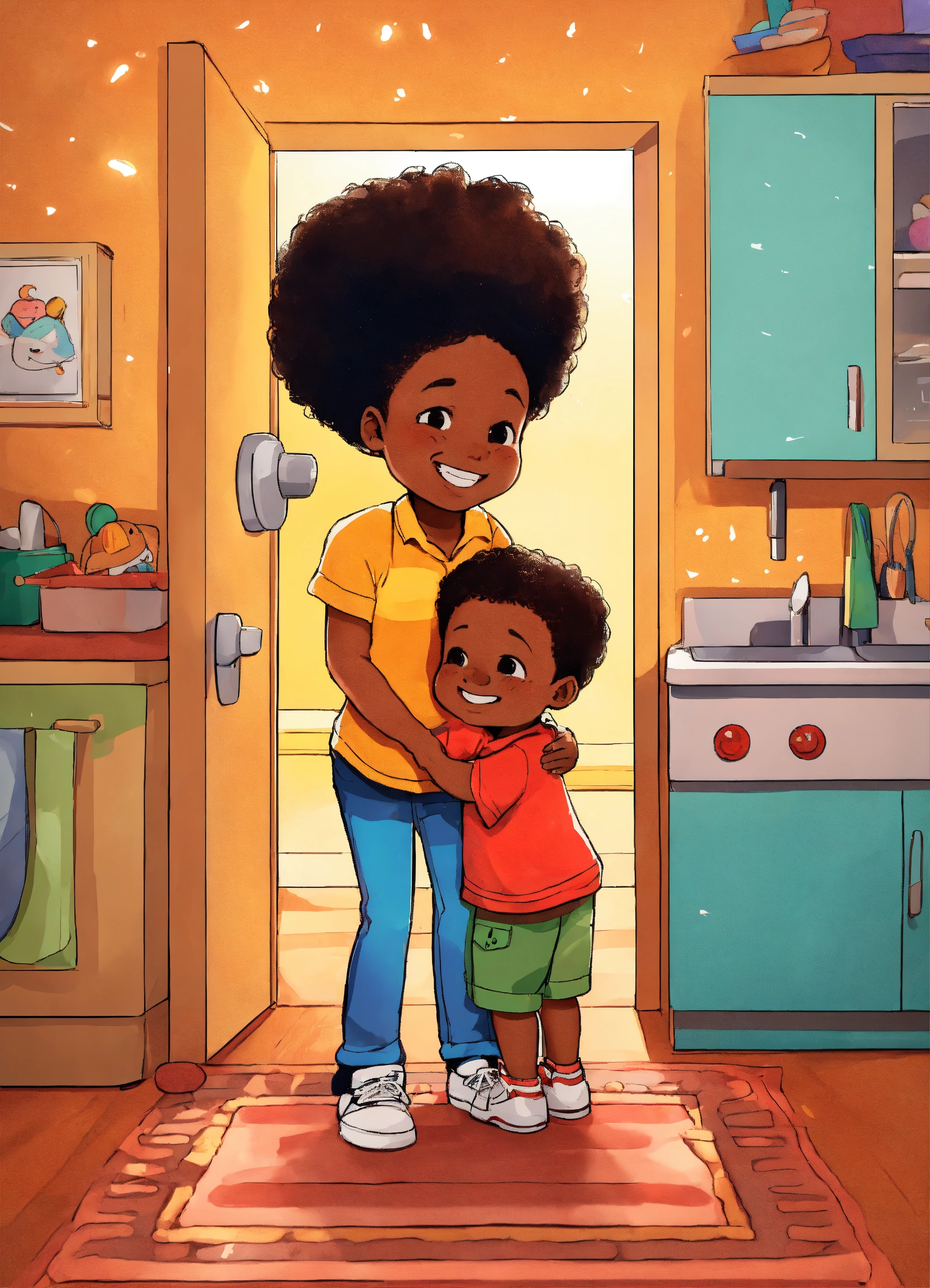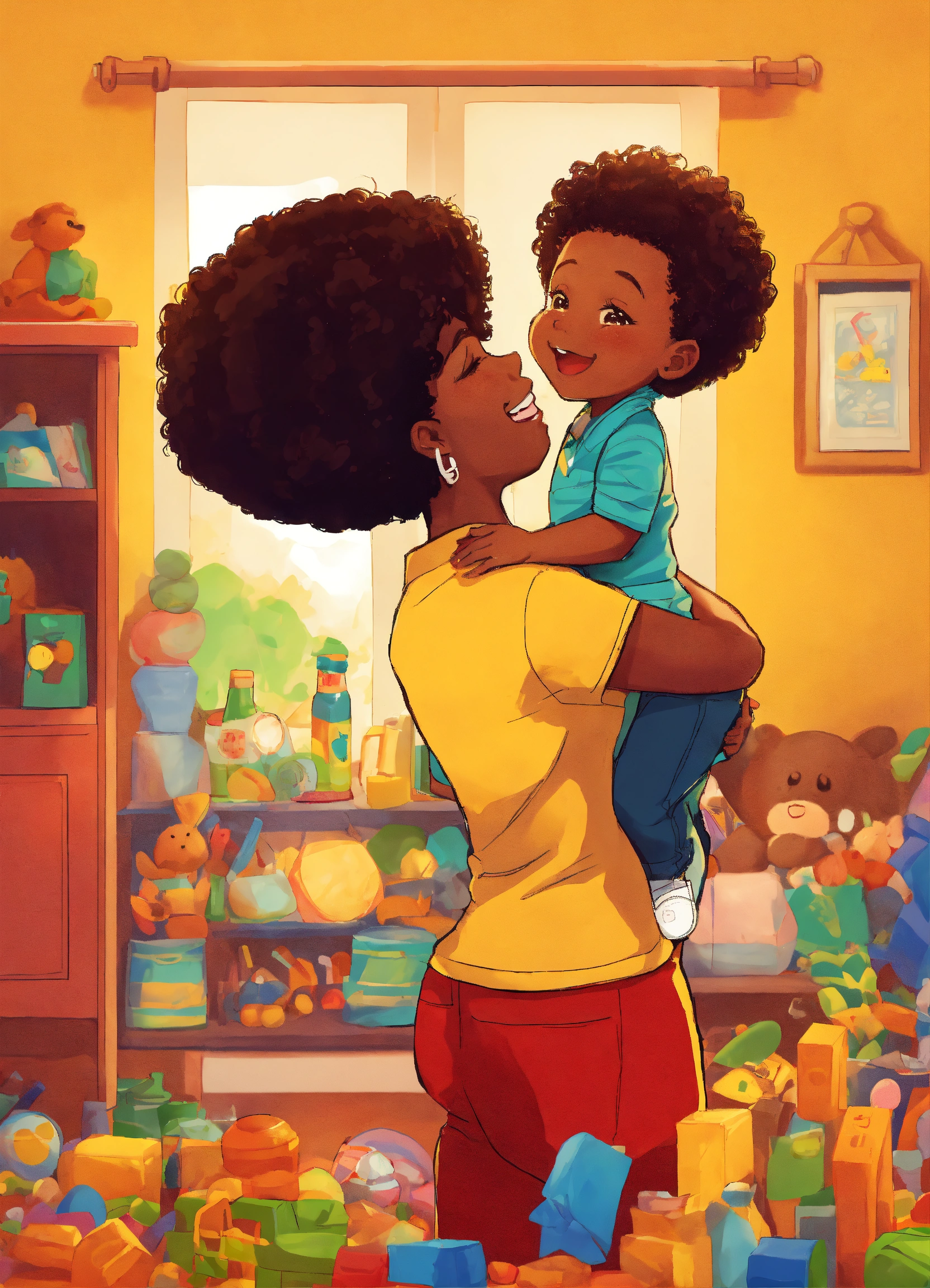 Cartoon, colorful, illustrate a black toddler boy and black mom, welcoming him home after school. show her giving him a loving hug and a special treat. include a background filled with their favorite toys and games.