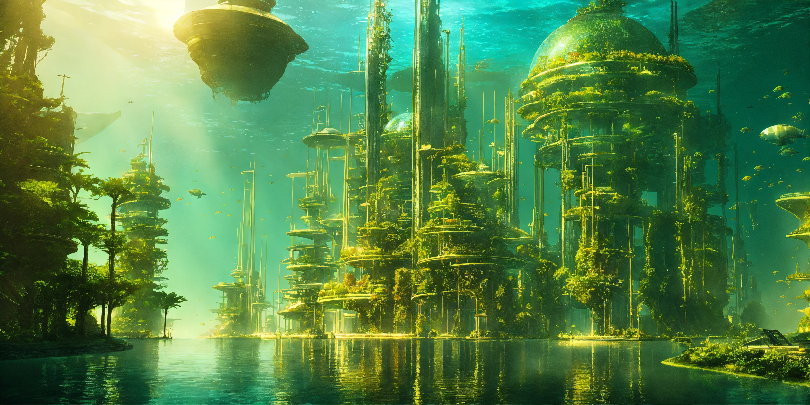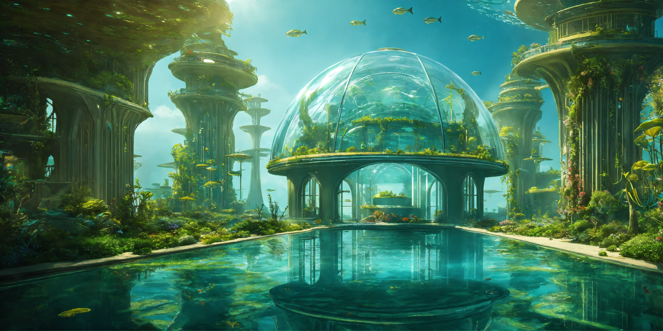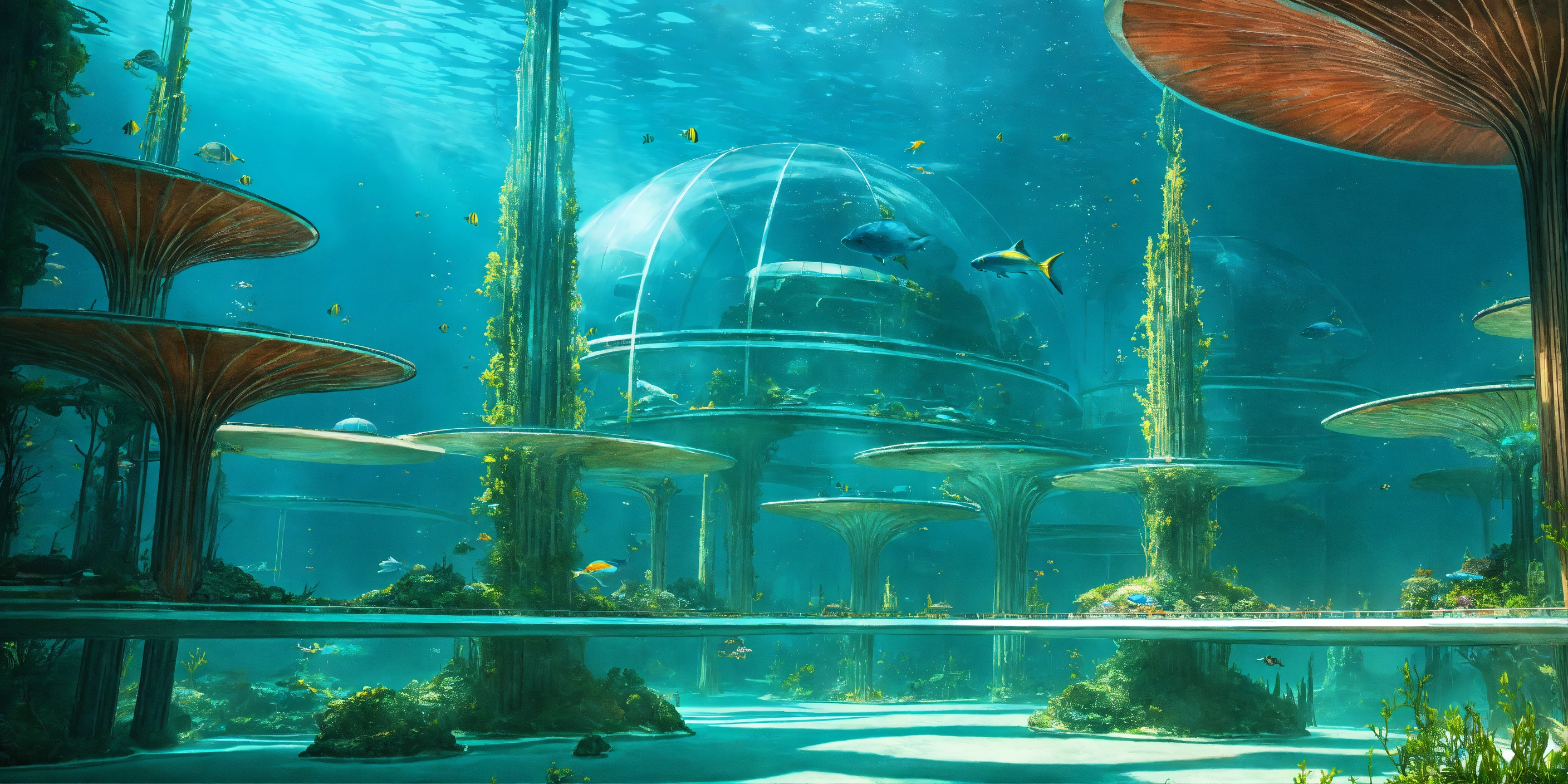 Futuristic underwater city with underwater plantations featuring glass domes and spires