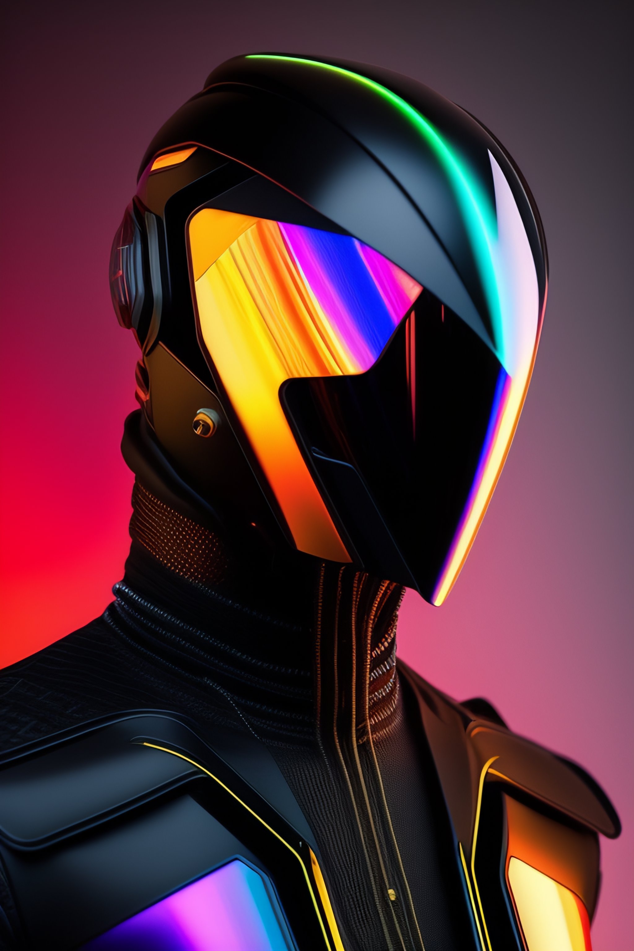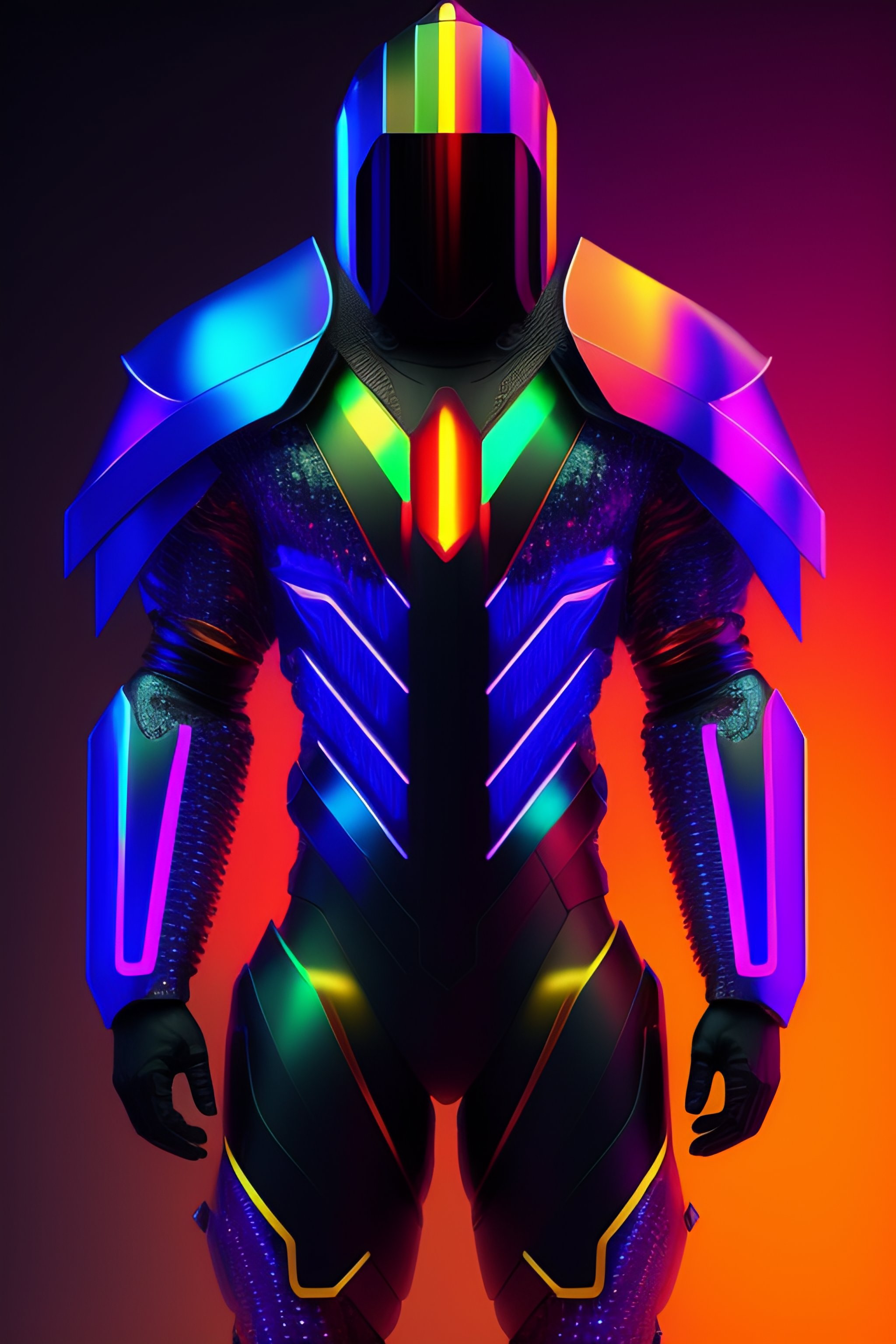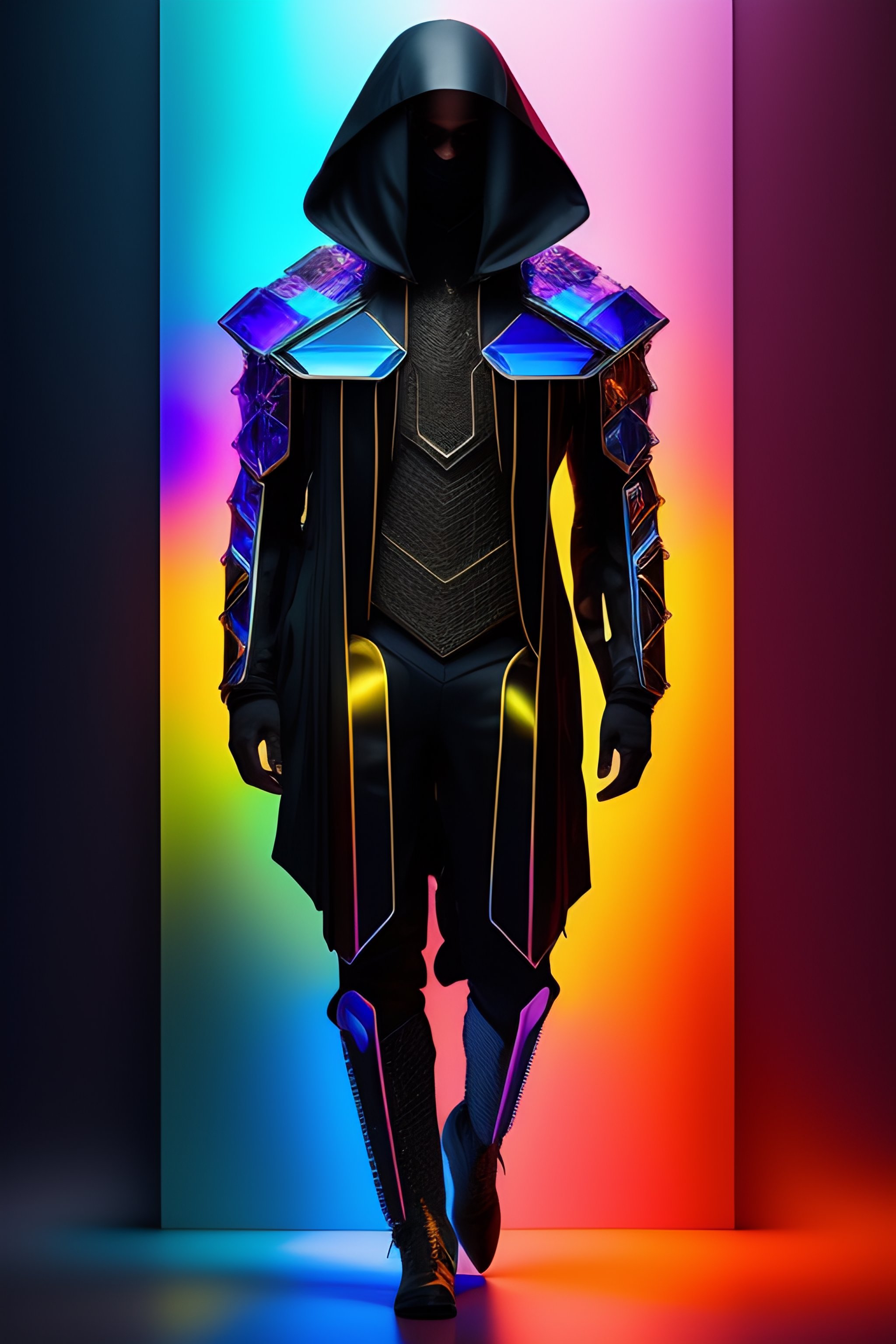 Armadura de cuerpo entero de hombre, cyberpunk hecha de titanio negro y algo de cristal, rgb leds arco iris, traje de poder, degradado, cristal, cables visibles y microchip, holograma, torso transparente cristalino, imponente, elegante, para hombres, minimalismo moderno, líneas de polietileno bajo, núcleo glitch, soñador, colorido, distopía, divino, misterioso