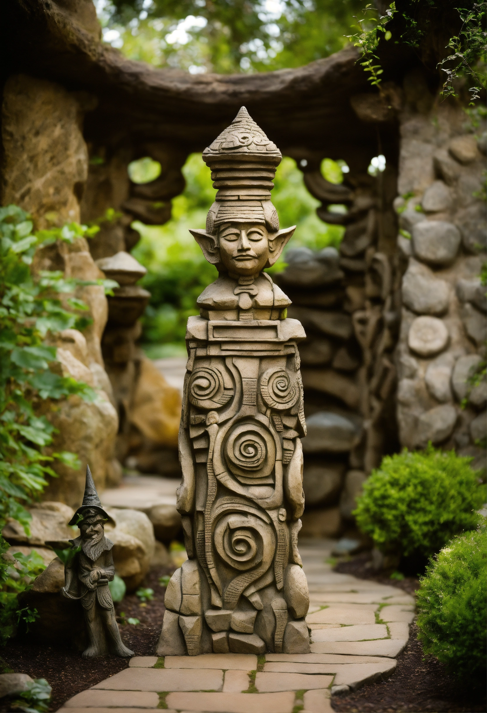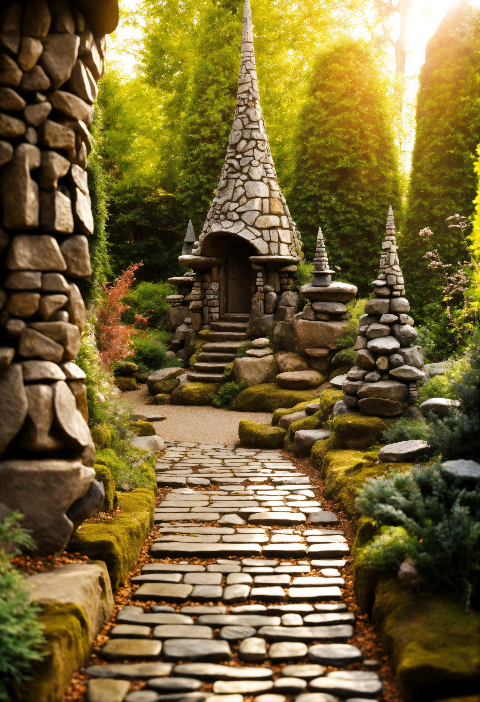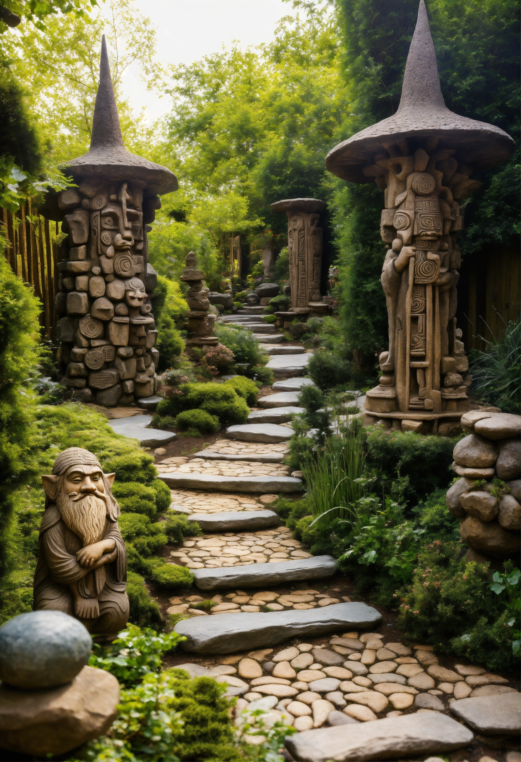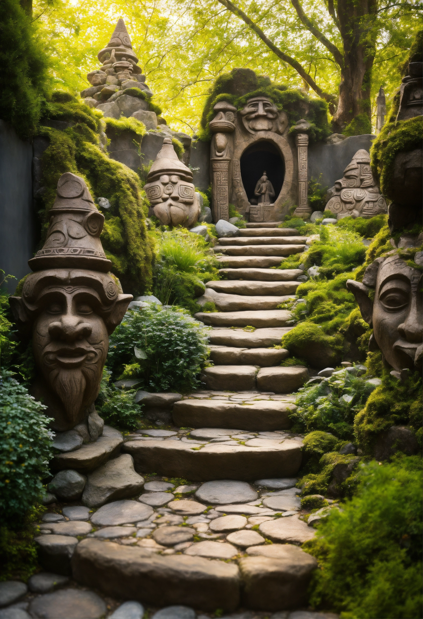 An ancient spiritual gnome inspired stone pathway rock garden.sculptured . style of alex grey/brian froud/giger.lots of totem sculptures. patterned stone winding pathway, labyrinth.courtyard.meditative.