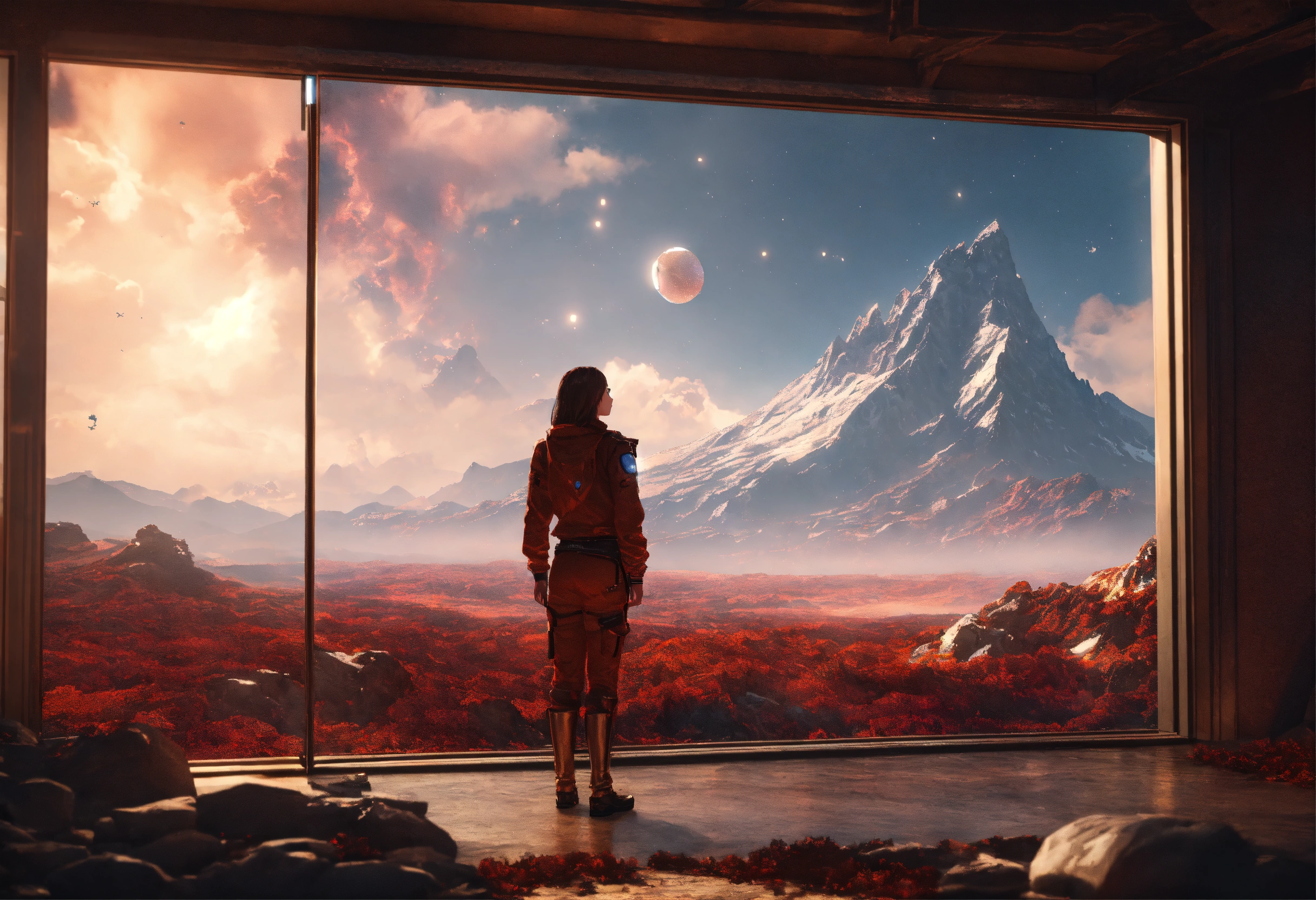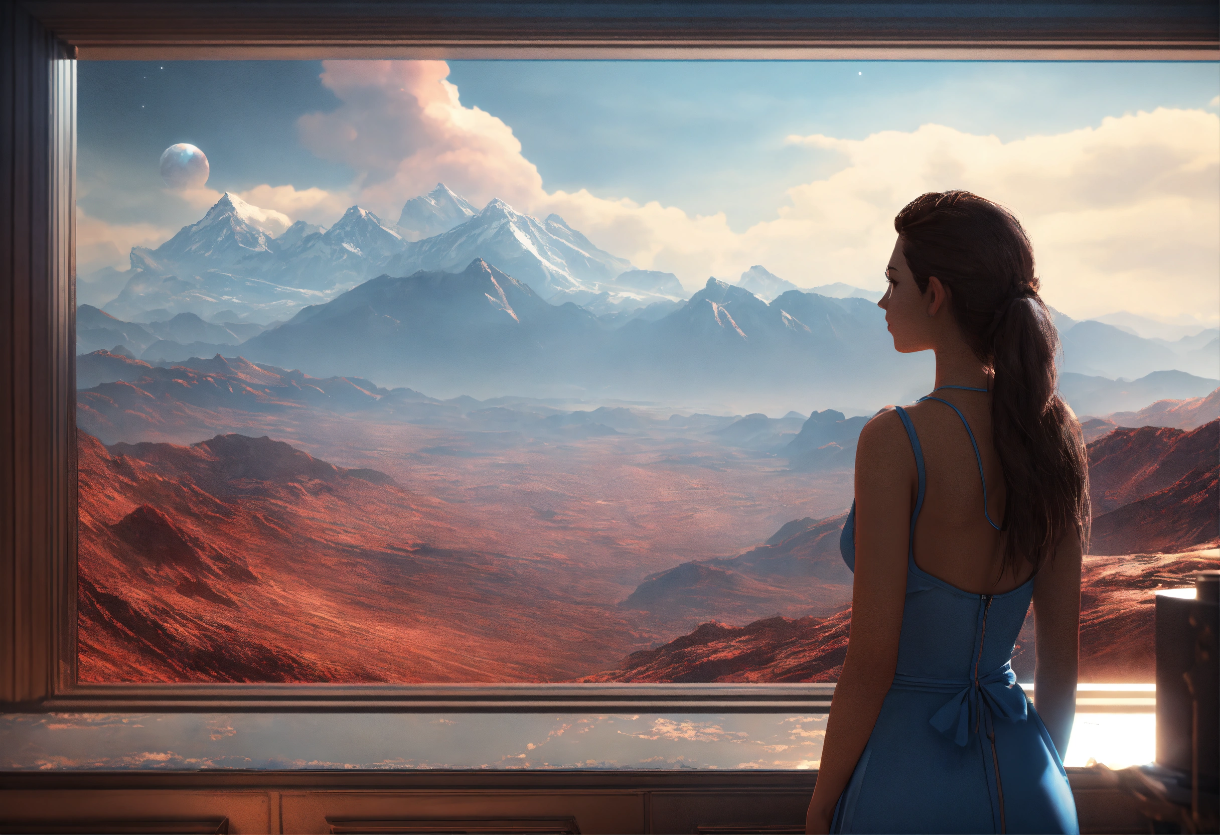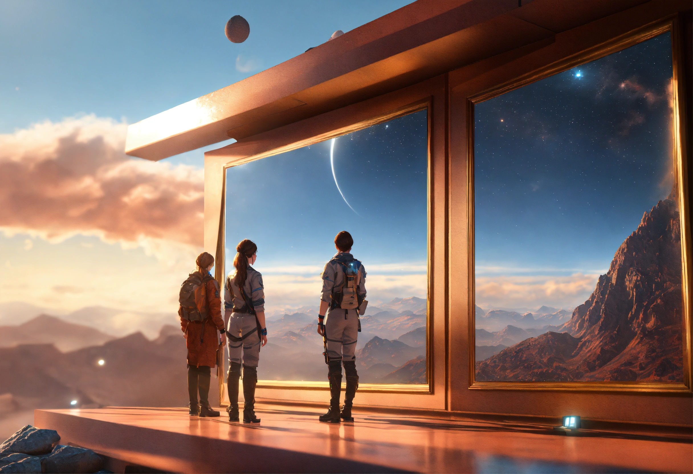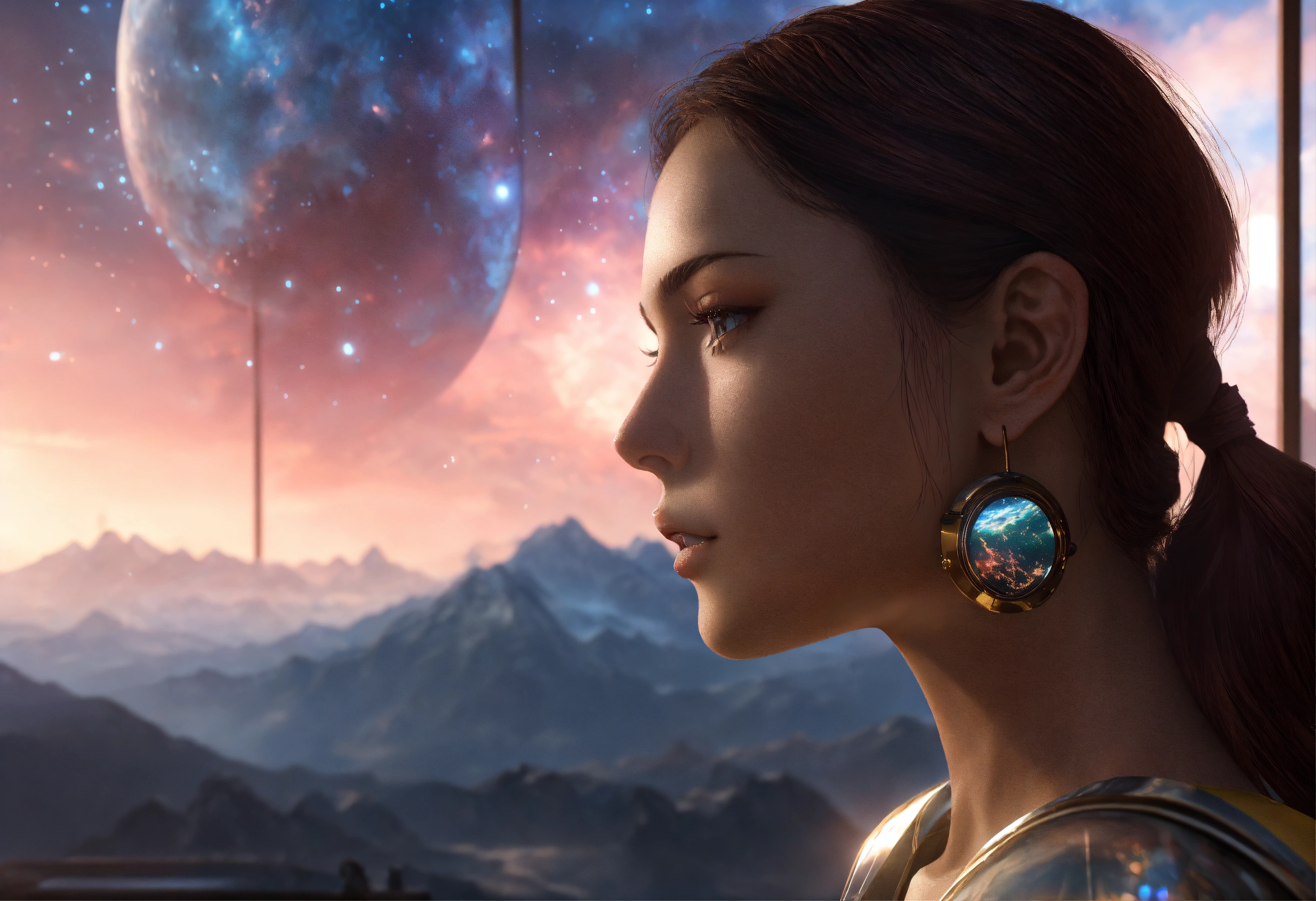 A young woman looks at a man on the other side of a mirror, sky nebula, artstation scifi 3d scene of a showing mountains, maximalism, ambient occlusion, atmospheric haze, unreal engine, hyper realism, realistic shading, cinematic composition, realistic render, octane render, detailed textures, photorealistic, wide shot