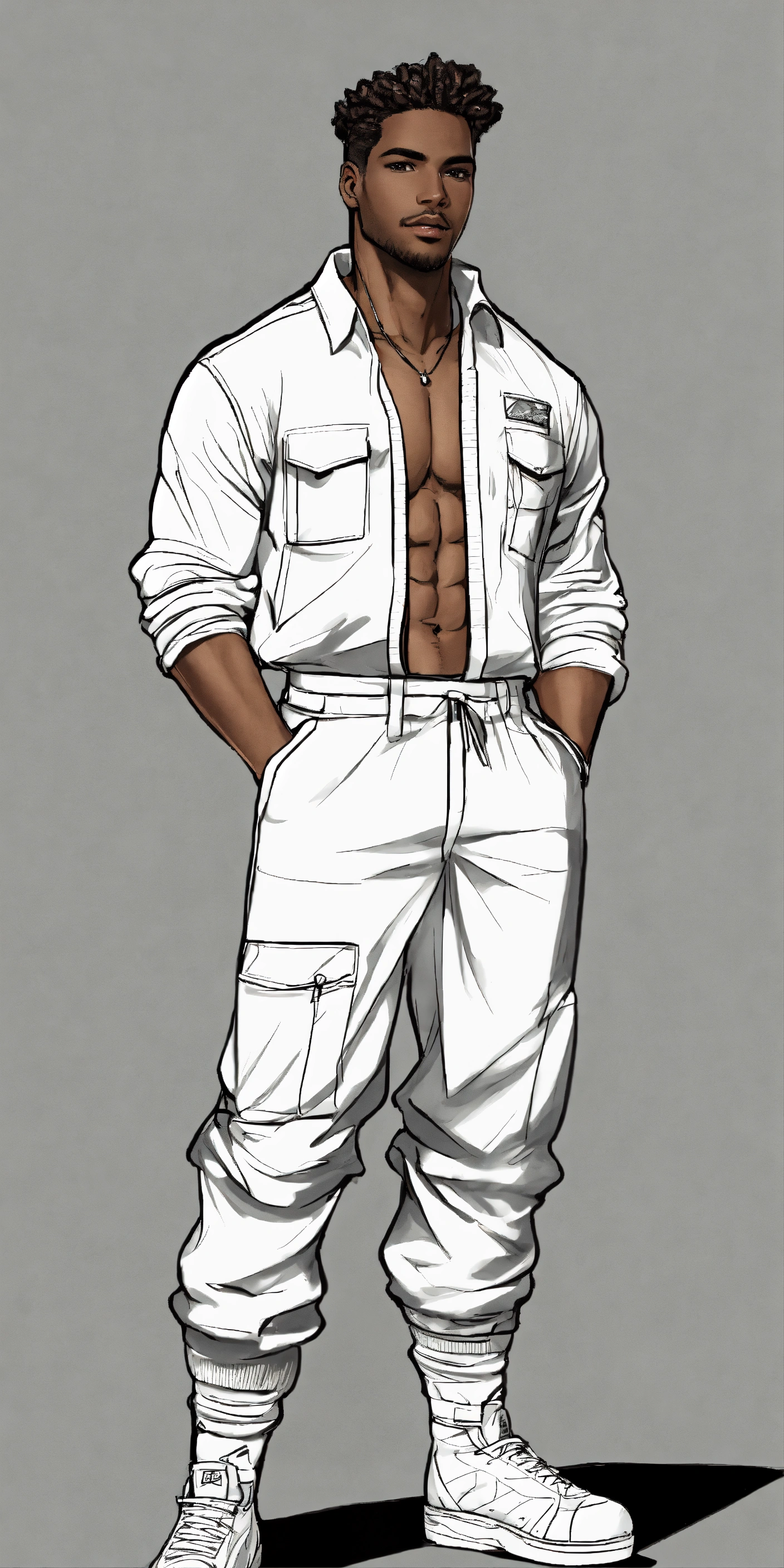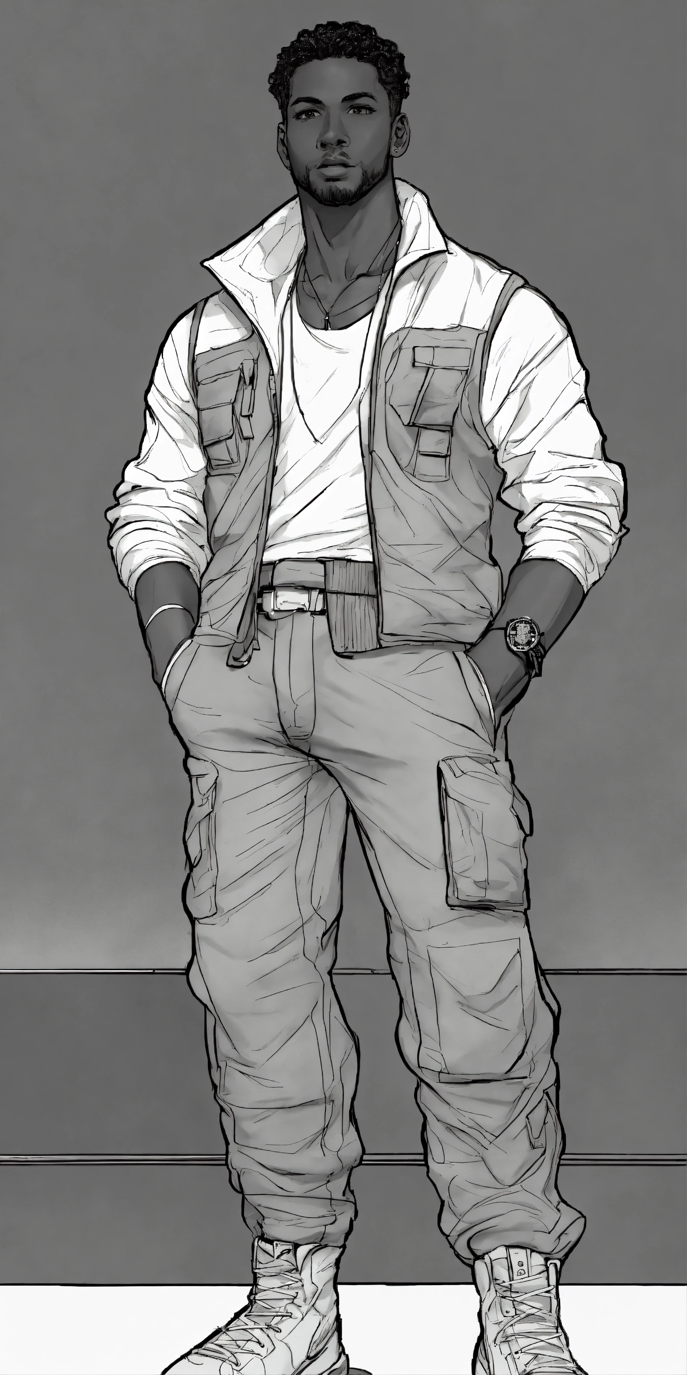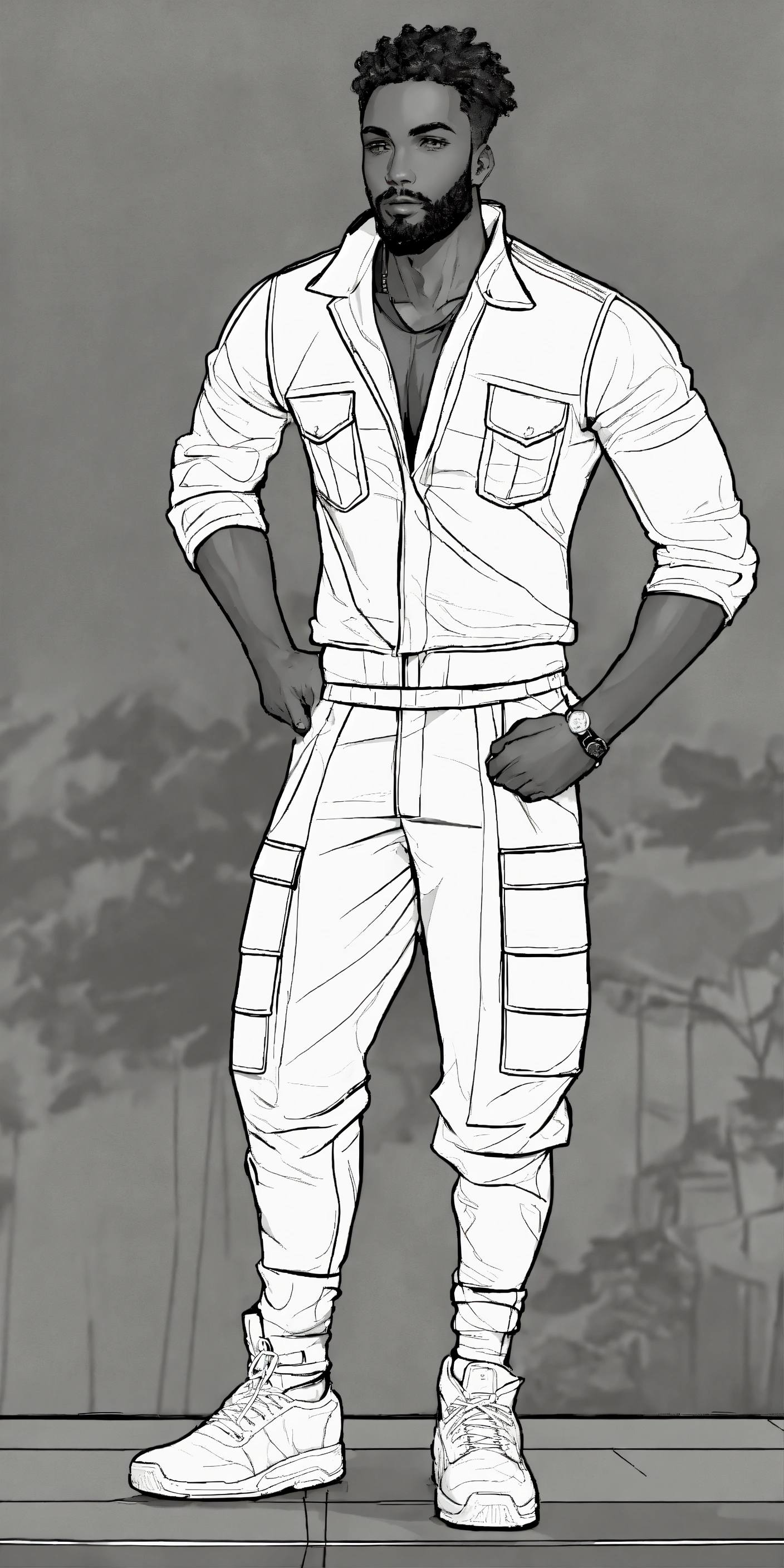Dark dark complexion fully clothed athletic man, realistic healthy glossy well defined loc’d hair texture, full body shot, rule of thirds centered subject placement, storybook, dreamlike, cartoon, intricate detail line drawing, cargo pant, black and white line art, coloring book style, dynamic white