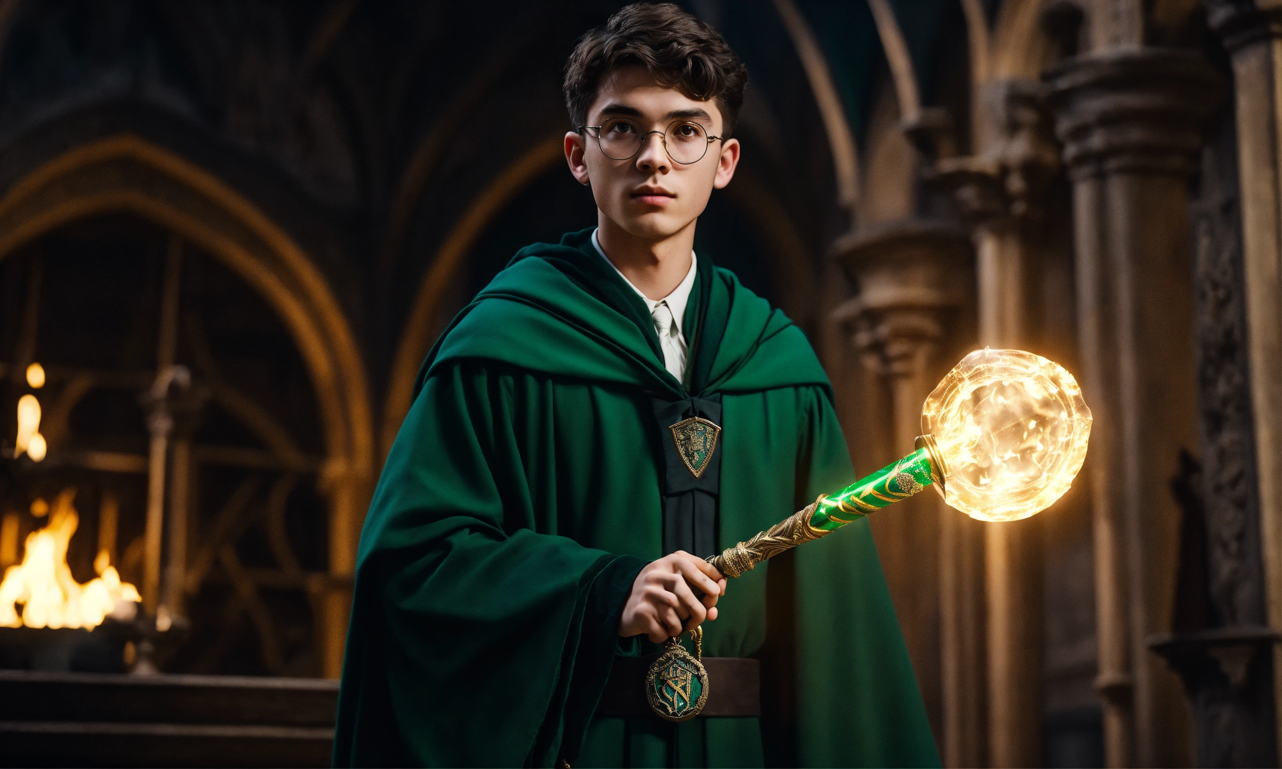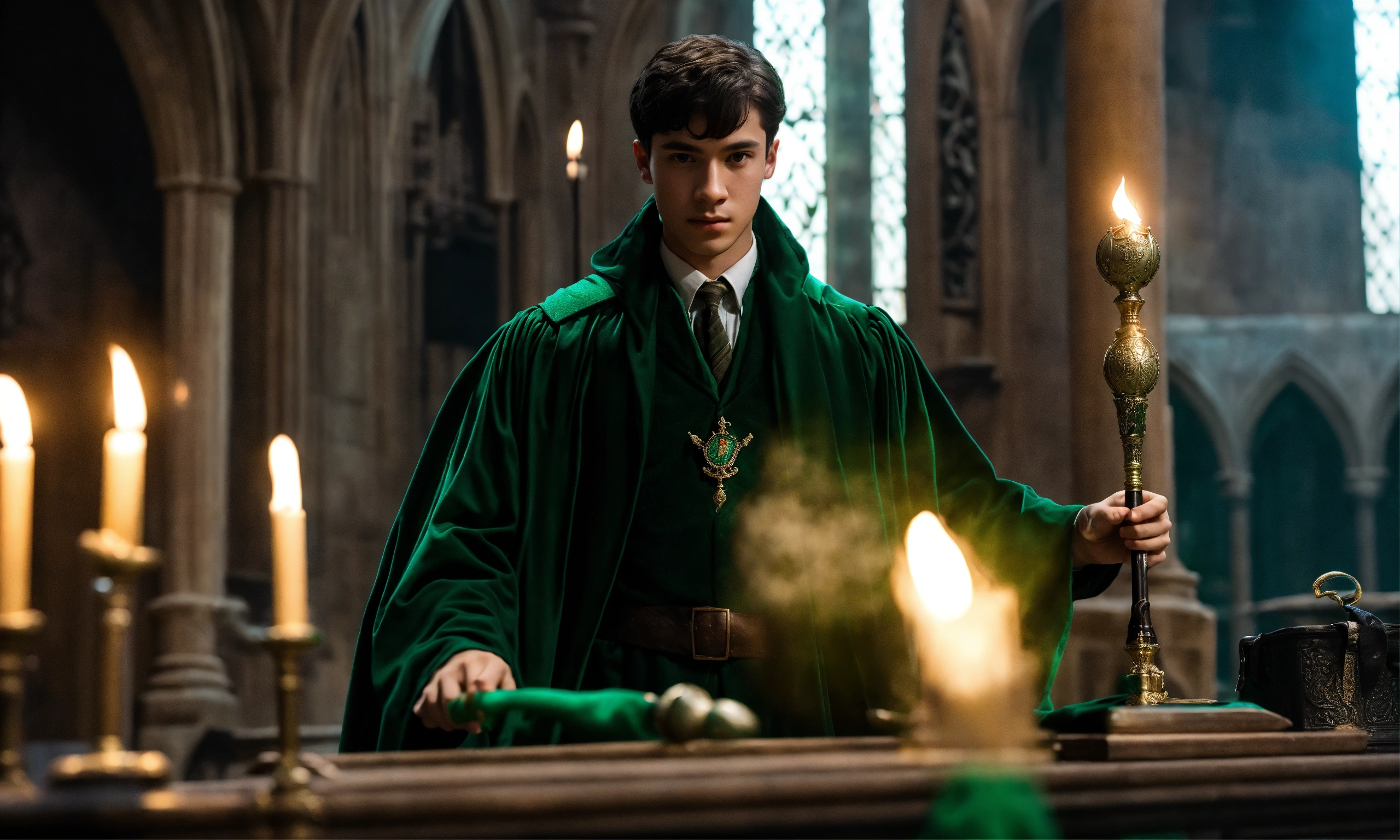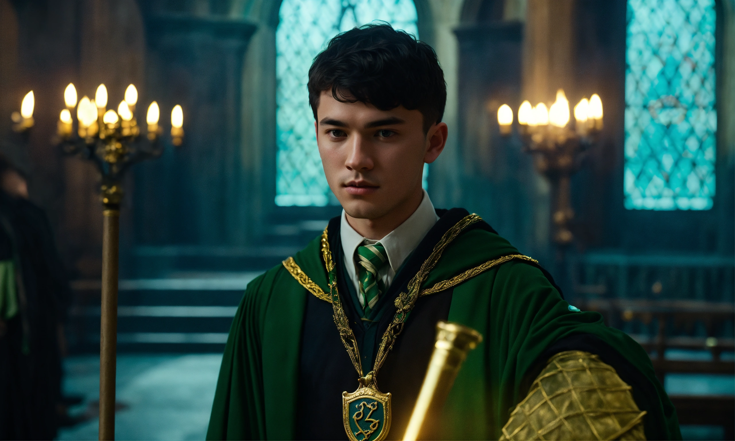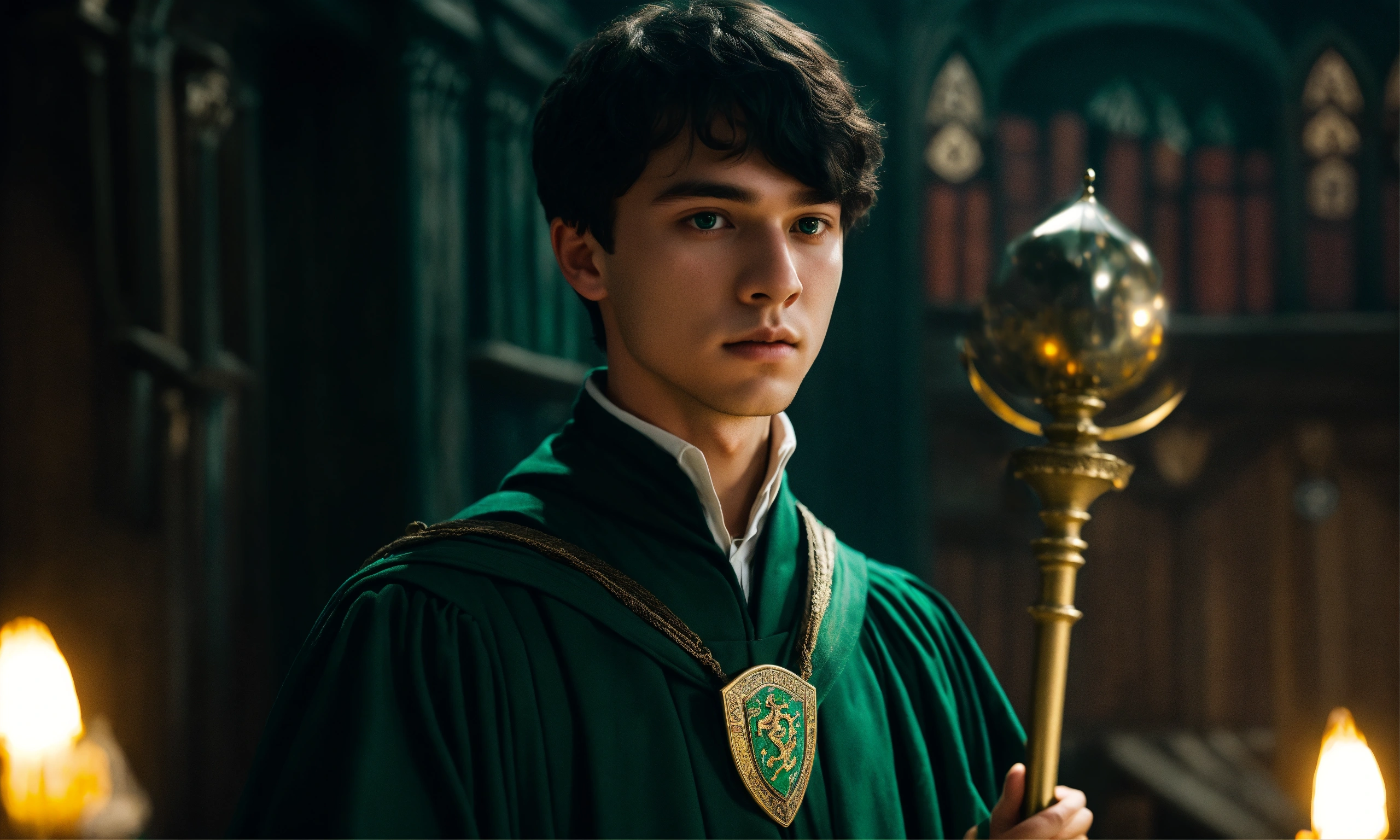 Man young wizard, inside hogwarts with a mystical scepter in his hand 2023 year, slytherin, without fingers without showing them, black very short hair