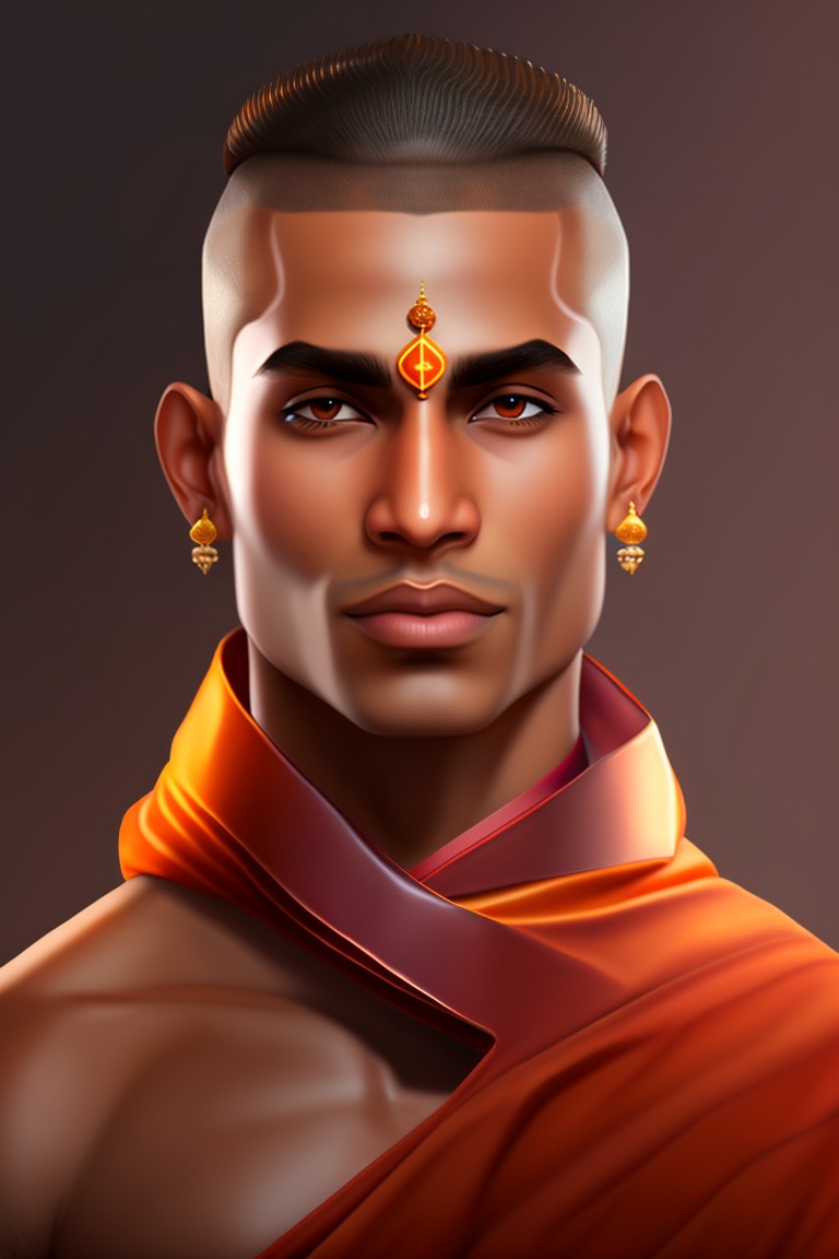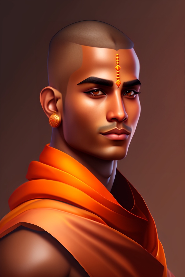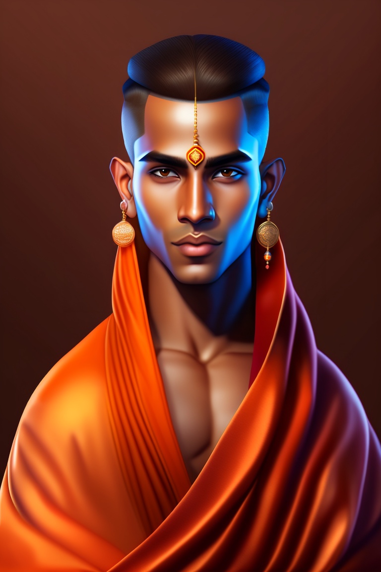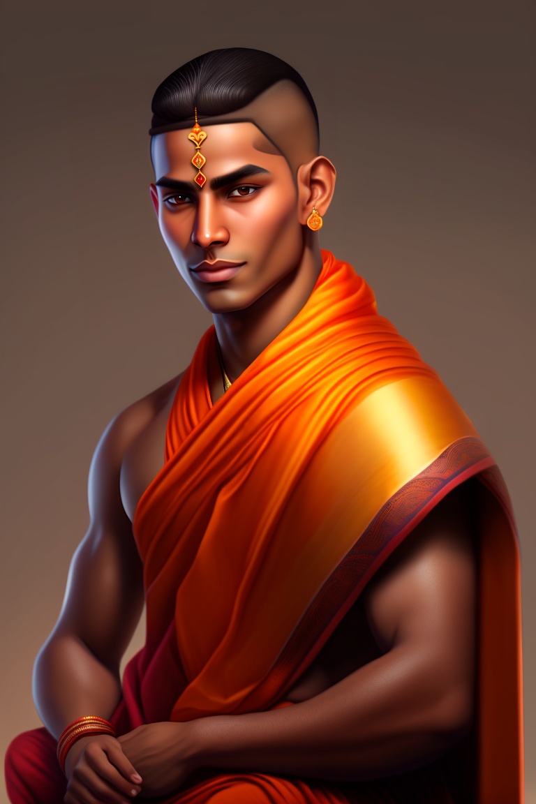 Realistic young indian monk pandit, with tilak on head, wear bhagwa clothes stylis with attractive body and eye and face