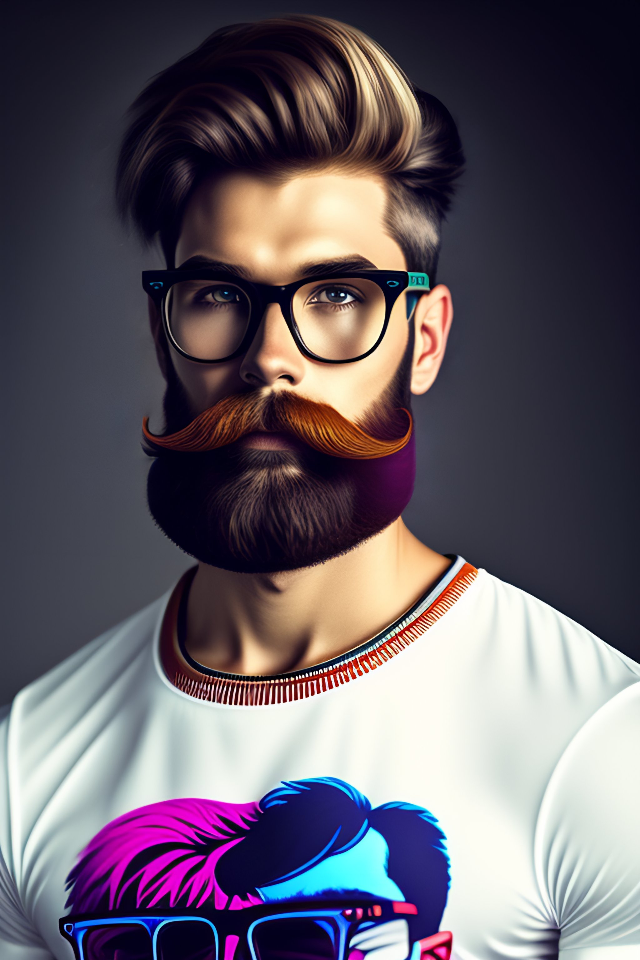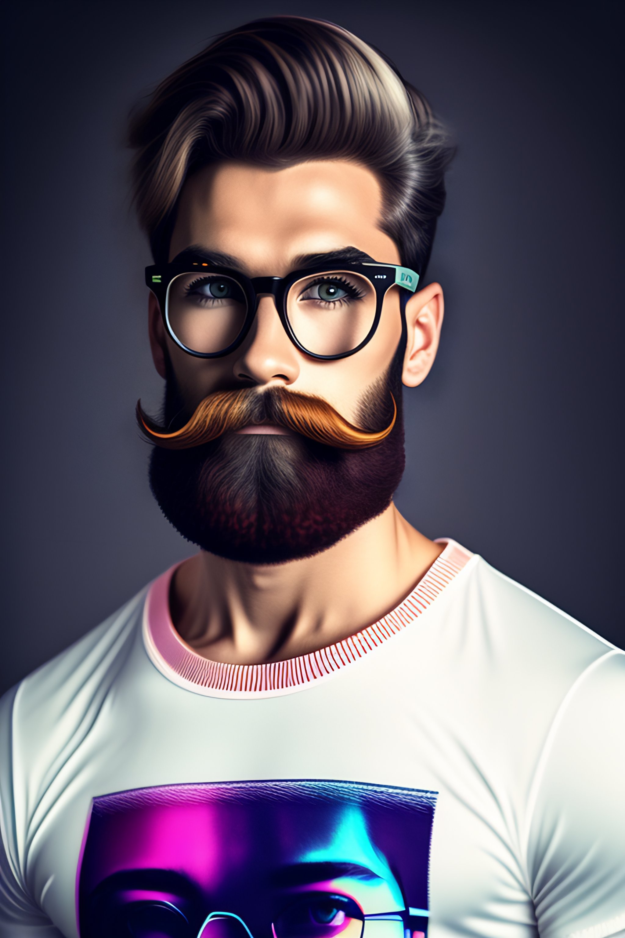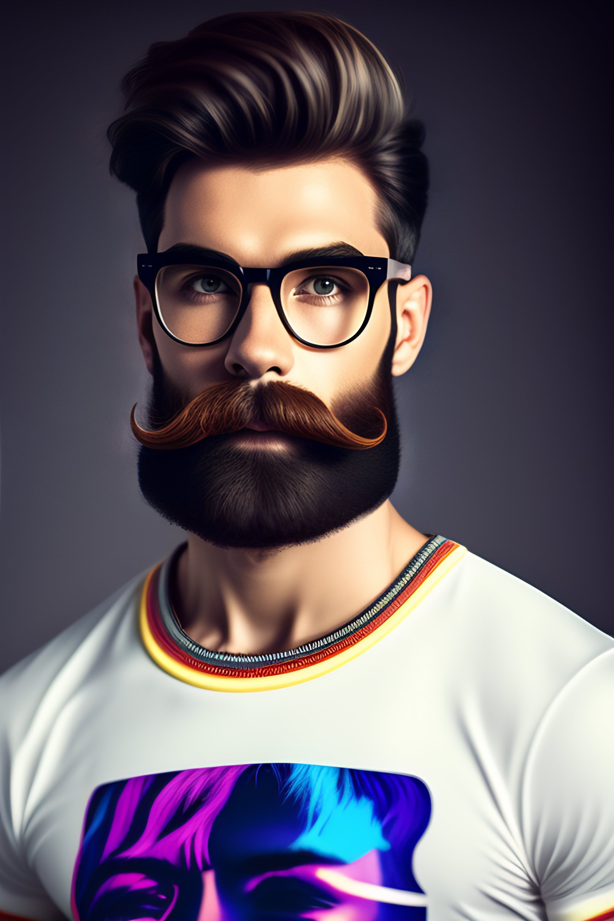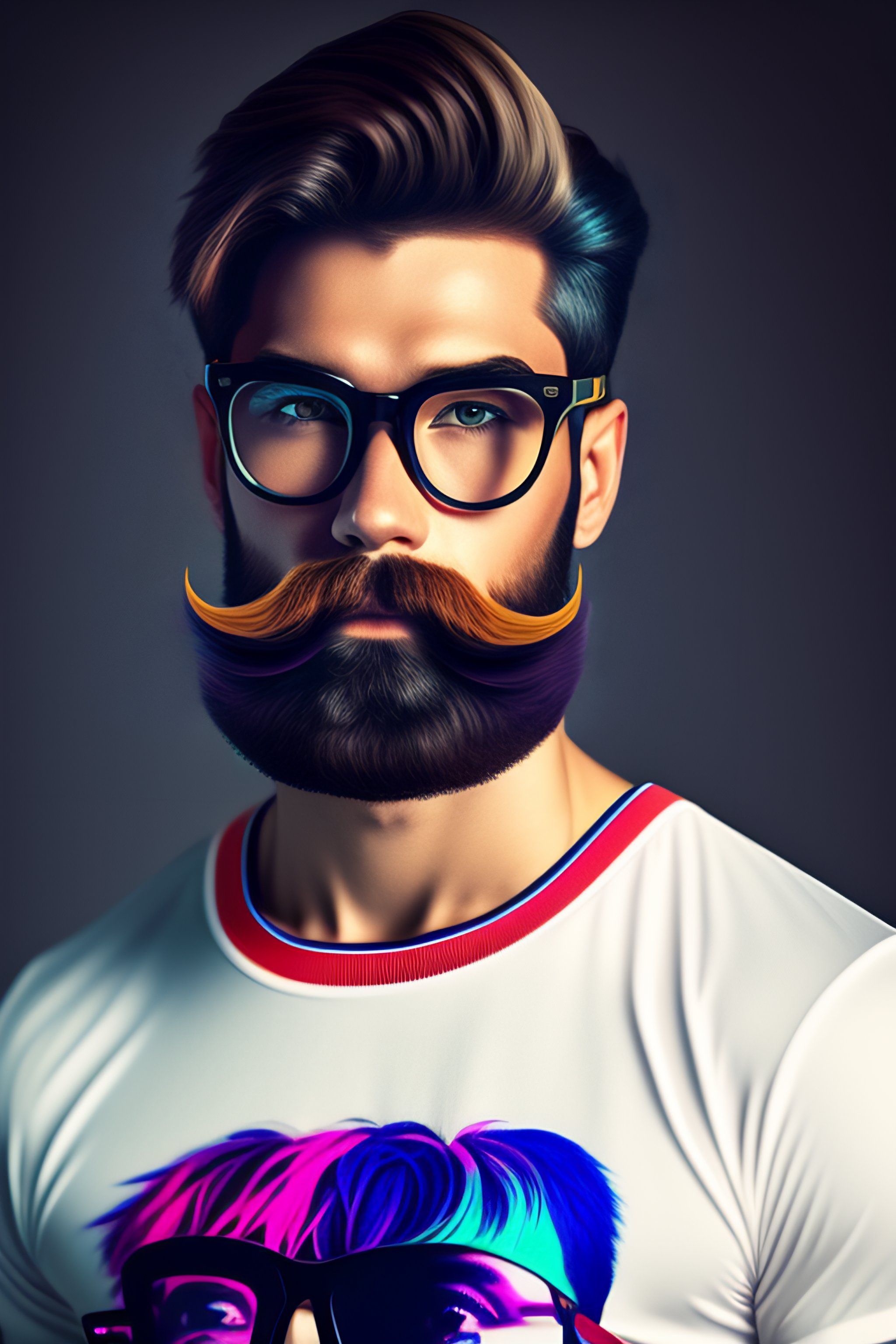 1boy, beard, blurry, blurry_background, mustache, realistic, shirt, soloby andy warhol, anatomical drawing, banner --testp --creative --ar 4:5 cartoon, cyberpunk with glasses