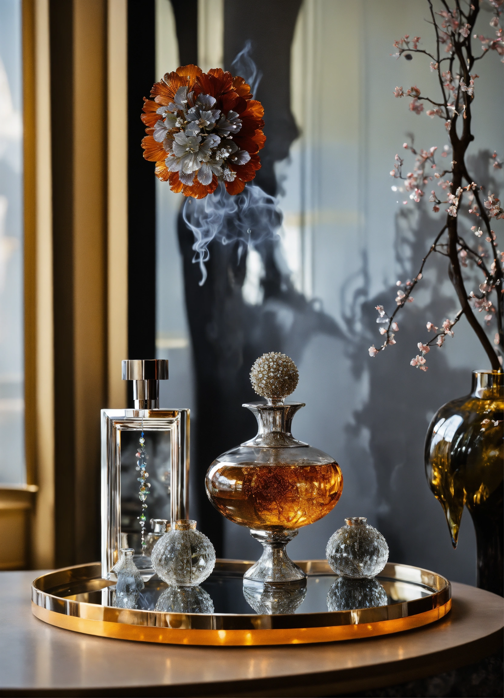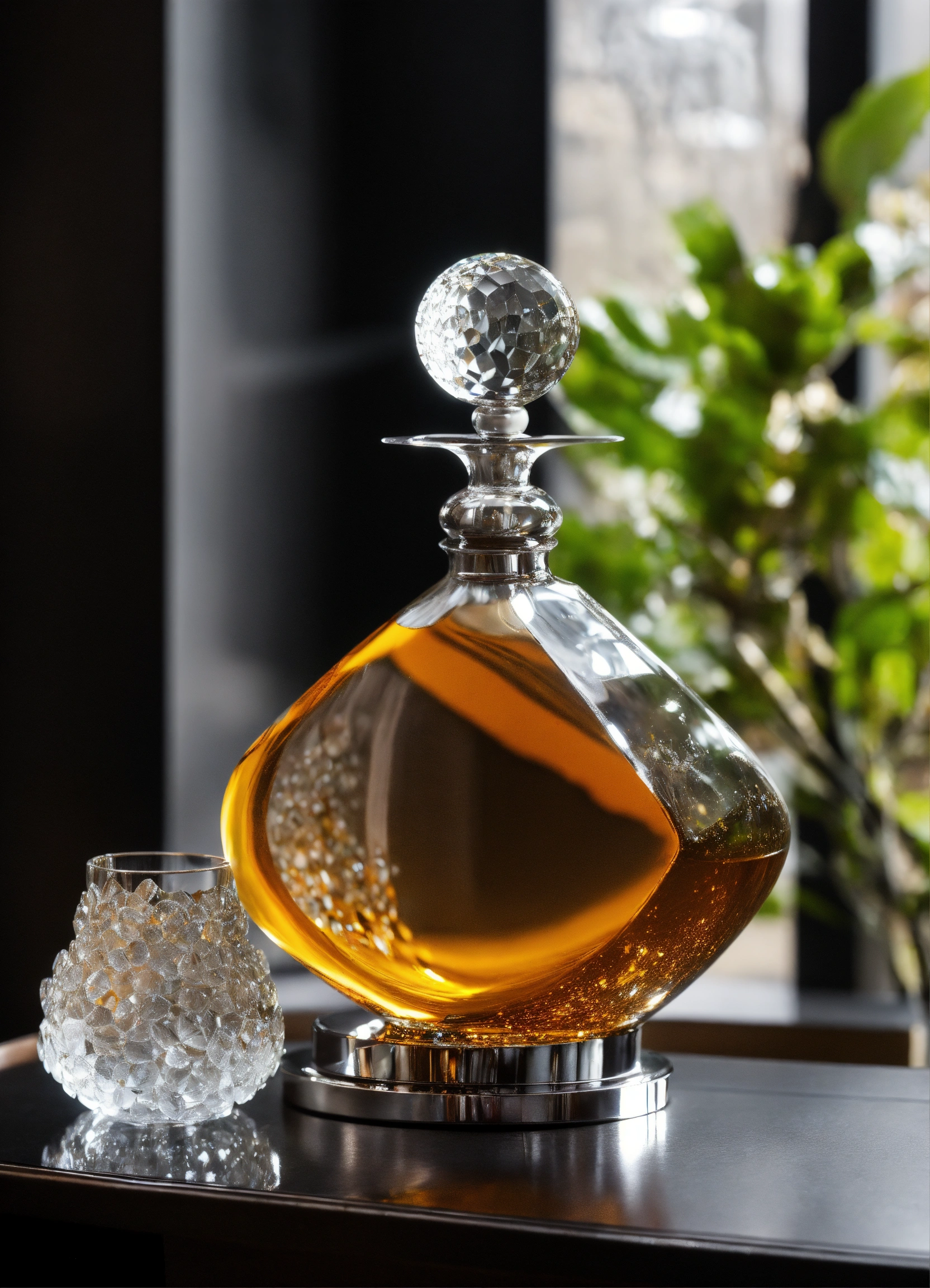Smoke scotch brandy decanter onyx champaign plexiglass brutalist minimalist empty liminal chrome chrome blossom lalique murano bonsai crystal mirror foil tin aluminium zen drops smoky nouveau art deco