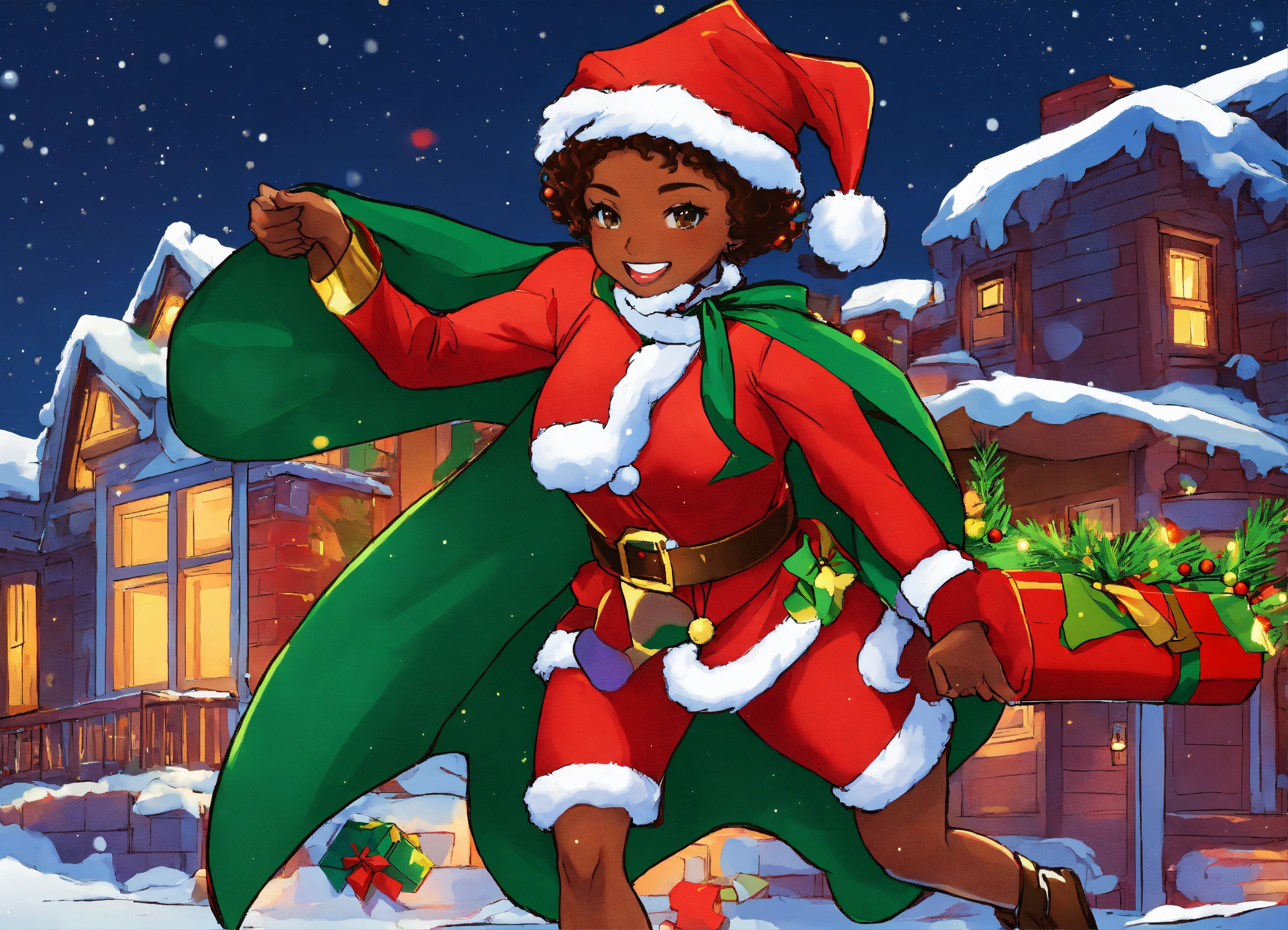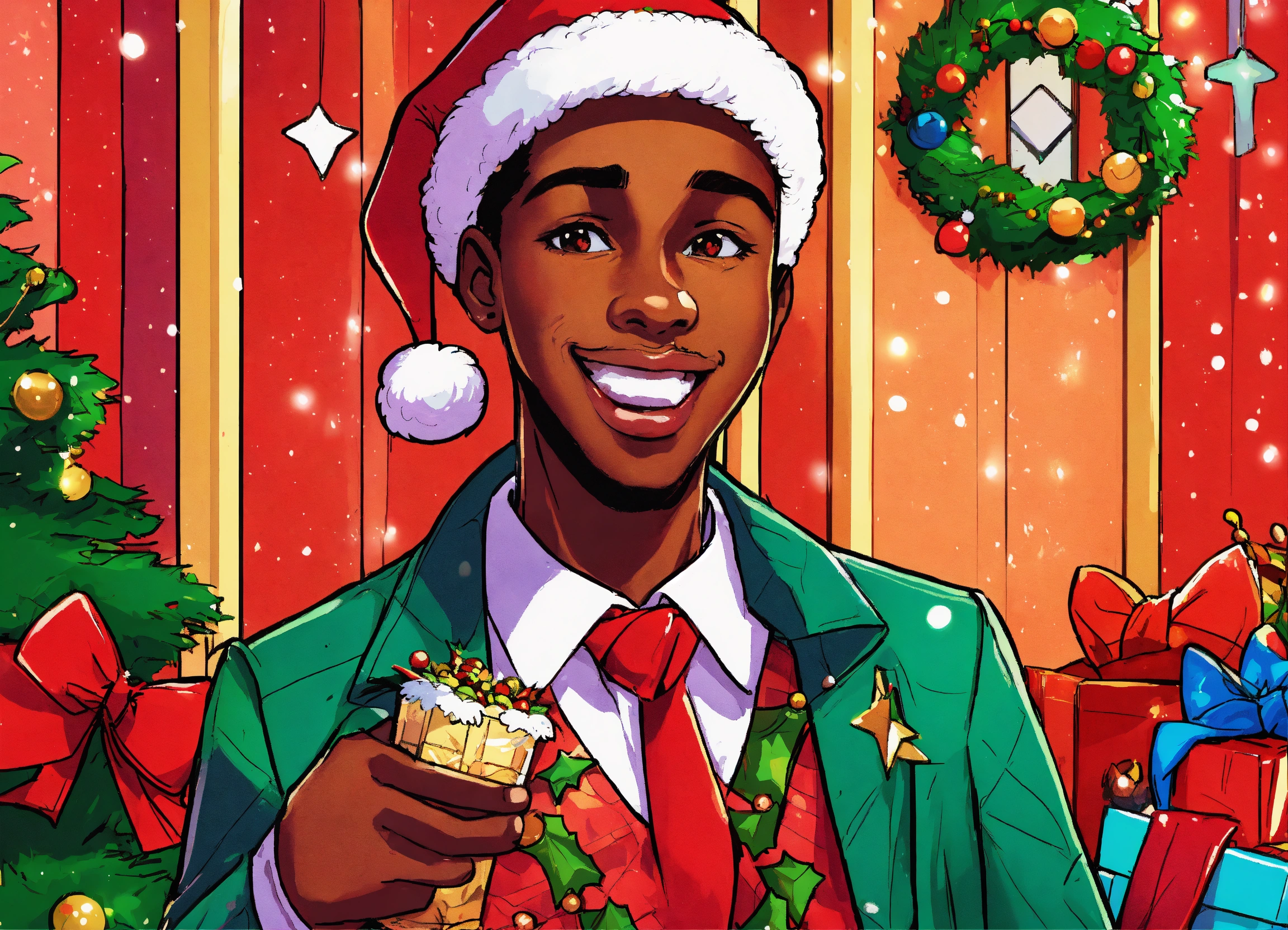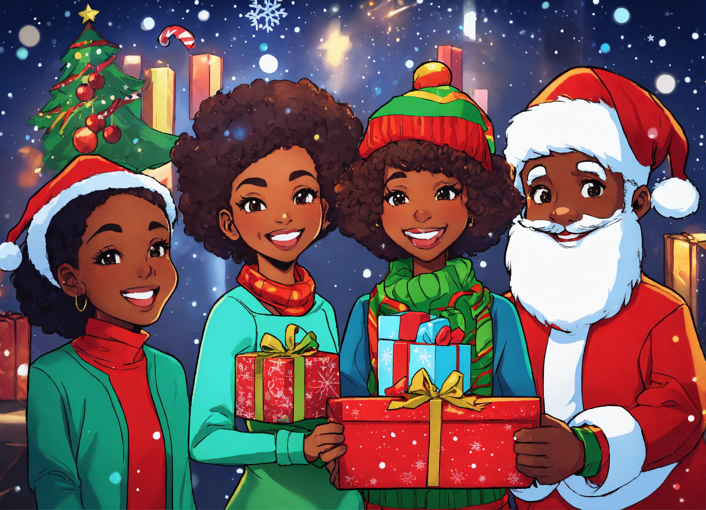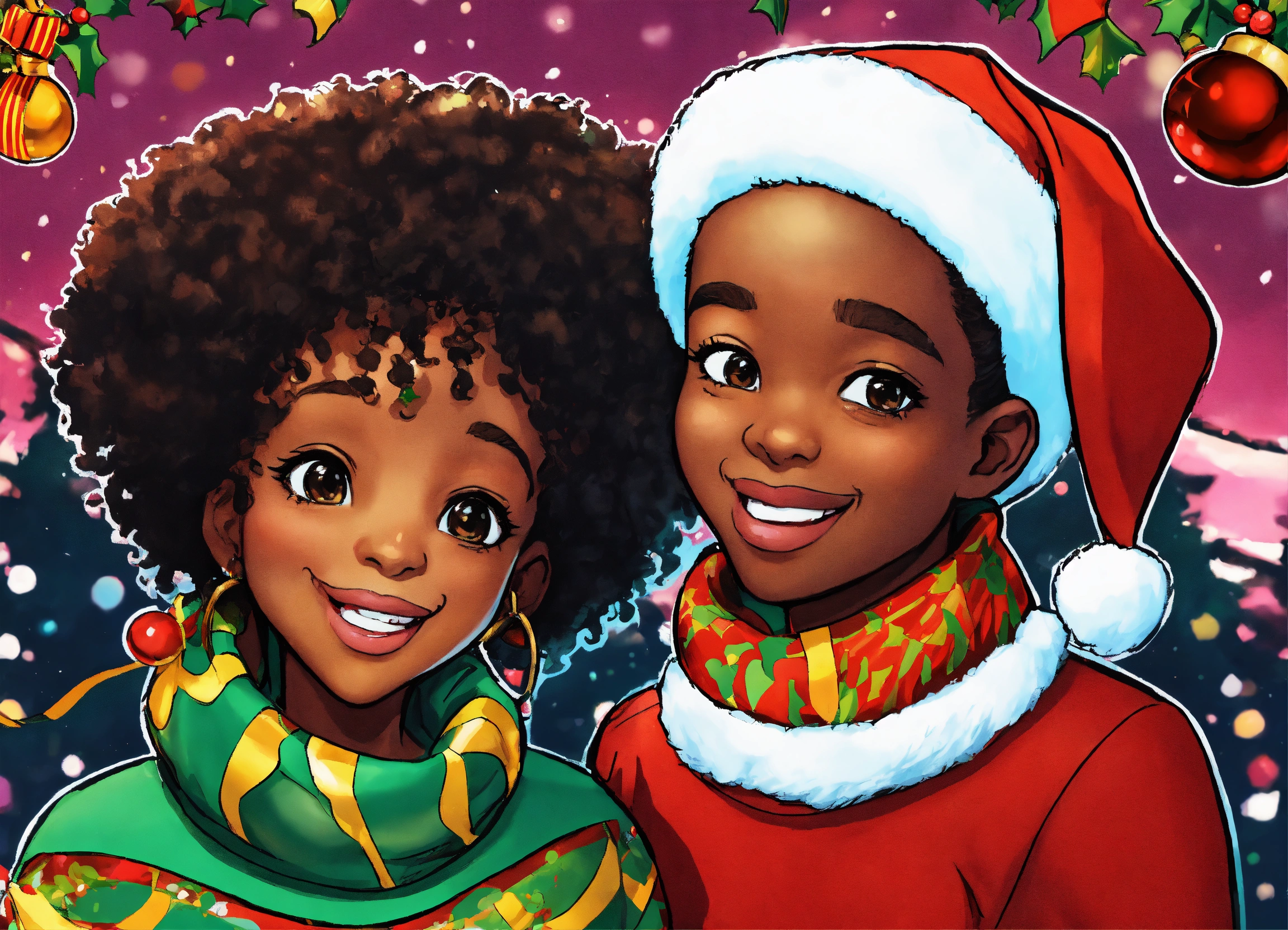 Cartoon, illustration, african american christmas season greeting card, jolly vibrant christmas colors, christmastimecore, comic book style art, moe anime