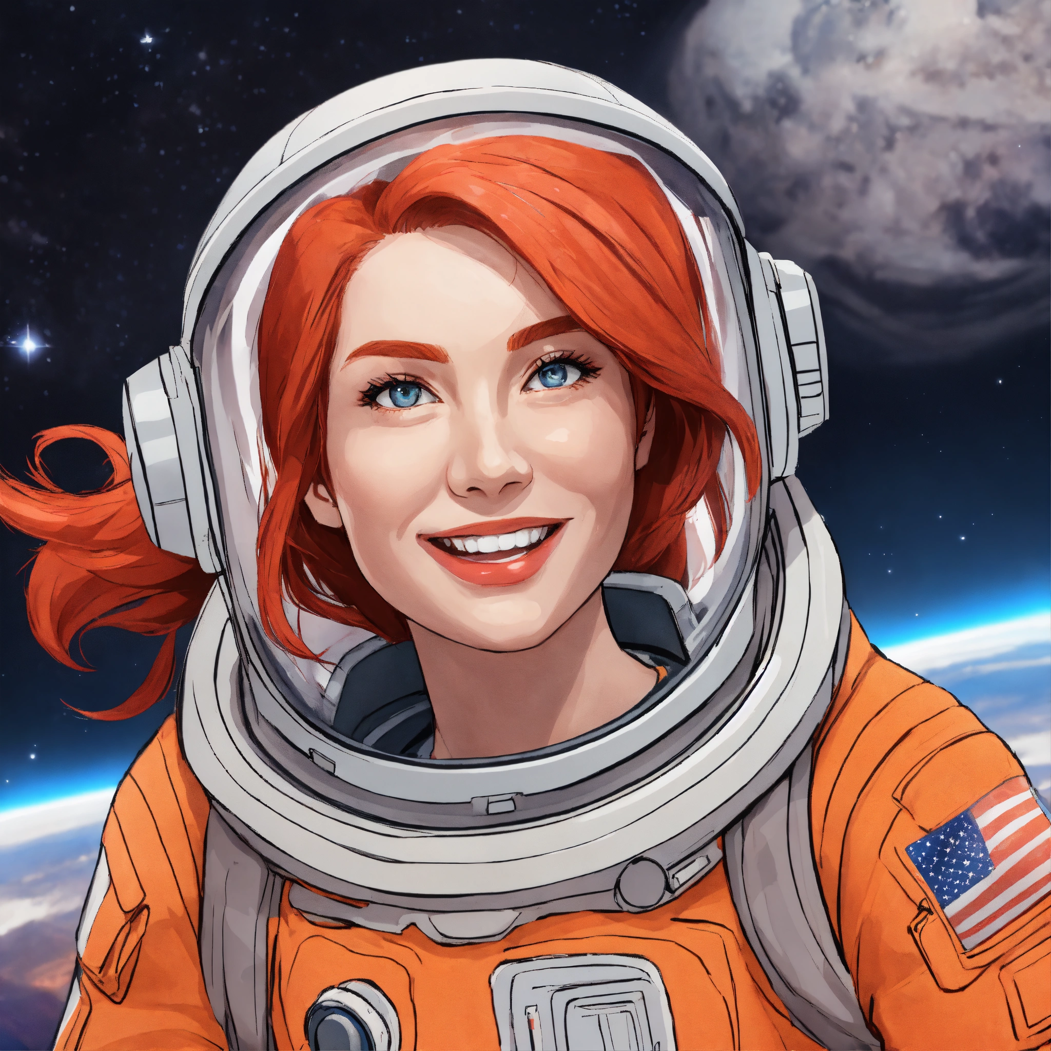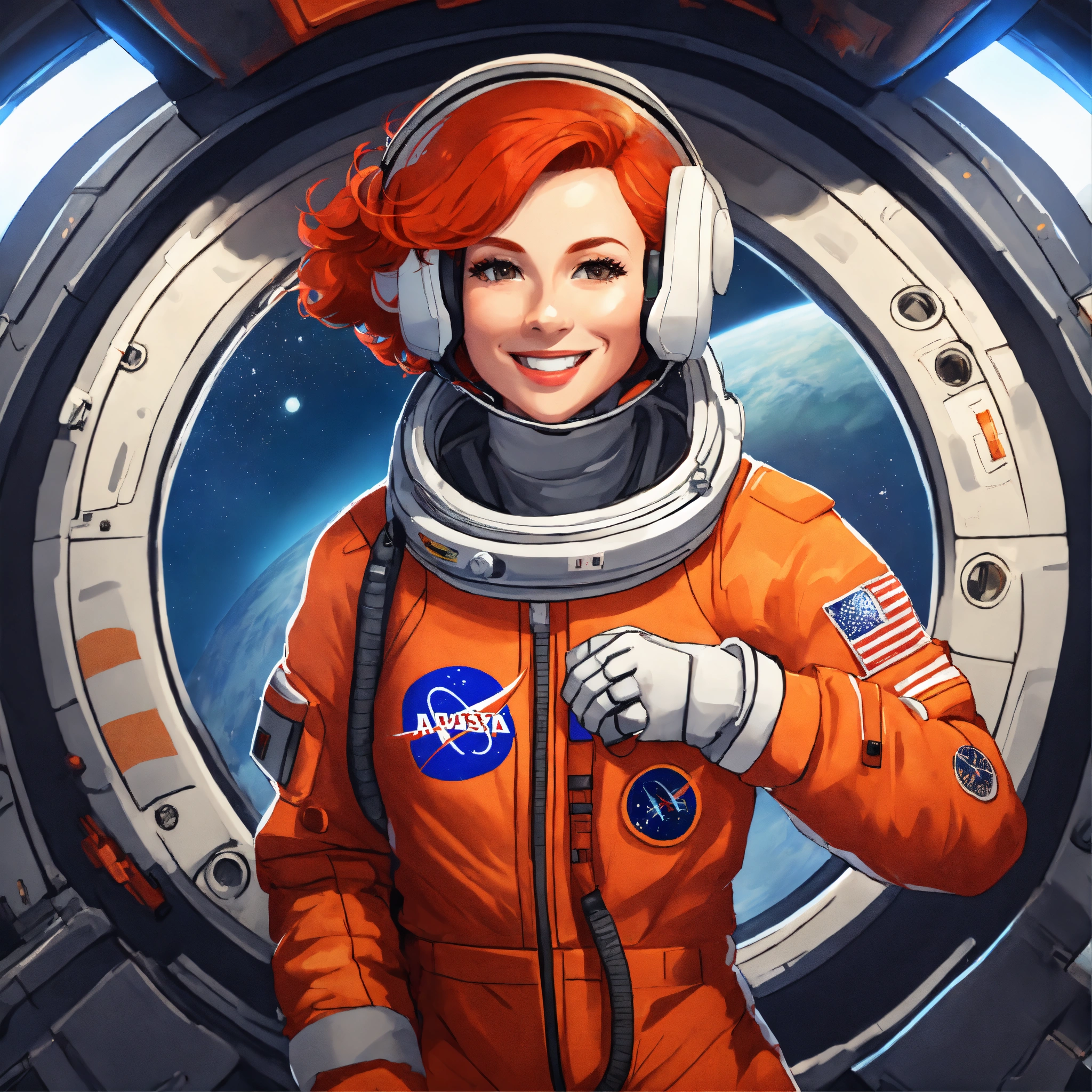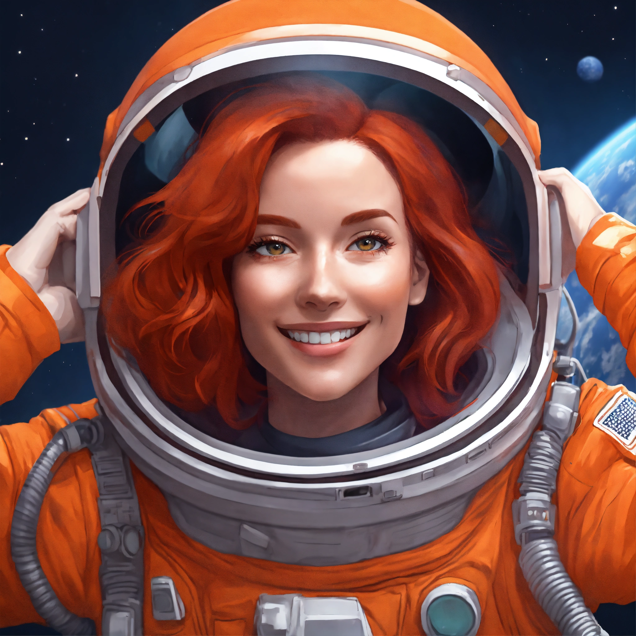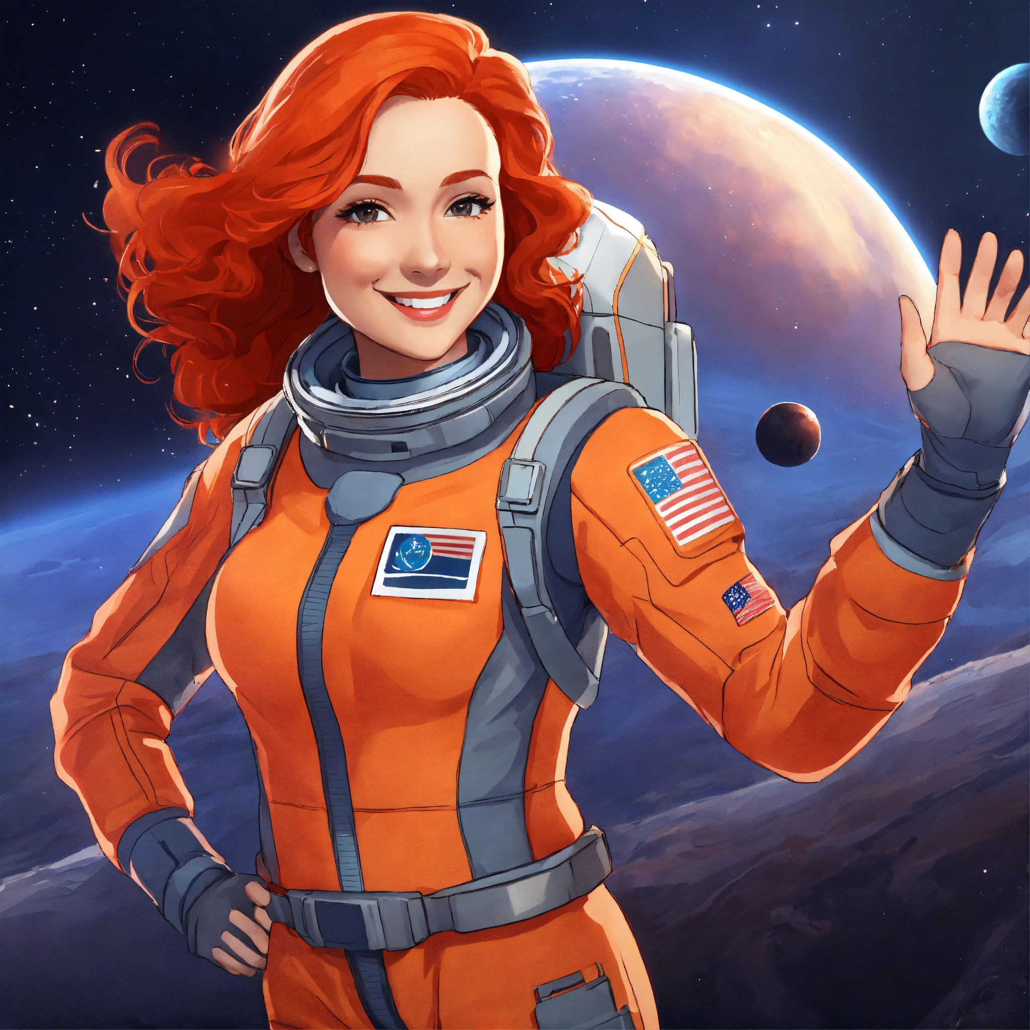 Create a female astronaut, with red hair, cartoon version, wearing an orange suit, waving at the camera and very smiling, standing still, full hd